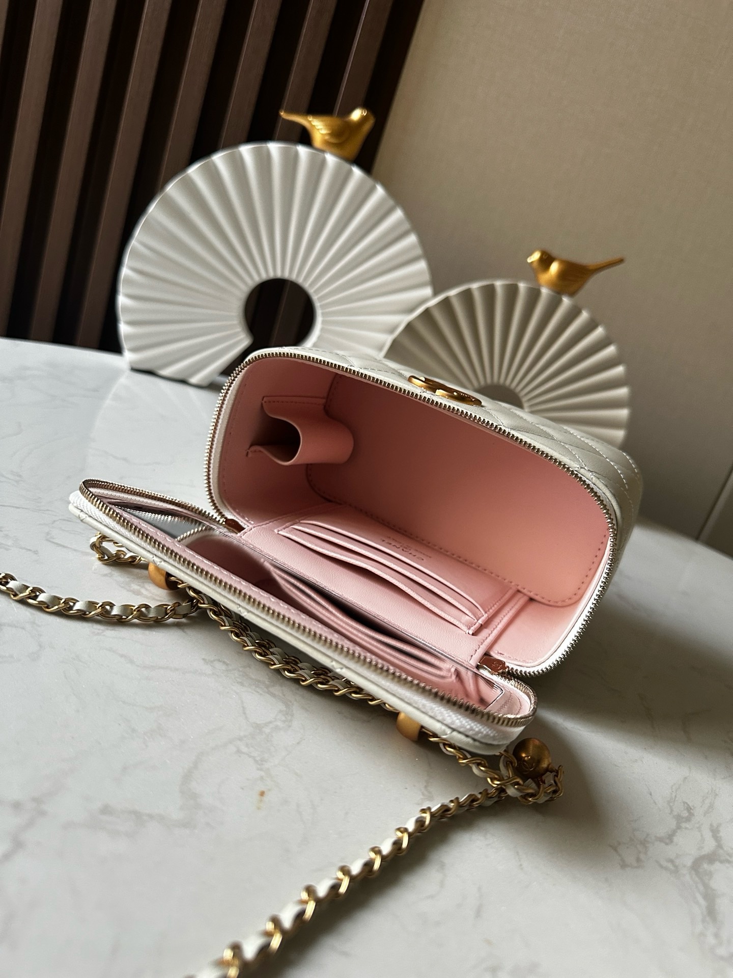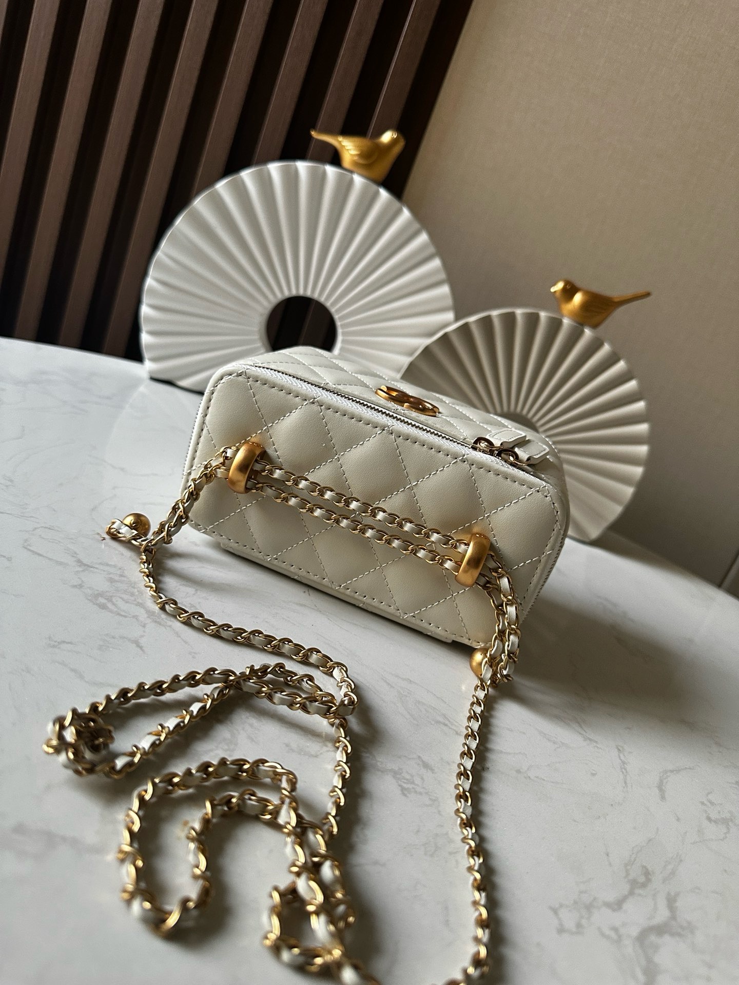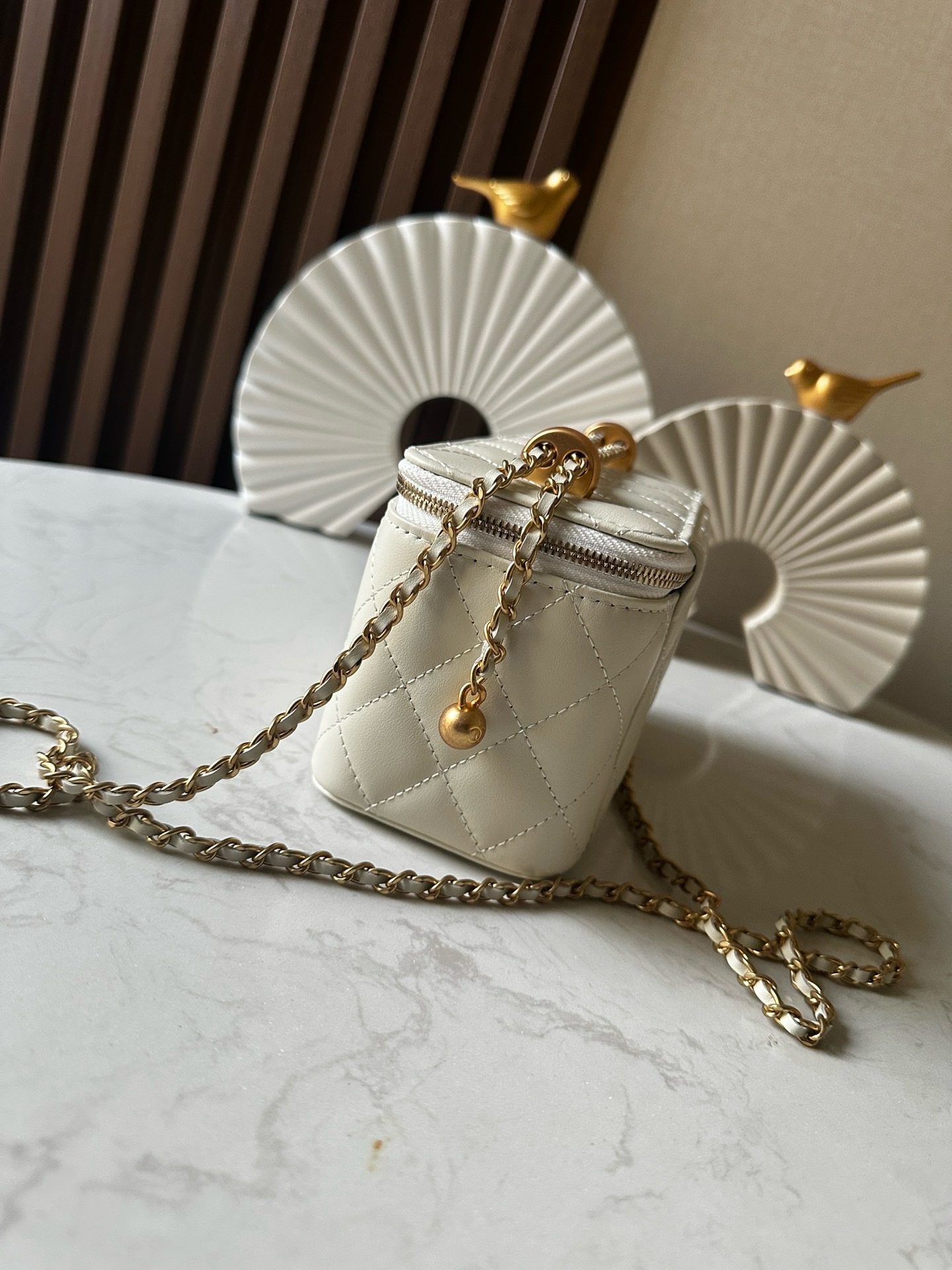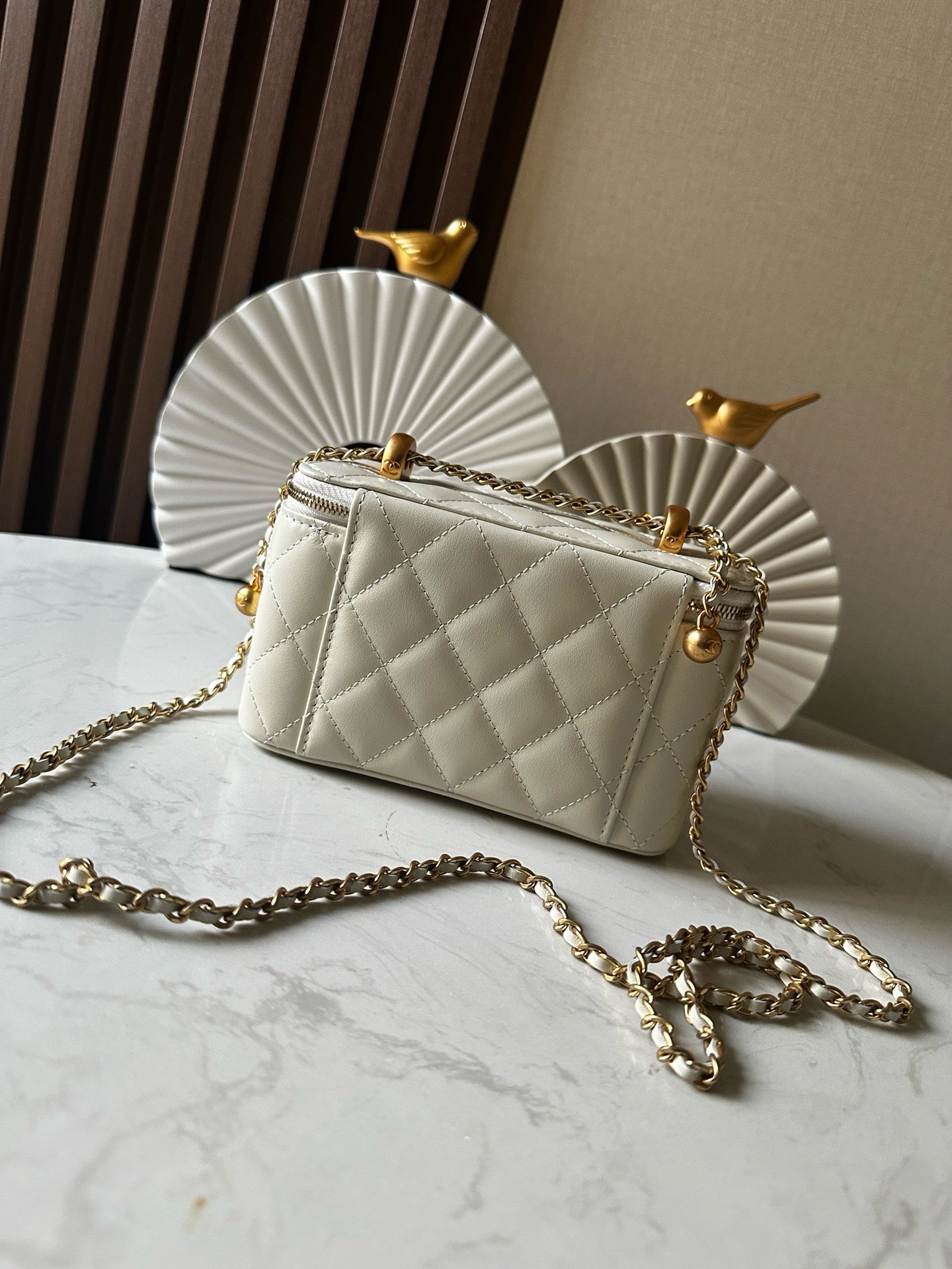 CHANEL 24C Double Golden Ball Box Chanel's new double gold balls this season is really good I fell in love with this bag at first sight, classic black gold, two gold beads, and the chain can be adjusted in length. Sa, if you have goods, you can quickly make this bag. I prefer to carry a crossbody in your hand and one shoulder, which can also have capacity and adjustability. Model number: 66039 White Size: 17cm