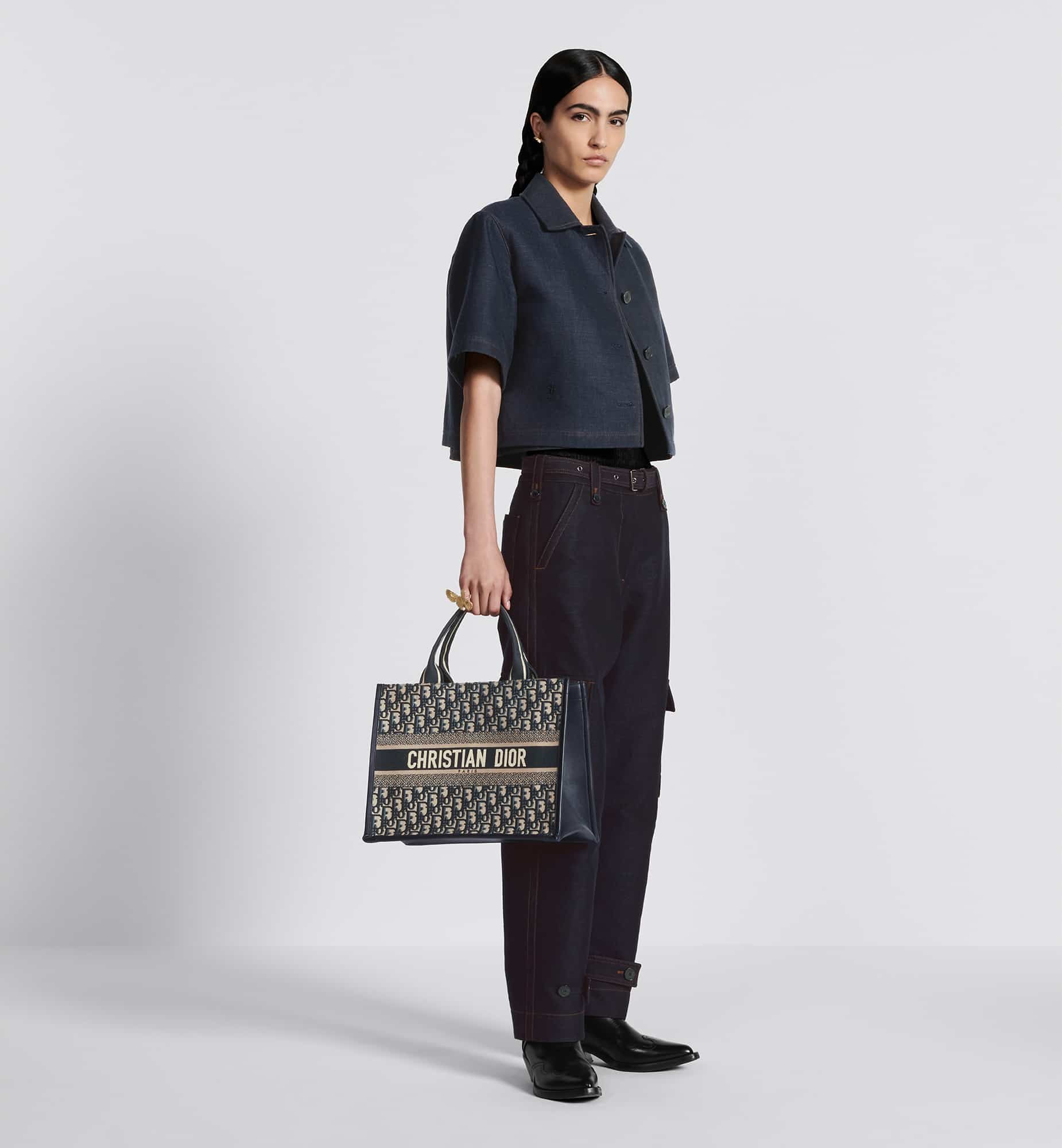 Maria Grazia Chiuri’s hallmark Dior Book Tote offers an original take on elegance. Unveiled at the Cruise 2024 Fashion Show, the refined style showcases the iconic blue Dior Oblique embroidery and calfskin. Designed to keep all the daily essentials organized, the interior is equipped with a zipped pocket and patch pockets. Featuring an embroidered adjustable, removable shoulder strap, the practical, medium tote exemplifies Dior’s savoir-faire and can be carried by hand or worn over the shoulder.