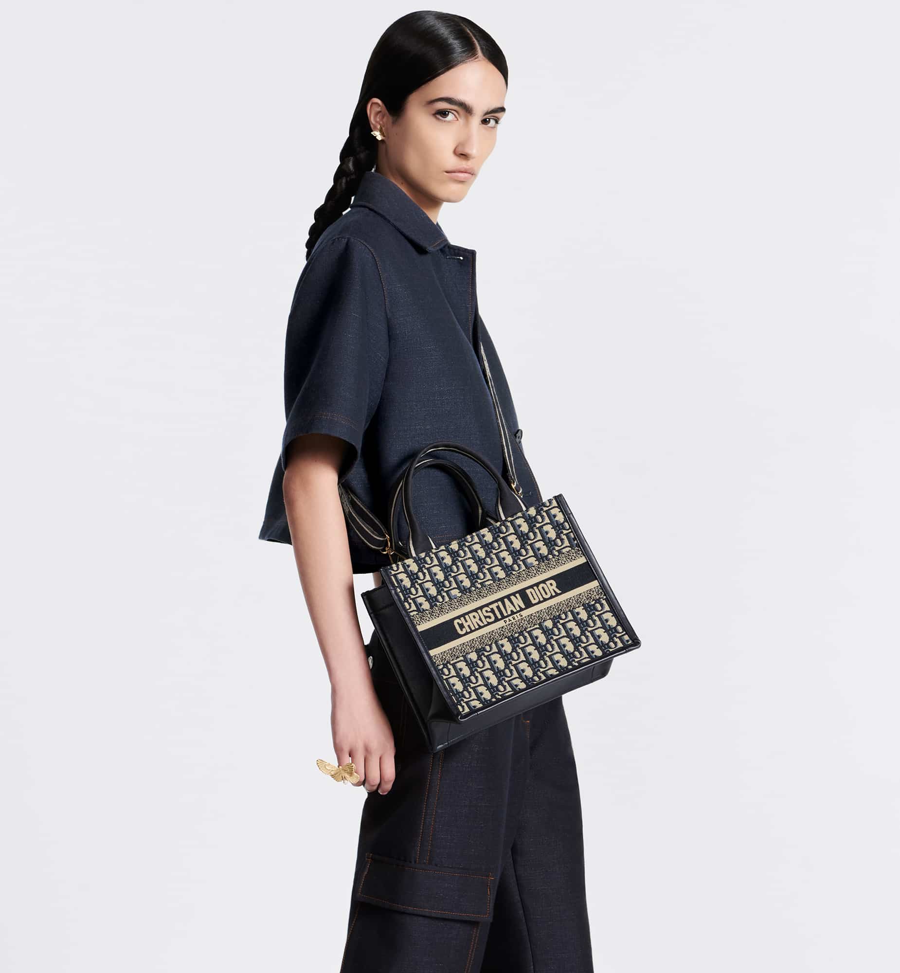 Maria Grazia Chiuri’s hallmark Dior Book Tote offers an original take on elegance. The refined style showcases an iconic blue Dior Oblique embroidery and calfskin. Designed to keep all daily essentials organized, the interior is equipped with a zipped pocket and patch pockets. Featuring an embroidered adjustable, removable shoulder strap, the practical small tote exemplifies Dior’s savoir-faire and can be carried by hand or worn over the shoulder.