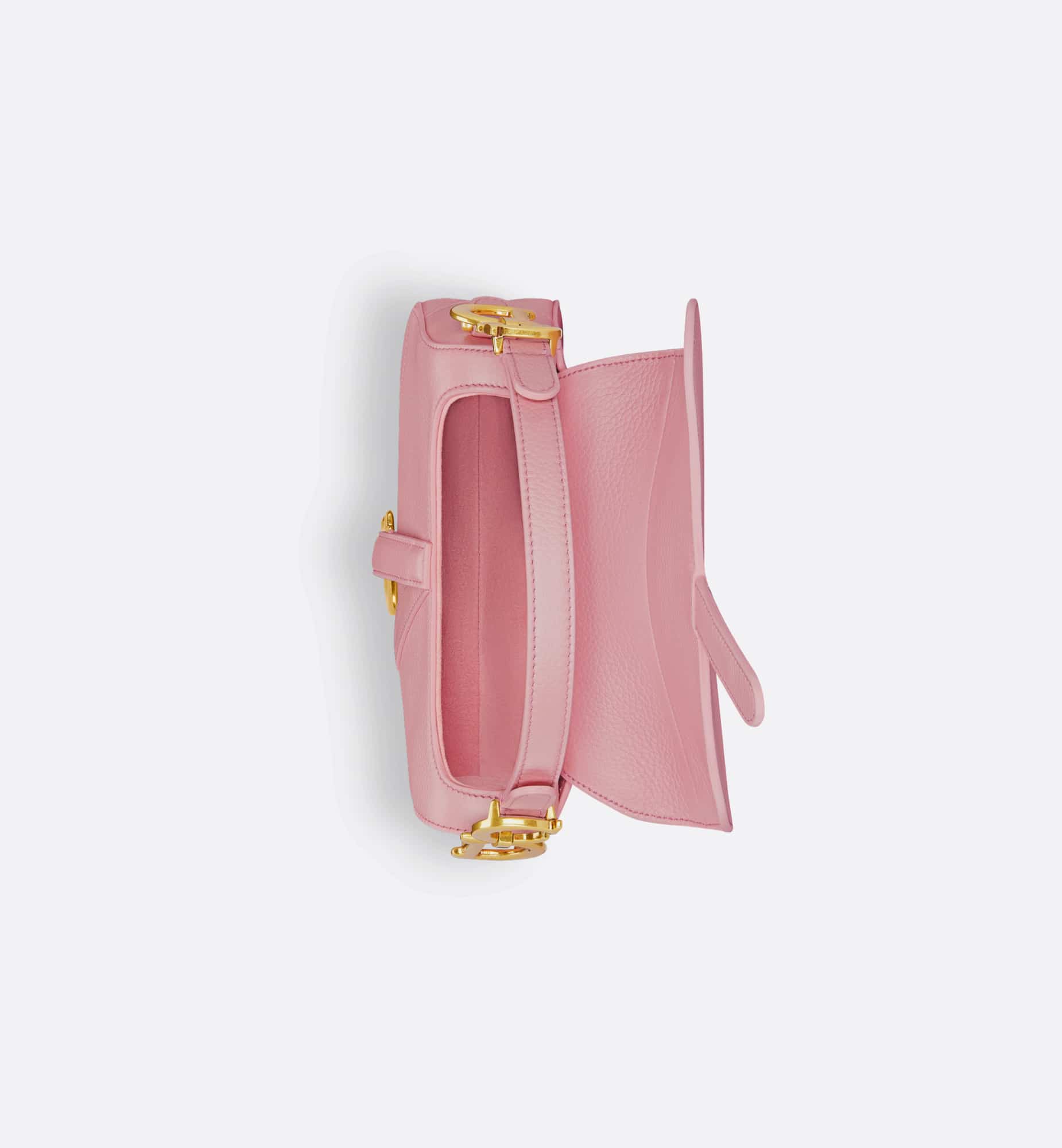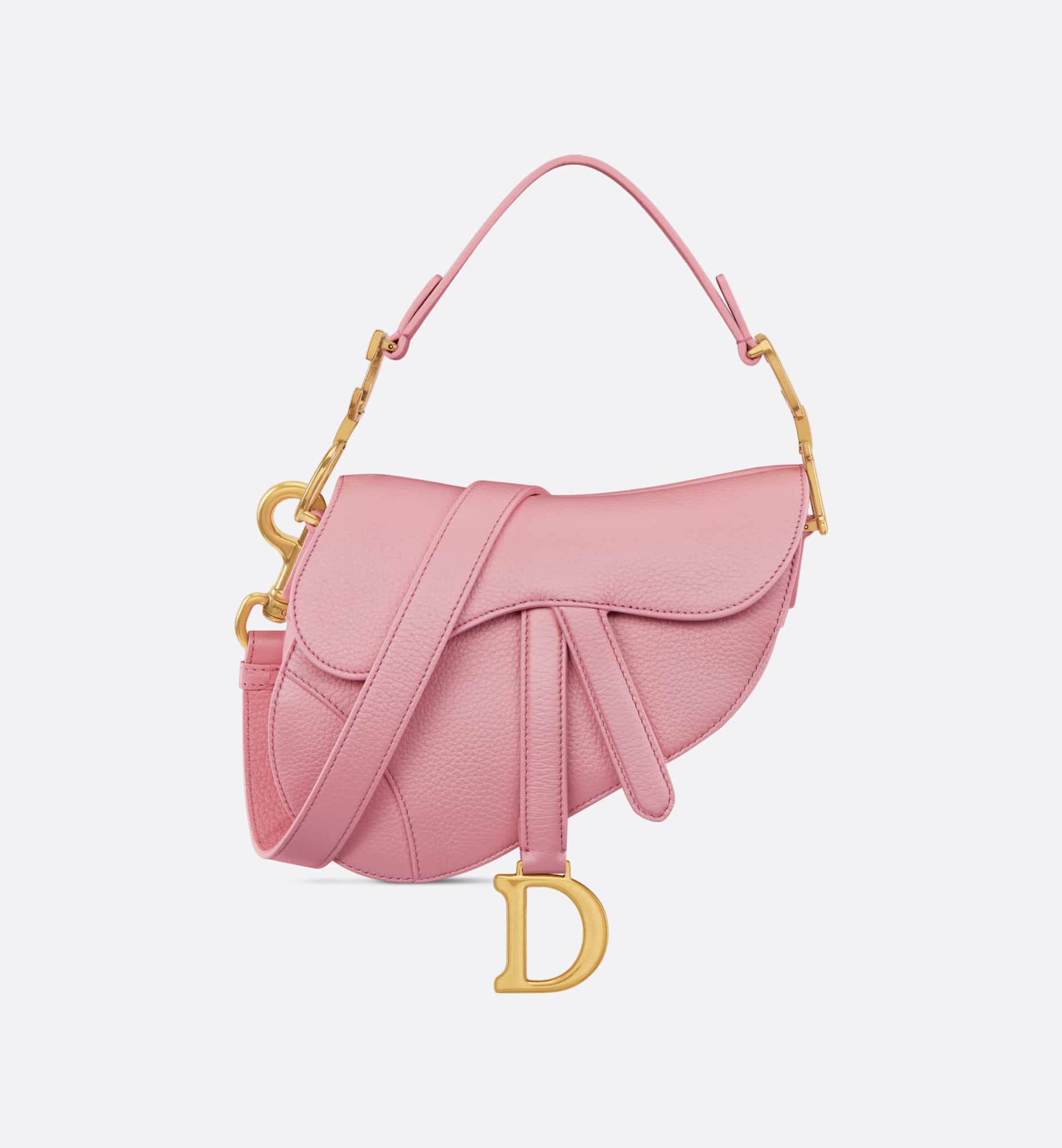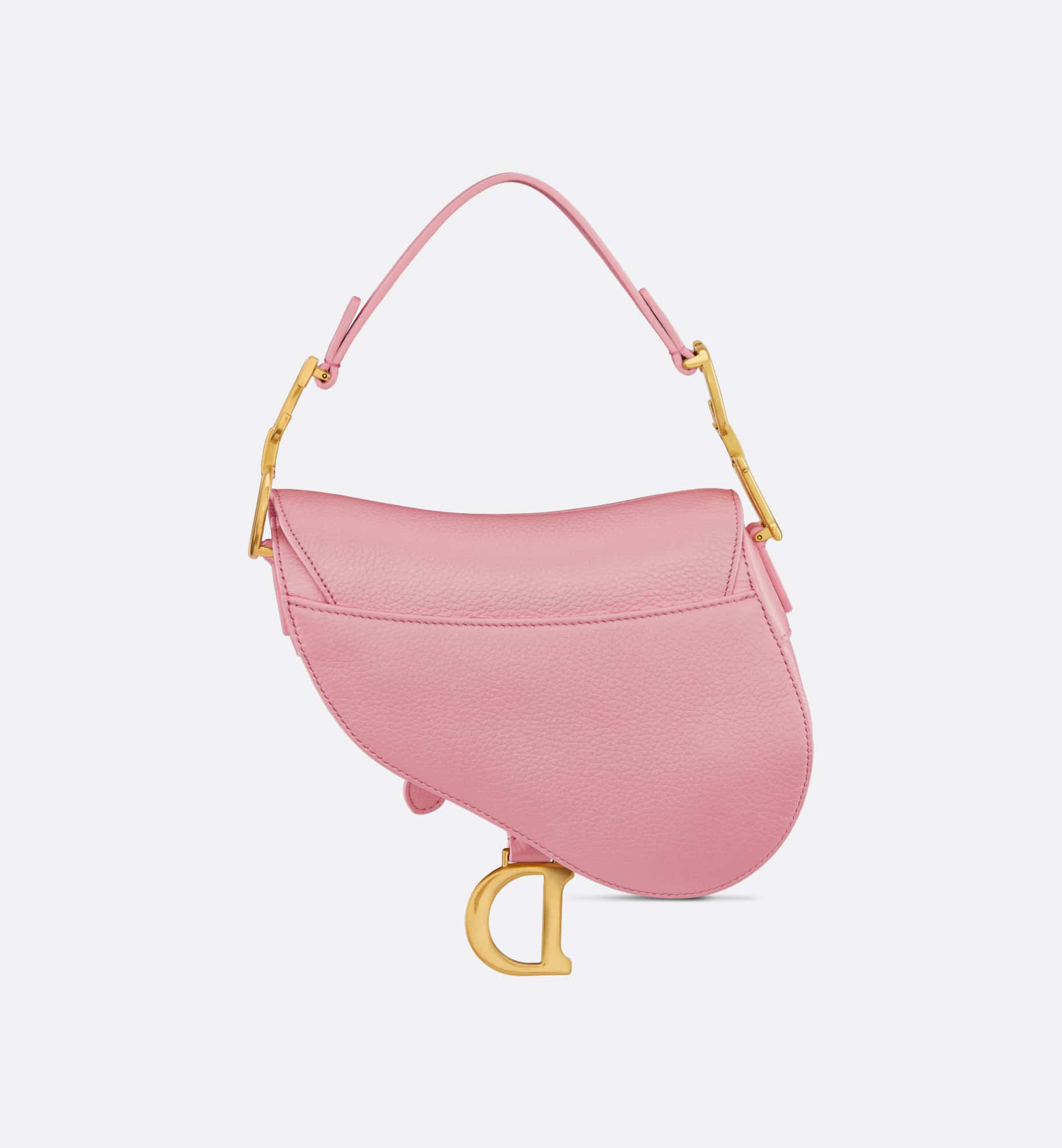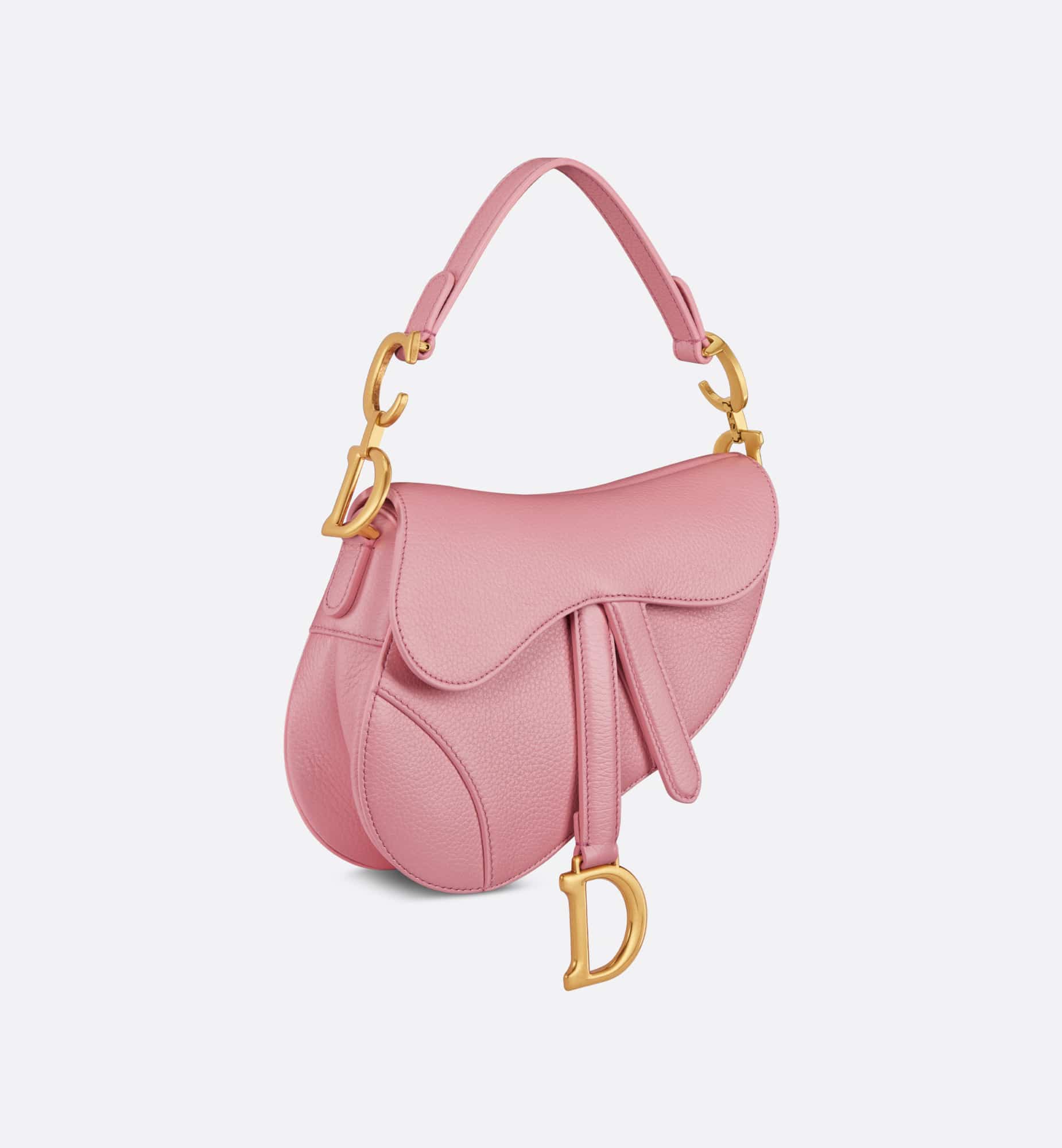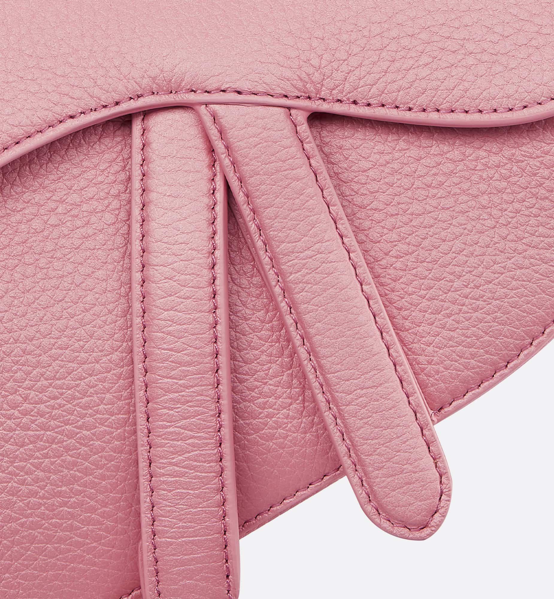 Maria Grazia Chiuri brings a fresh update to the iconic Saddle bag. Crafted in melocoton pink deerskin with a subtle pearlescent effect, the legendary design features a Saddle flap with a D stirrup strap and magnetic pull, as well as an antique gold-finish metal CD signature on either side of the handle. Equipped with a thin, adjustable and removable shoulder strap, the miniature Saddle bag may be carried by hand, worn over the shoulder or crossbody.