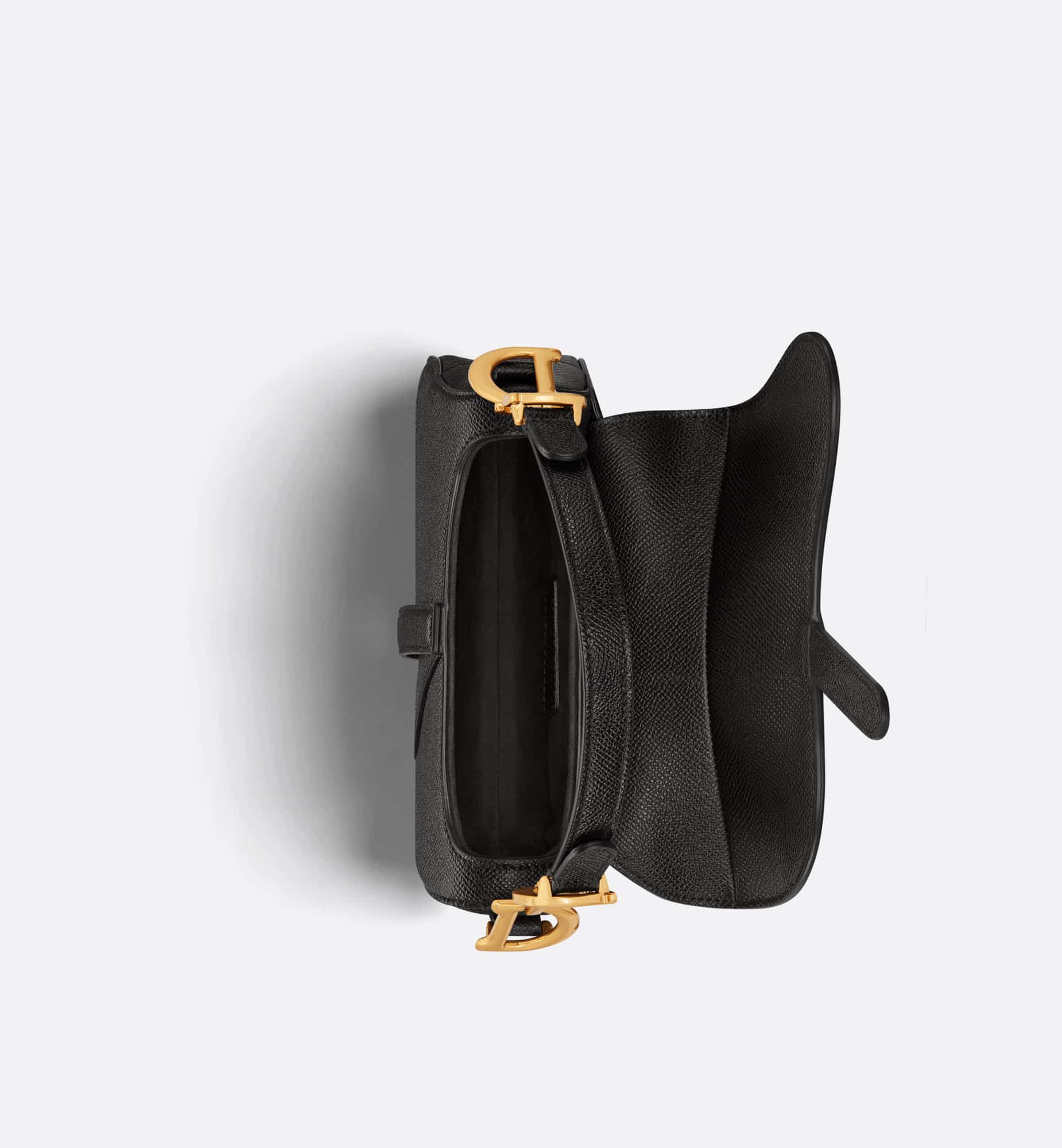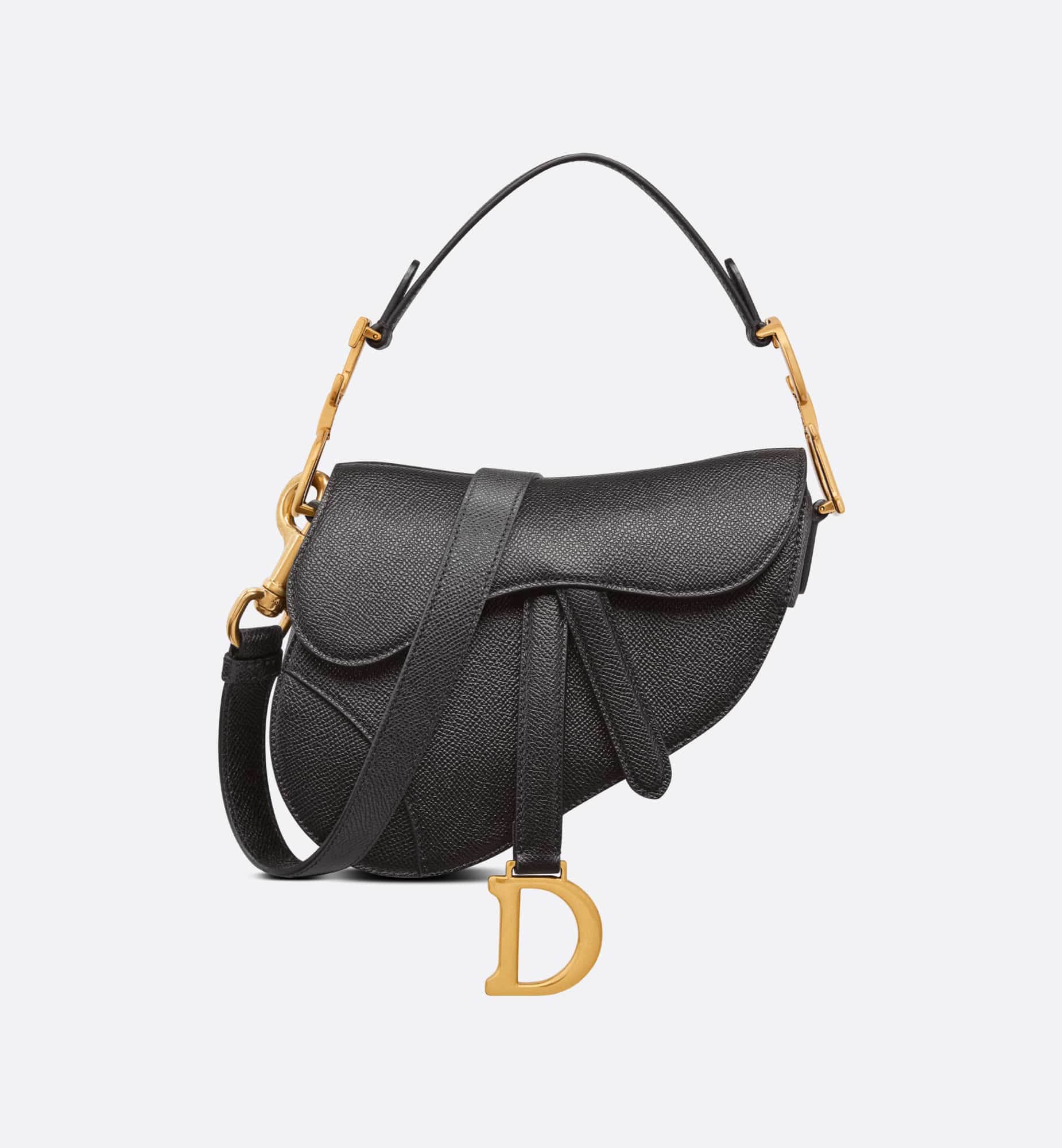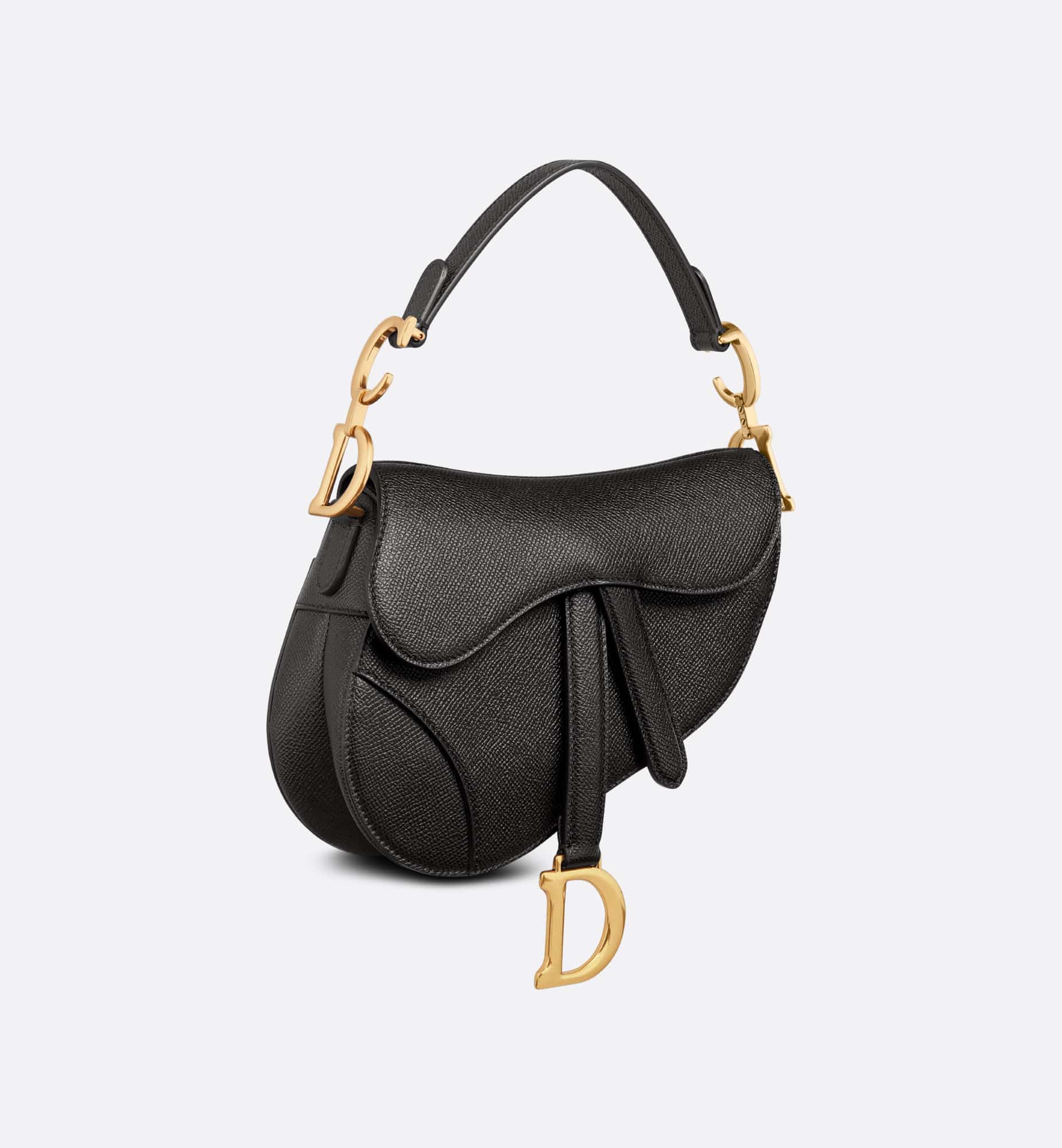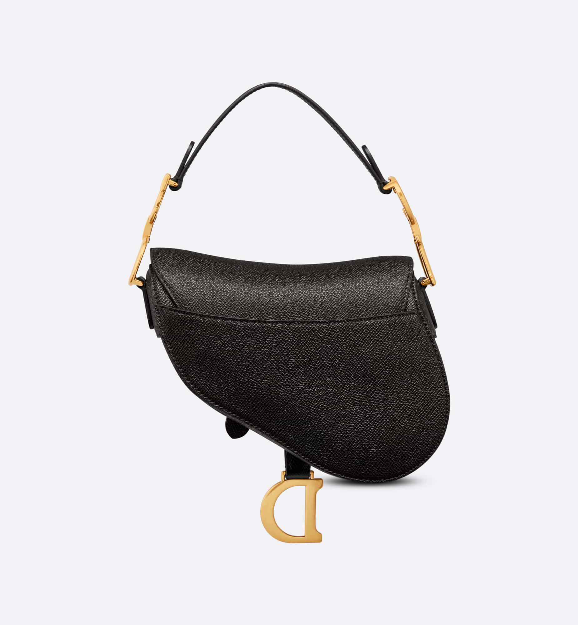 Maria Grazia Chiuri brings a fresh update to the iconic Saddle bag. Crafted in black grained calfskin, the legendary design features a Saddle flap with a D stirrup strap and magnetic pull, as well as an antique gold-finish metal CD signature on either side of the handle. Equipped with a thin, adjustable and removable strap, the miniature Saddle bag may be carried by hand, worn over the shoulder or crossbody.