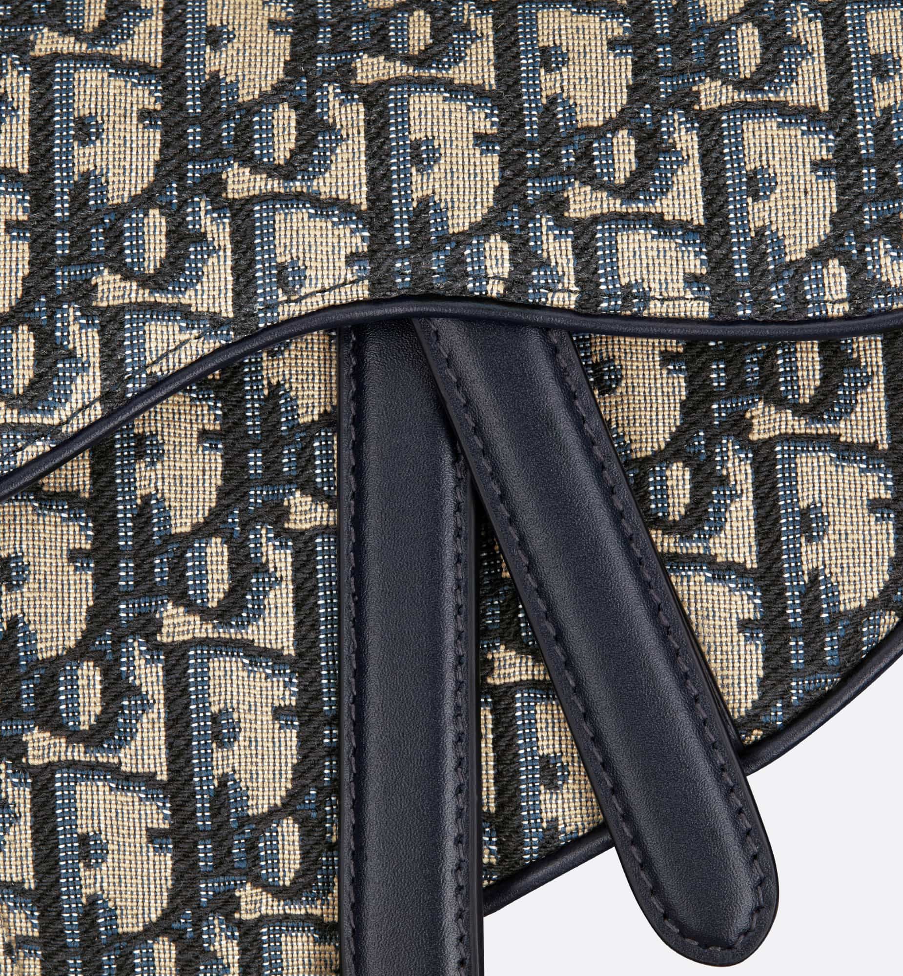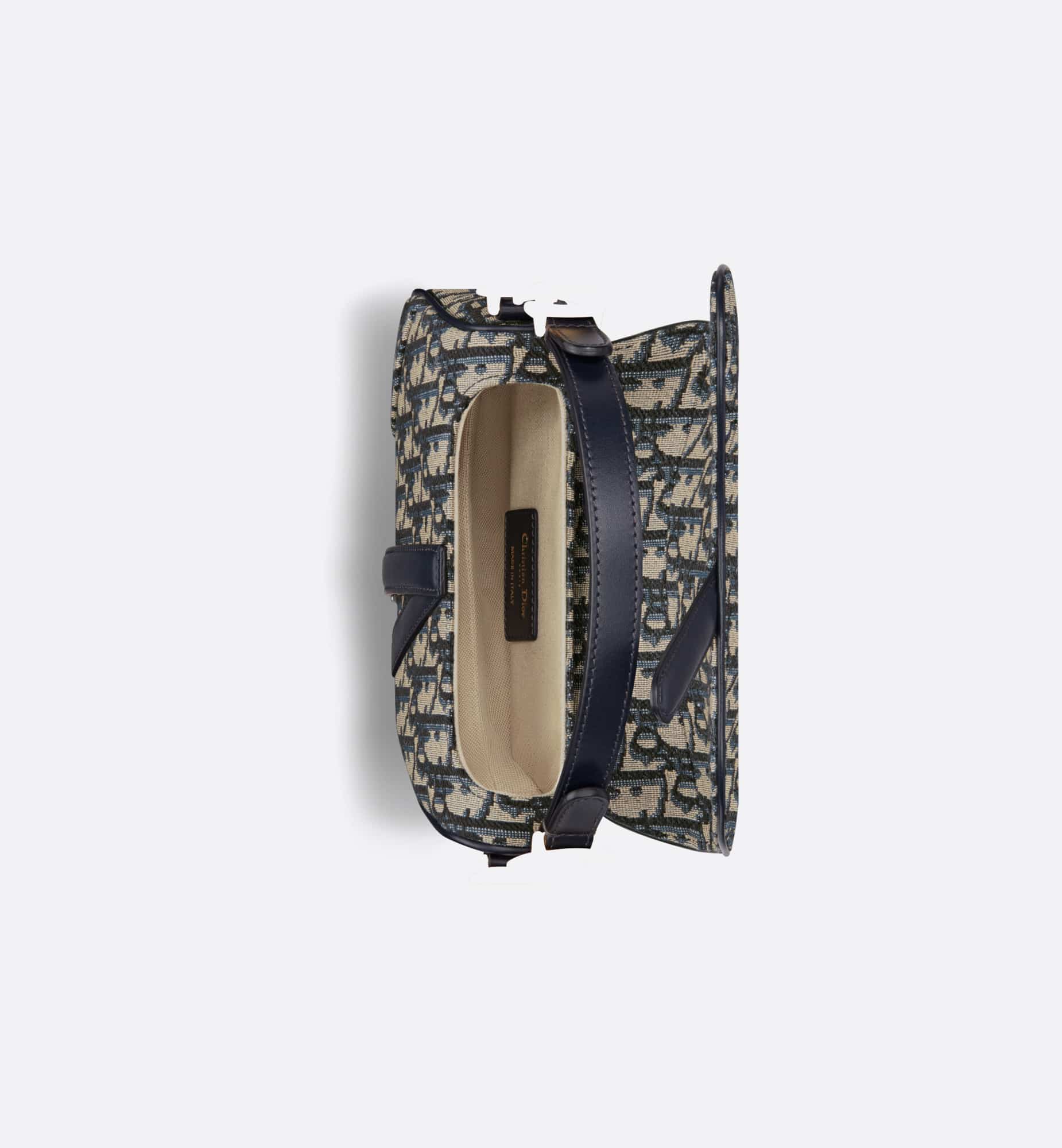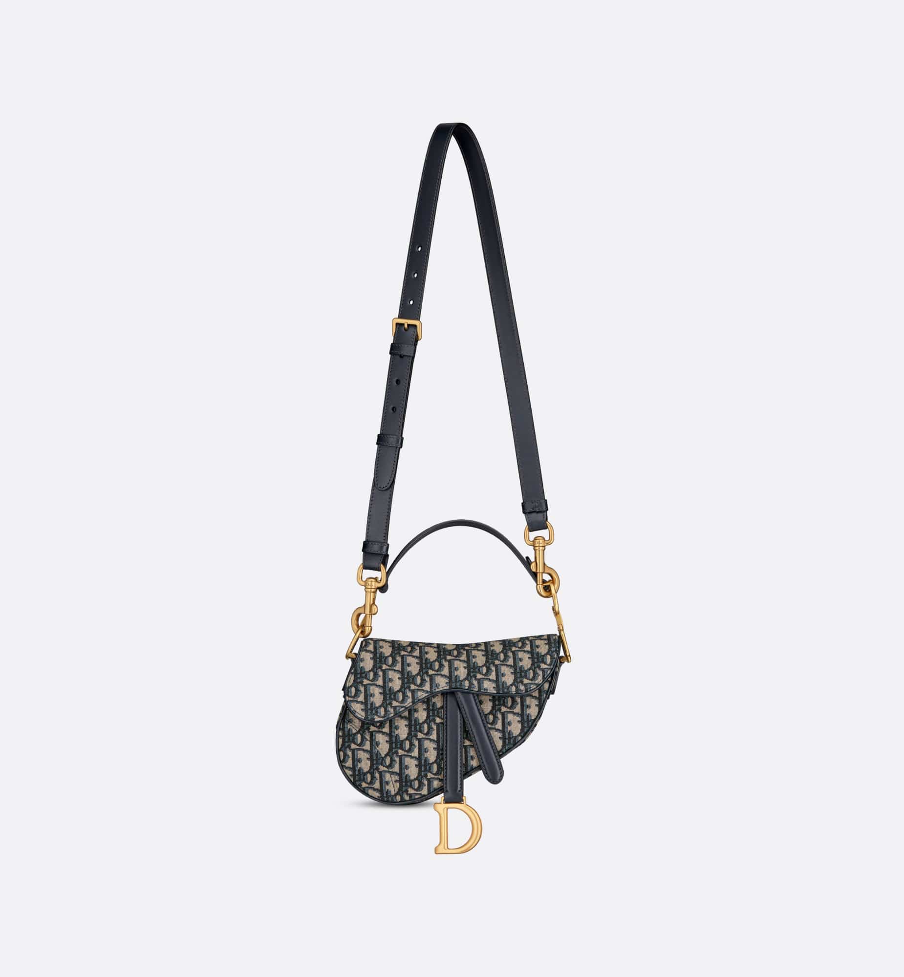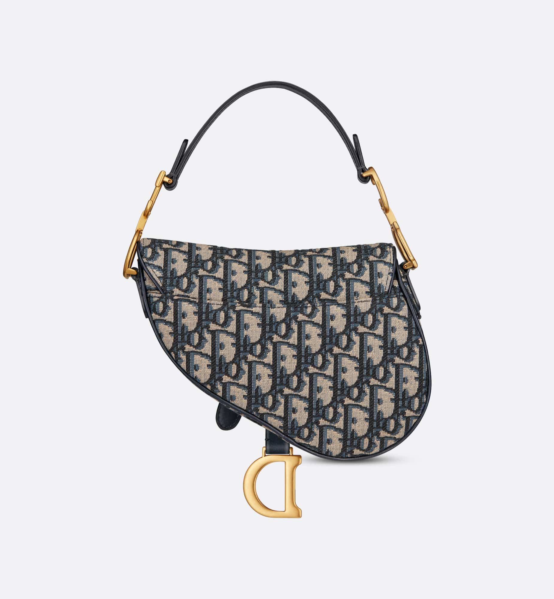 Maria Grazia Chiuri brings a fresh update to the iconic Saddle bag. Crafted in blue Dior Oblique jacquard, the legendary design features a Saddle flap with a D stirrup strap and magnetic pull, as well as an antique gold-finish metal CD signature on either side of the handle. Equipped with a thin, adjustable and removable strap, the miniature Saddle bag may be carried by hand, worn over the shoulder or crossbody.