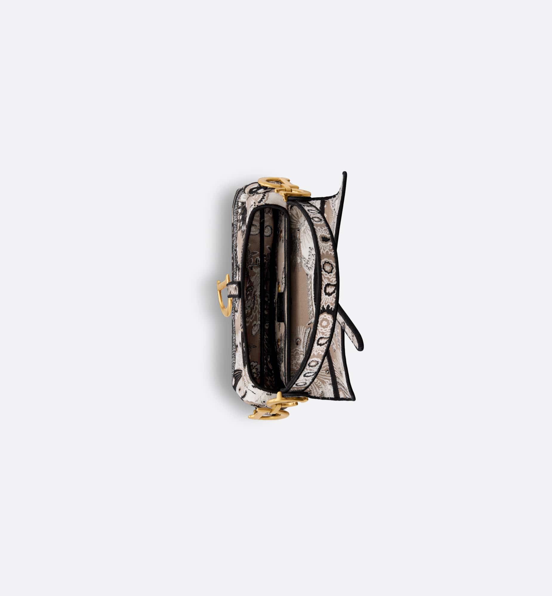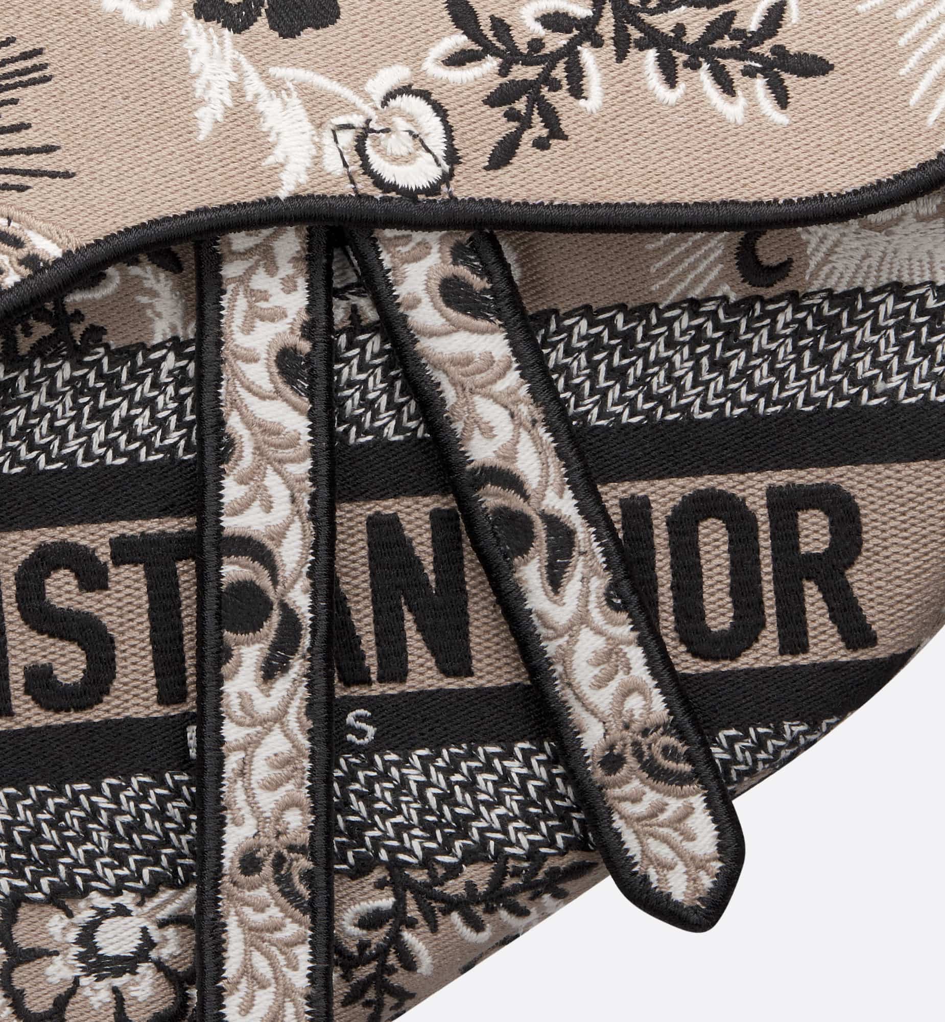 Maria Grazia Chiuri brings a fresh update to the iconic Saddle bag. Fully embroidered with a beige multicolor Butterfly Bandana motif, combining the butterfly and the timeless Bandana pattern in a graphic style, it is enhanced by the Christian Dior Paris signature on the front. The legendary style has a Saddle flap with a D stirrup strap and magnetic pull, as well as an antique gold-finish metal CD signature on each side of the handle. The bag can be carried by hand or worn over the shoulder and may be customized with different shoulder straps.