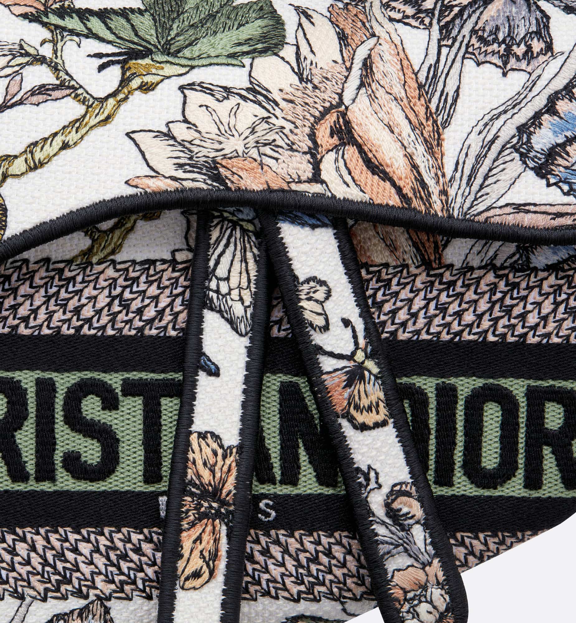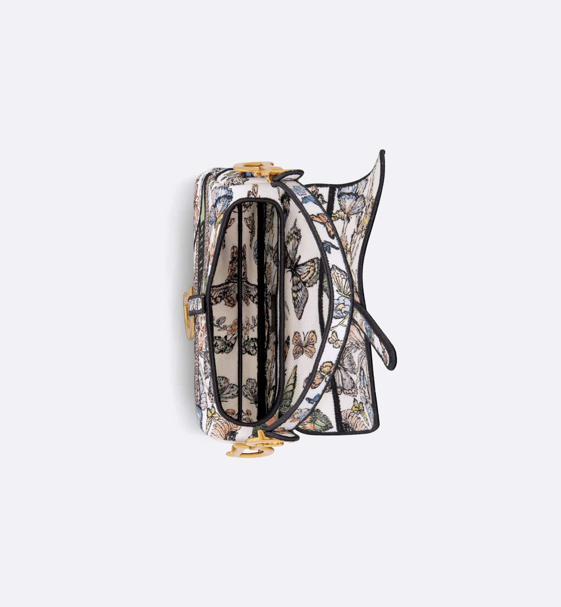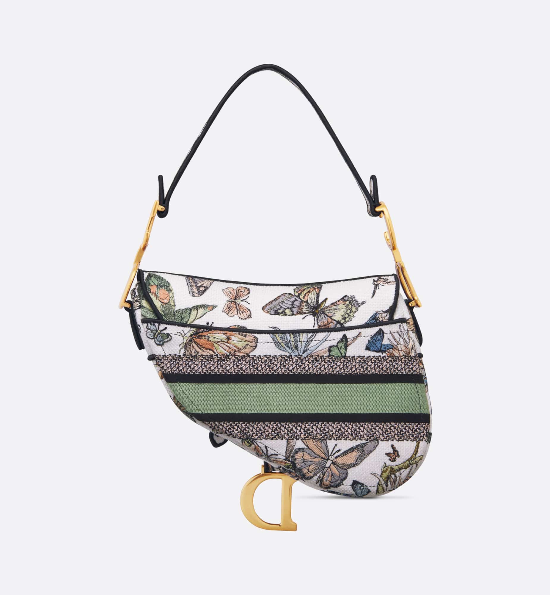Maria Grazia Chiuri brings a fresh update to the iconic Saddle bag. The design is fully embroidered with a white multicolor Toile de Jouy Mexico motif by Pietro Ruffo, showcasing butterflies and traditional Mexican flowers in a concert of colors. Featuring a Christian Dior Paris signature on the front, the legendary design features a Saddle flap with a D stirrup strap and magnetic pull, as well as an antique gold-finish metal CD signature on each side of the handle. The bag can be carried by hand or worn over the shoulder and may be customized with different shoulder straps.