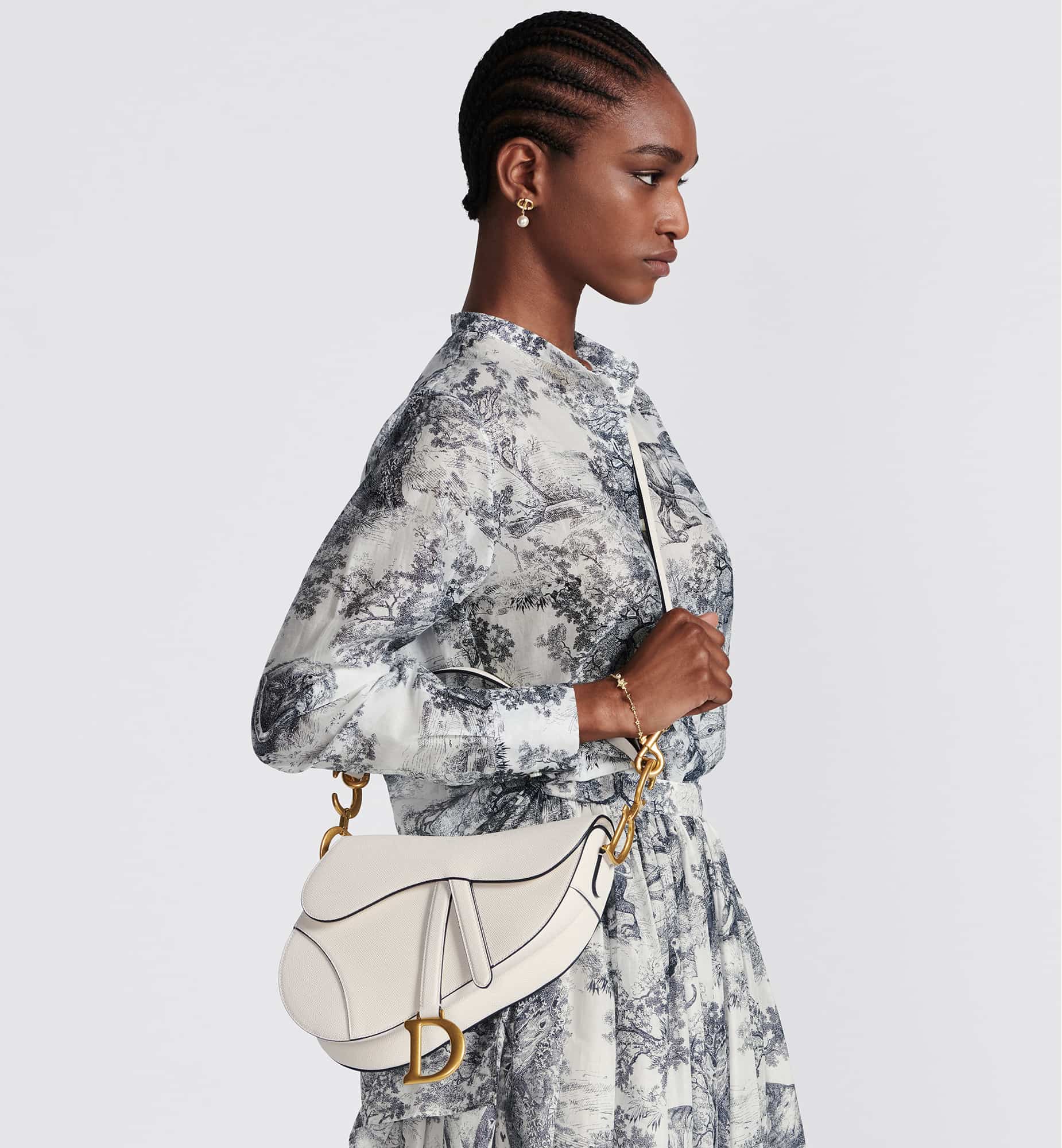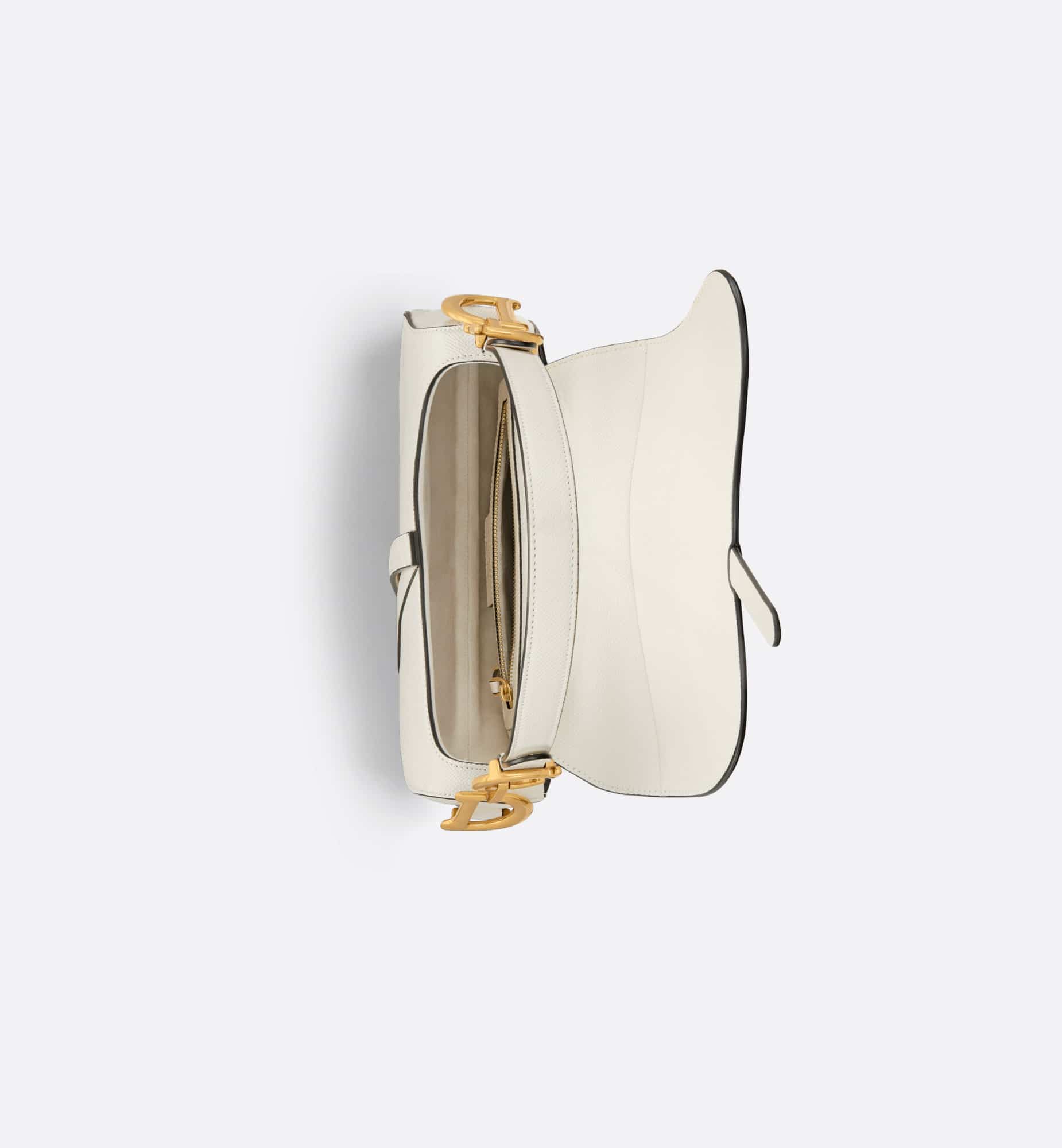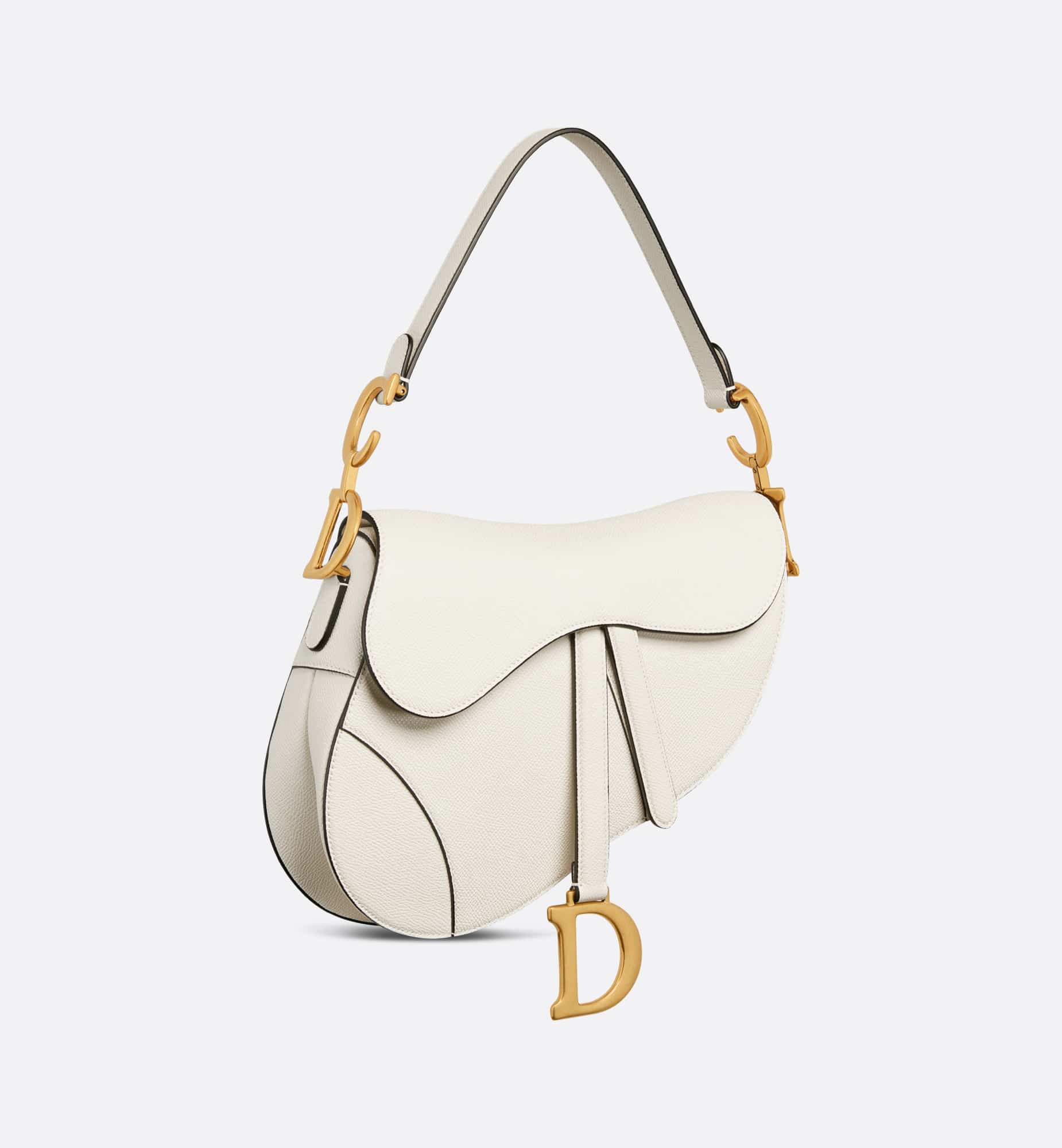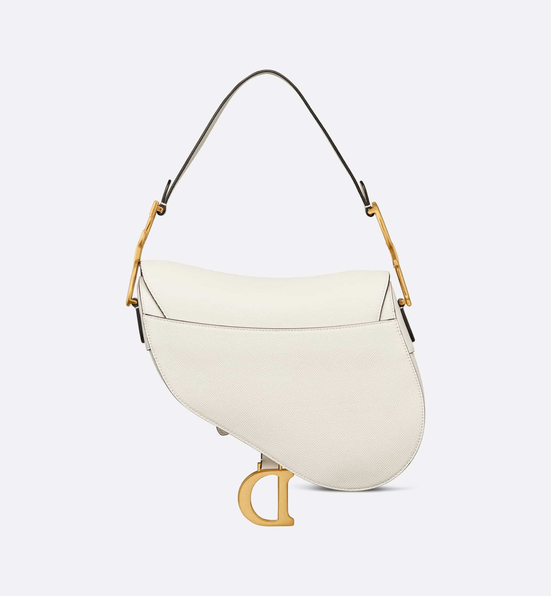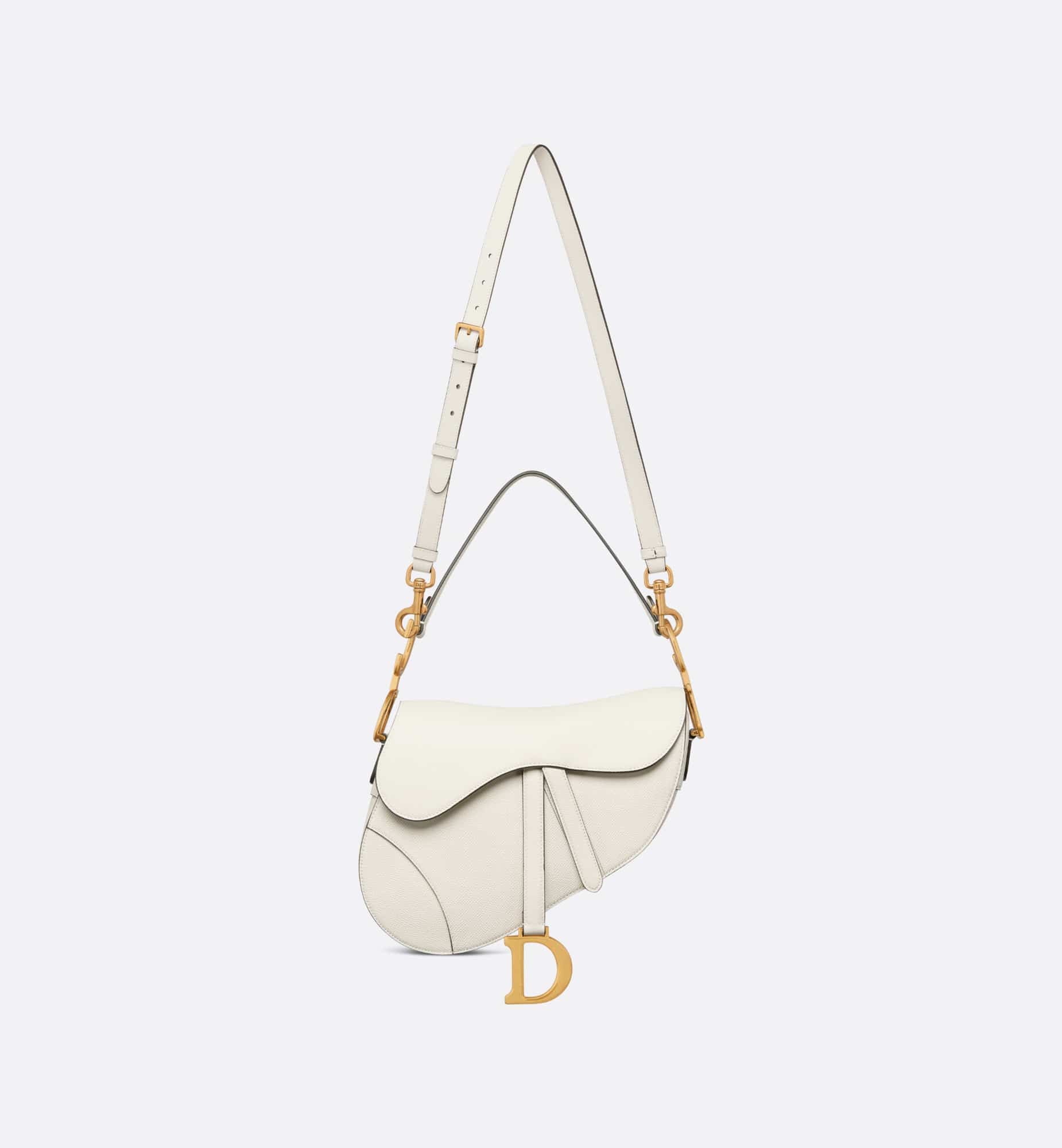 Maria Grazia Chiuri brings a fresh update to the iconic Saddle bag. Crafted in latte grained calfskin, the legendary design features a Saddle flap with a D stirrup strap and magnetic pull, as well as an antique gold-finish metal CD signature on either side of the handle. Equipped with a thin, adjustable and removable strap, the Saddle bag may be carried by hand, worn over the shoulder or crossbody.