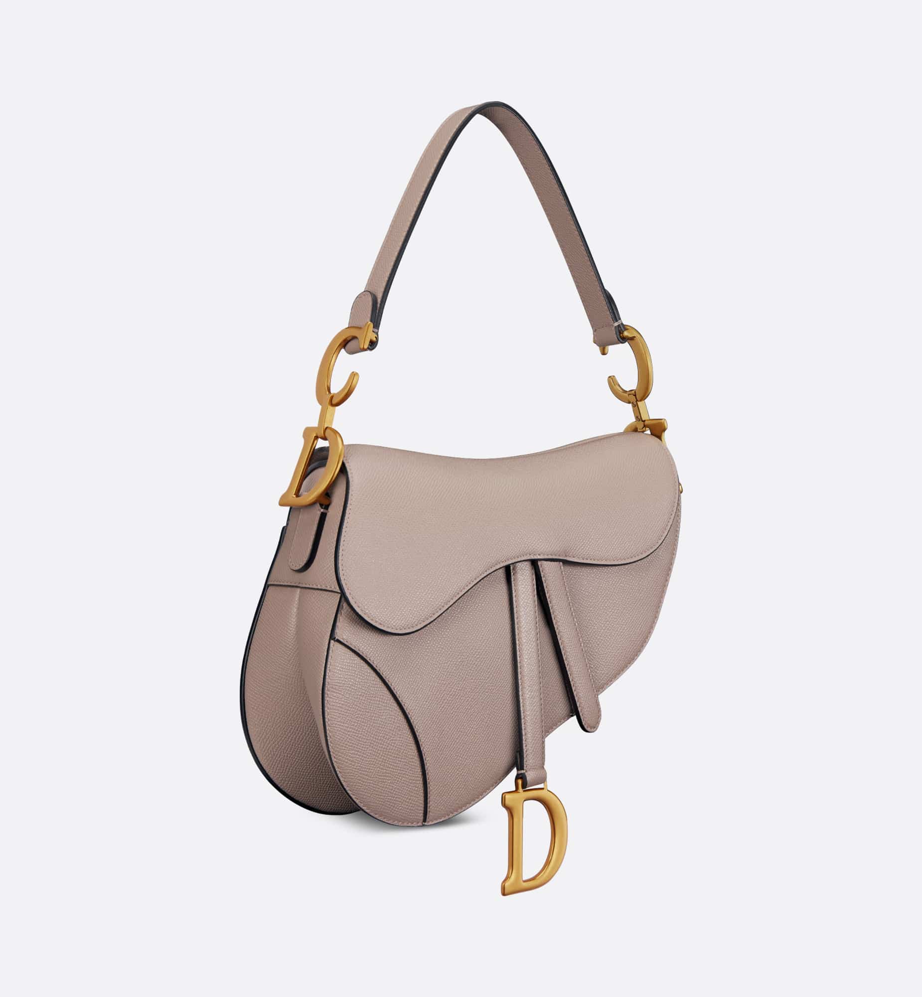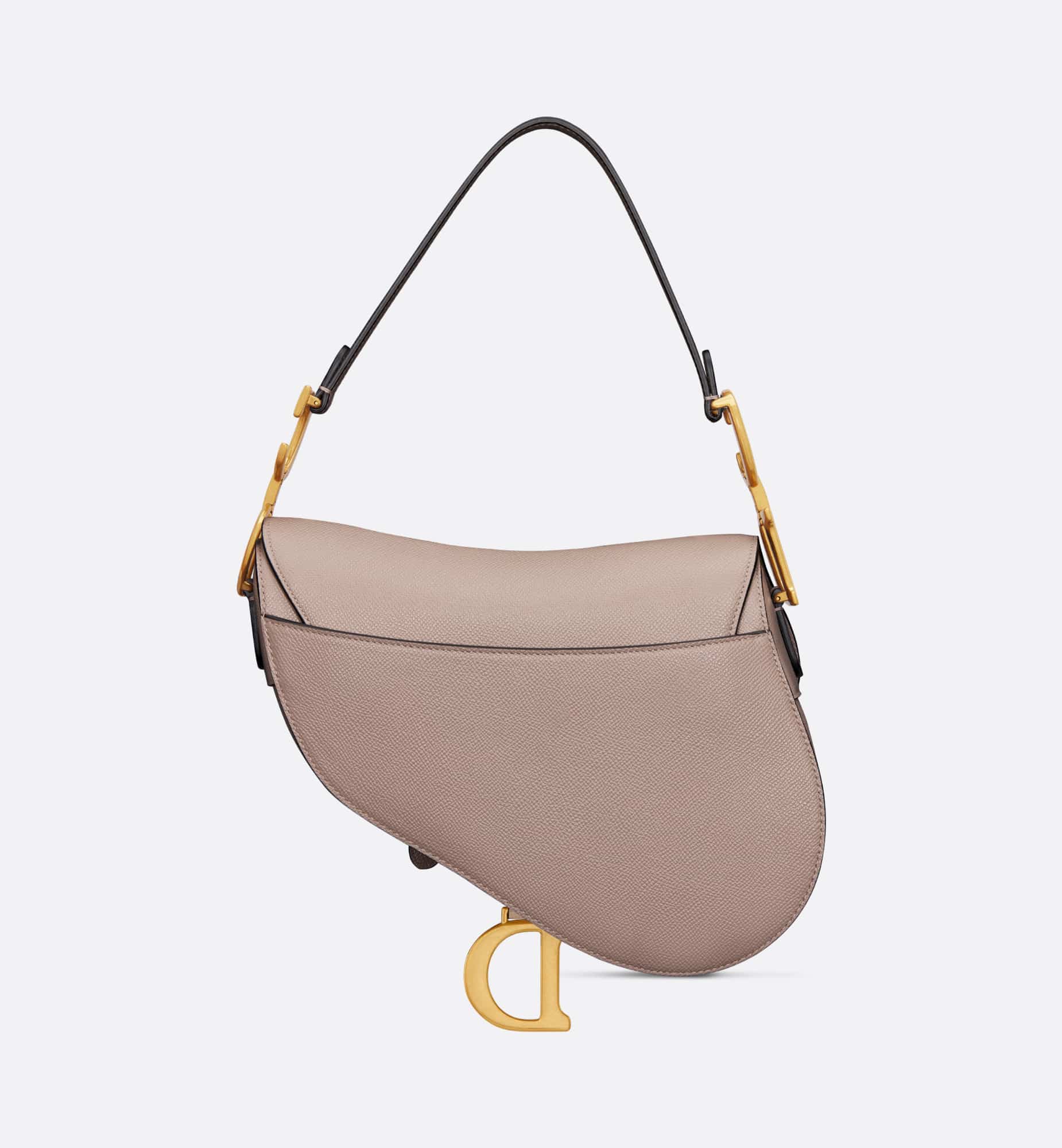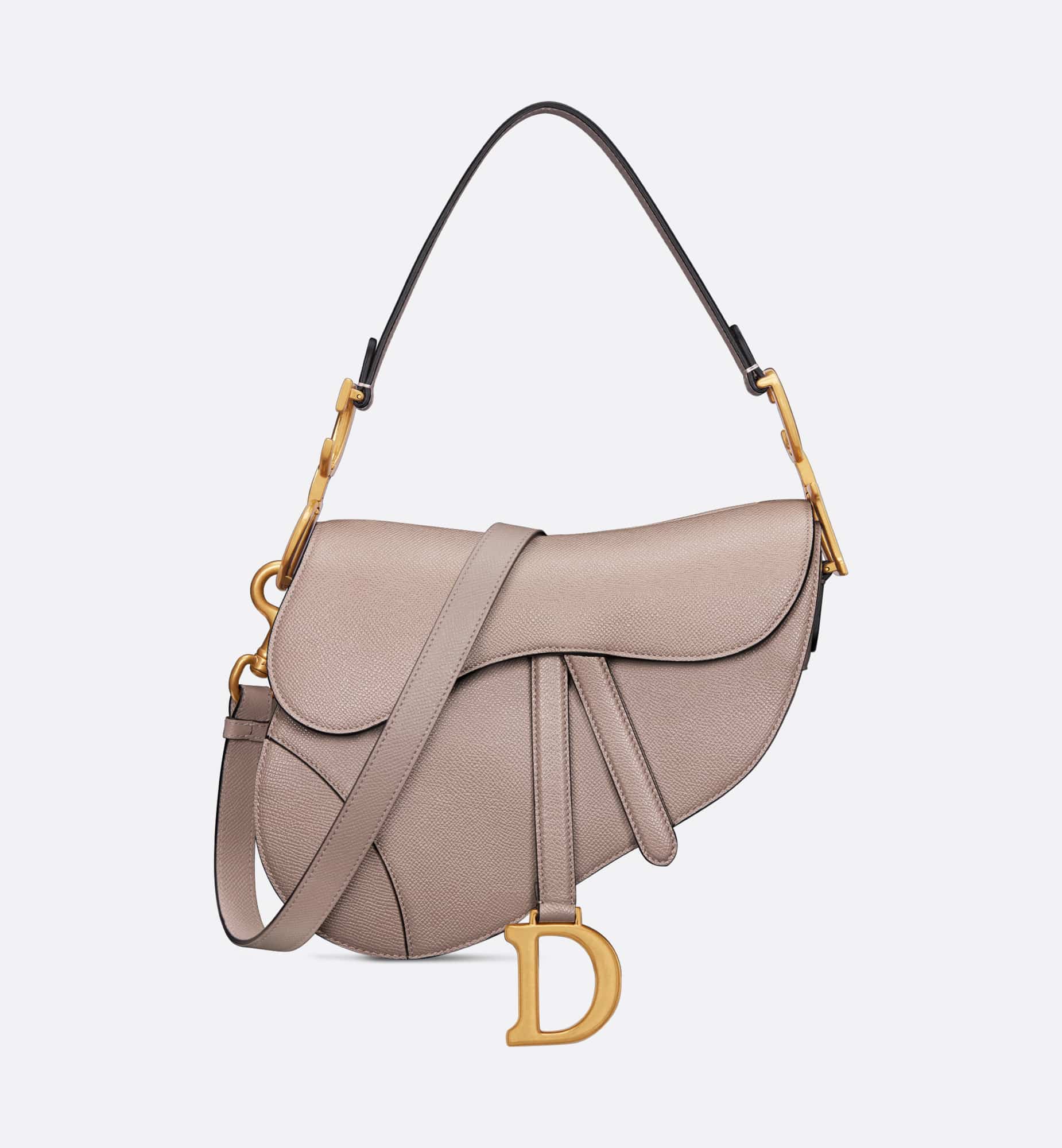 Maria Grazia Chiuri brings a fresh update to the iconic Saddle bag. Crafted in warm taupe grained calfskin, the legendary design presents a Saddle flap with a D stirrup strap and magnetic pull, as well as an antique gold-finish metal CD signature on either side of the handle. Featuring a thin, adjustable and removable strap, the Saddle bag may be carried by hand, worn over the shoulder or crossbody.