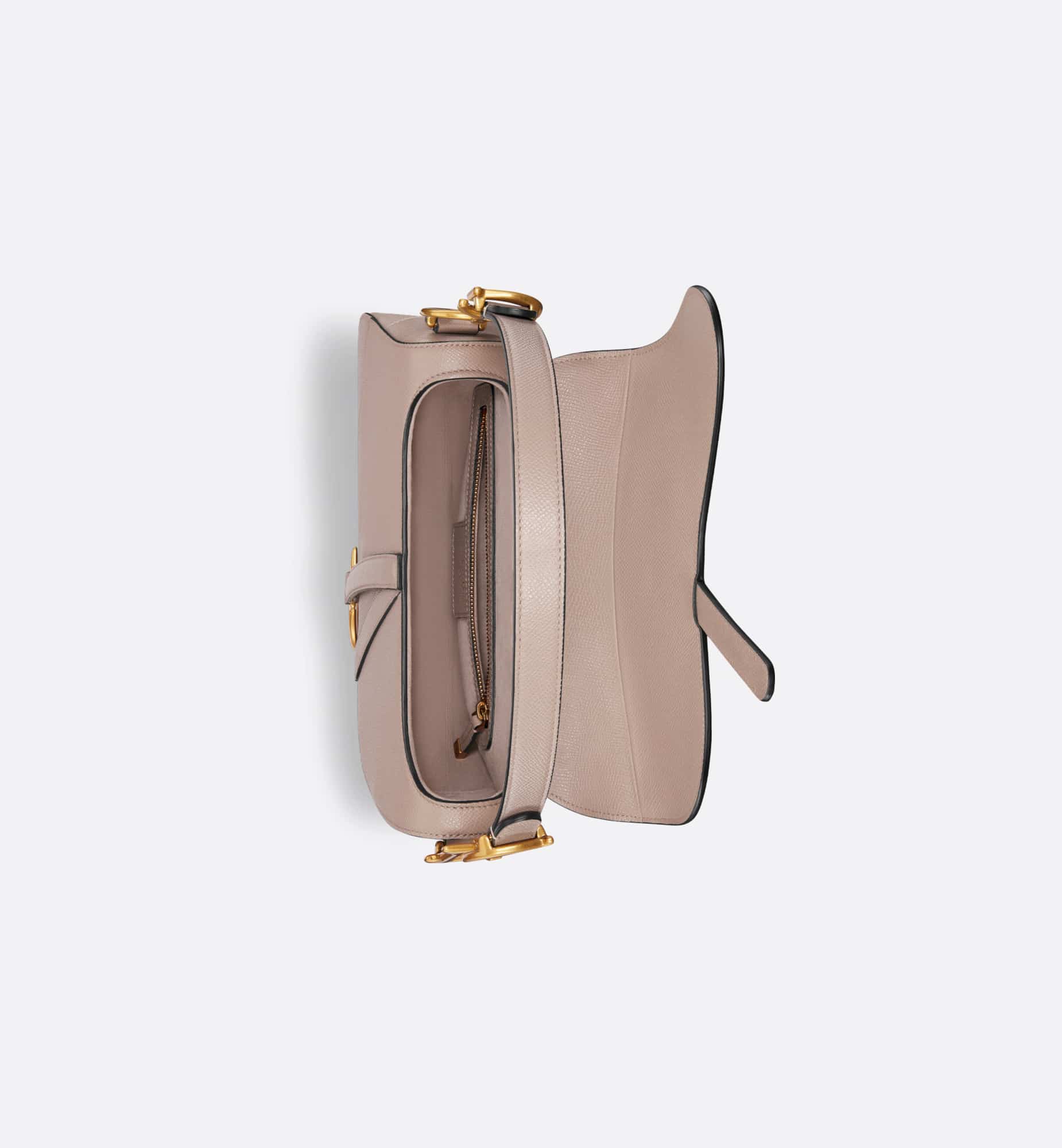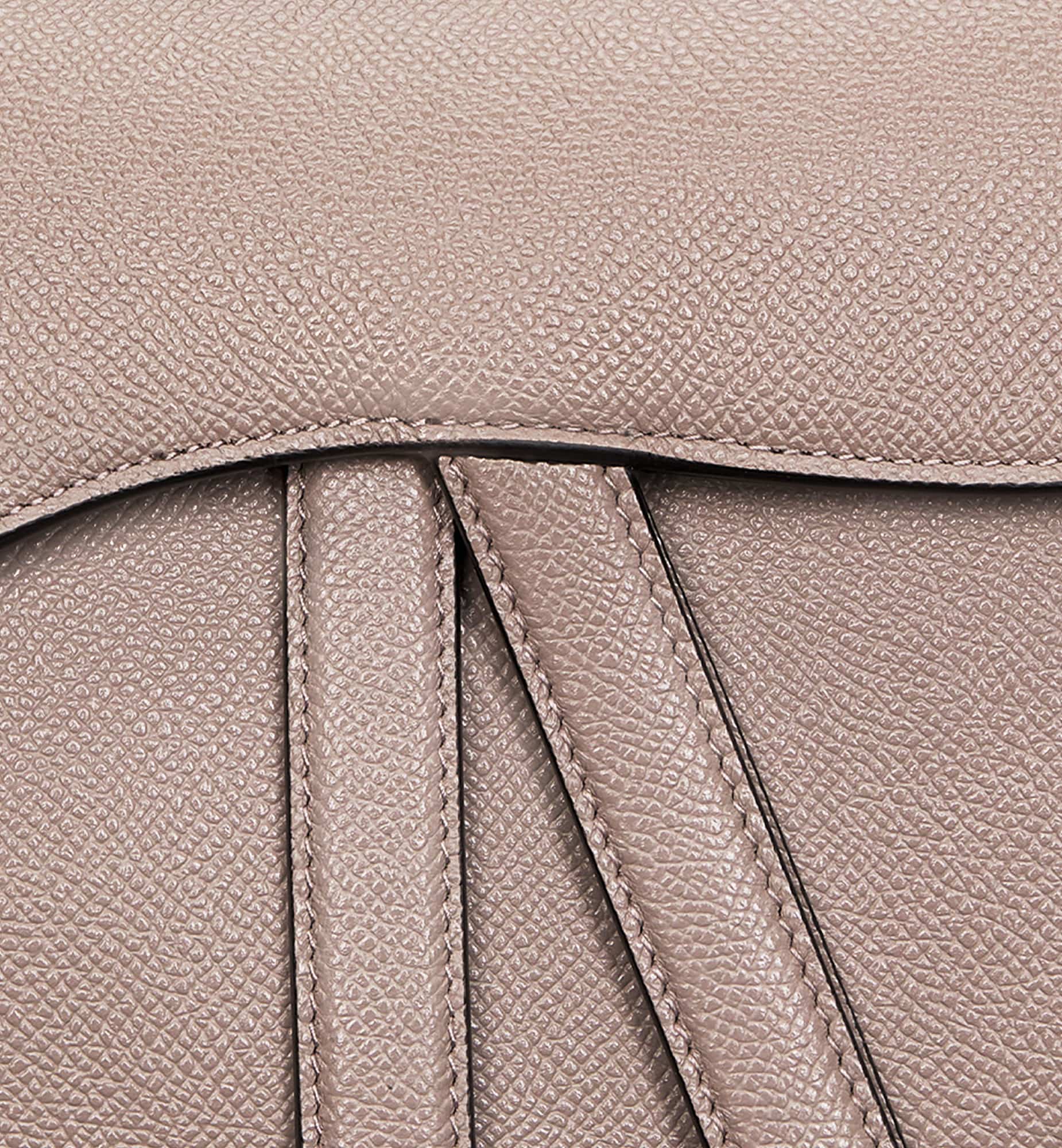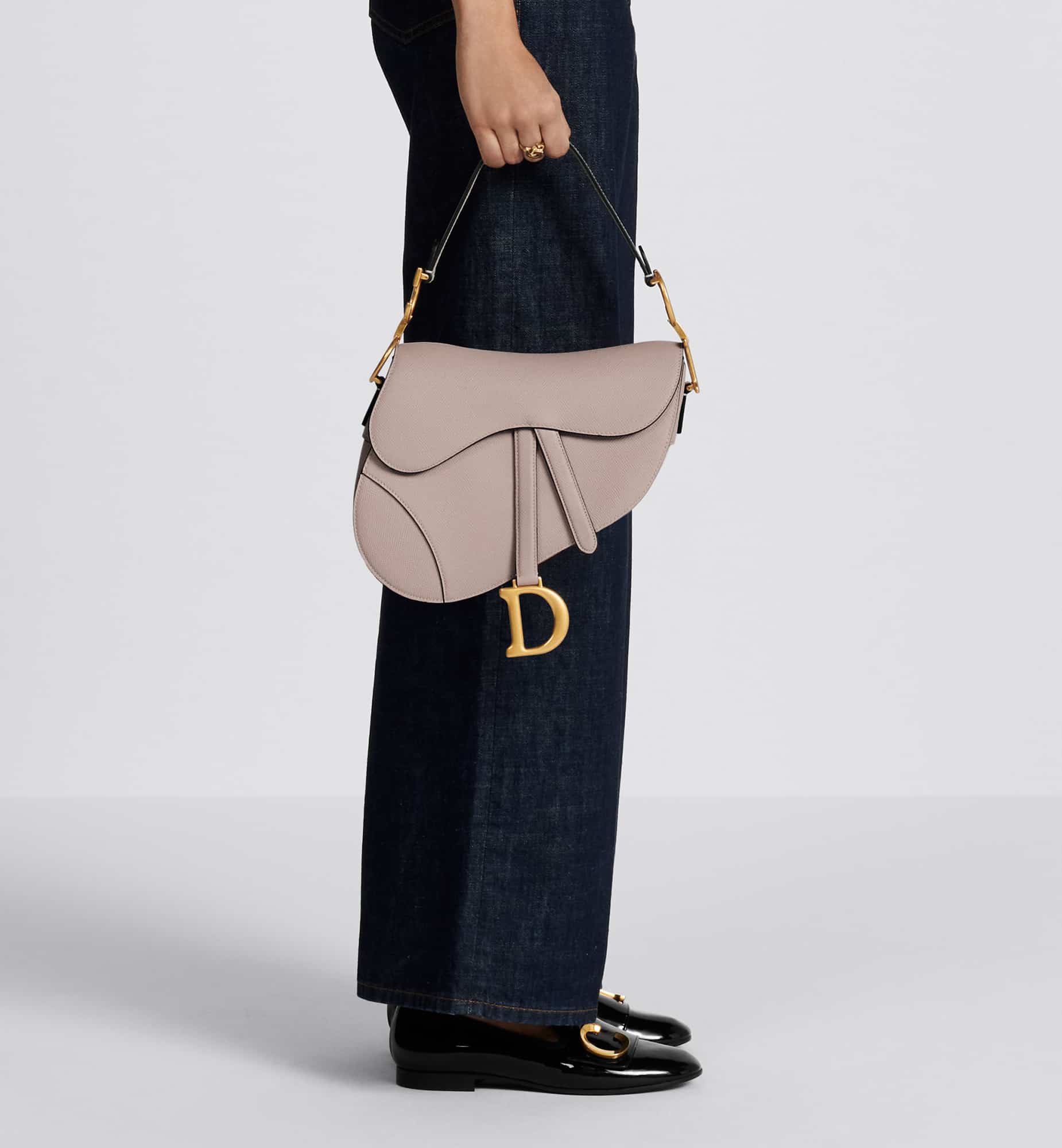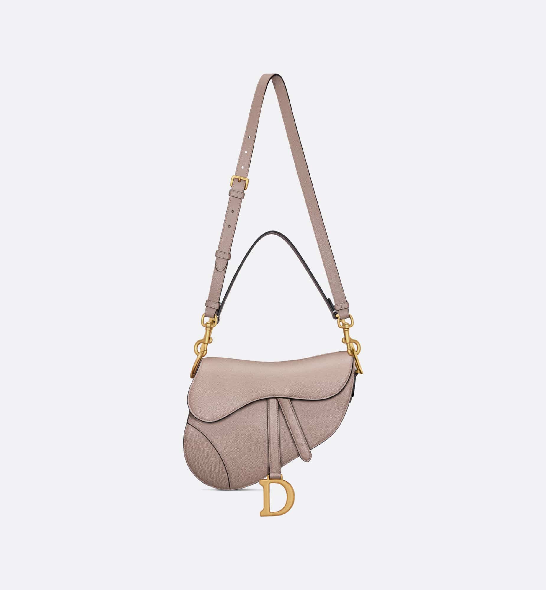 Maria Grazia Chiuri brings a fresh update to the iconic Saddle bag. Crafted in warm taupe grained calfskin, the legendary design presents a Saddle flap with a D stirrup strap and magnetic pull, as well as an antique gold-finish metal CD signature on either side of the handle. Featuring a thin, adjustable and removable strap, the Saddle bag may be carried by hand, worn over the shoulder or crossbody.