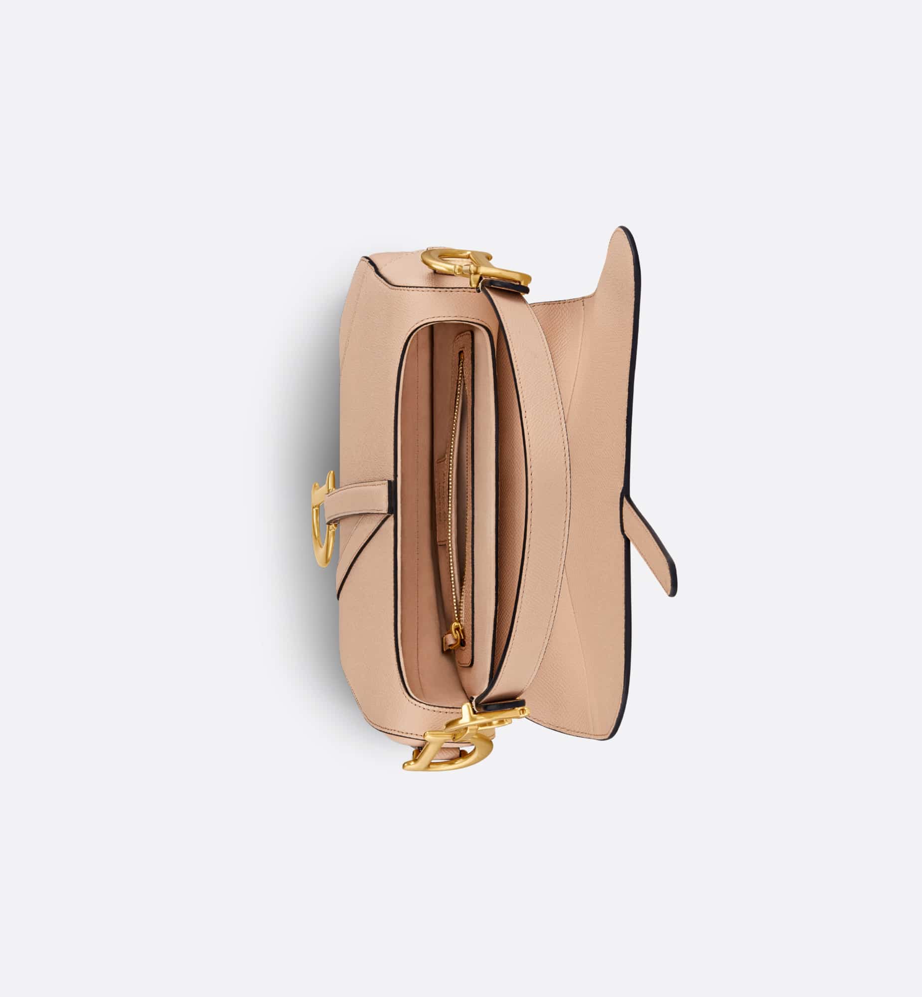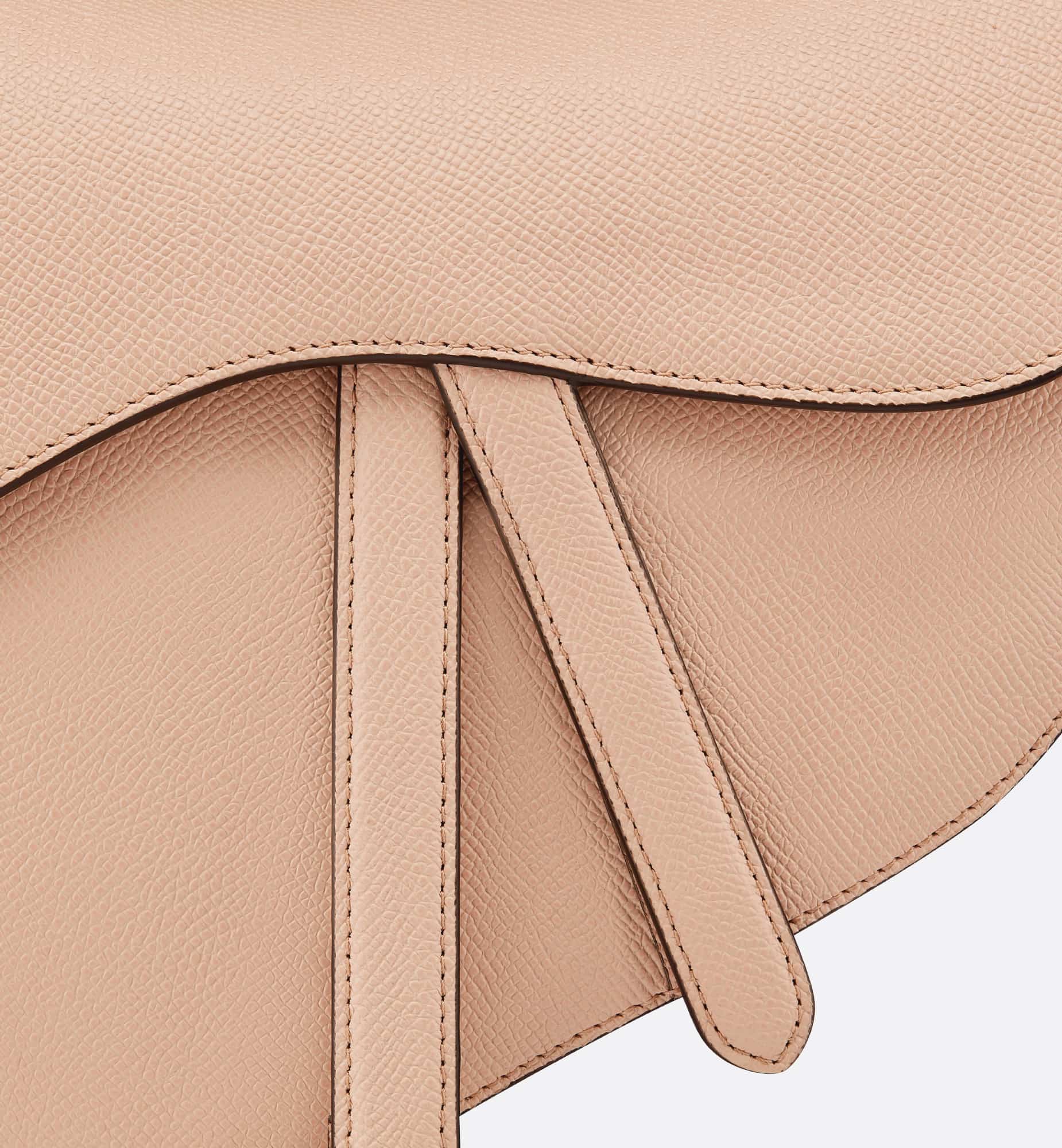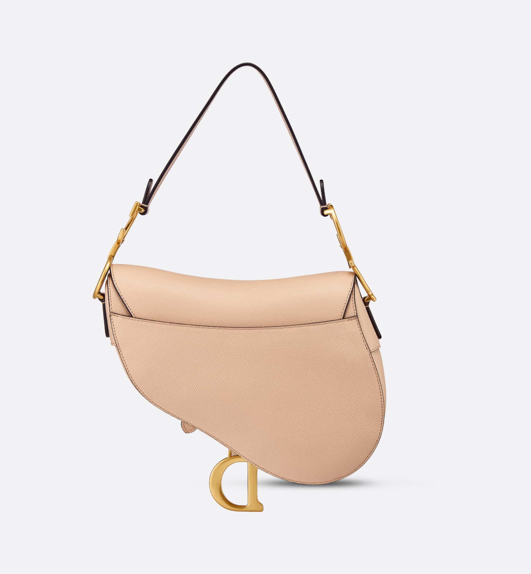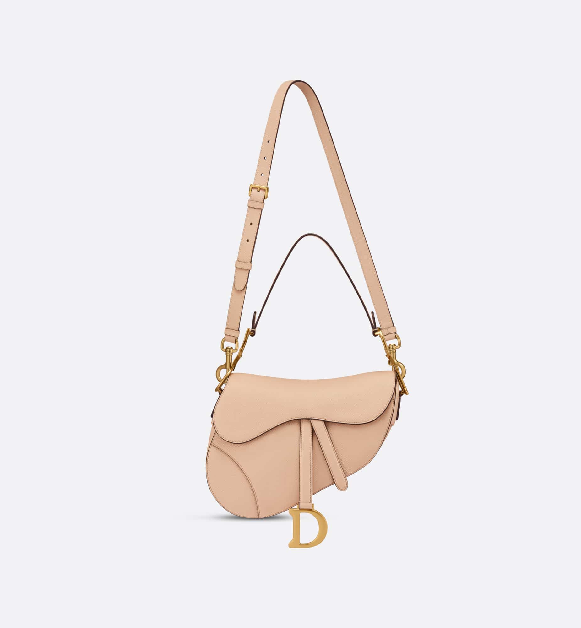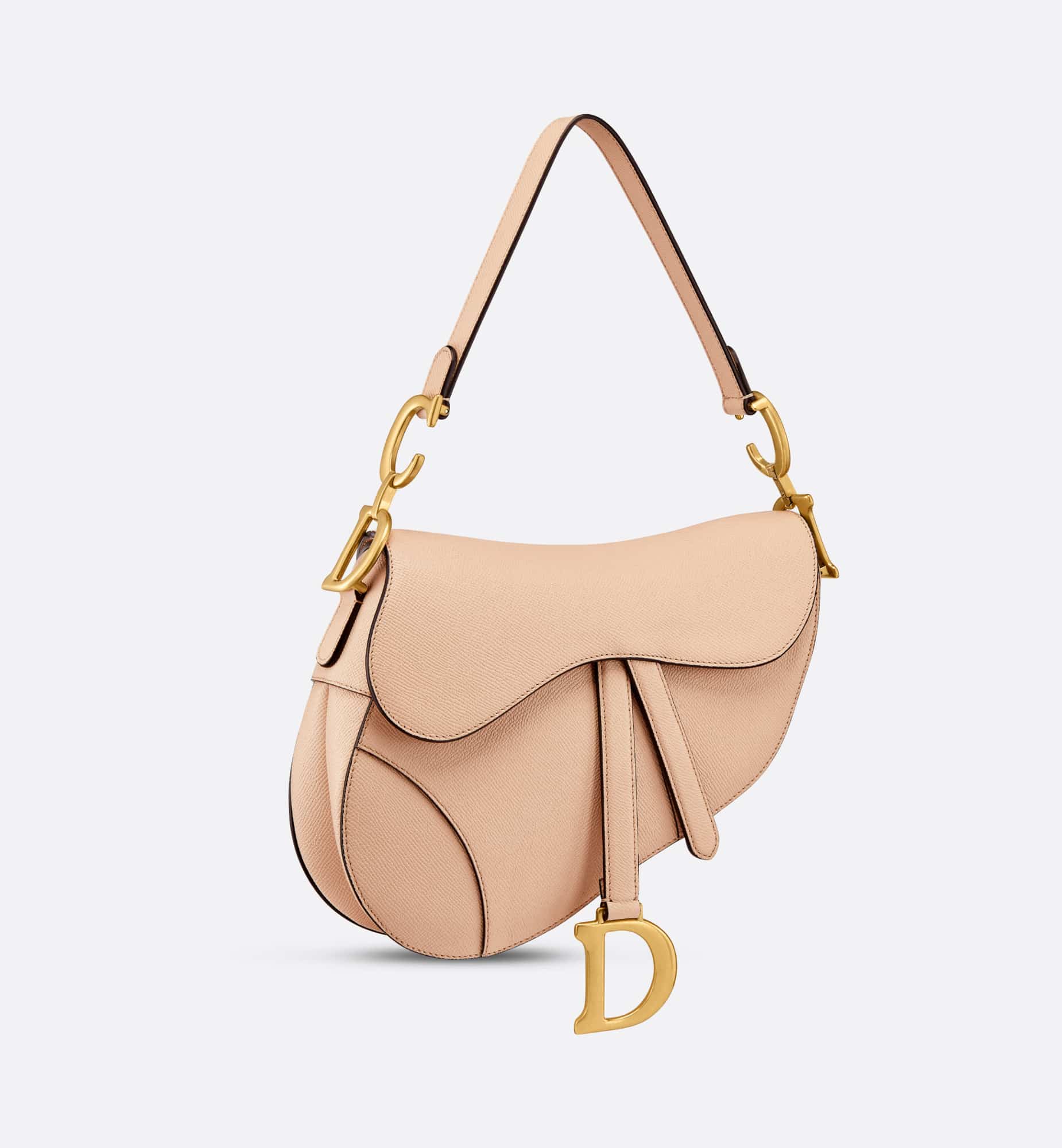 Maria Grazia Chiuri brings a fresh update to the iconic Saddle bag. Crafted in sand pink grained calfskin, the legendary design features a Saddle flap with a D stirrup strap and magnetic pull, as well as an antique gold-finish metal CD signature on either side of the handle. Featuring a thin, adjustable and removable strap, the Saddle bag may be carried by hand, worn over the shoulder or crossbody.