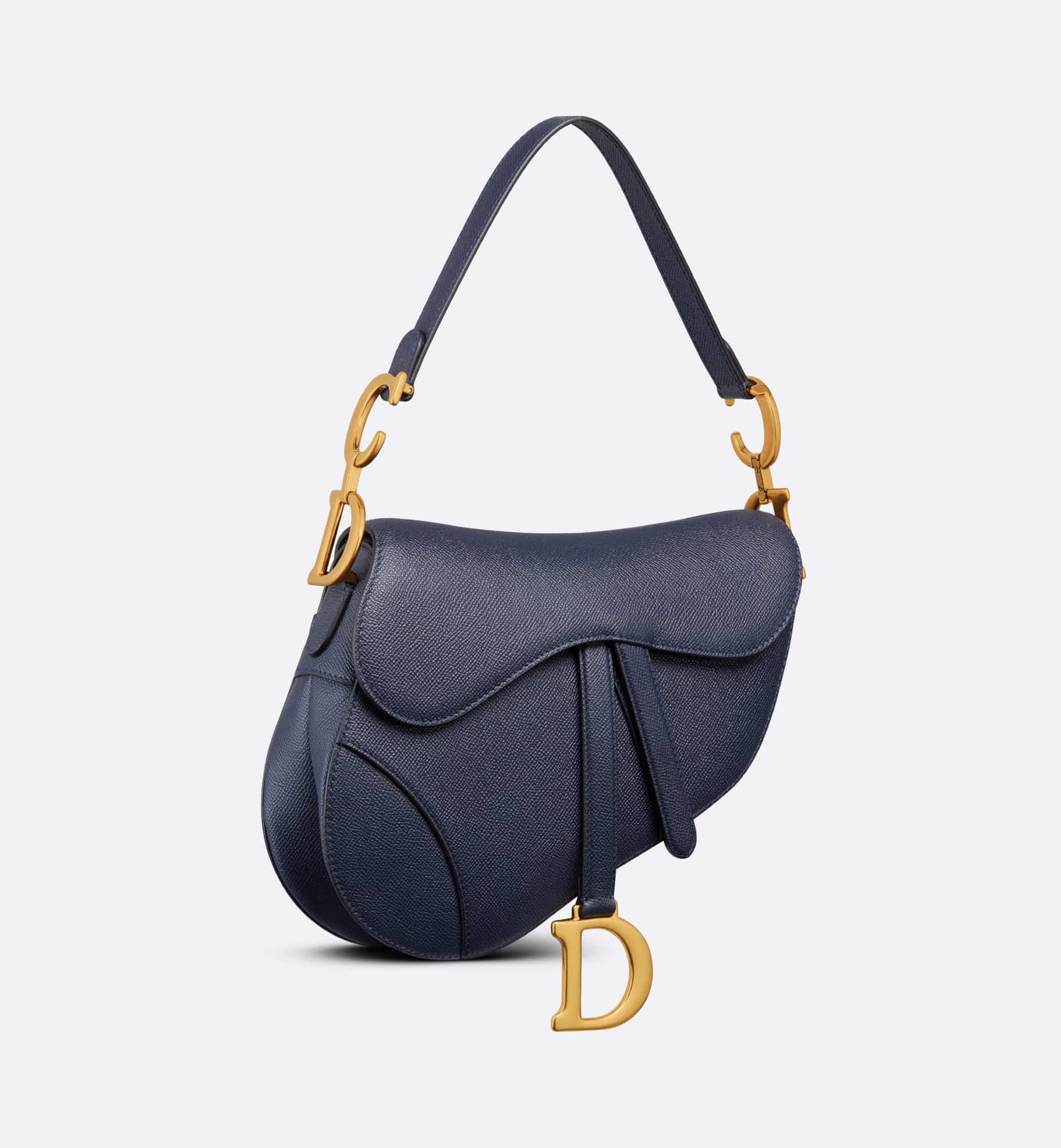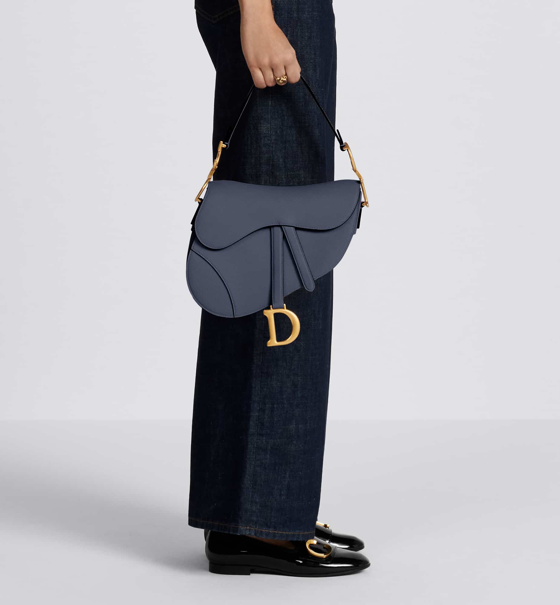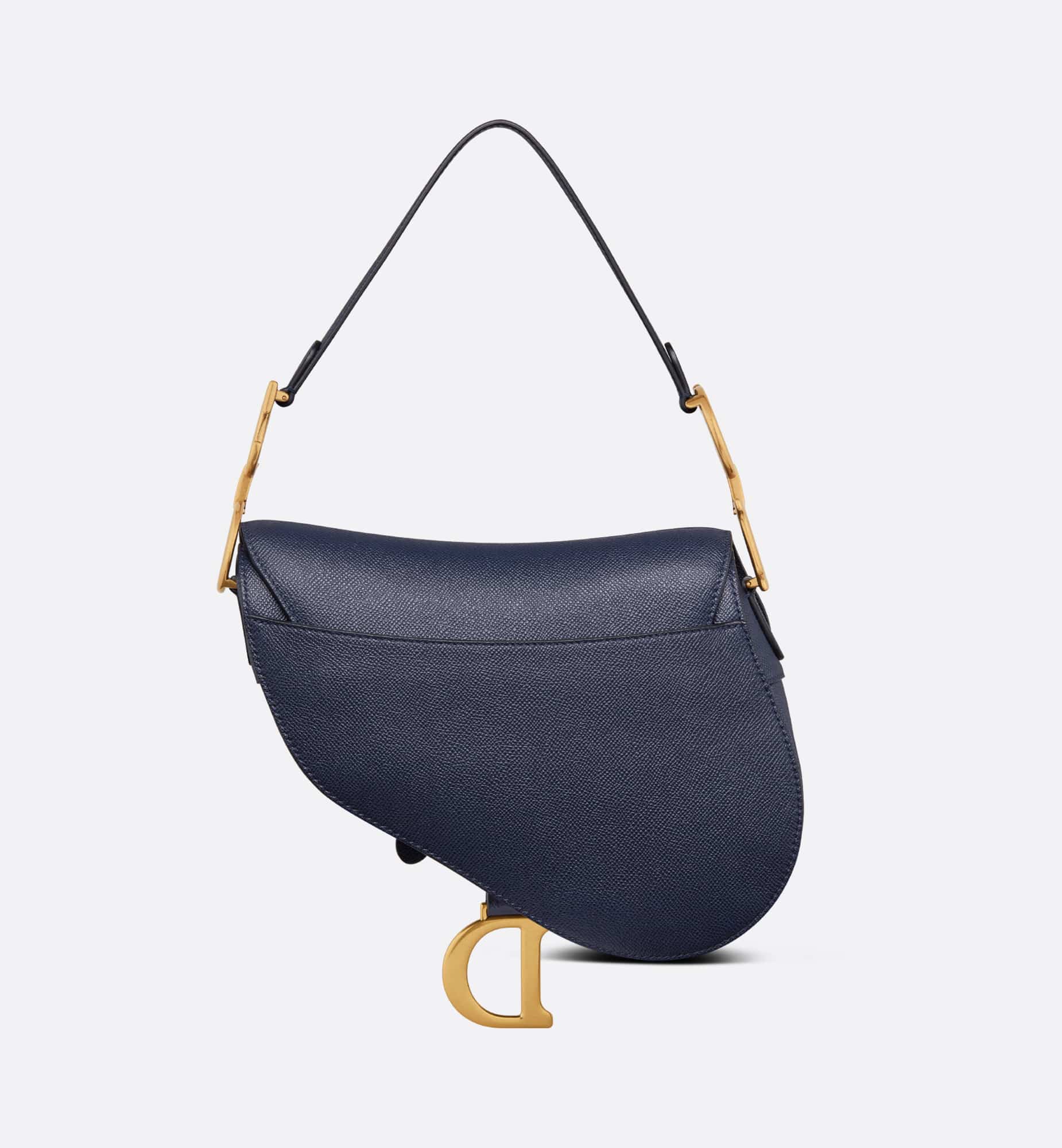 Maria Grazia Chiuri brings a fresh update to the iconic Saddle bag. Crafted in indigo blue grained calfskin, the legendary design features a Saddle flap with a D stirrup strap and magnetic pull, as well as an antique gold-finish metal CD signature on either side of the handle. Equipped with a thin, adjustable and removable strap, the Saddle bag may be carried by hand, worn over the shoulder or crossbody.