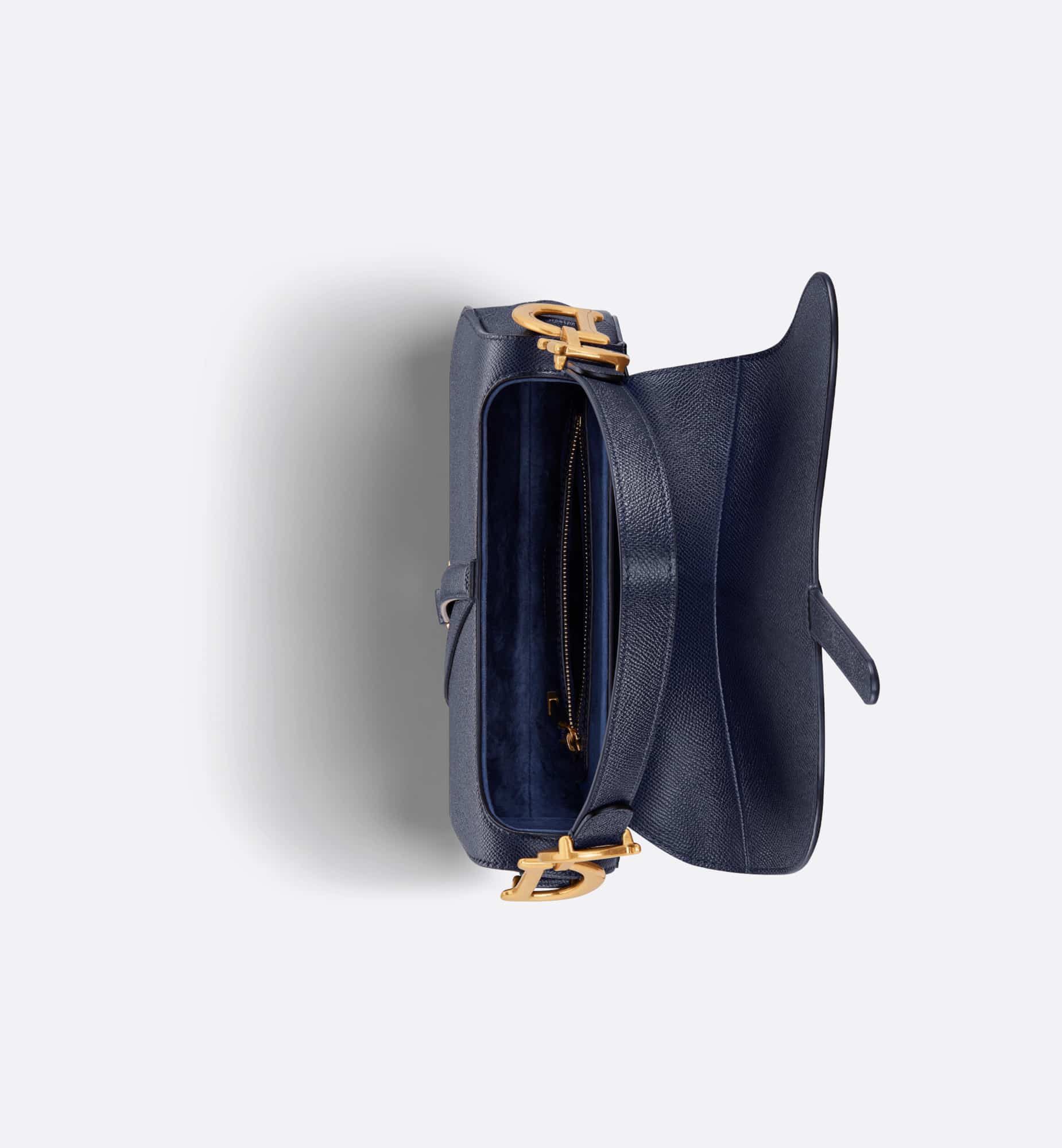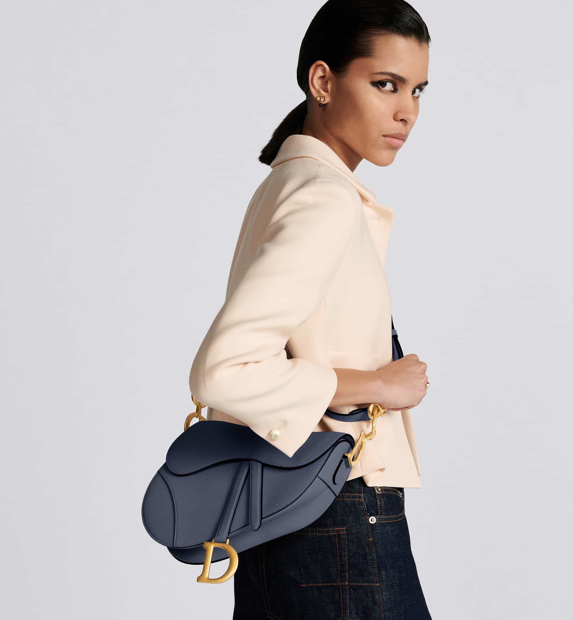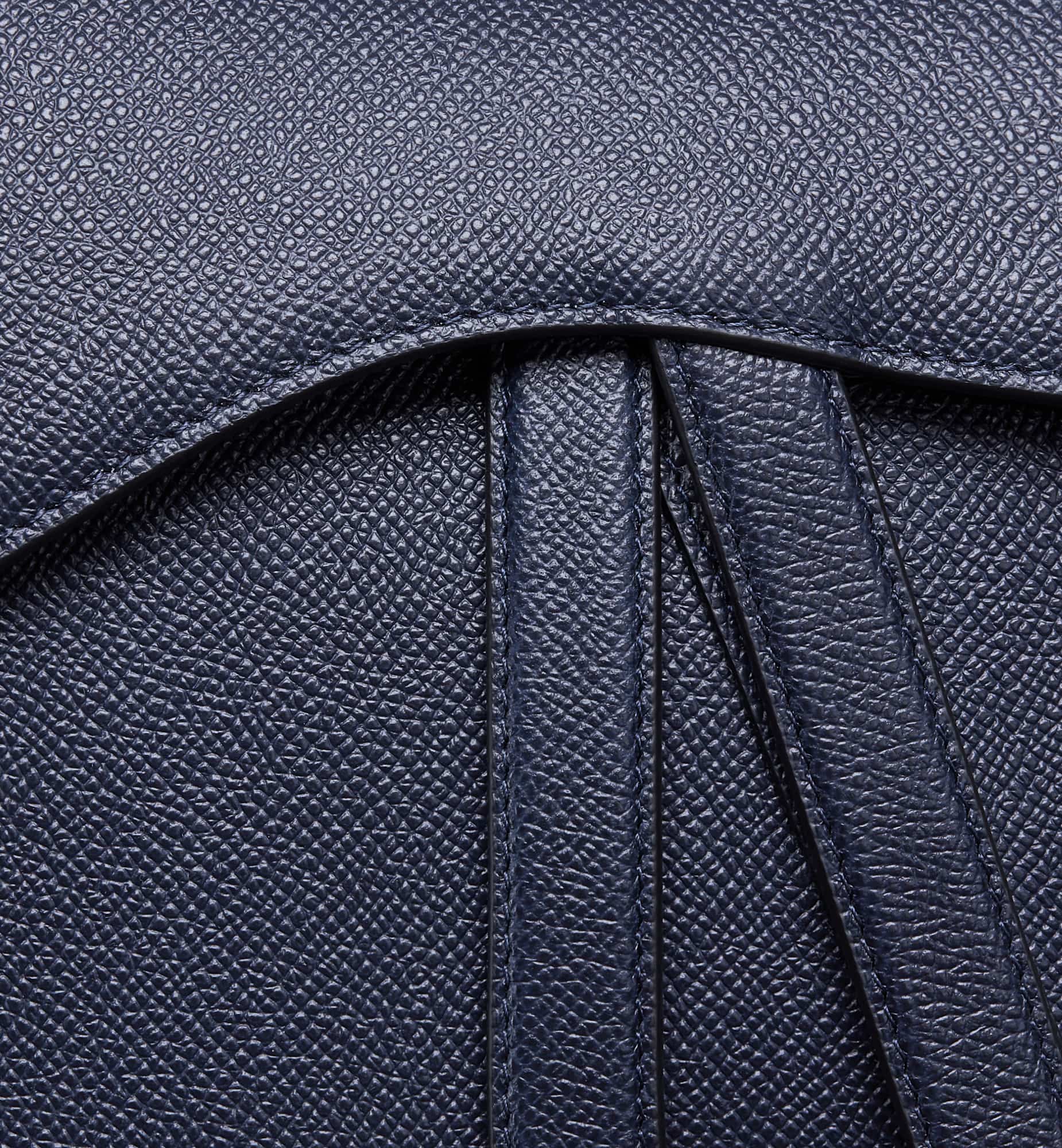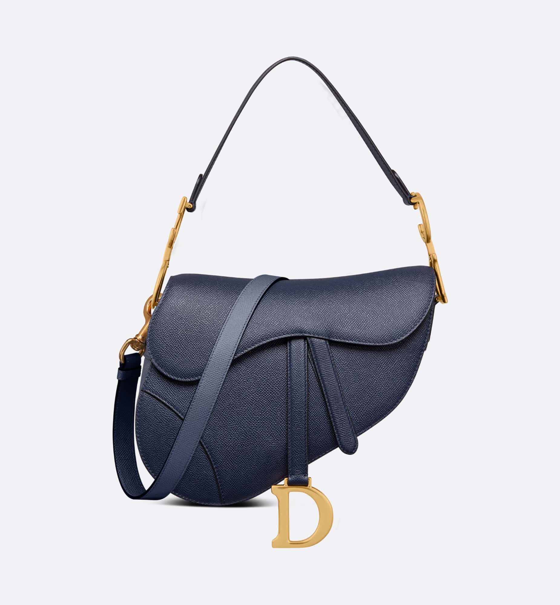 Maria Grazia Chiuri brings a fresh update to the iconic Saddle bag. Crafted in indigo blue grained calfskin, the legendary design features a Saddle flap with a D stirrup strap and magnetic pull, as well as an antique gold-finish metal CD signature on either side of the handle. Equipped with a thin, adjustable and removable strap, the Saddle bag may be carried by hand, worn over the shoulder or crossbody.