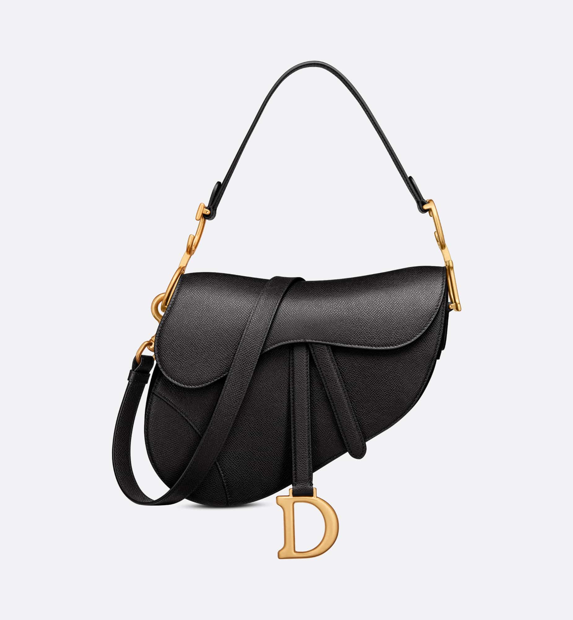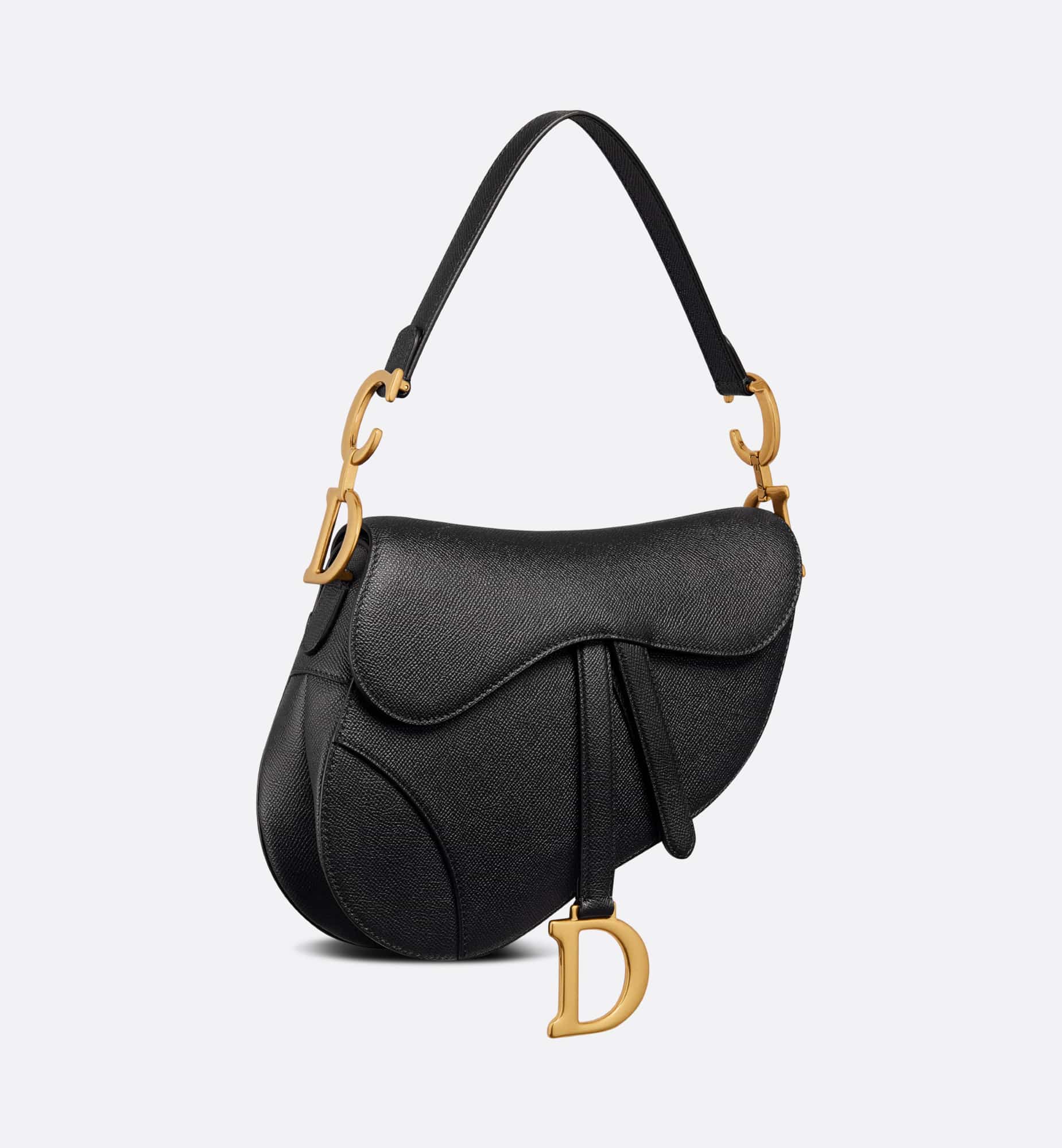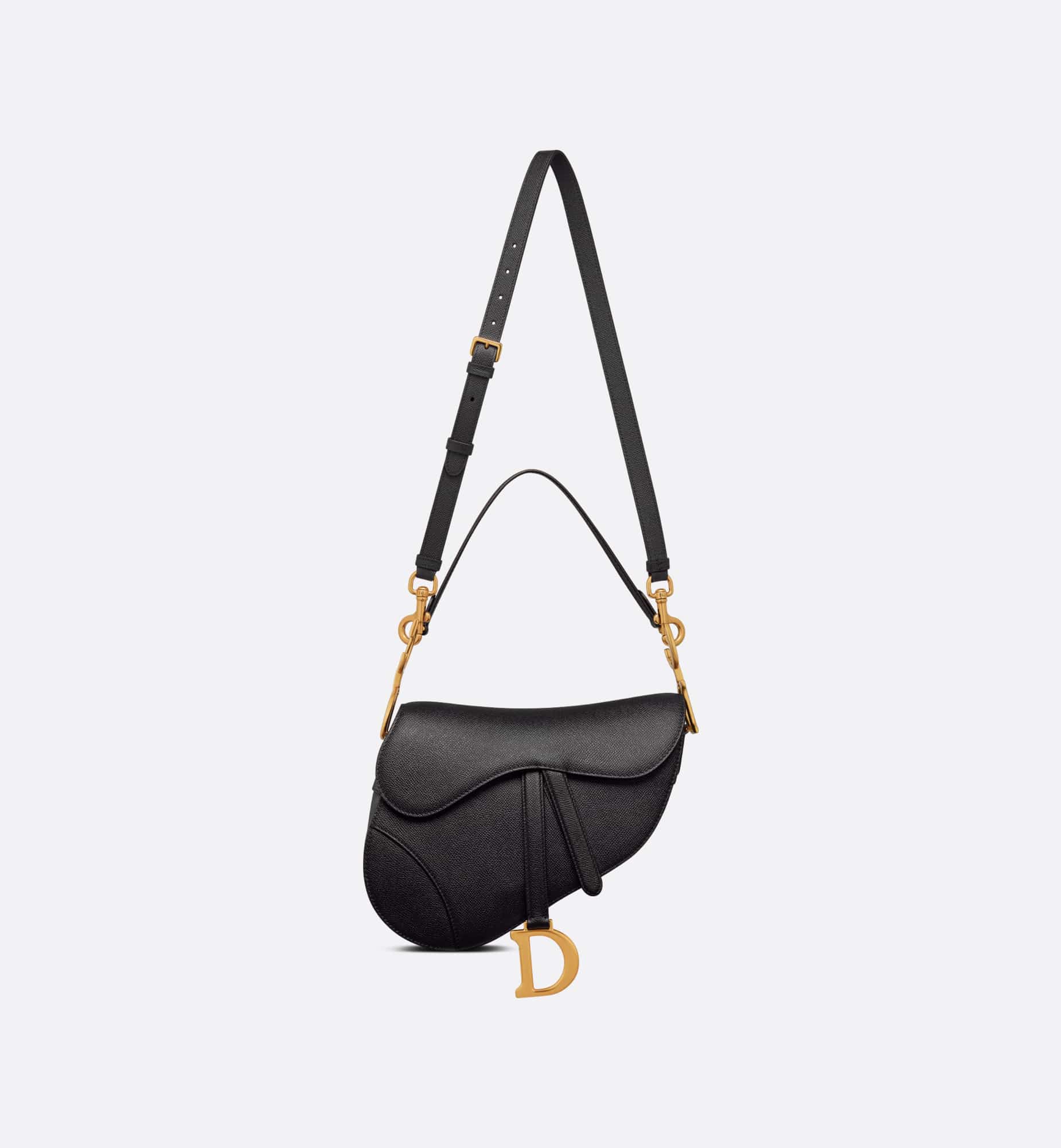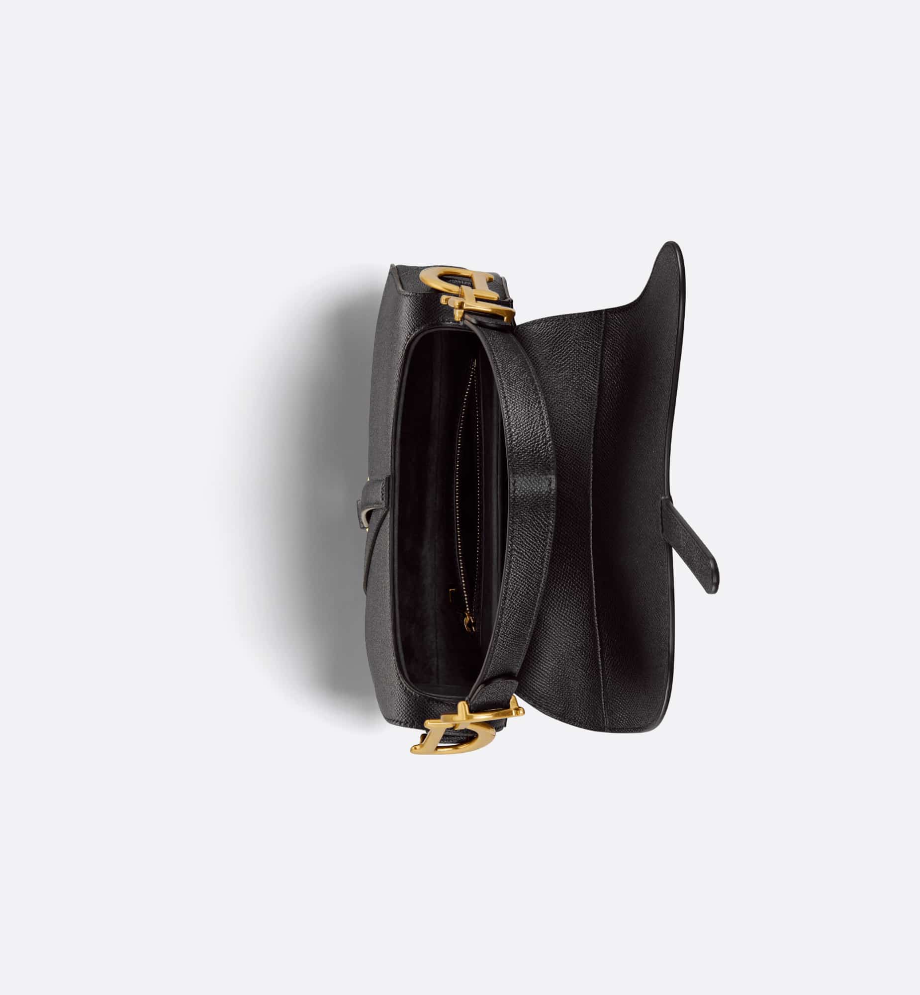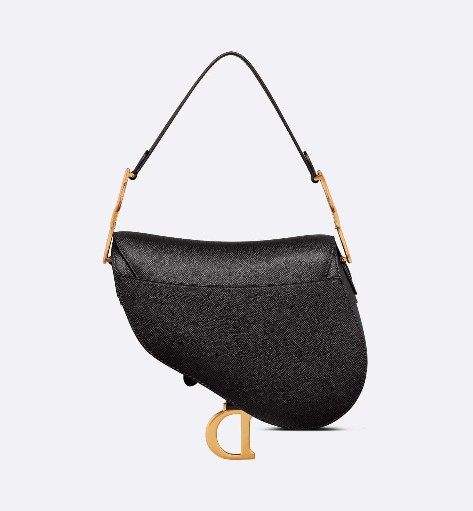 Maria Grazia Chiuri brings a fresh update to the iconic Saddle bag. Crafted in black grained calfskin, the legendary design features a Saddle flap with a D stirrup strap and magnetic pull, as well as an antique gold-finish metal CD signature on either side of the handle. Equipped with a thin, adjustable and removable strap, the Saddle bag may be carried by hand, worn over the shoulder or crossbody.