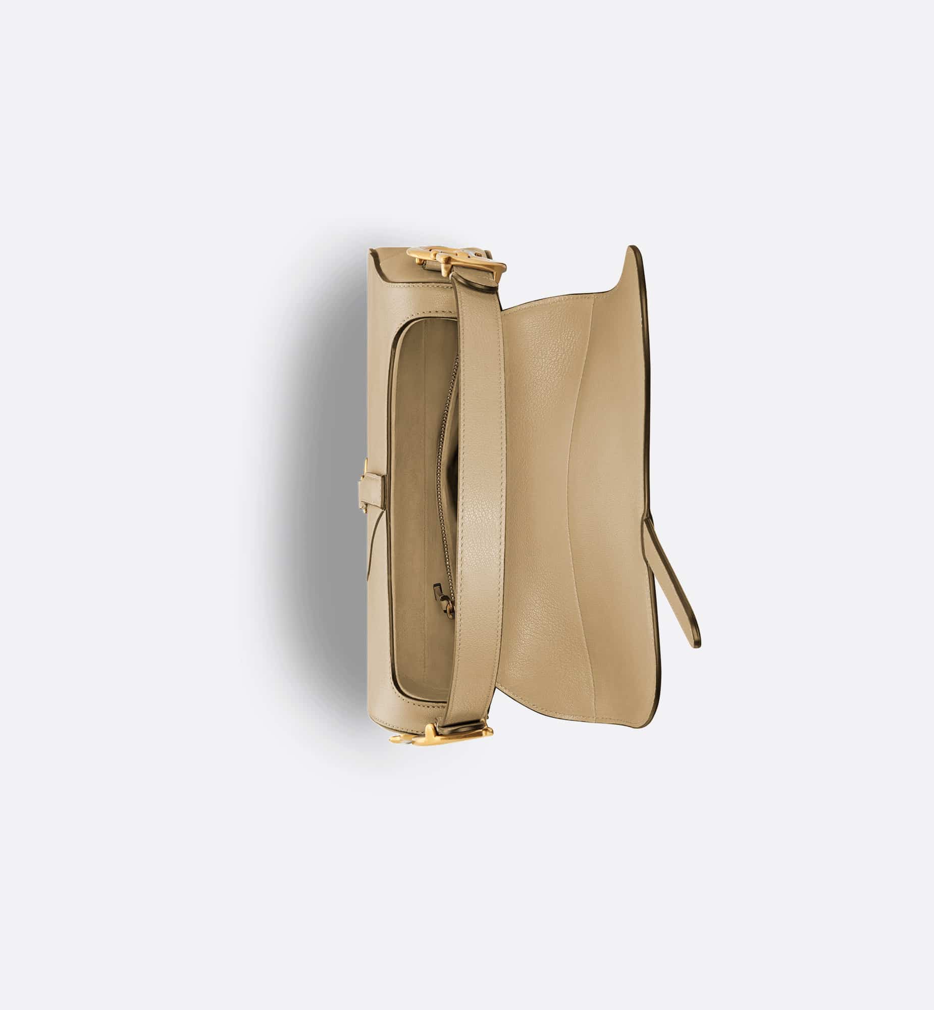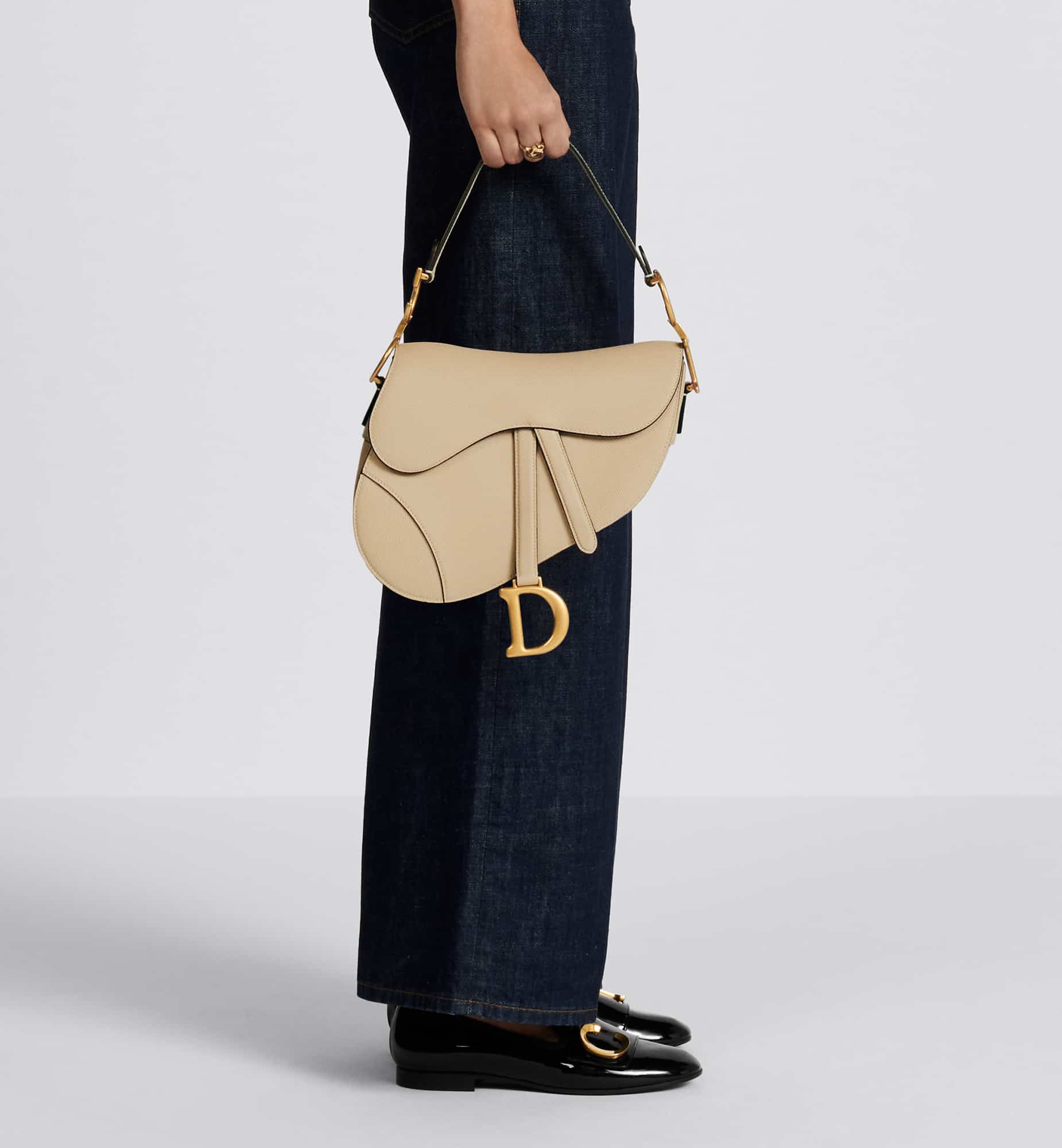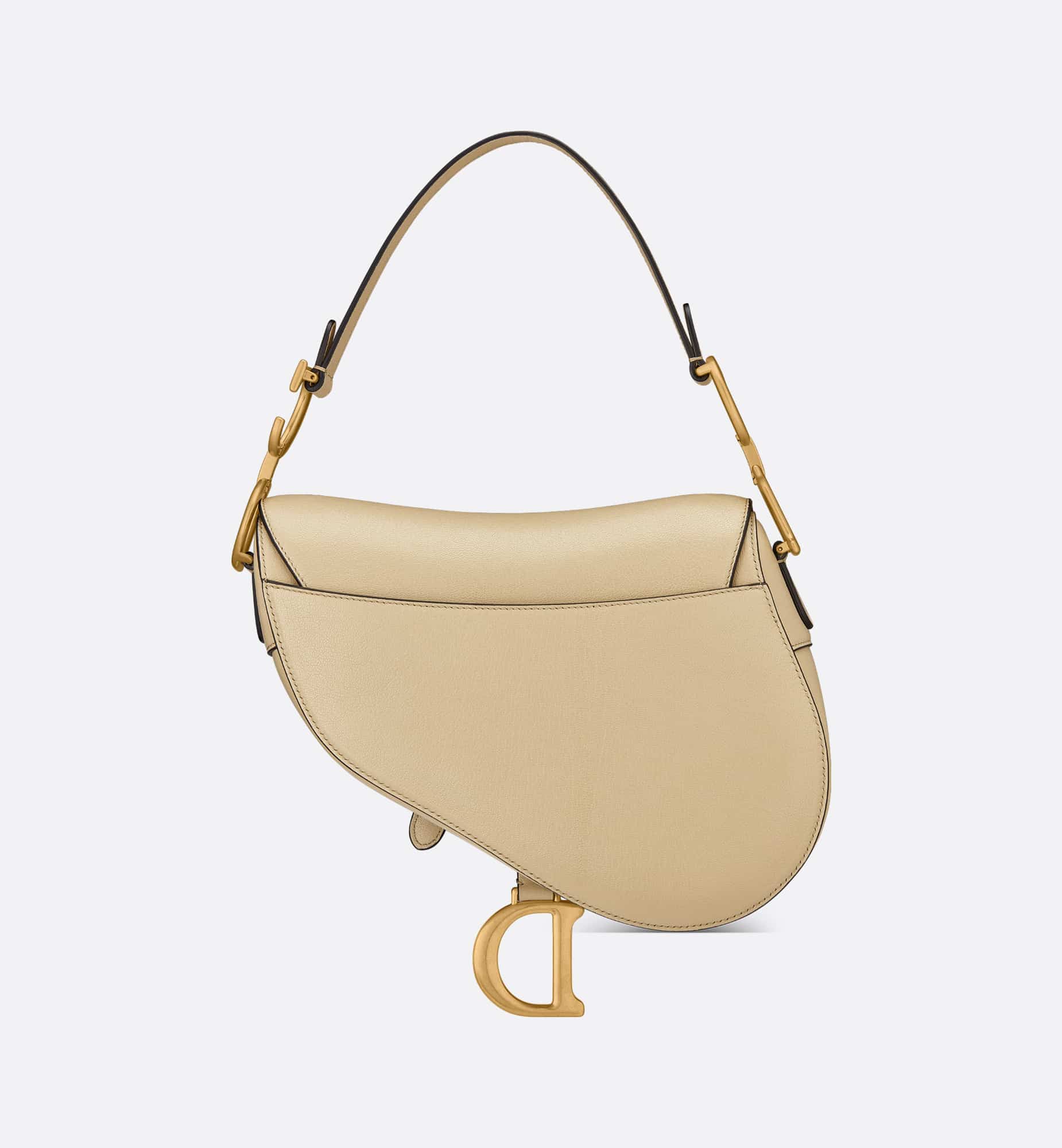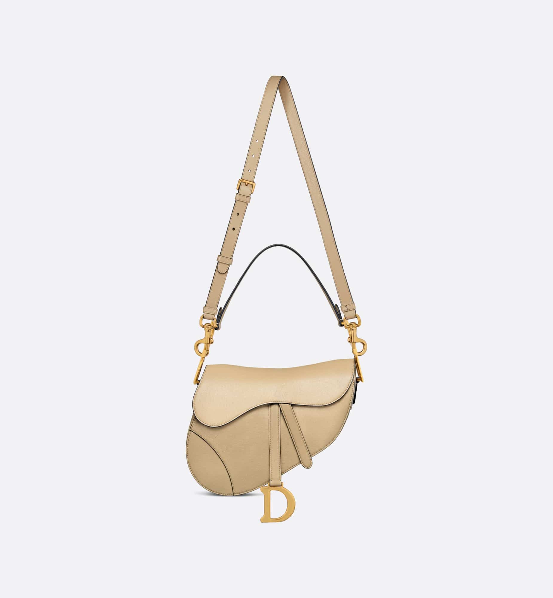 Maria Grazia Chiuri brings a fresh update to the iconic Saddle bag. Crafted in rope beige goatskin, the legendary design features a Saddle flap with a D stirrup strap and magnetic pull, as well as an antique gold-finish metal CD signature on either side of the handle. Equipped with a thin, adjustable and removable strap, the Saddle bag may be carried by hand, worn over the shoulder or crossbody.