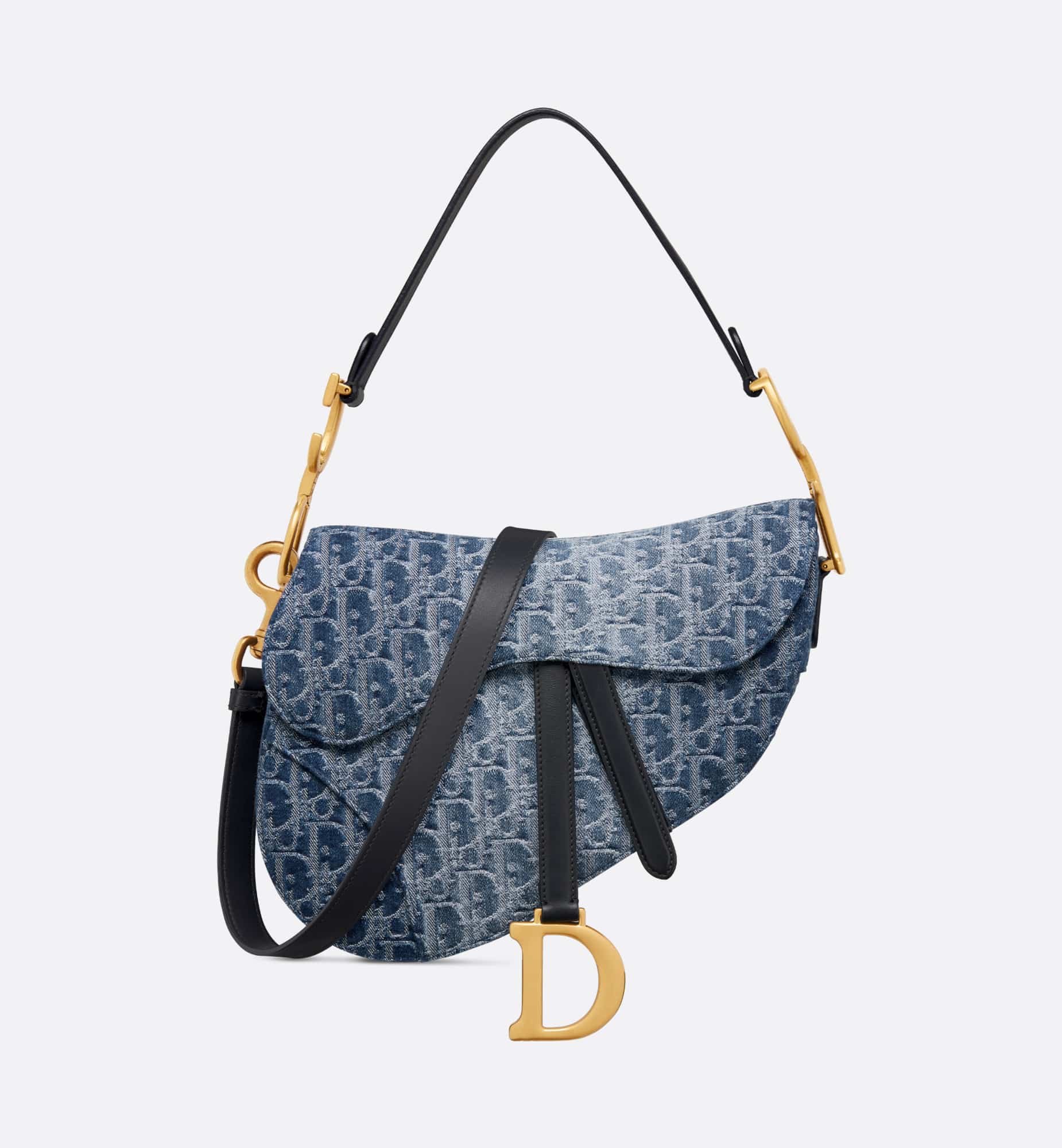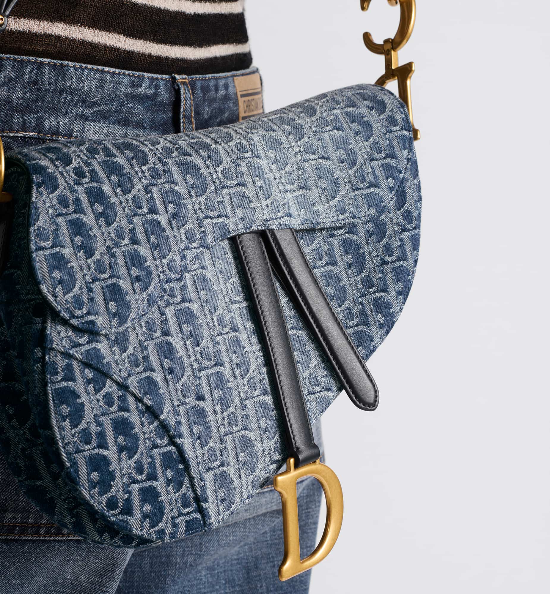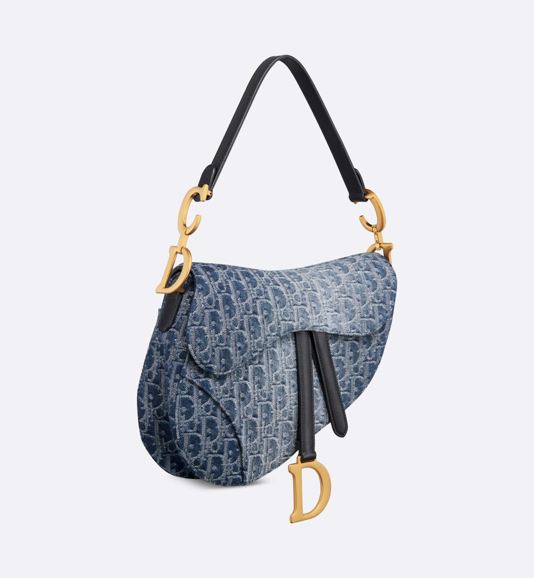 Maria Grazia Chiuri gives a fresh update to the iconic Saddle bag. The blue style is constructed in Denim Dior Oblique jacquard, offering a new take on the iconic House motif with the modern appeal of an irregular stonewashed effect. Its legendary design features a Saddle flap with a D stirrup strap and magnetic pull, as well as an antique gold-finish metal CD signature on either side of the handle. Equipped with a thin strap that is both adjustable and removable, the Saddle bag can be carried by hand, worn over the shoulder or crossbody.