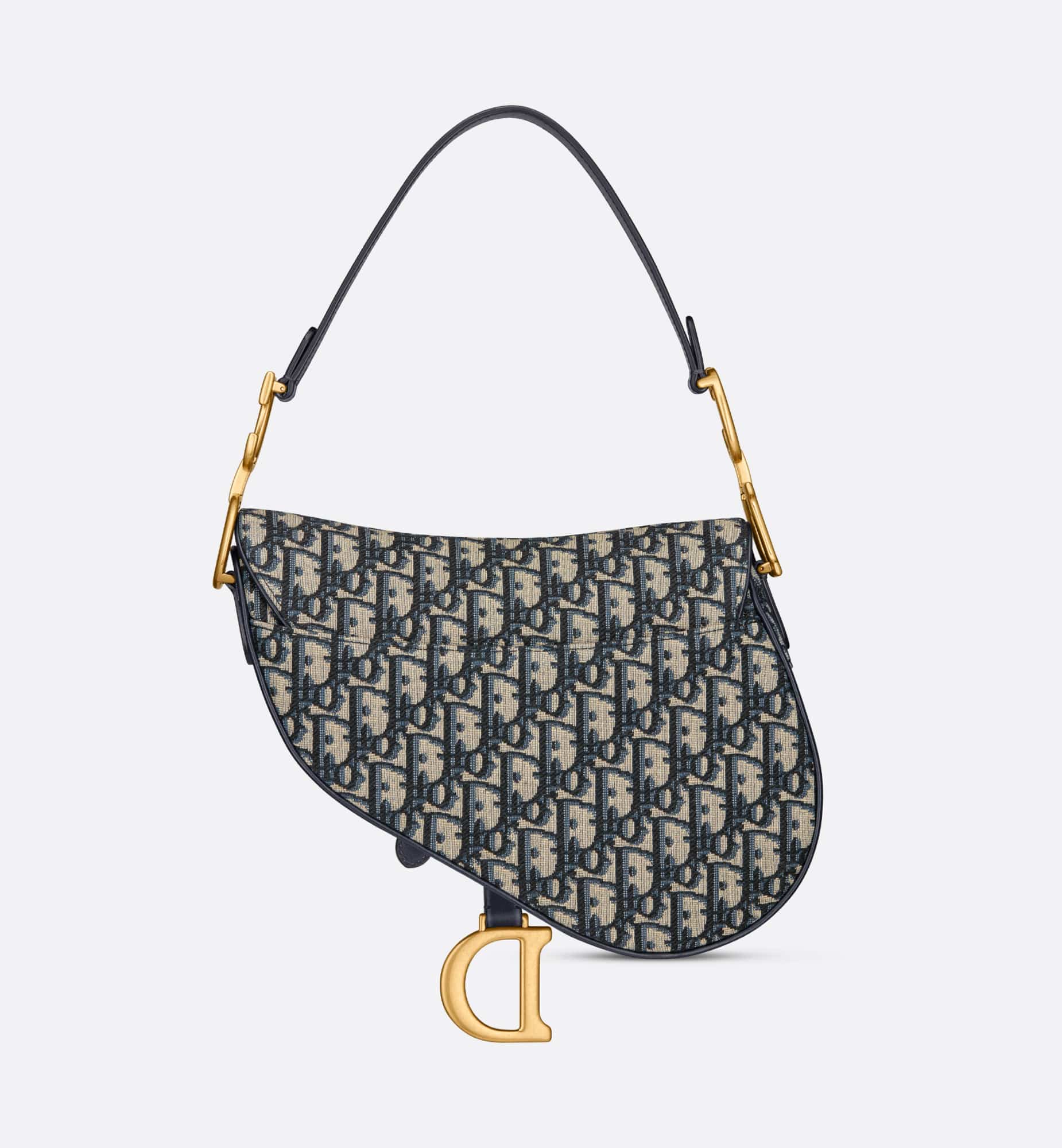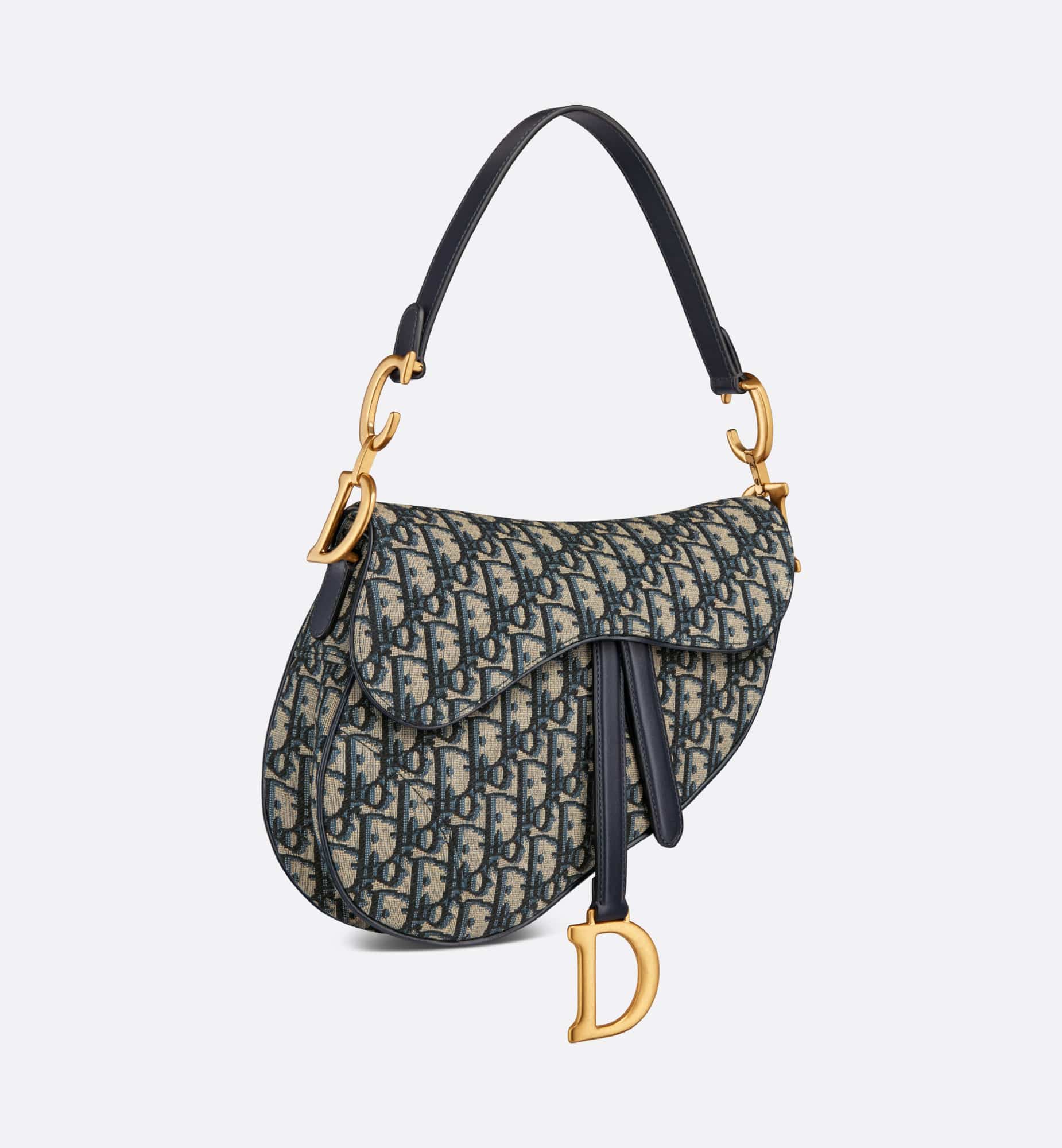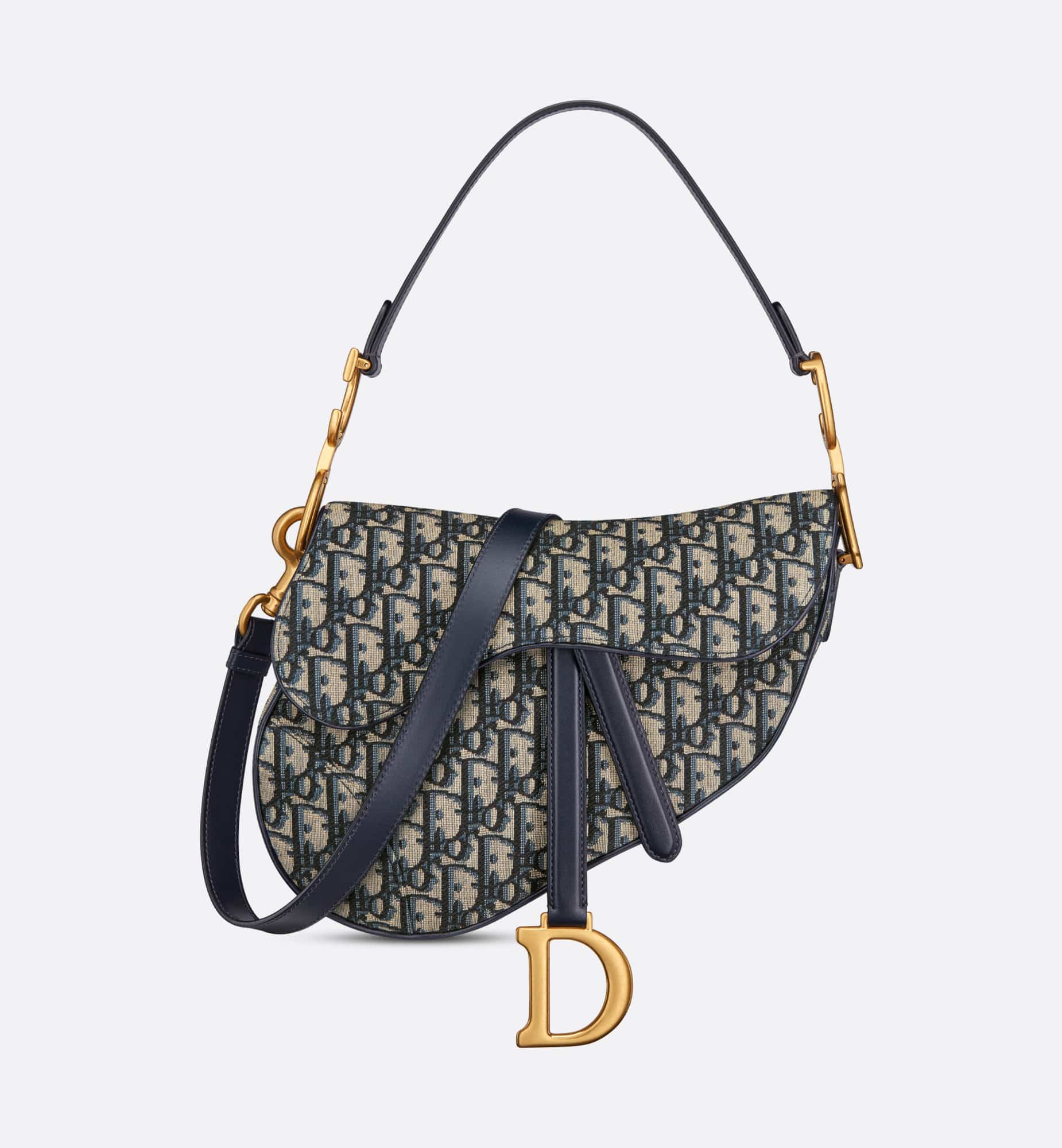 Maria Grazia Chiuri brings a fresh update to the iconic Saddle bag. Crafted in blue Dior Oblique jacquard, the legendary design features a Saddle flap with a D stirrup clasp on a magnetic strap, as well as an antique gold-finish metal CD signature on either side of the strap. Equipped with a thin, adjustable and removable shoulder strap, the Saddle bag may be carried by hand, worn over the shoulder or crossbody.