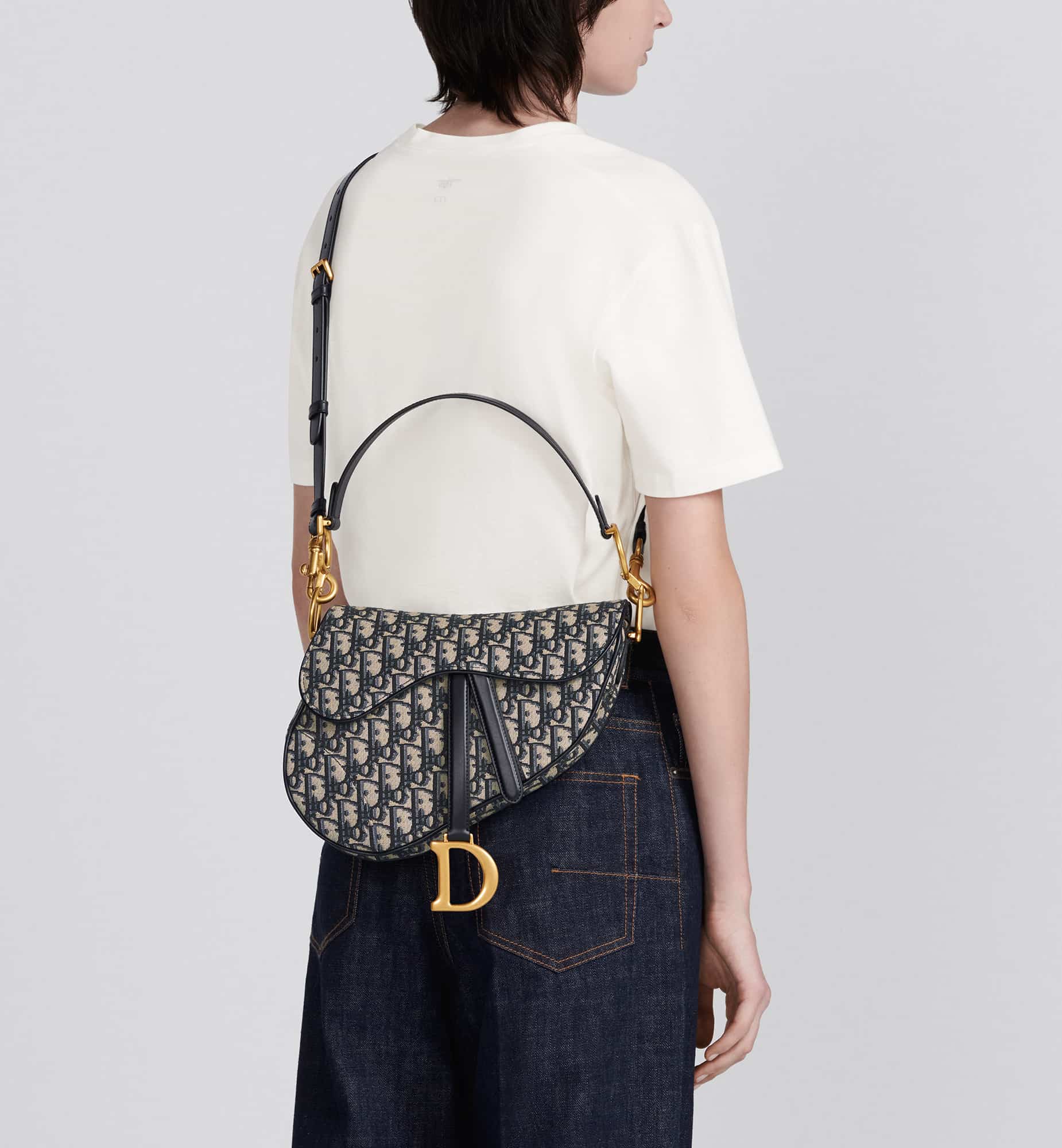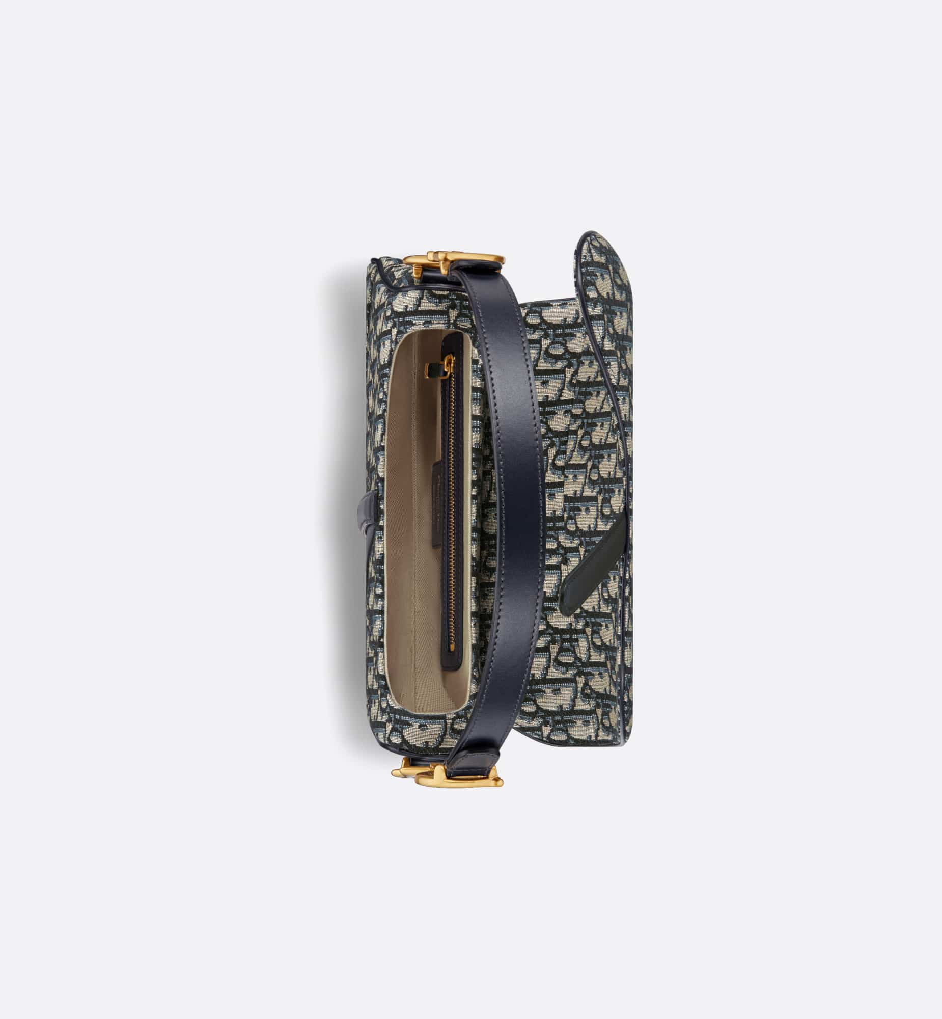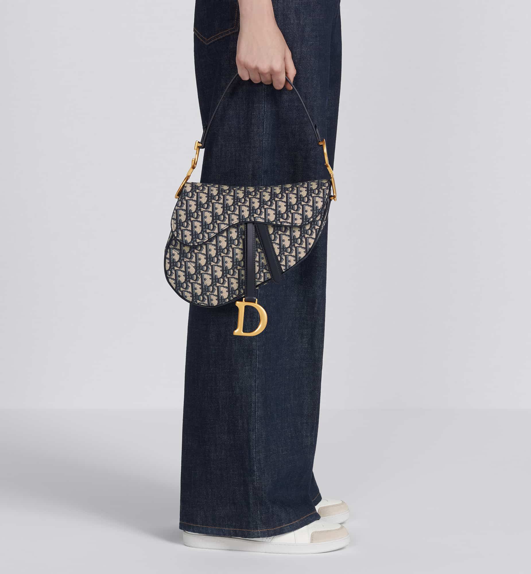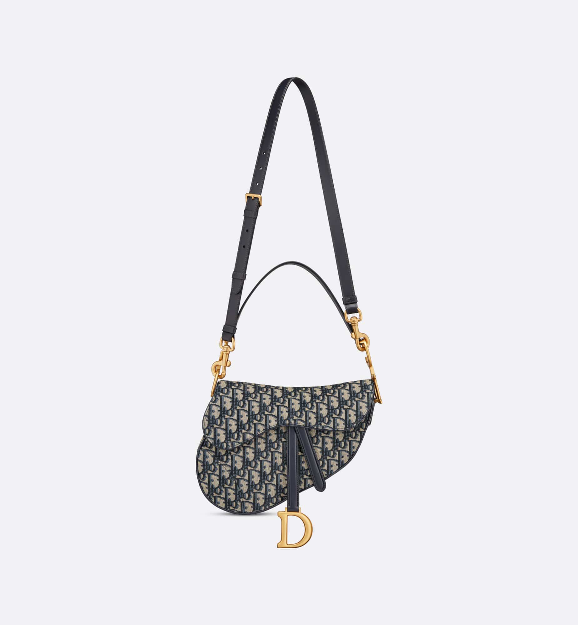 Maria Grazia Chiuri brings a fresh update to the iconic Saddle bag. Crafted in blue Dior Oblique jacquard, the legendary design features a Saddle flap with a D stirrup clasp on a magnetic strap, as well as an antique gold-finish metal CD signature on either side of the strap. Equipped with a thin, adjustable and removable shoulder strap, the Saddle bag may be carried by hand, worn over the shoulder or crossbody.