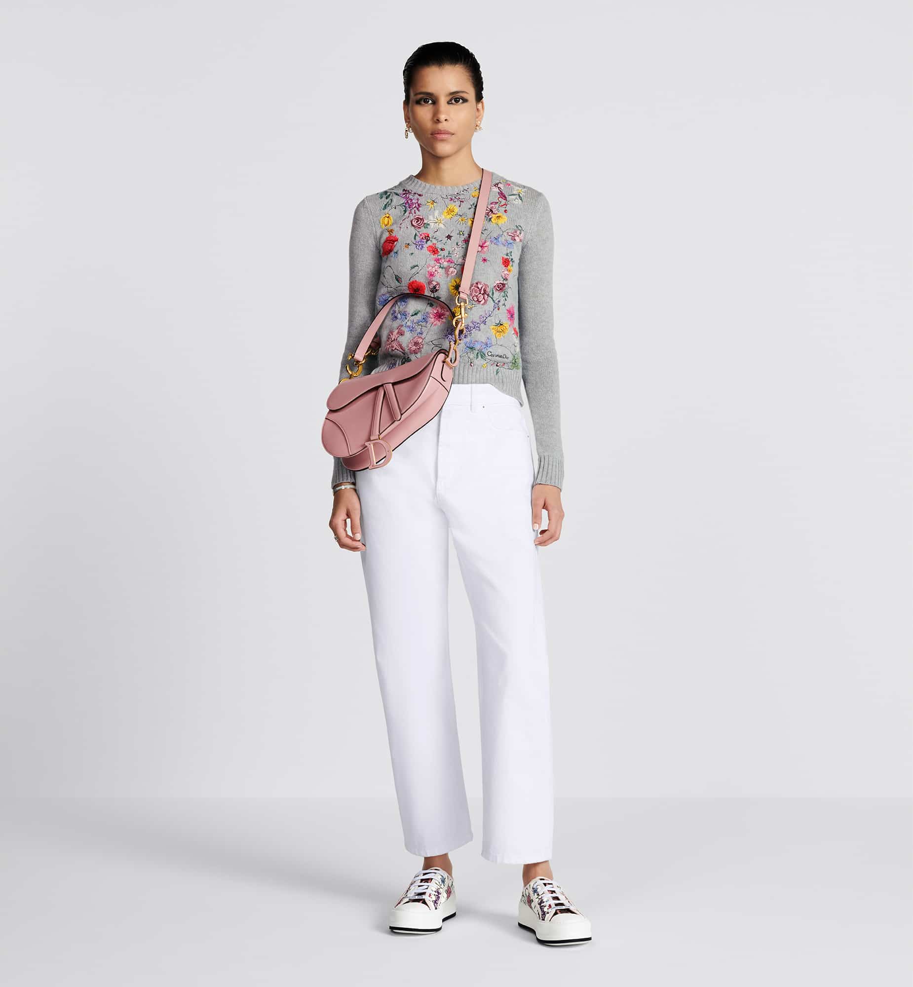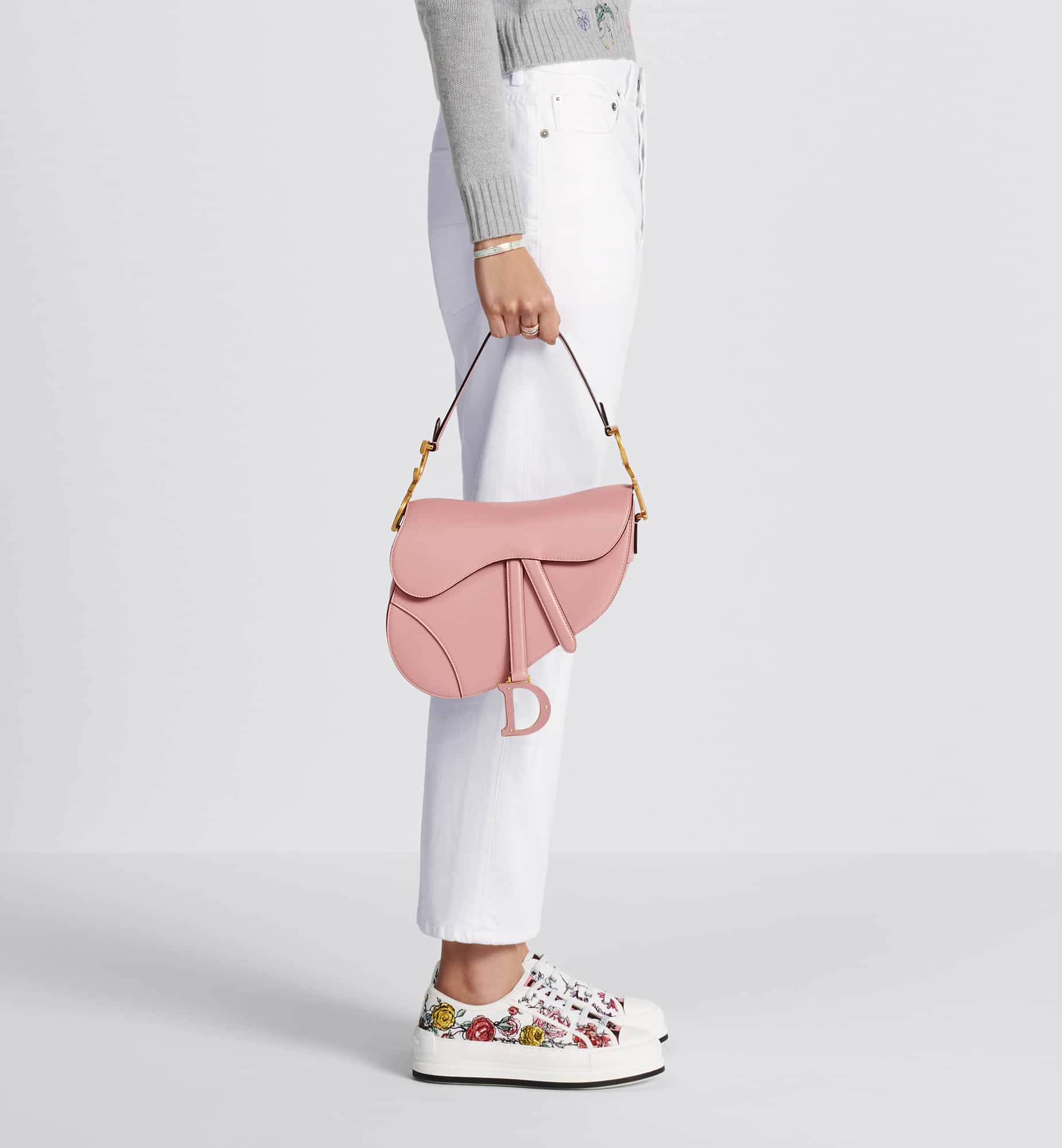 Maria Grazia Chiuri brings a fresh update to the iconic Saddle bag. Crafted in antique pink ultra-smooth calfskin, the legendary design features a Saddle flap with a D stirrup strap and magnetic pull as well as an antique gold-finish metal CD signature adorned with tonal leather on either side of the handle. Equipped with a thin, adjustable and removable strap, the Saddle bag may be carried by hand, worn over the shoulder or crossbody.
