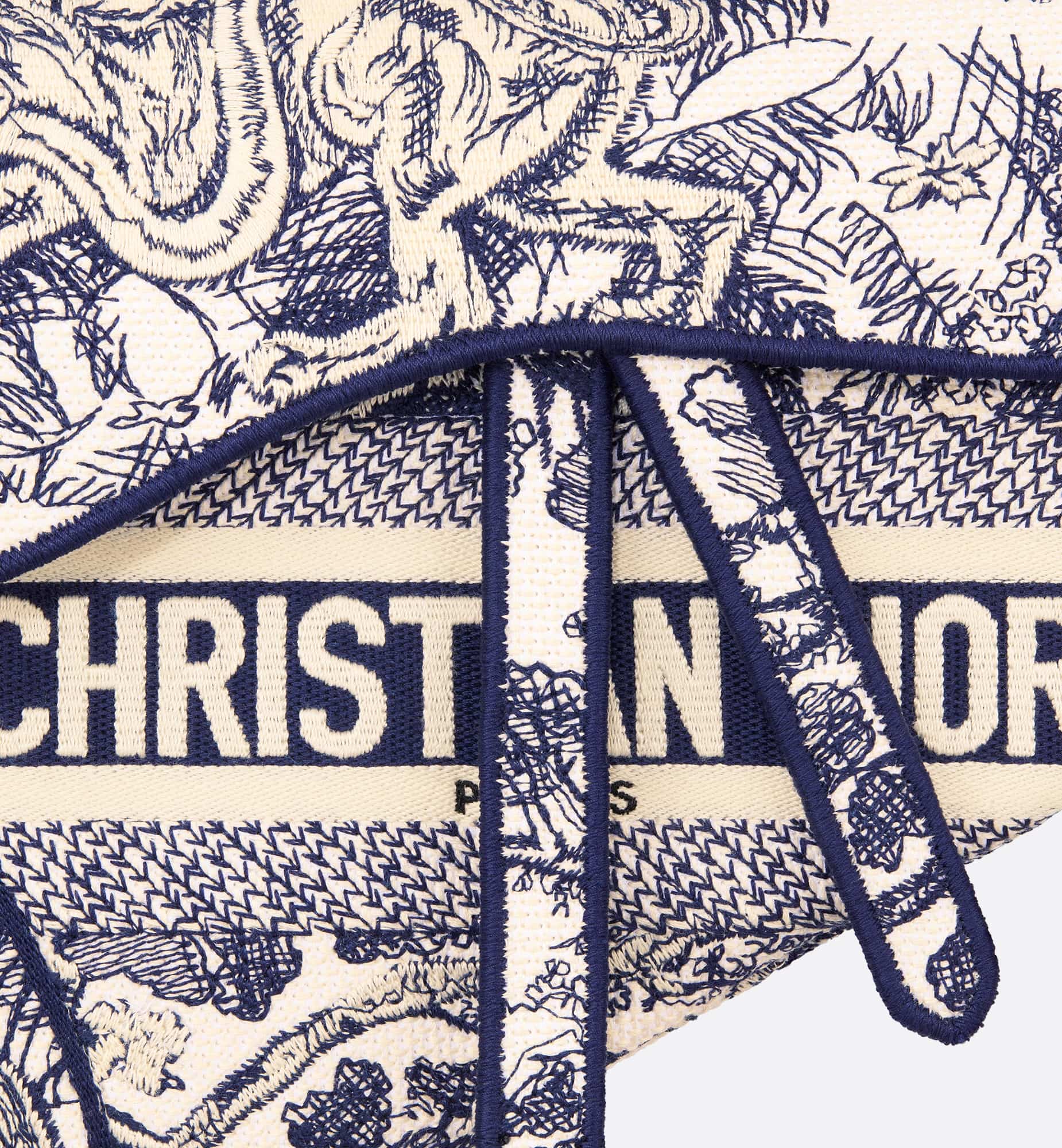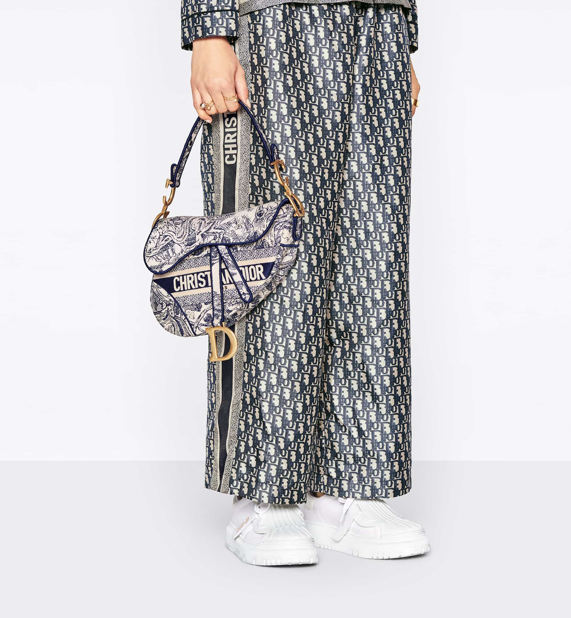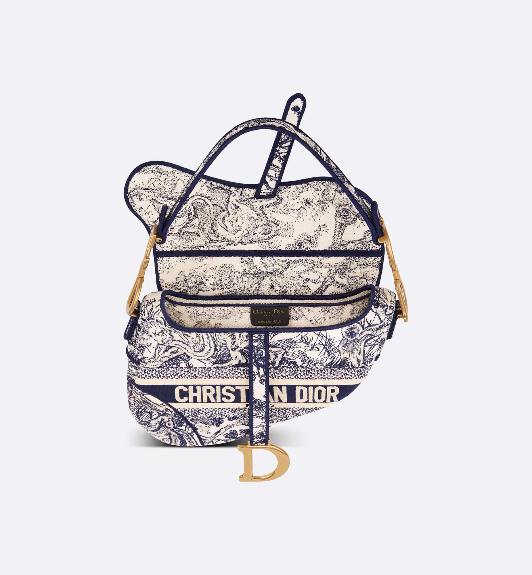 Maria Grazia Chiuri brings a fresh update to the iconic Saddle bag. The design is fully embroidered with the hallmark blue Toile de Jouy motif, showcasing a Christian Dior Paris signature on the front. The legendary style features a Saddle flap with a D stirrup strap and magnetic pull, as well as the antique gold-finish metal CD signature on each side of the handle. The bag can be customized with different shoulder straps and may be coordinated with other Toile de Jouy creations.