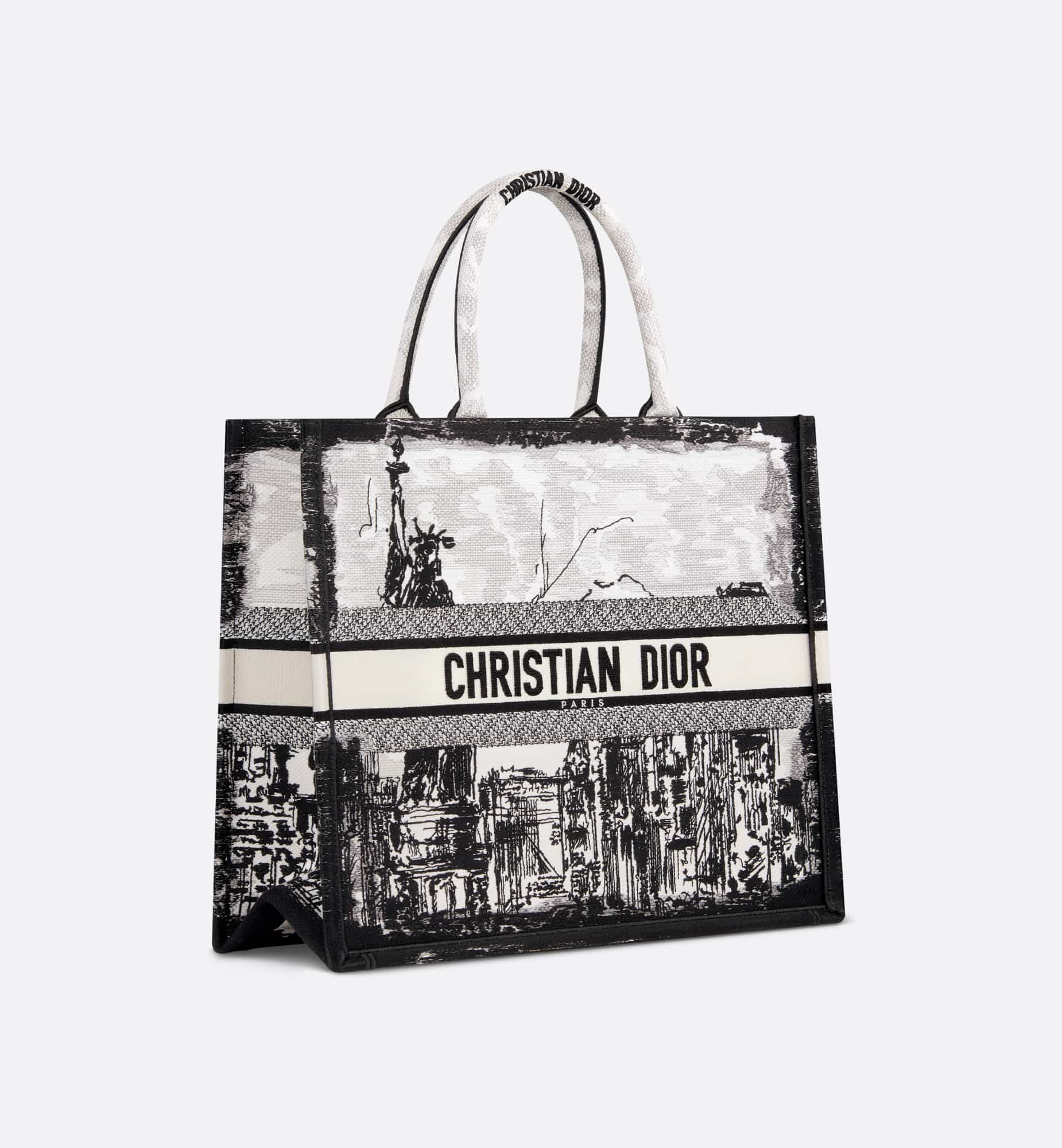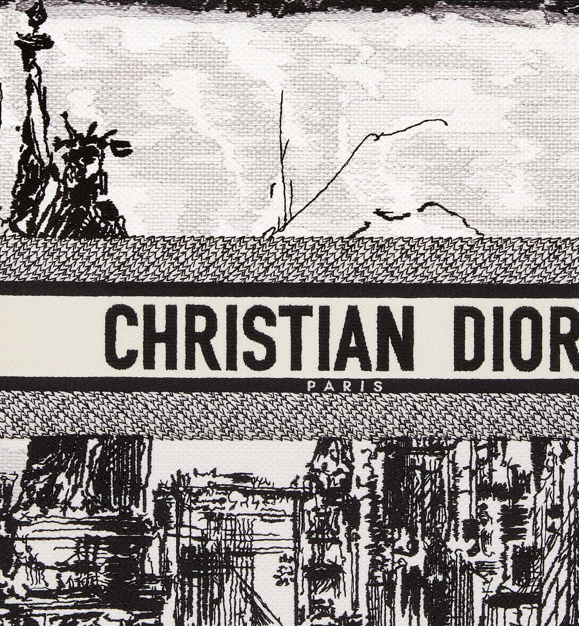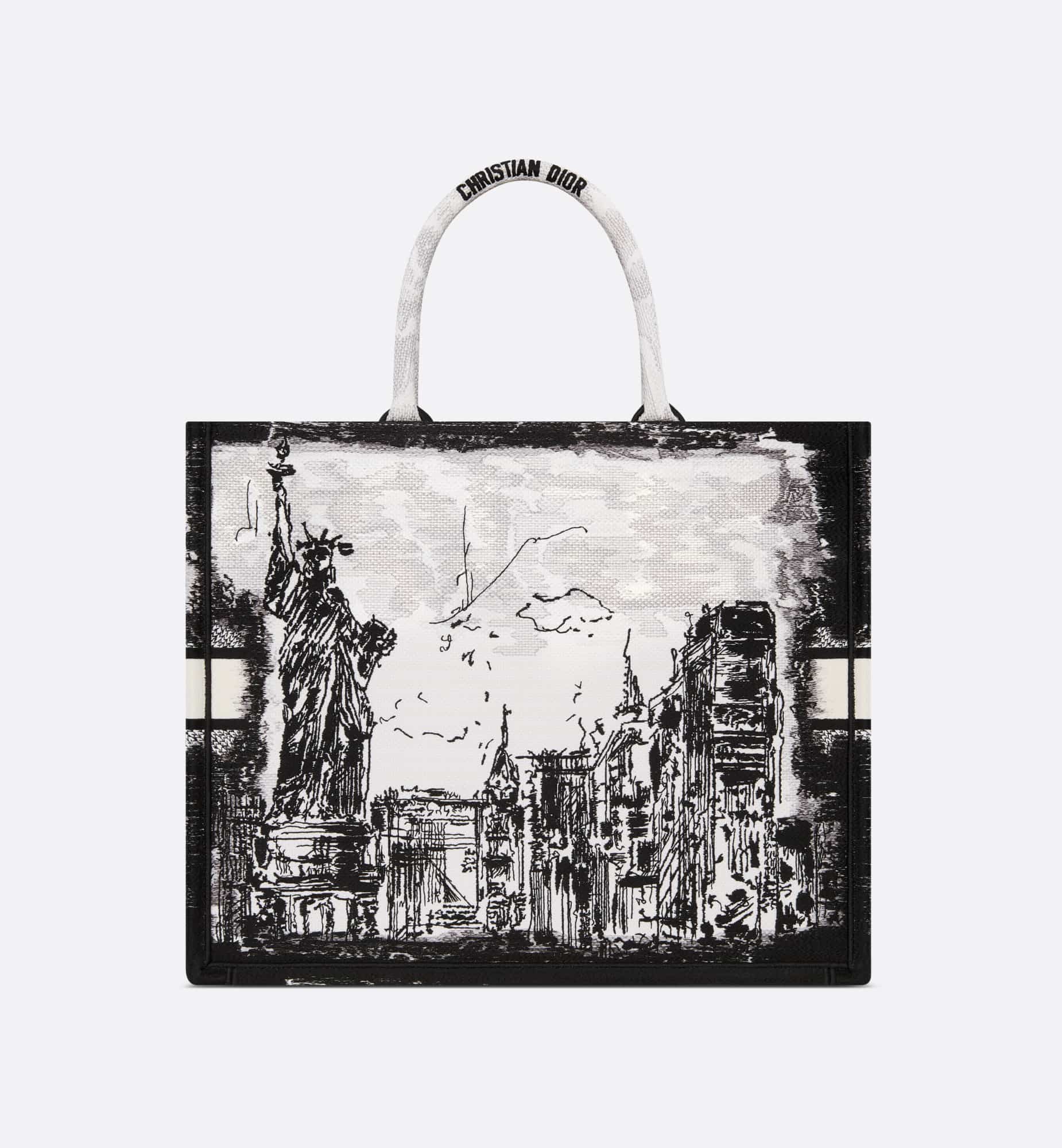 Introduced by Maria Grazia Chiuri, Creative Director of Christian Dior, the Dior Book Tote has become a staple of the Dior aesthetic. Designed to hold all the daily essentials, it is fully embroidered with the white and black New York motif, a pillar of the collection that celebrates the city’s skyline and the Statue of Liberty in a graphic spirit. Adorned with a contrasting Christian Dior Paris signature on the front, the large tote exemplifies the House’s savoir-faire and may be carried by hand.