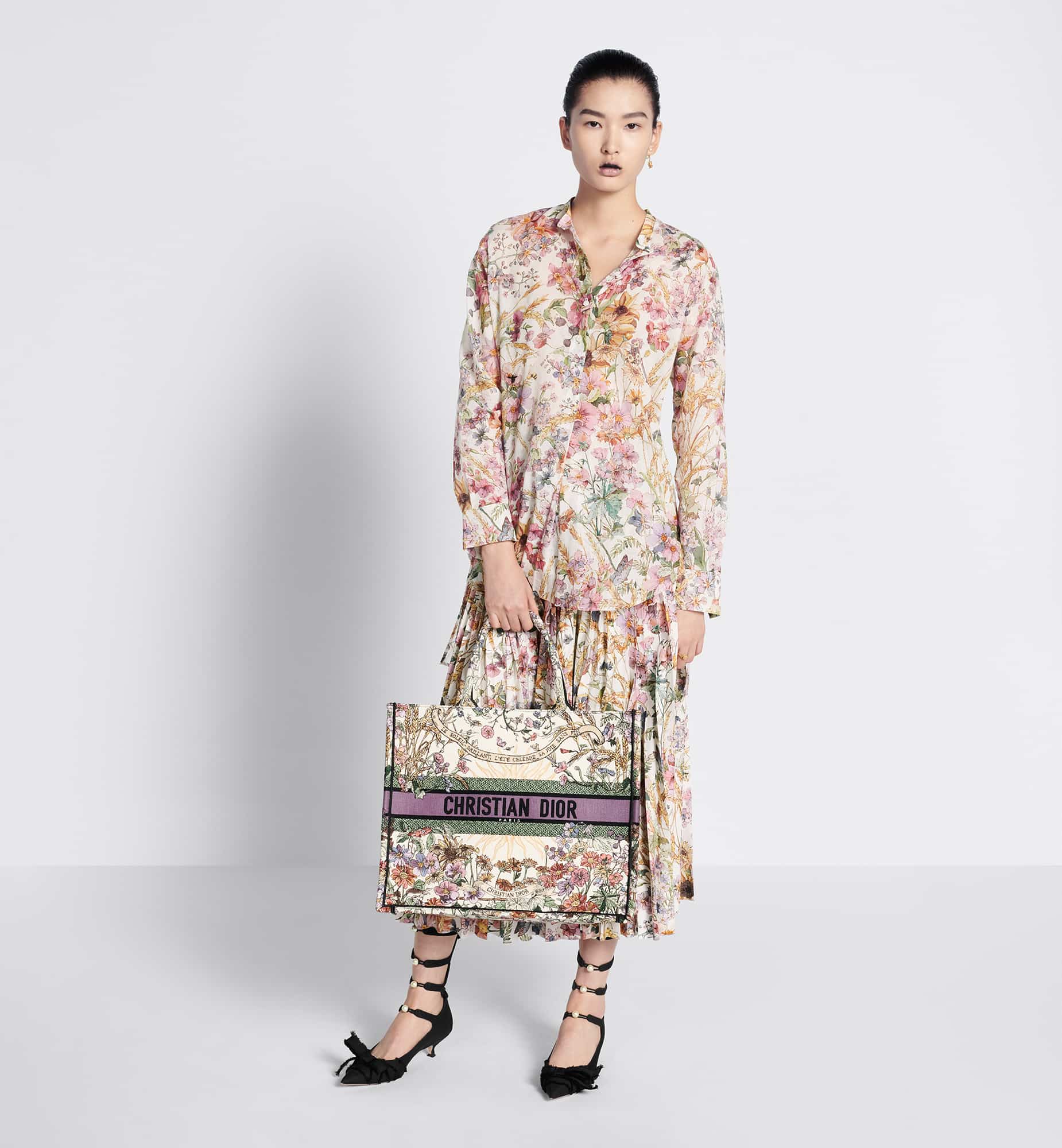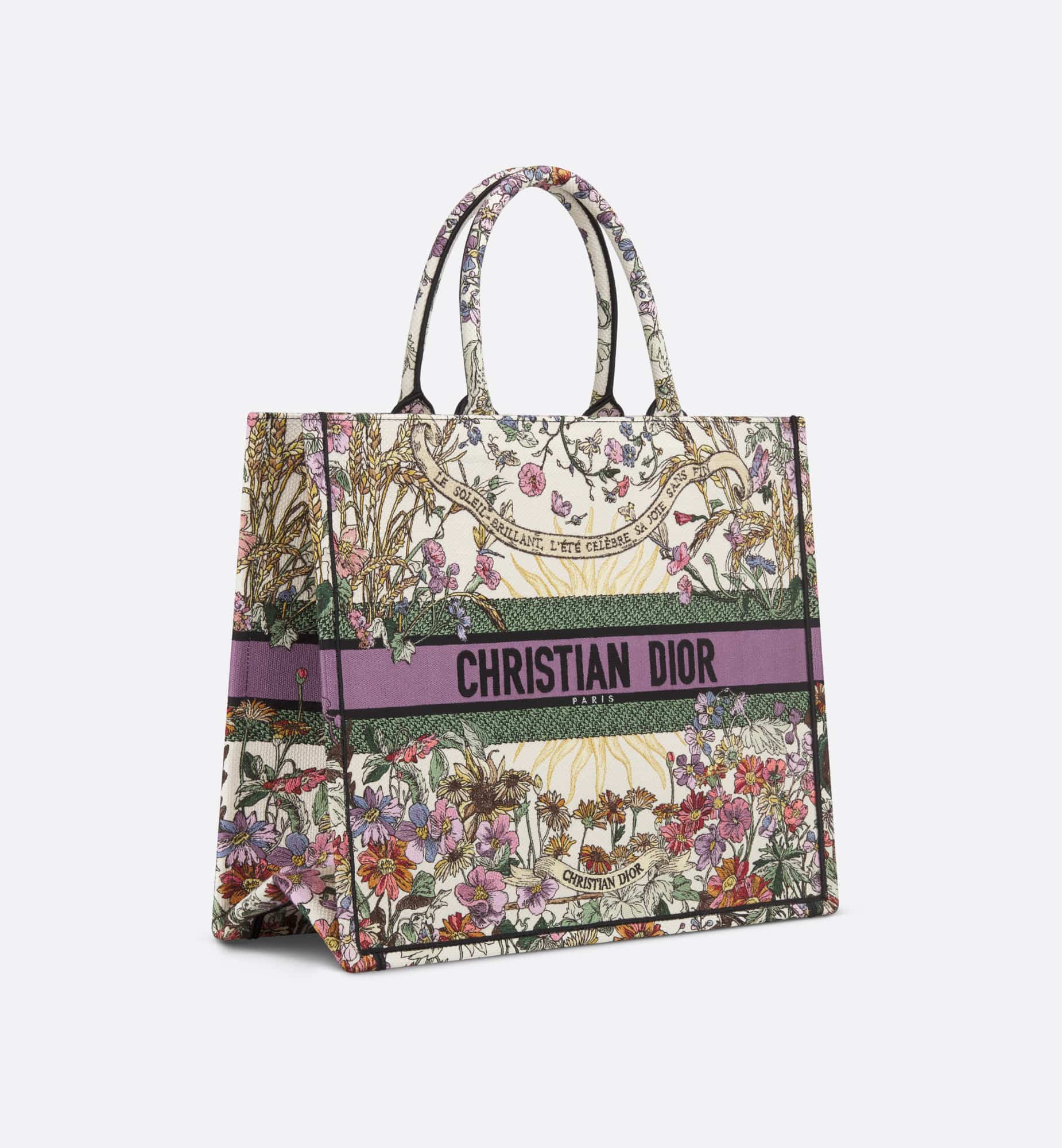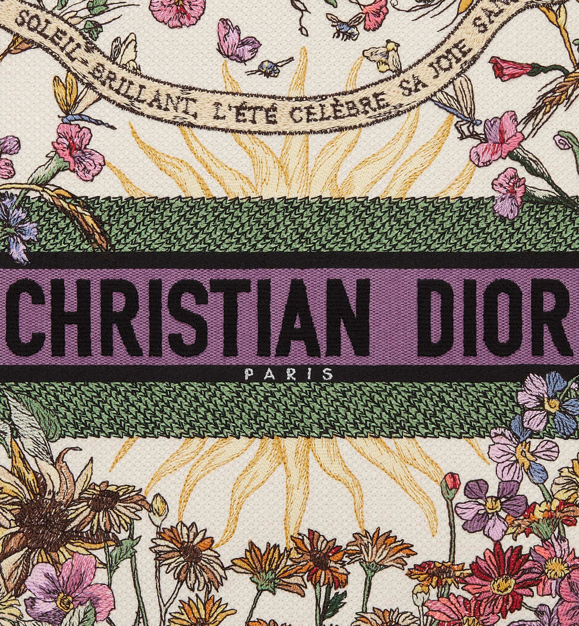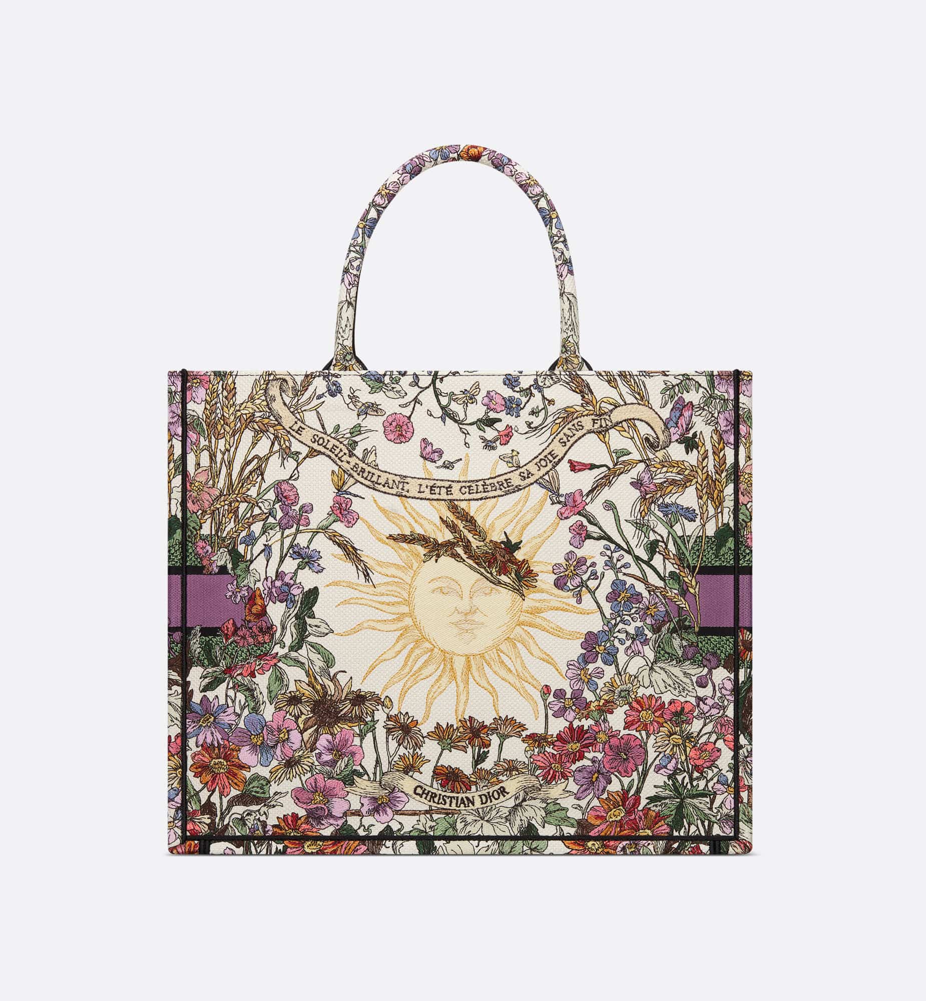 Introduced by Maria Grazia Chiuri, Creative Director of Christian Dior, the Dior Book Tote has become a staple of the Dior aesthetic. Designed to hold all the daily essentials, the ecru multicolor style is fully embroidered with the Dior 4 Saisons ?té Soleil motif by Pietro Ruffo, celebrating the season’s signature sun theme with a bucolic summery design punctuated by the words, Le soleil brillant, l’été célèbre sa joie sans fin. Adorned with the Christian Dior Paris signature on the front, the large tote exemplifies the House’s signature savoir-faire and may be carried by hand or worn over the shoulder.