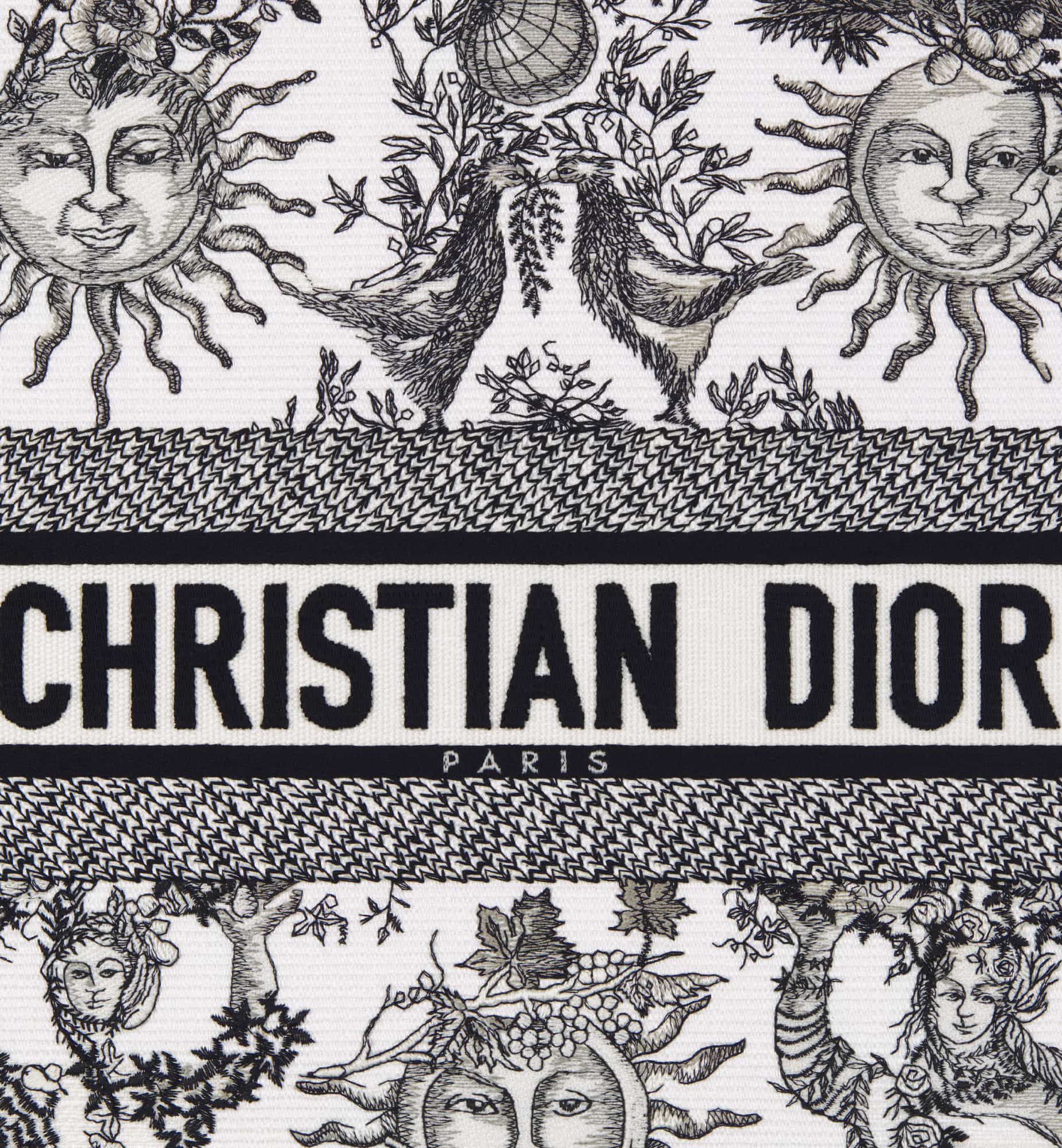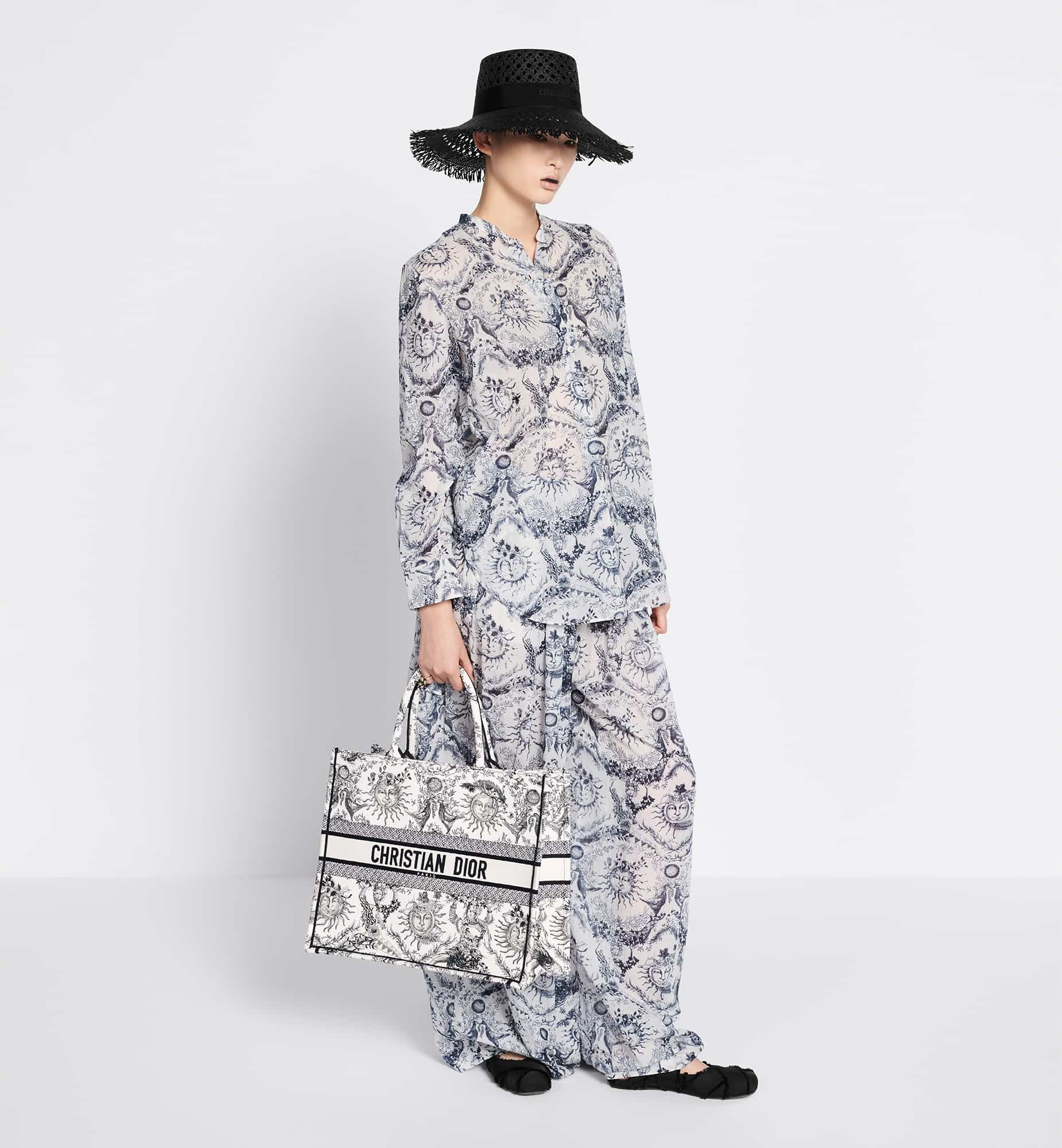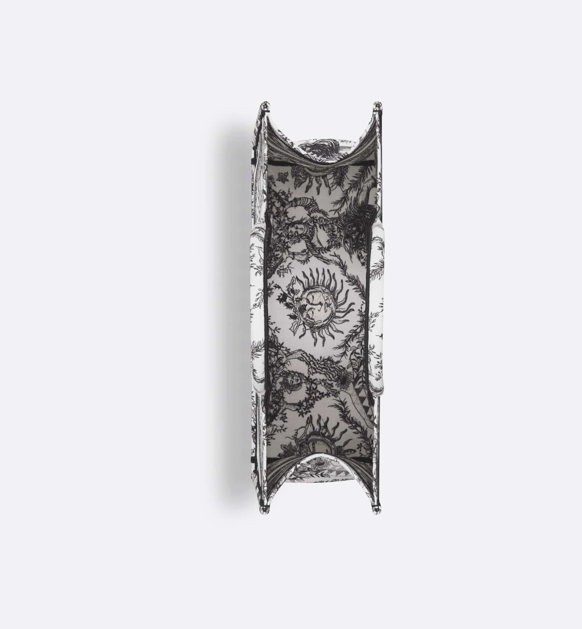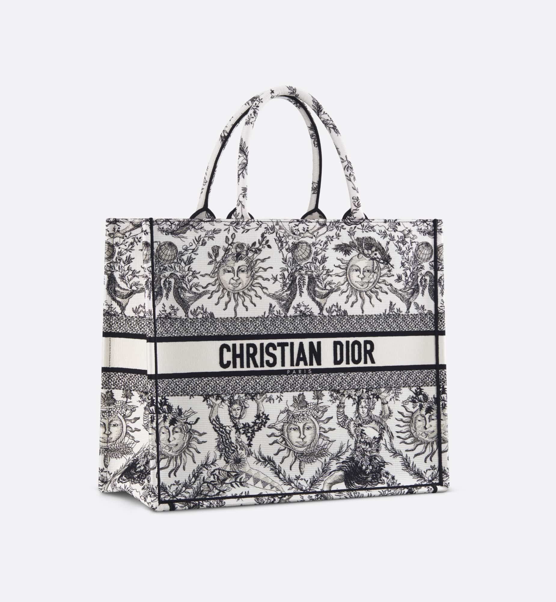 Introduced by Maria Grazia Chiuri, Creative Director of Christian Dior, the Dior Book Tote has become a staple of the Dior aesthetic. Designed to hold all the daily essentials, the style is fully embroidered with the season’s signature Toile de Jouy Soleil motif in white and black, offering a new take on the iconic House motif with suns and crescent moons layered into a floral design representing the four seasons. Exemplifying House savoir-faire, the large tote is adorned with the Christian Dior Paris signature on the front, and may be carried by hand or worn over the shoulder.
