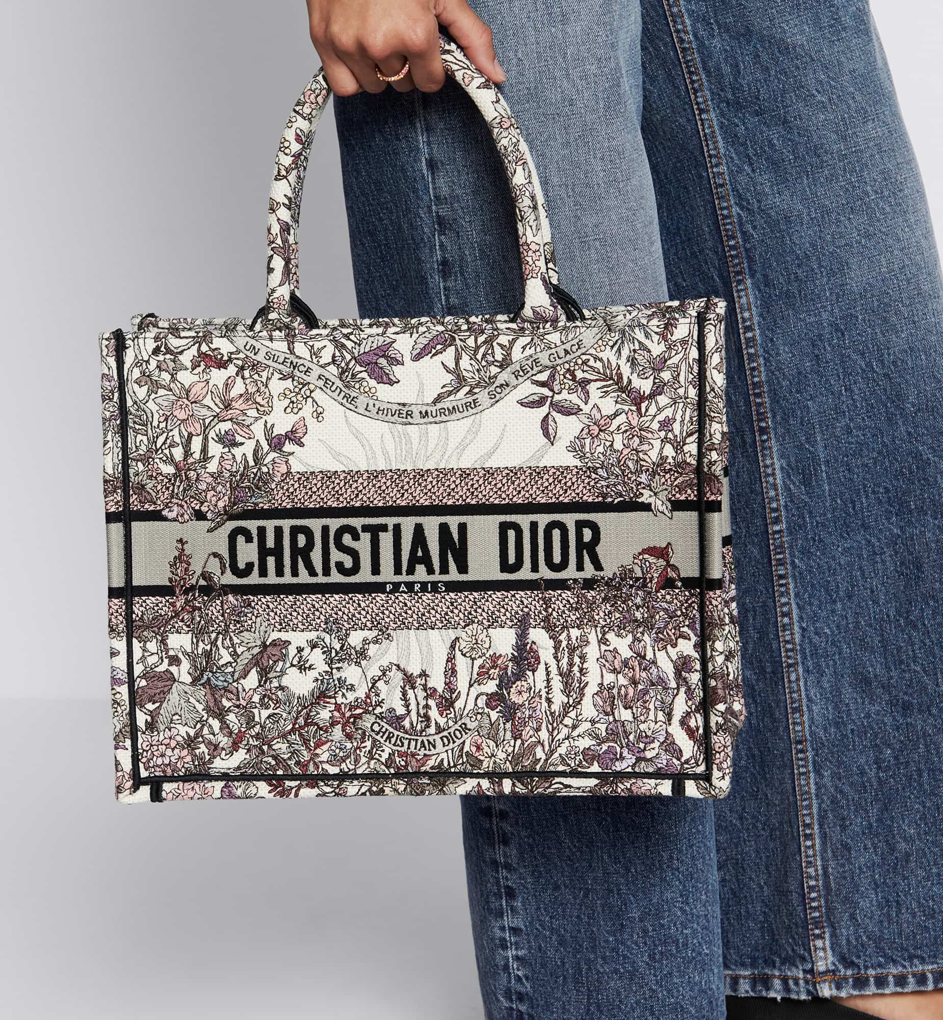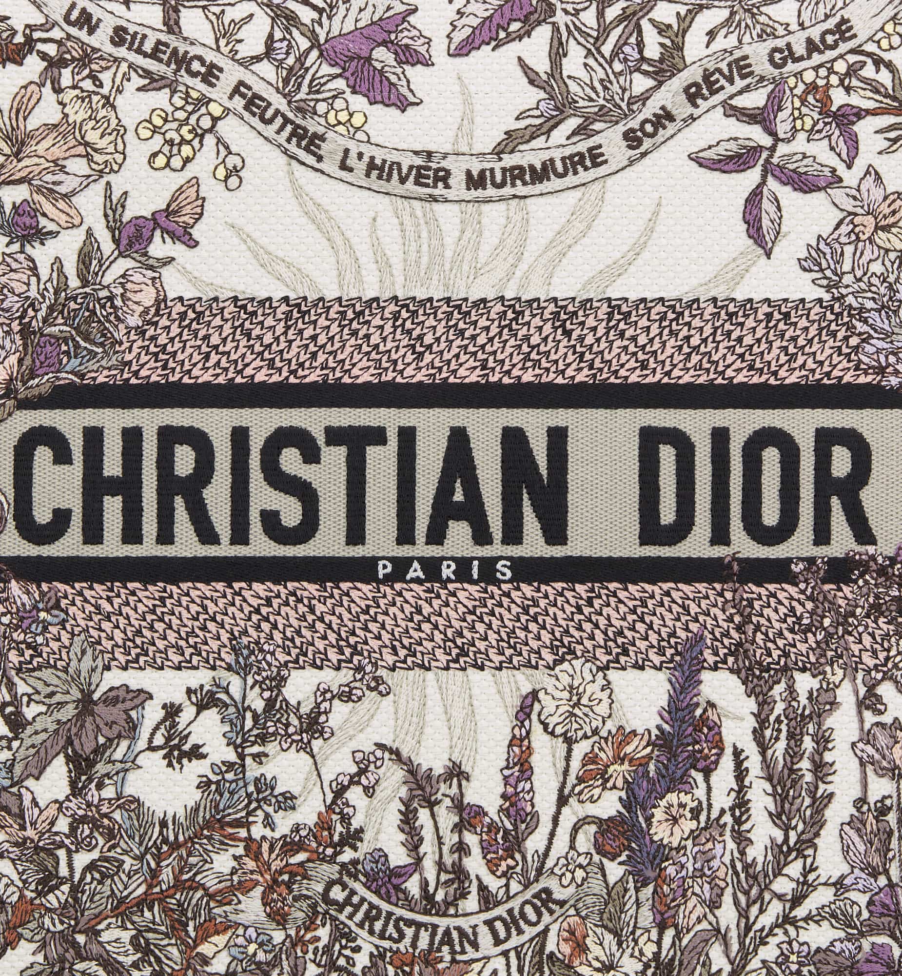 Introduced by Maria Grazia Chiuri, Creative Director of Christian Dior, the Dior Book Tote has become a staple of the Dior aesthetic. Designed to hold all the daily essentials, the ecru multicolor style is fully embroidered with the Dior 4 Saisons Hiver Soleil motif by Pietro Ruffo, celebrating the season’s signature sun theme with a bucolic wintry design punctuated by the words, Un silence feutré, l’hiver murmure son rêve glacé. Adorned with the Christian Dior Paris signature on the front, the medium tote exemplifies the House’s signature savoir-faire and may be carried by hand or worn over the shoulder.