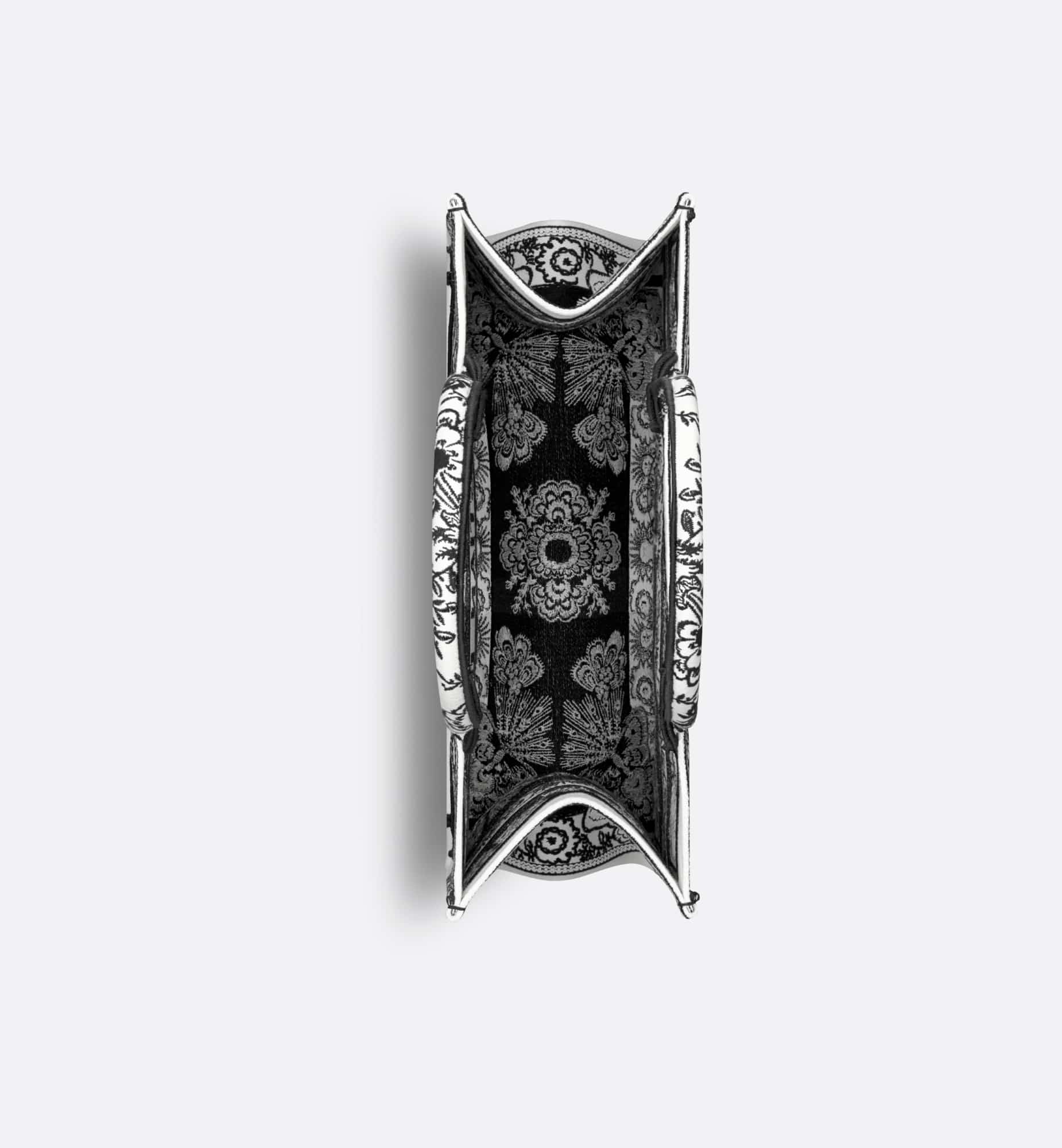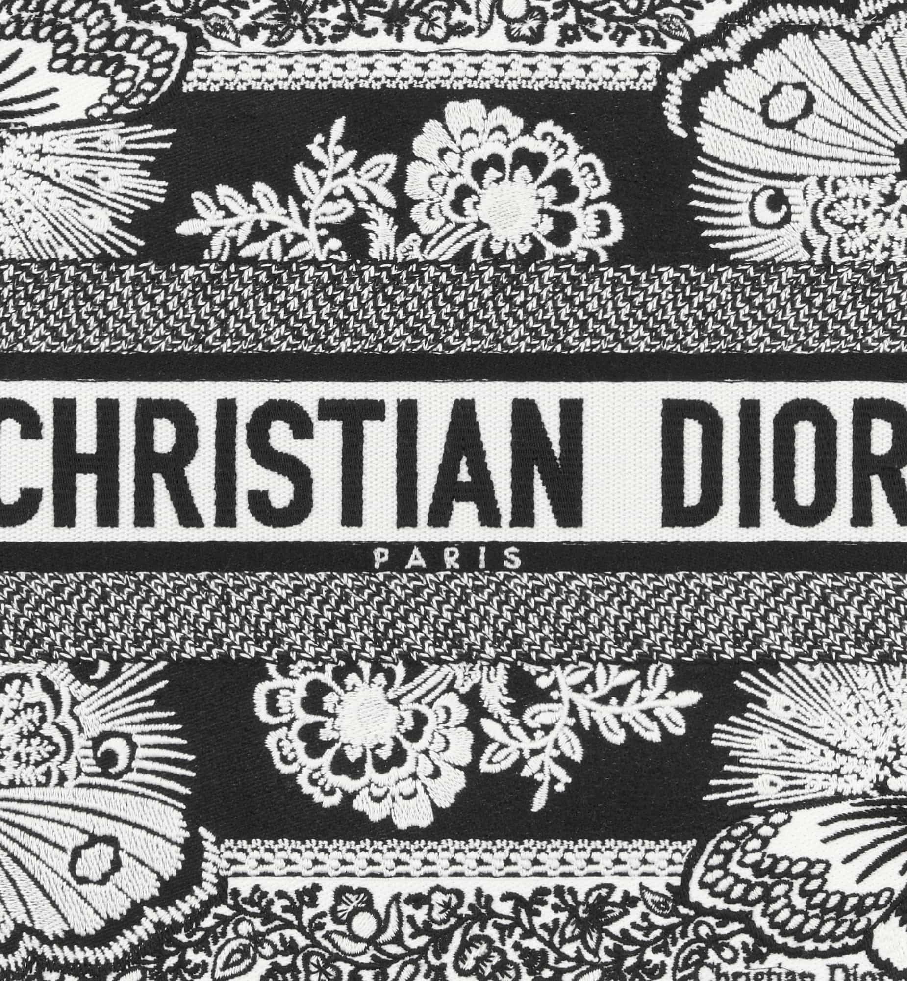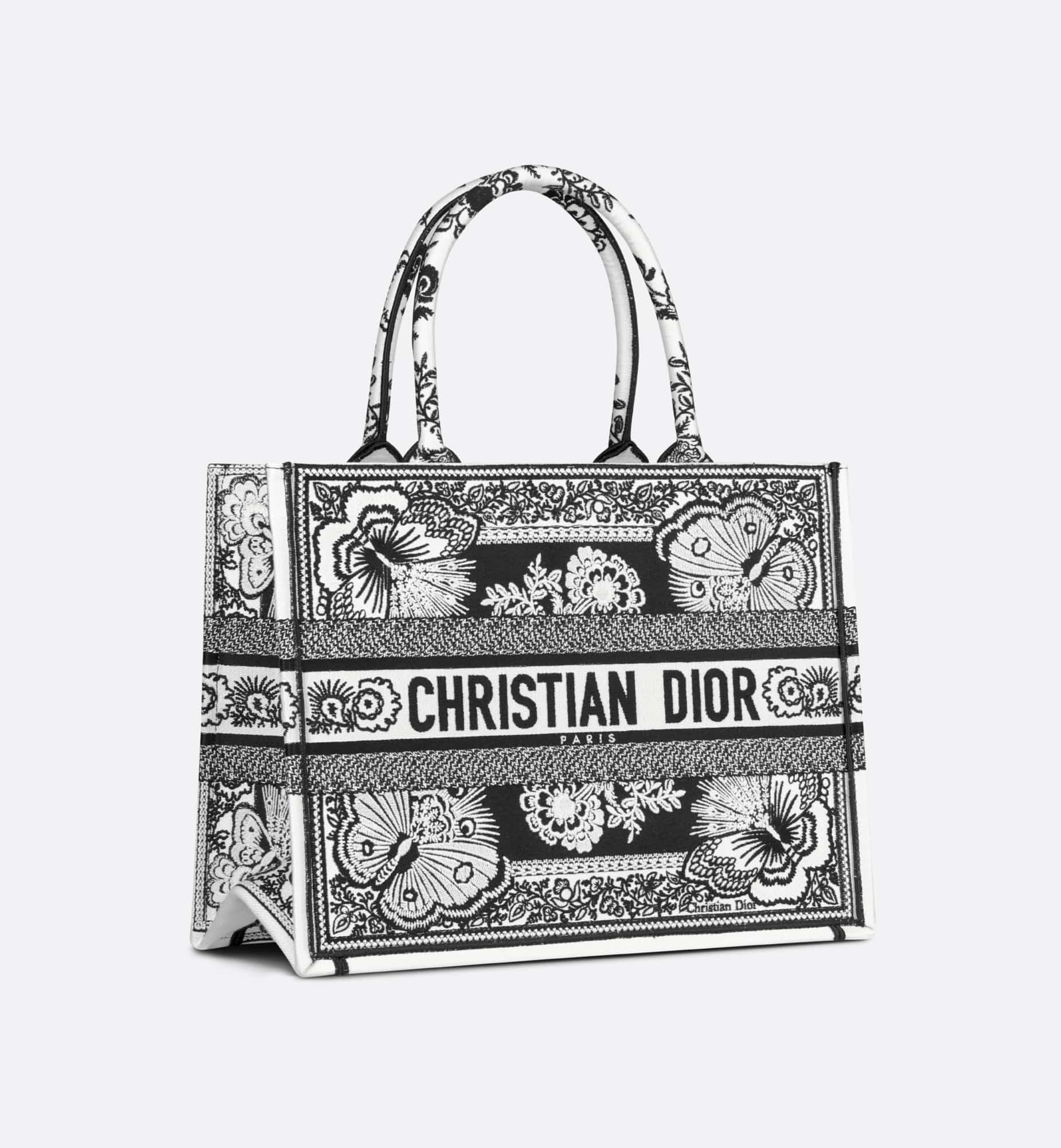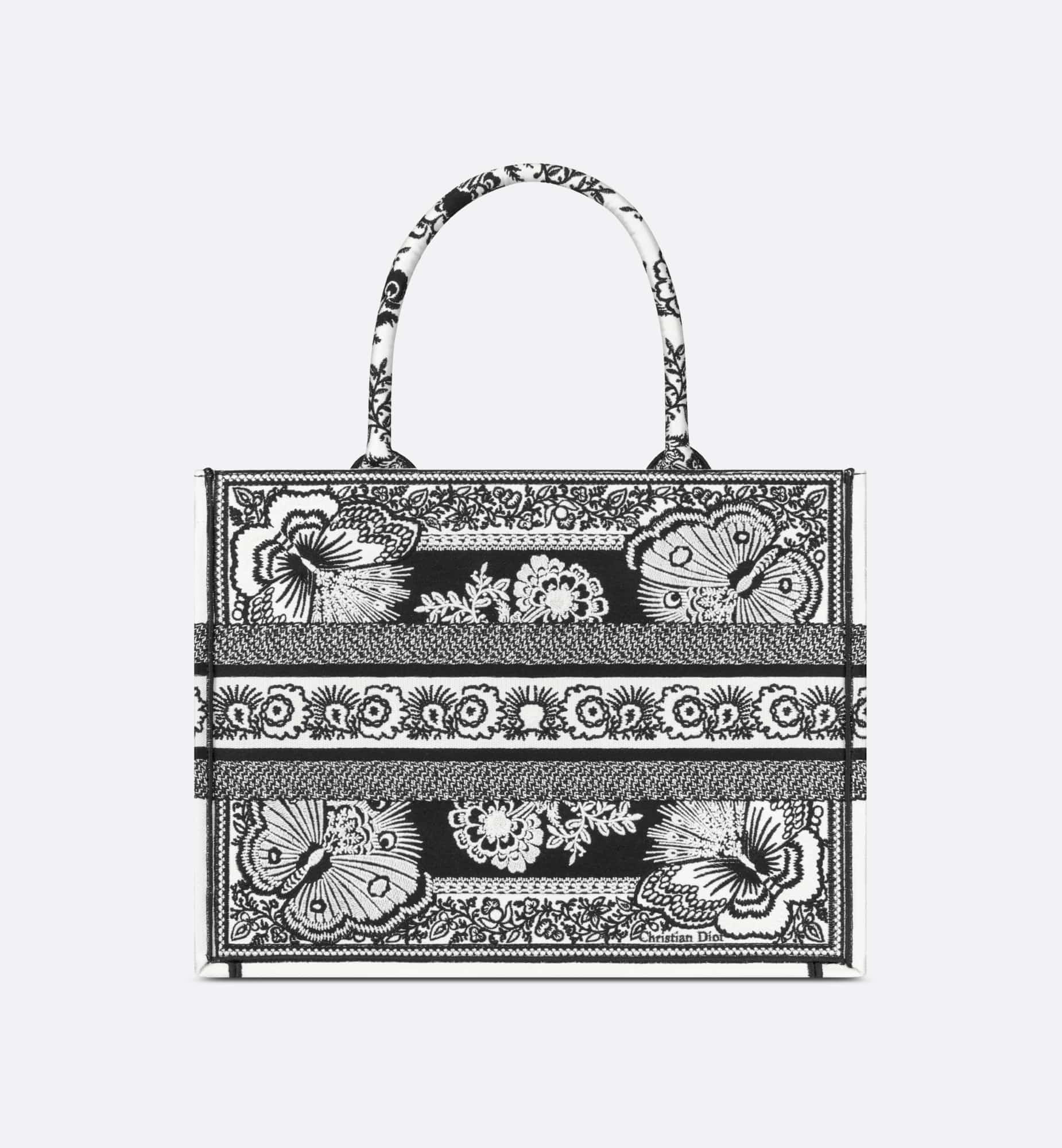 Introduced by Maria Grazia Chiuri, Creative Director of Christian Dior, the Dior Book Tote has become a staple of the Dior aesthetic. Designed to hold all the daily essentials, the style is fully embroidered with a black and white Butterfly Bandana motif, combining the butterfly with the timeless bandana pattern in a graphic spirit. Adorned with the Christian Dior Paris signature on the front, the medium tote exemplifies the House’s signature savoir-faire and may be carried by hand or worn over the shoulder.