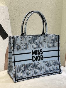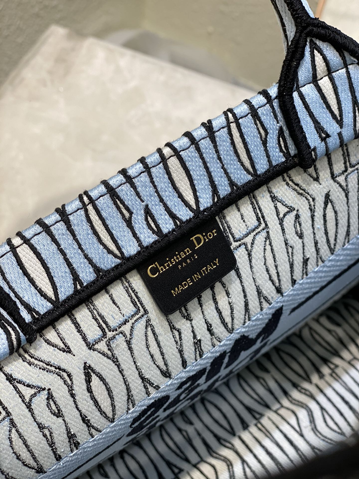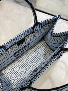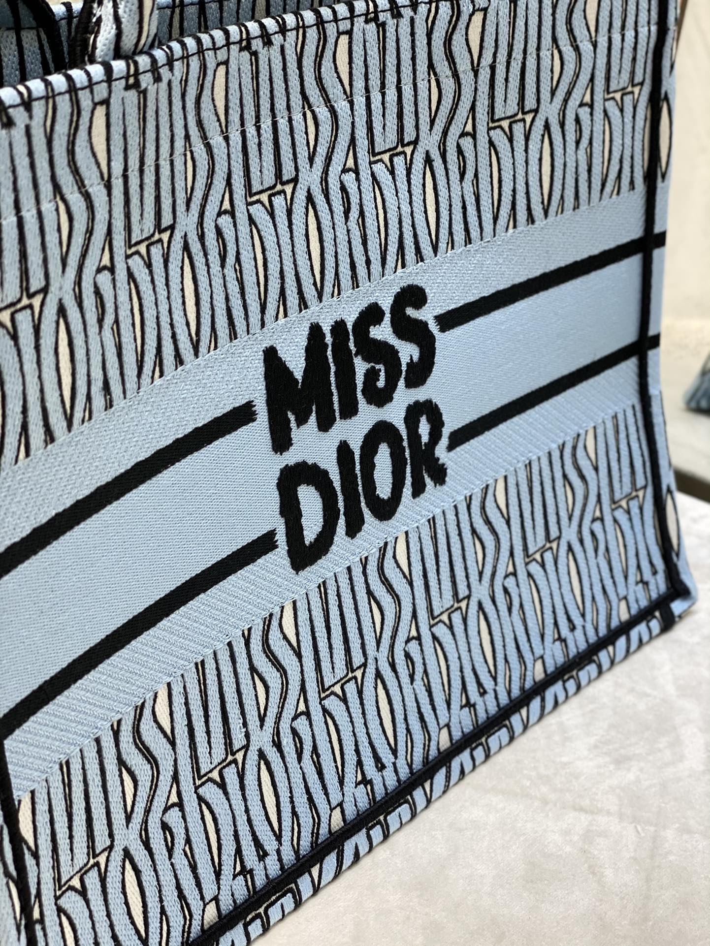 Introduced by Maria Grazia Chiuri, Creative Director of Christian Dior, the Dior Book Tote has become a staple of the Dior aesthetic. Designed to hold all the daily essentials, the pale blue style is fully embroidered with the collection’s hallmark black Miss Dior Allover motif, inspired by the Marc Bohan for Dior archives in a modern take on the 1960s. Adorned with the Miss Dior Graffiti signature on the front, the medium tote exemplifies the House’s savoir-faire and may be carried by hand or worn over the shoulder.