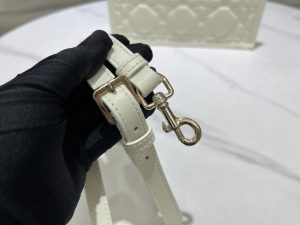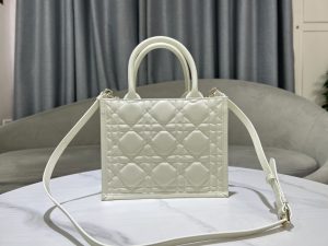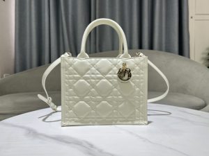 Maria Grazia Chiuri’s hallmark Dior Book Tote offers an original take on elegance. Crafted in latte calfskin, the design showcases the Macrocannage motif and is embellished with pale gold-finish metal D.I.O.R charms on one of the handles. The cashmere leather interior reveals a zip pocket and patch pockets, ideal for organizing all the daily essentials. Featuring an adjustable and removable strap, the lightweight and practical small tote is a prime example of Dior savoir-faire and may be carried by hand or worn over the shoulder.