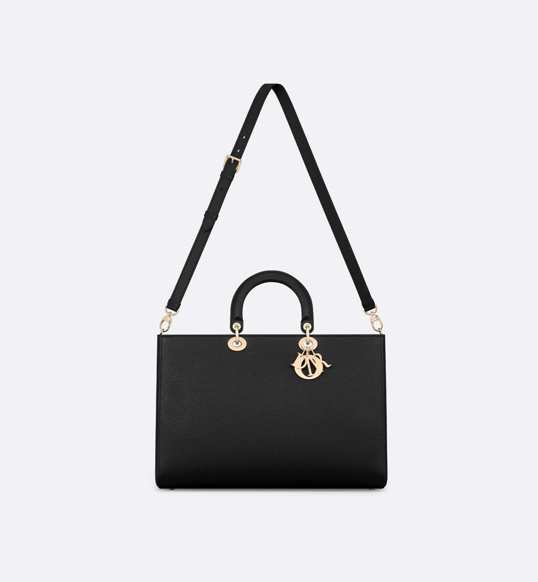New for Summer 2024, the Lady D-Sire bag draws inspiration from the signature elegance of the Lady Dior design. Reimagined with a casual style for an urban look, the lightweight black grained bull leather feels soft to the touch yet offers excellent durability. The extra large style is embellished with pale gold-finish metal D.I.O.R. charms that illuminate the silhouette. Showcasing a removable, thin leather shoulder strap, the unique bag can be carried by hand or over the shoulder.