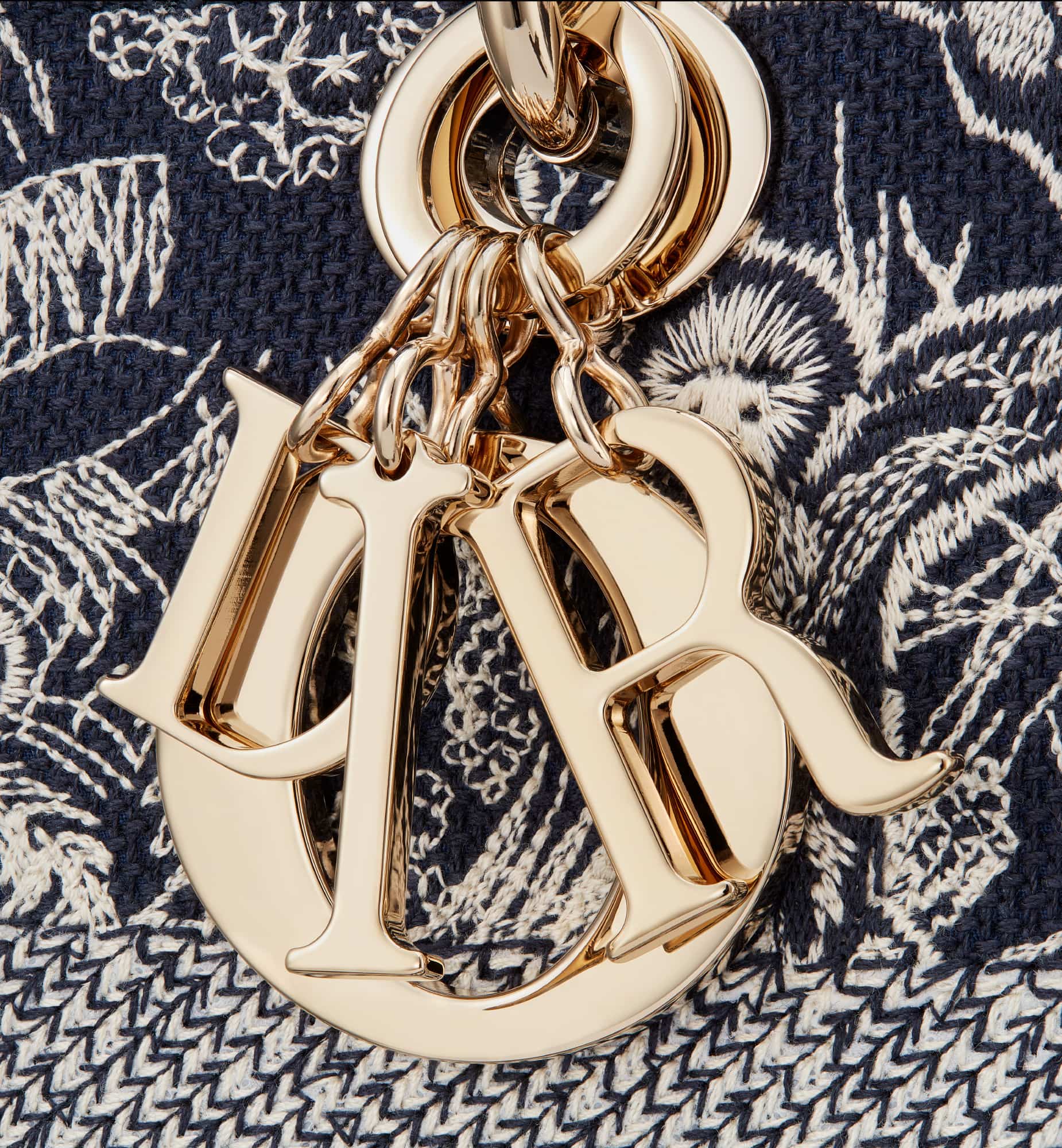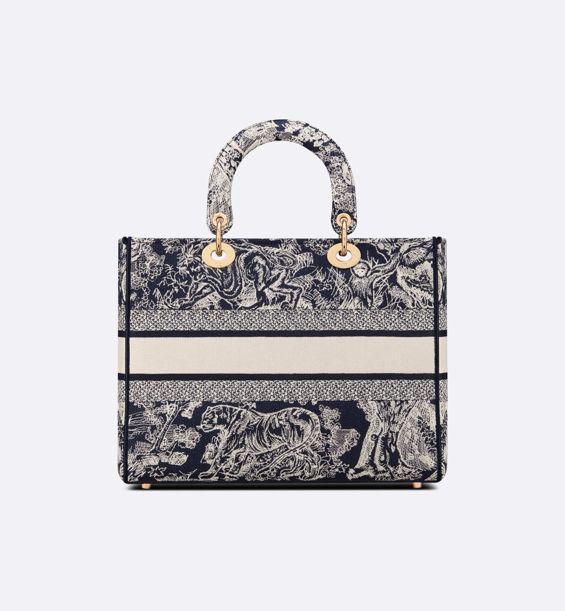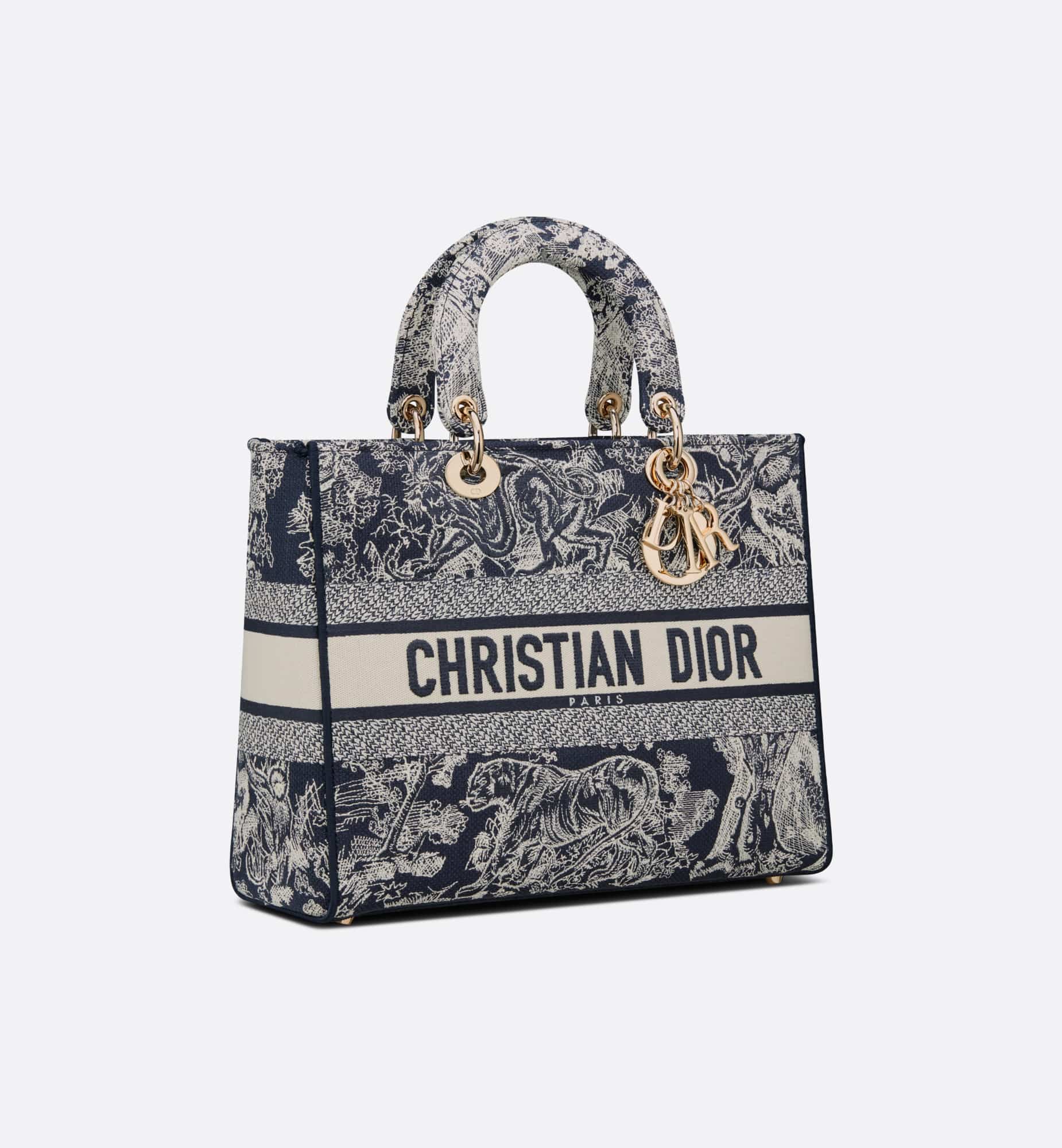 The Lady D-Lite bag combines classic elegance with House modernity. The style is fully embroidered with the blue Toile de Jouy Reverse motif, a variation of the hallmark House pattern with a play on reversed colors. The front features a Christian Dior Paris signature while the thick D.I.O.R. charms in pale gold-finish metal enhance the silhouette. Equipped with a wide, reversible and removable embroidered shoulder strap, the large Lady D-Lite bag can be carried by hand or worn crossbody.