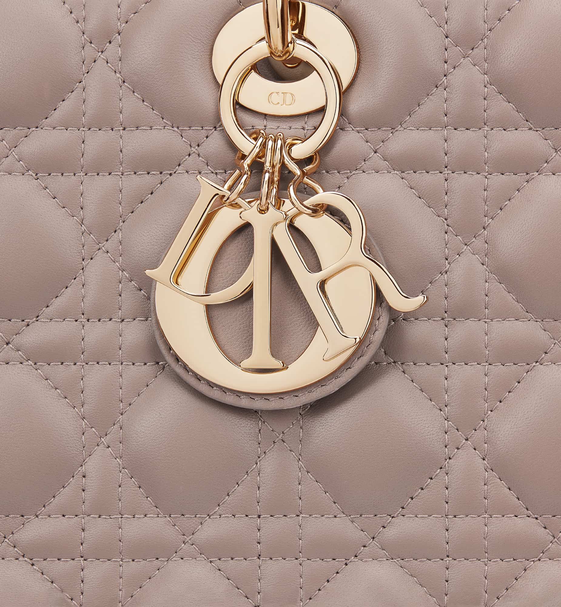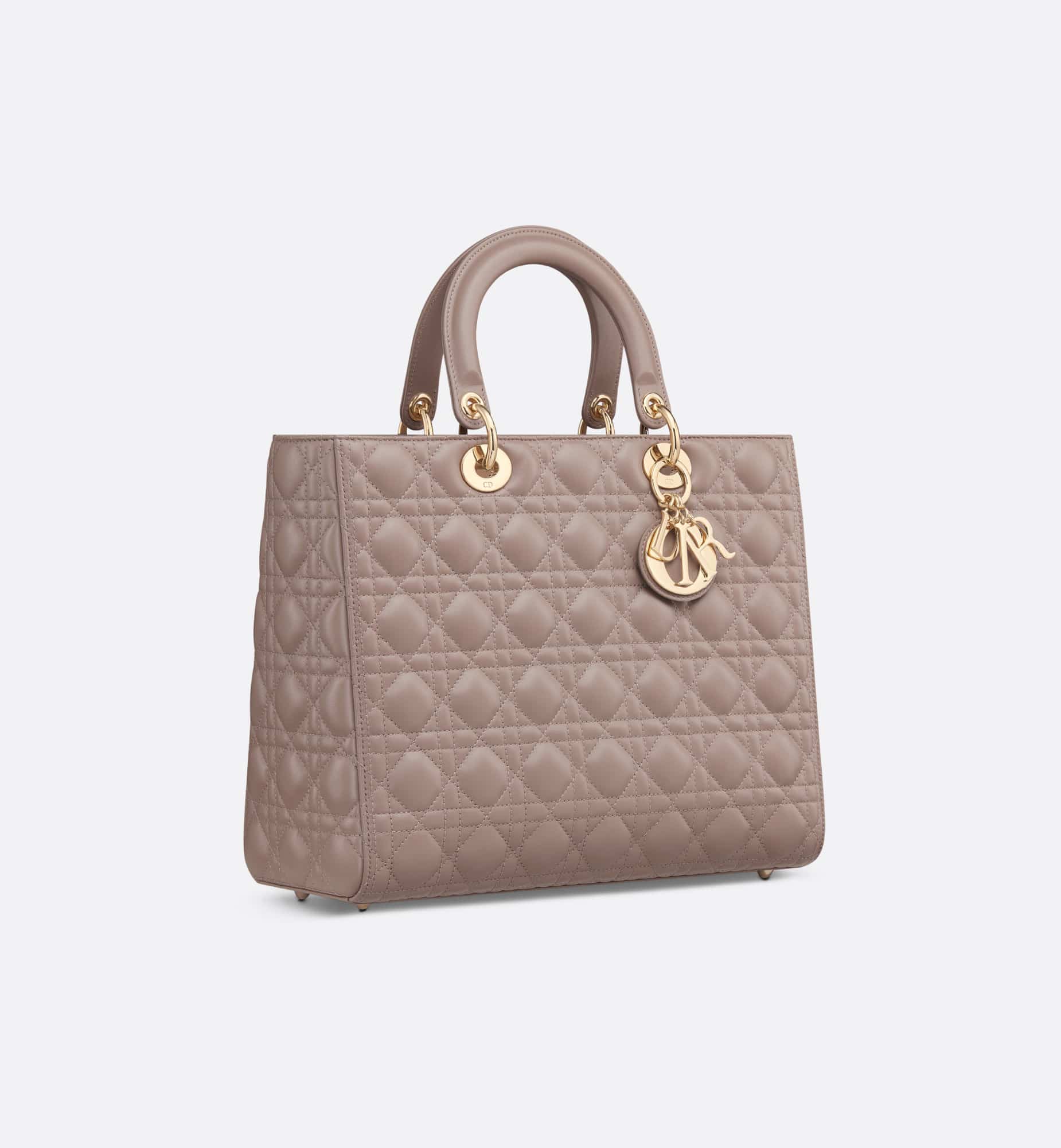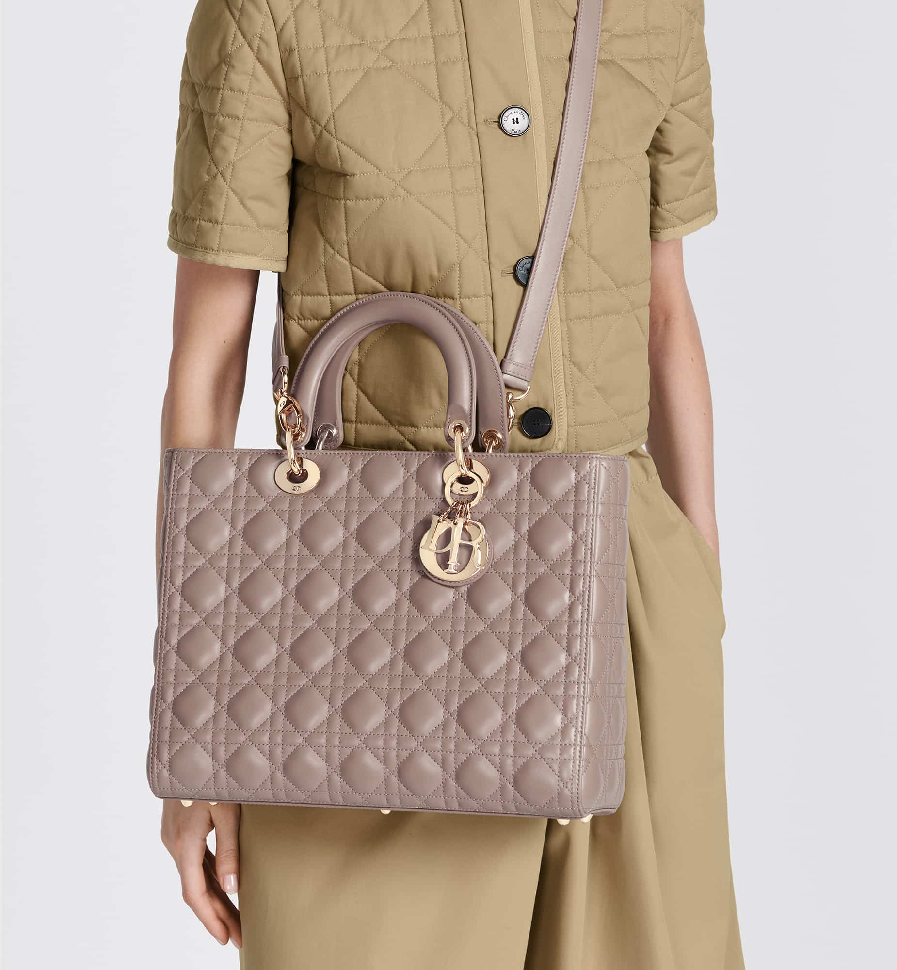 The Lady Dior bag epitomizes the House’s vision of elegance and beauty. Sleek and refined, the style is timeless. It is crafted in warm taupe lambskin with Cannage stitching, creating the instantly recognizable quilted texture. Pale gold-finish metal D.I.O.R. charms offer an elegant touch. Featuring a thin, removable leather shoulder strap, the large Lady Dior bag may be carried by hand or worn crossbody.