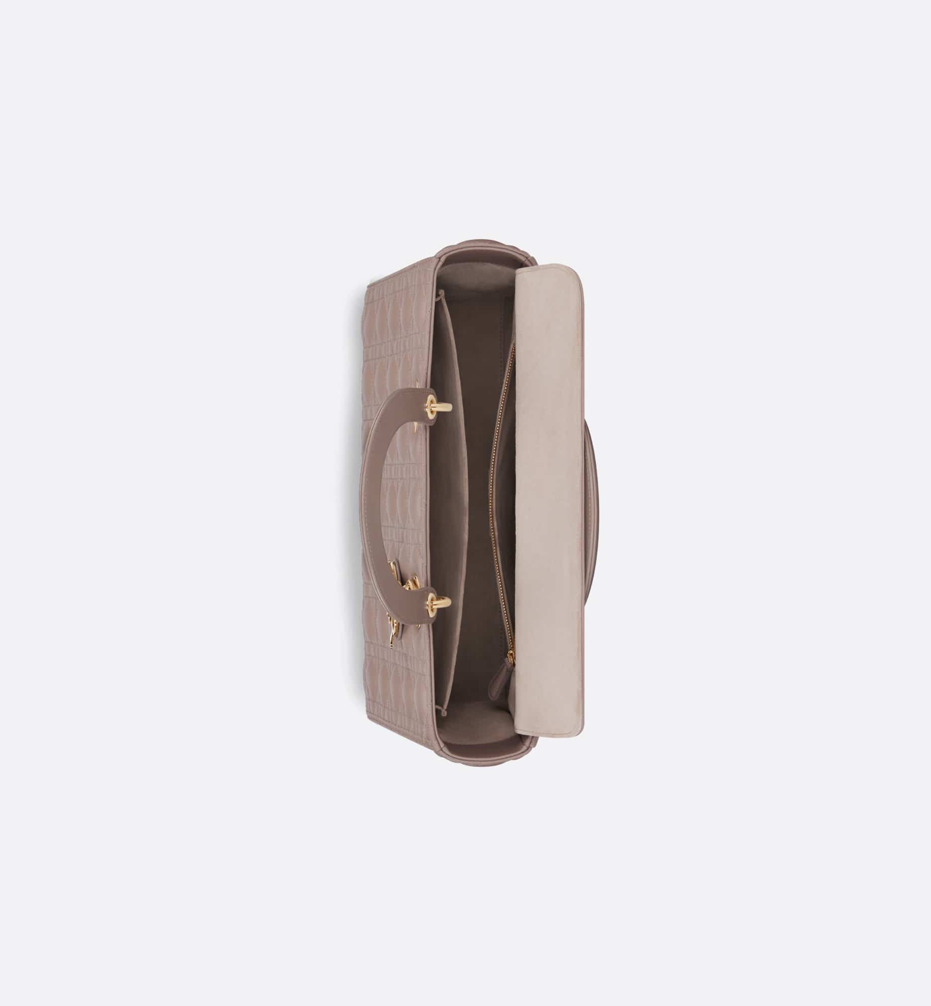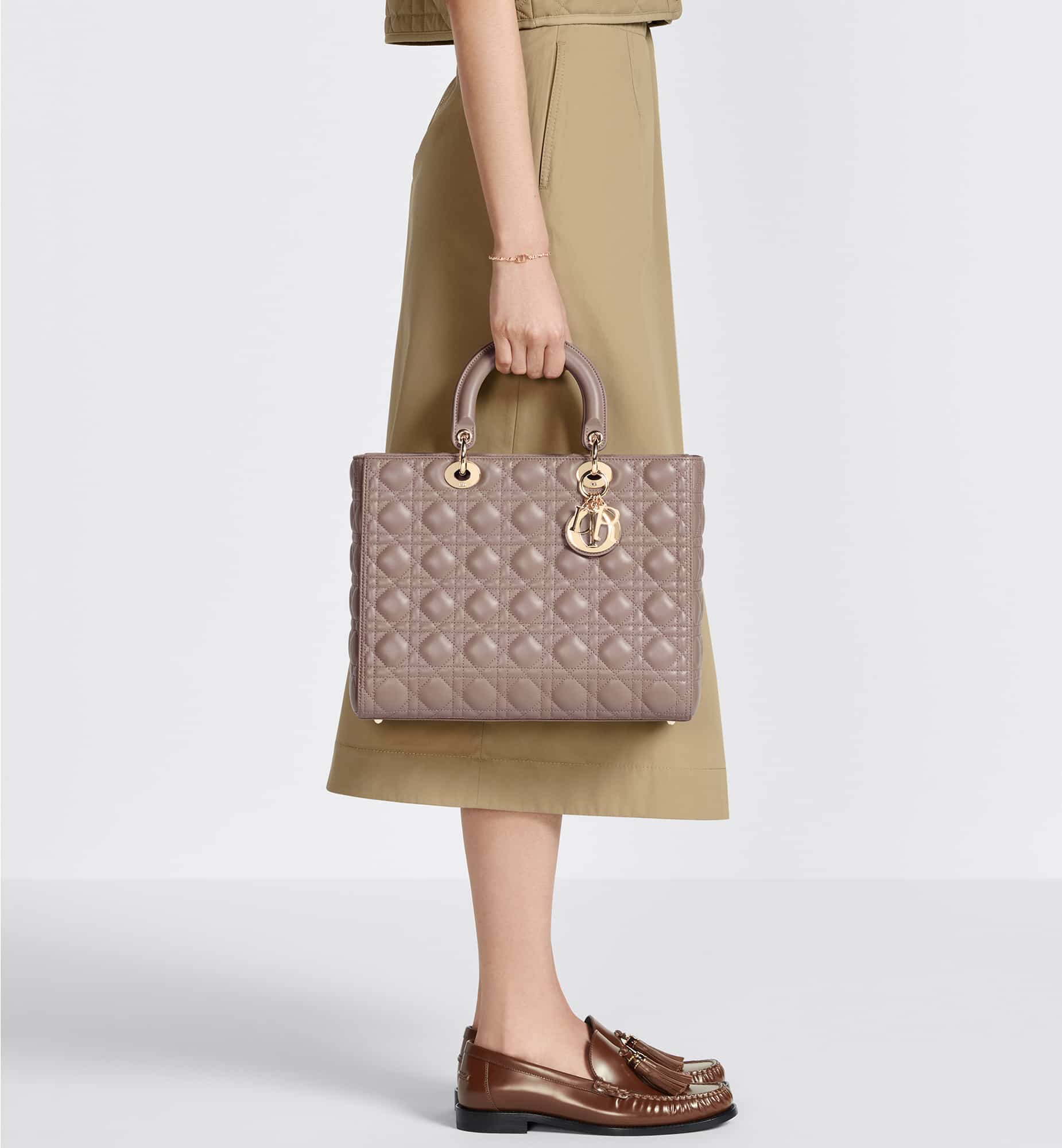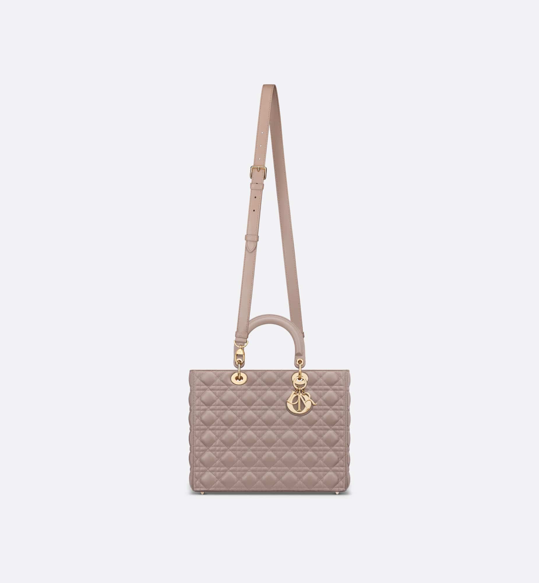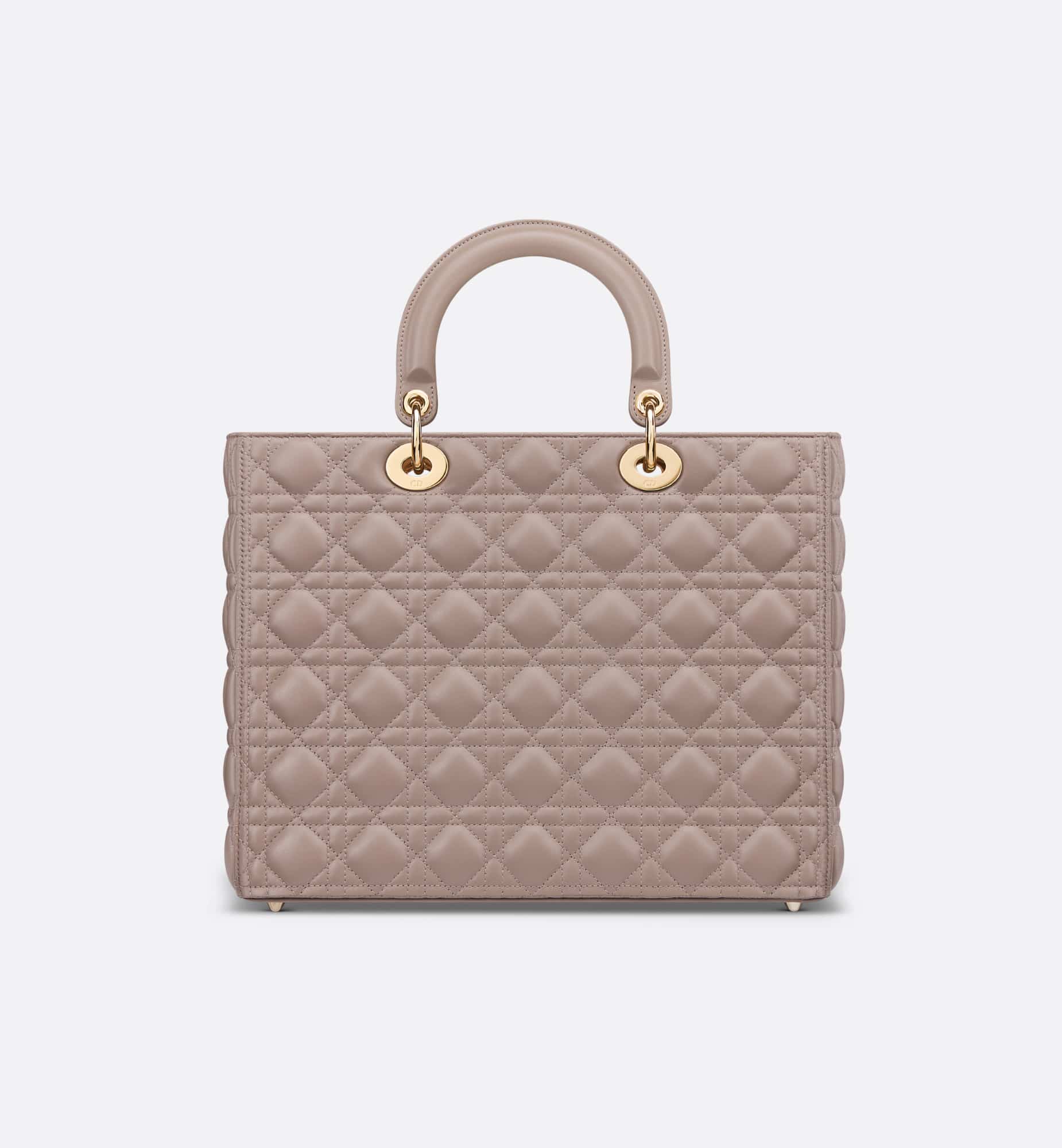 The Lady Dior bag epitomizes the House’s vision of elegance and beauty. Sleek and refined, the style is timeless. It is crafted in warm taupe lambskin with Cannage stitching, creating the instantly recognizable quilted texture. Pale gold-finish metal D.I.O.R. charms offer an elegant touch. Featuring a thin, removable leather shoulder strap, the large Lady Dior bag may be carried by hand or worn crossbody.