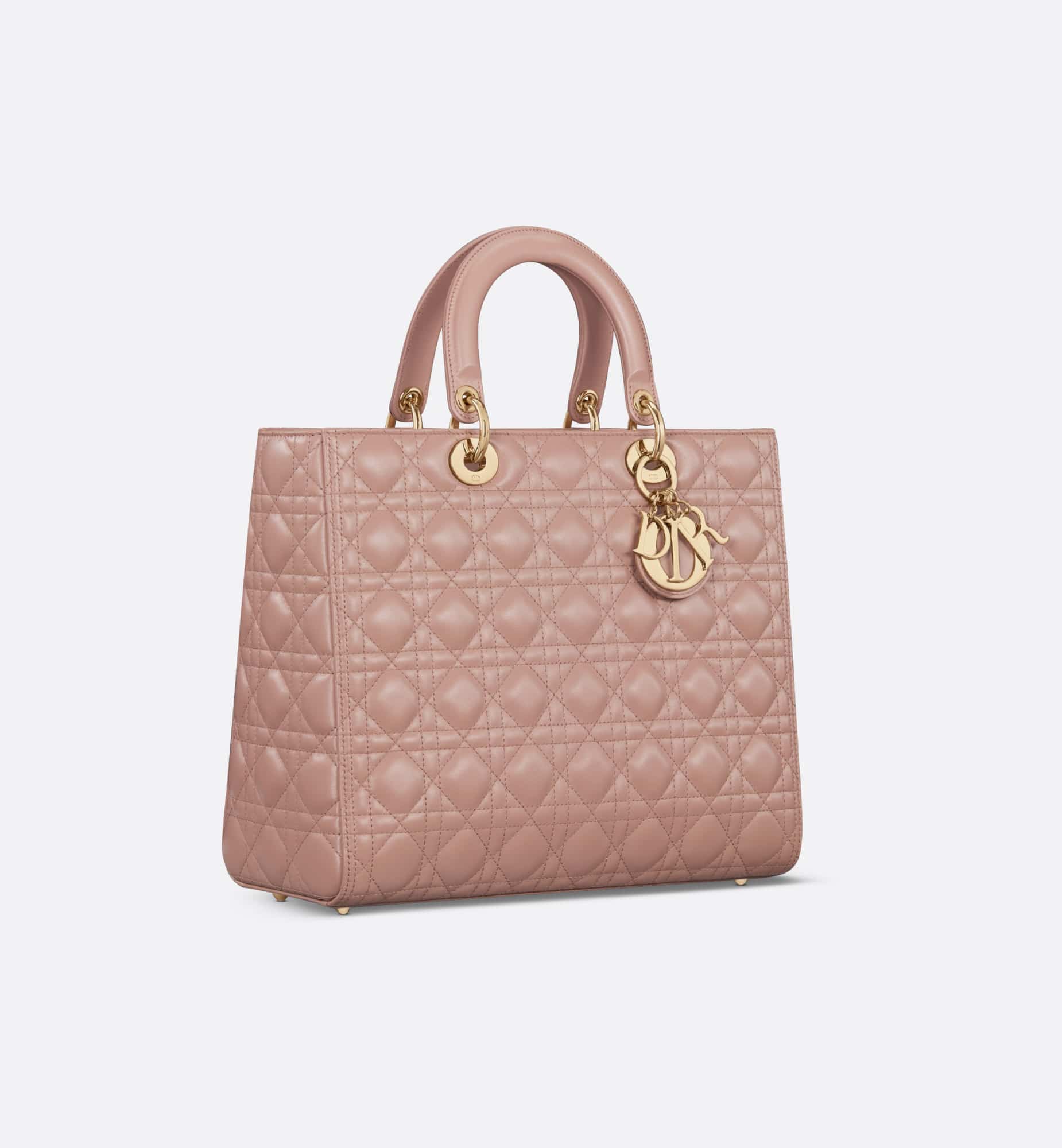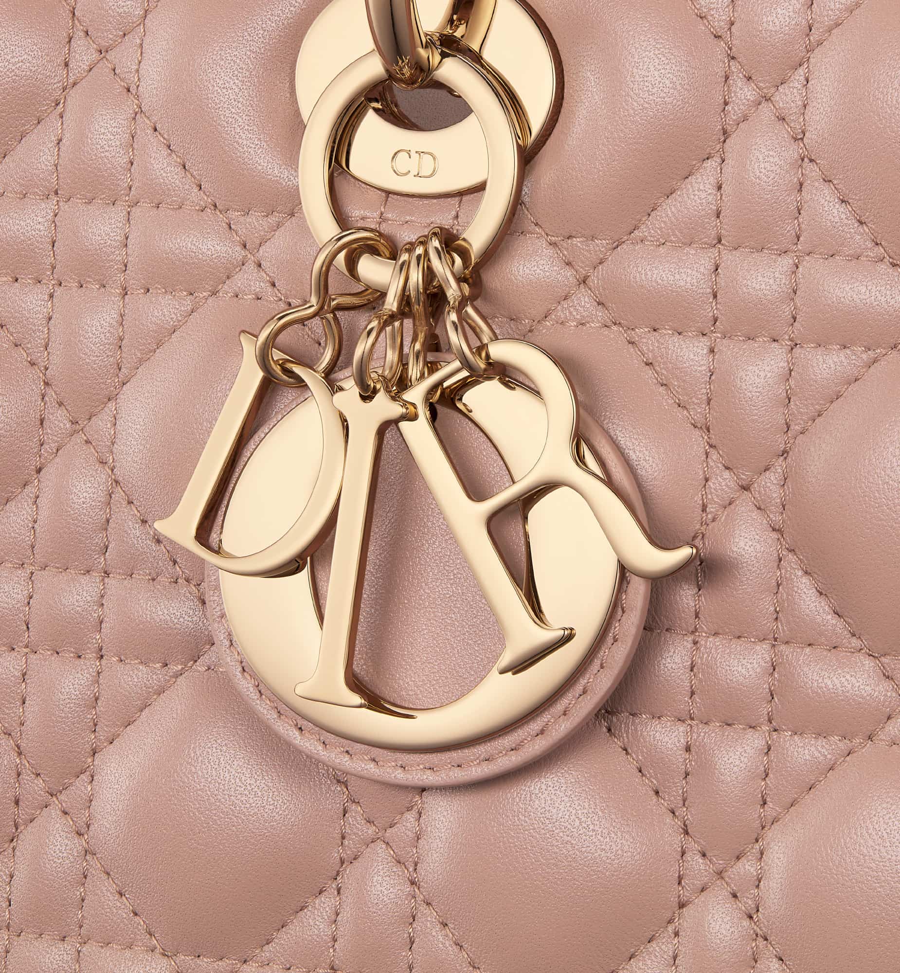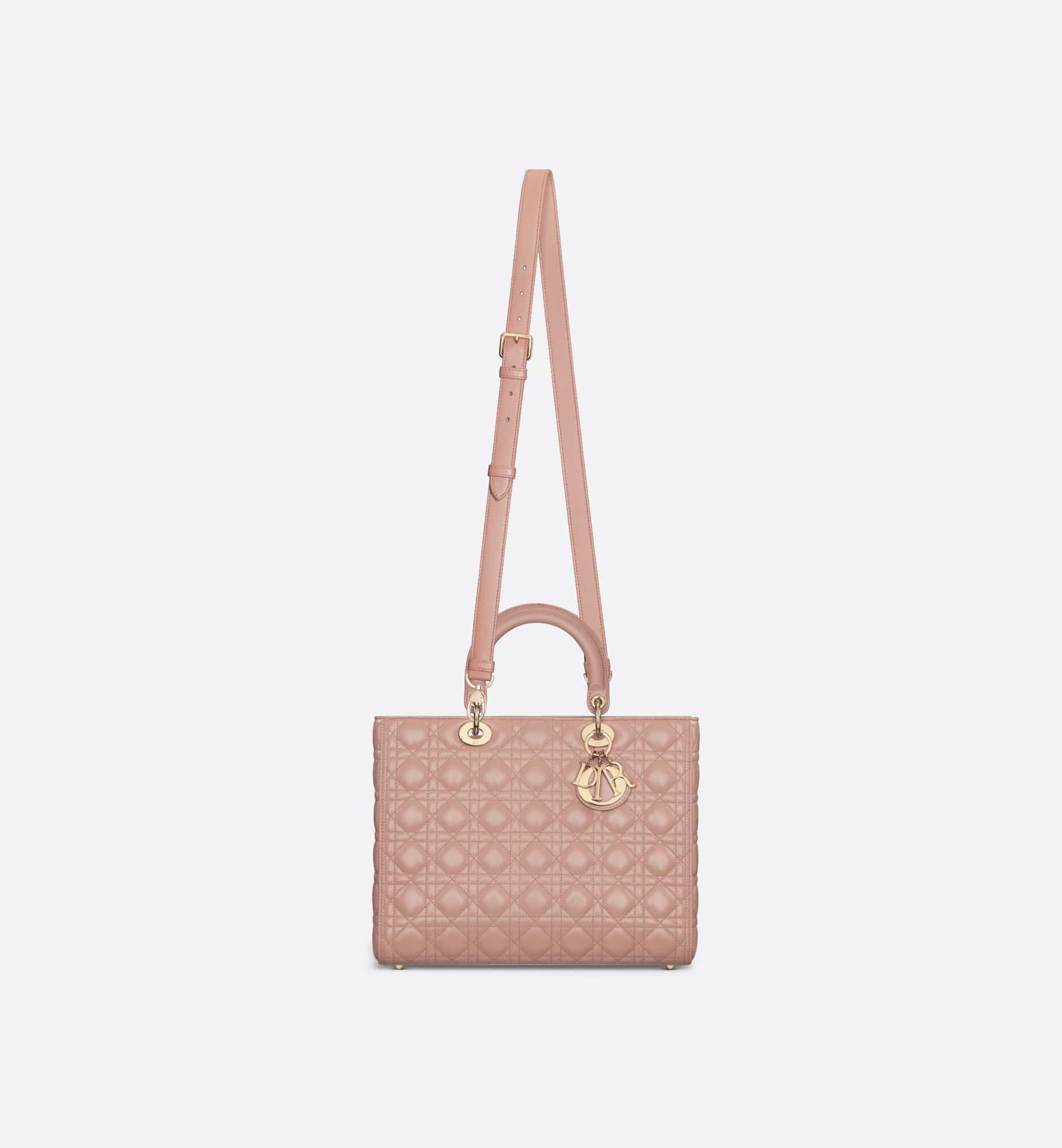 The Lady Dior bag epitomizes the House’s vision of elegance and beauty. A sleek, refined bag, it is timeless yet modern. Crafted from blush lambskin and covered with Cannage stitching, it showcases an iconic and instantly recognizable quilted texture. The pale gold-finish metal D.I.O.R. charms offer an elegant allure. Featuring a thin, removable leather shoulder strap, the large Lady Dior bag can be carried by hand, worn over the shoulder or crossbody.