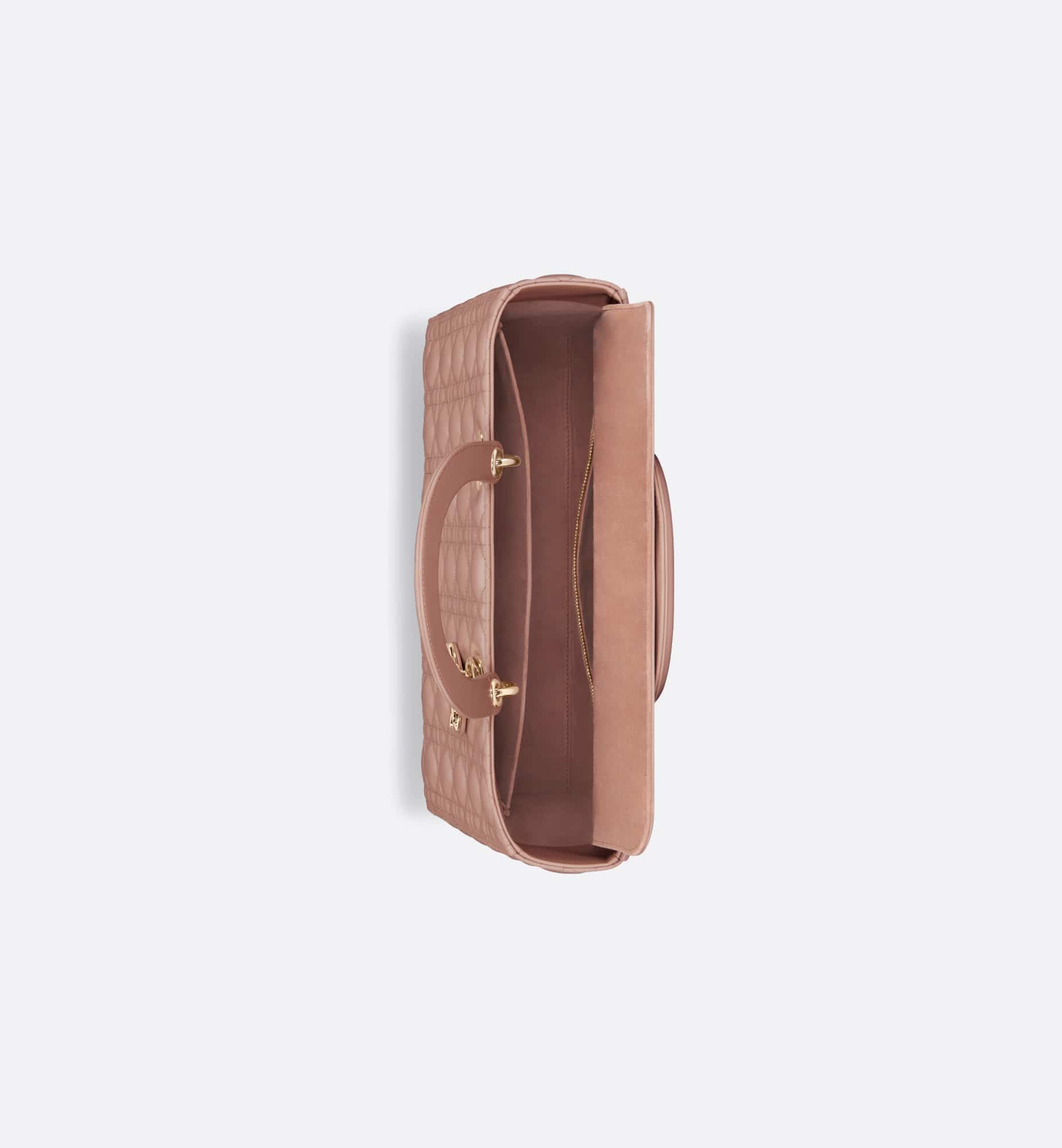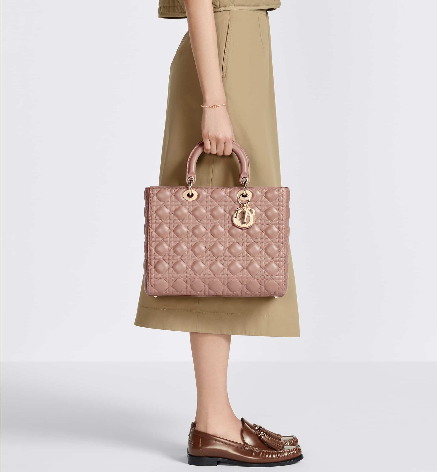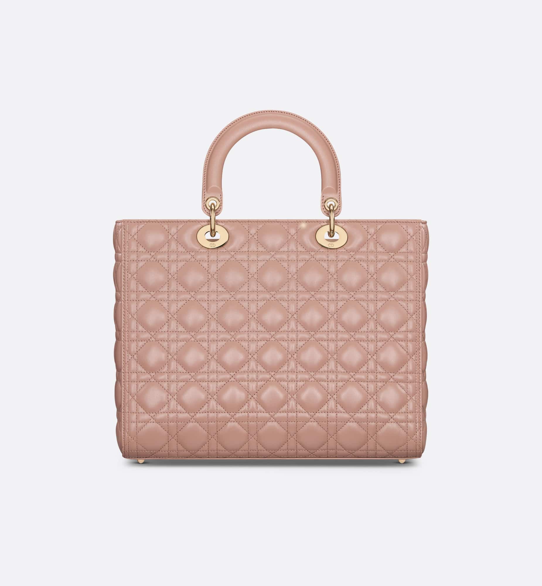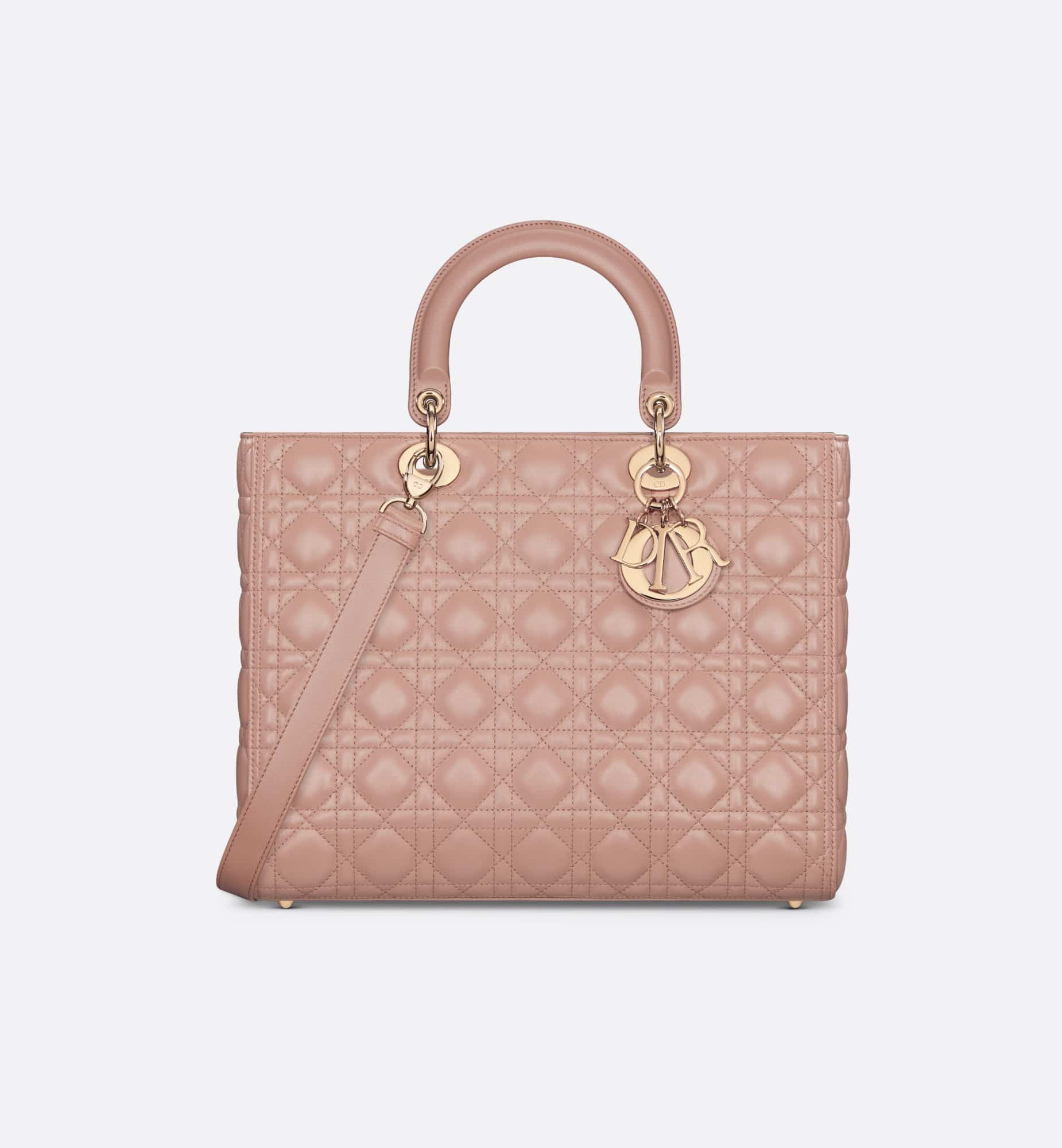 The Lady Dior bag epitomizes the House’s vision of elegance and beauty. A sleek, refined bag, it is timeless yet modern. Crafted from blush lambskin and covered with Cannage stitching, it showcases an iconic and instantly recognizable quilted texture. The pale gold-finish metal D.I.O.R. charms offer an elegant allure. Featuring a thin, removable leather shoulder strap, the large Lady Dior bag can be carried by hand, worn over the shoulder or crossbody.