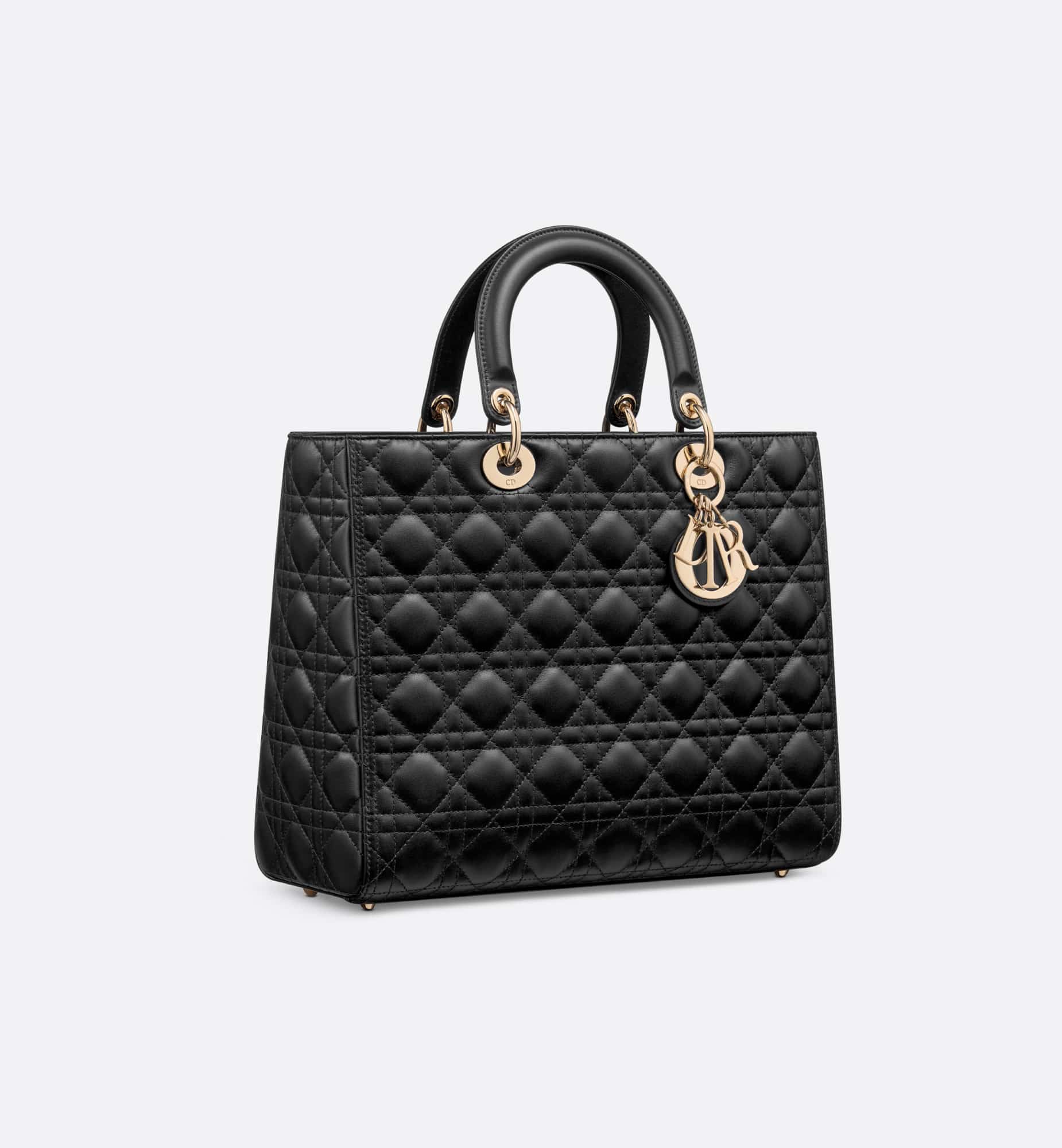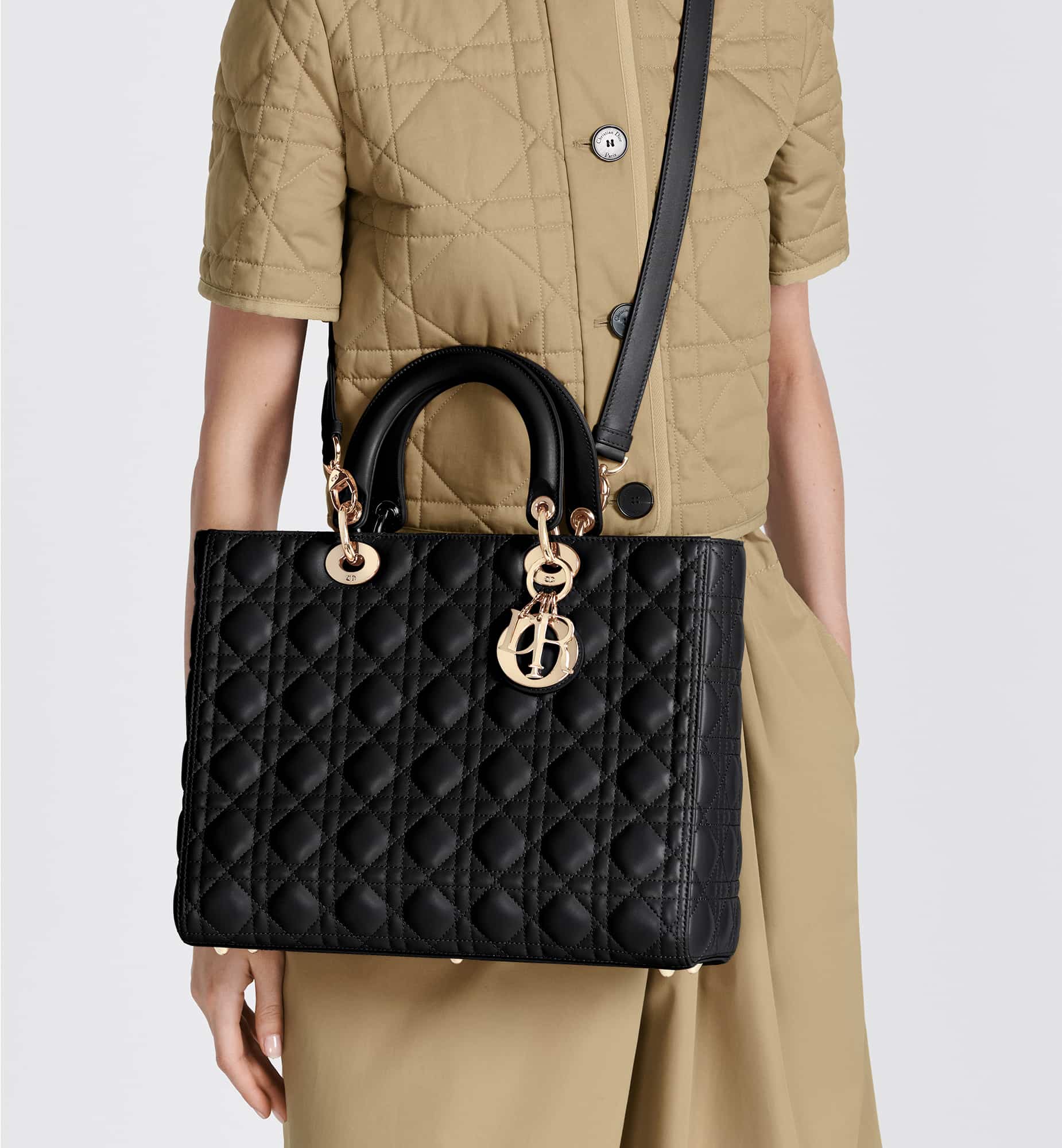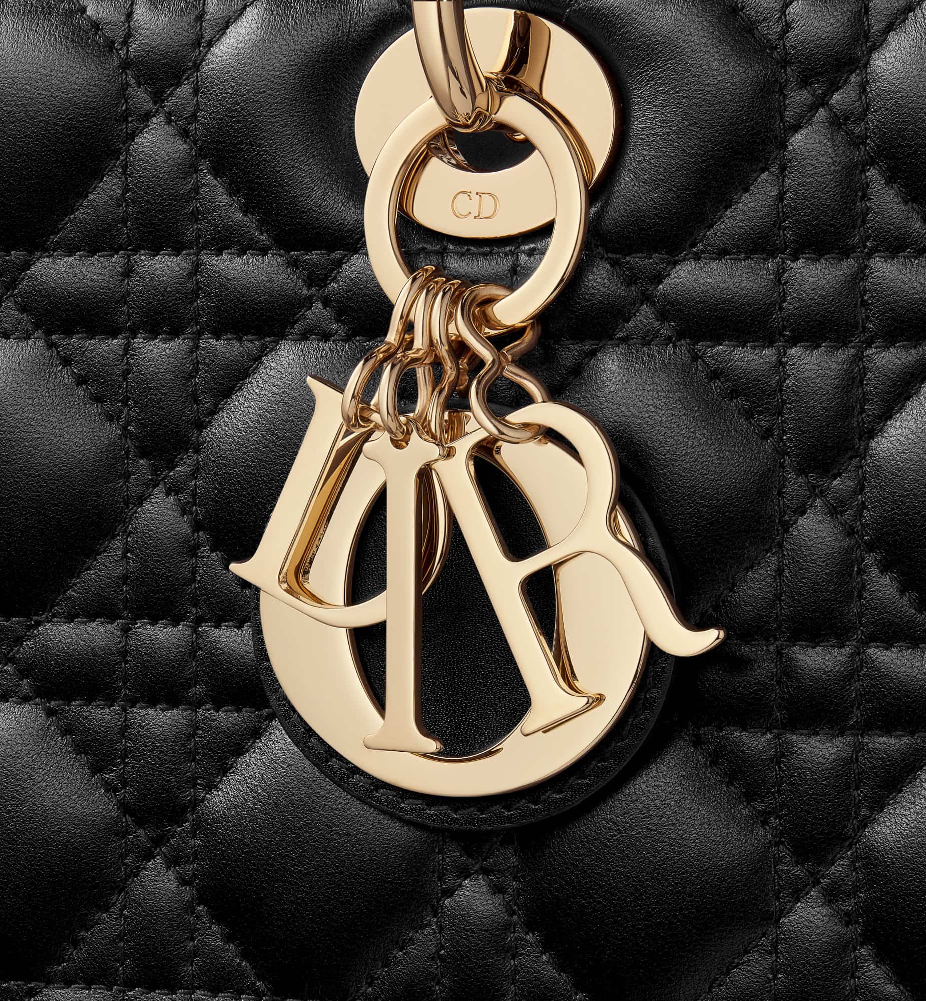 The Lady Dior bag epitomizes the House’s vision of elegance and beauty. Sleek and refined, the timeless yet relevant style is crafted in black lambskin with Cannage stitching, creating the instantly recognizable quilted texture. The pale gold-finish metal D.I.O.R. charms lend a polished touch to the style. Featuring a thin, removable leather shoulder strap, the large Lady Dior bag can be carried by hand, worn over the shoulder or crossbody as an ideal evening companion.