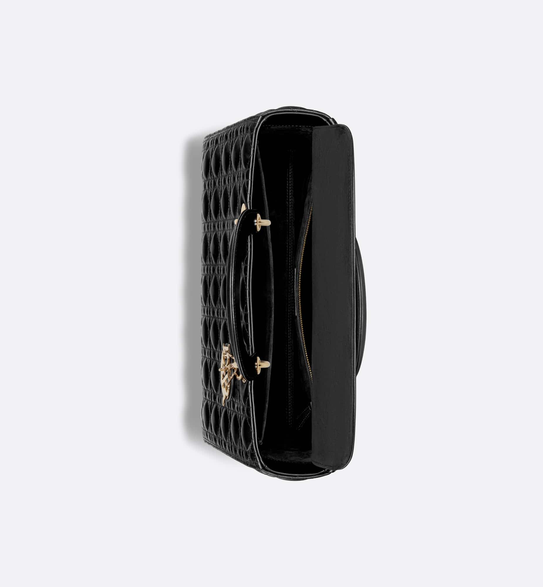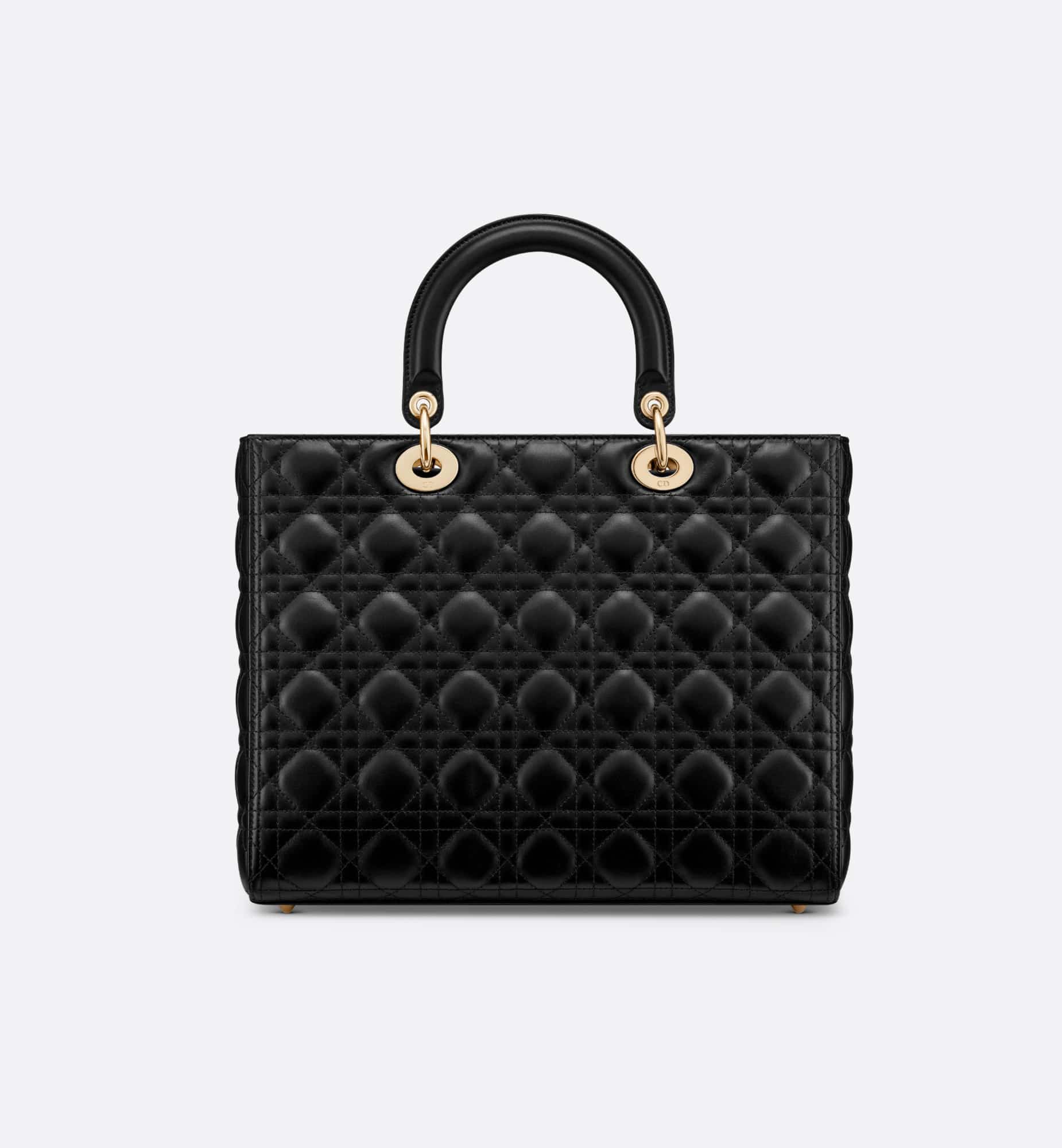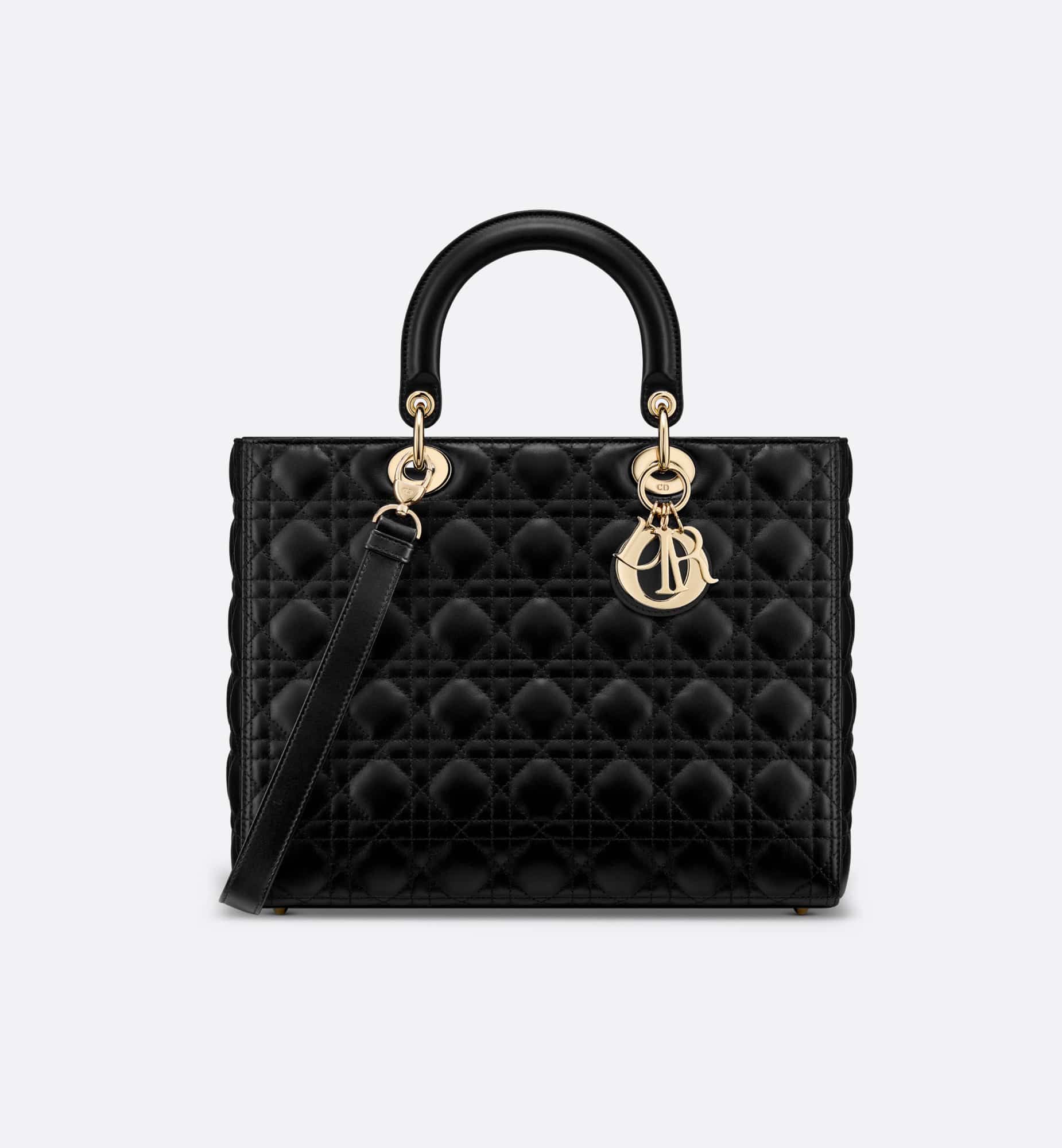 The Lady Dior bag epitomizes the House’s vision of elegance and beauty. Sleek and refined, the timeless yet relevant style is crafted in black lambskin with Cannage stitching, creating the instantly recognizable quilted texture. The pale gold-finish metal D.I.O.R. charms lend a polished touch to the style. Featuring a thin, removable leather shoulder strap, the large Lady Dior bag can be carried by hand, worn over the shoulder or crossbody as an ideal evening companion.