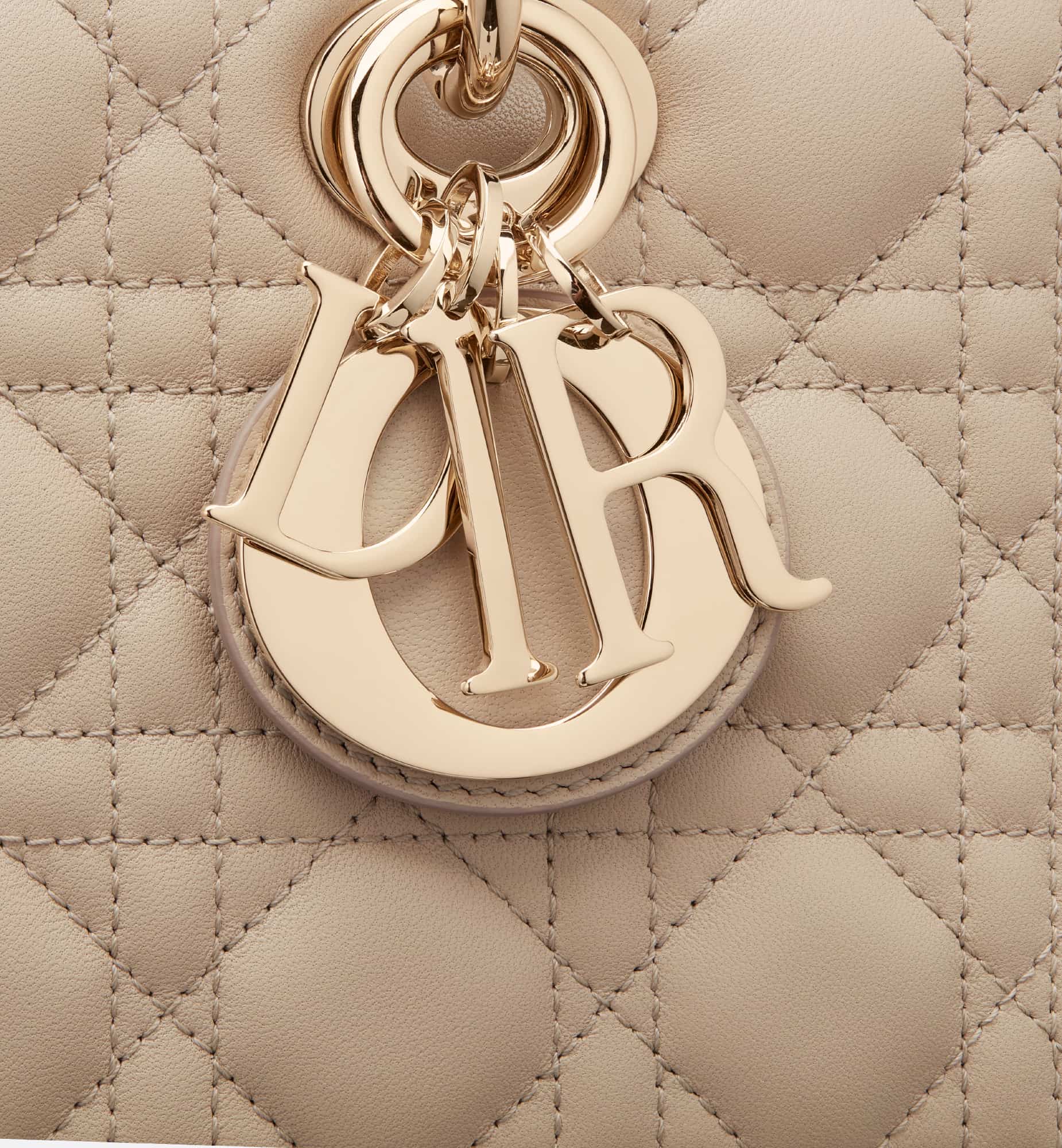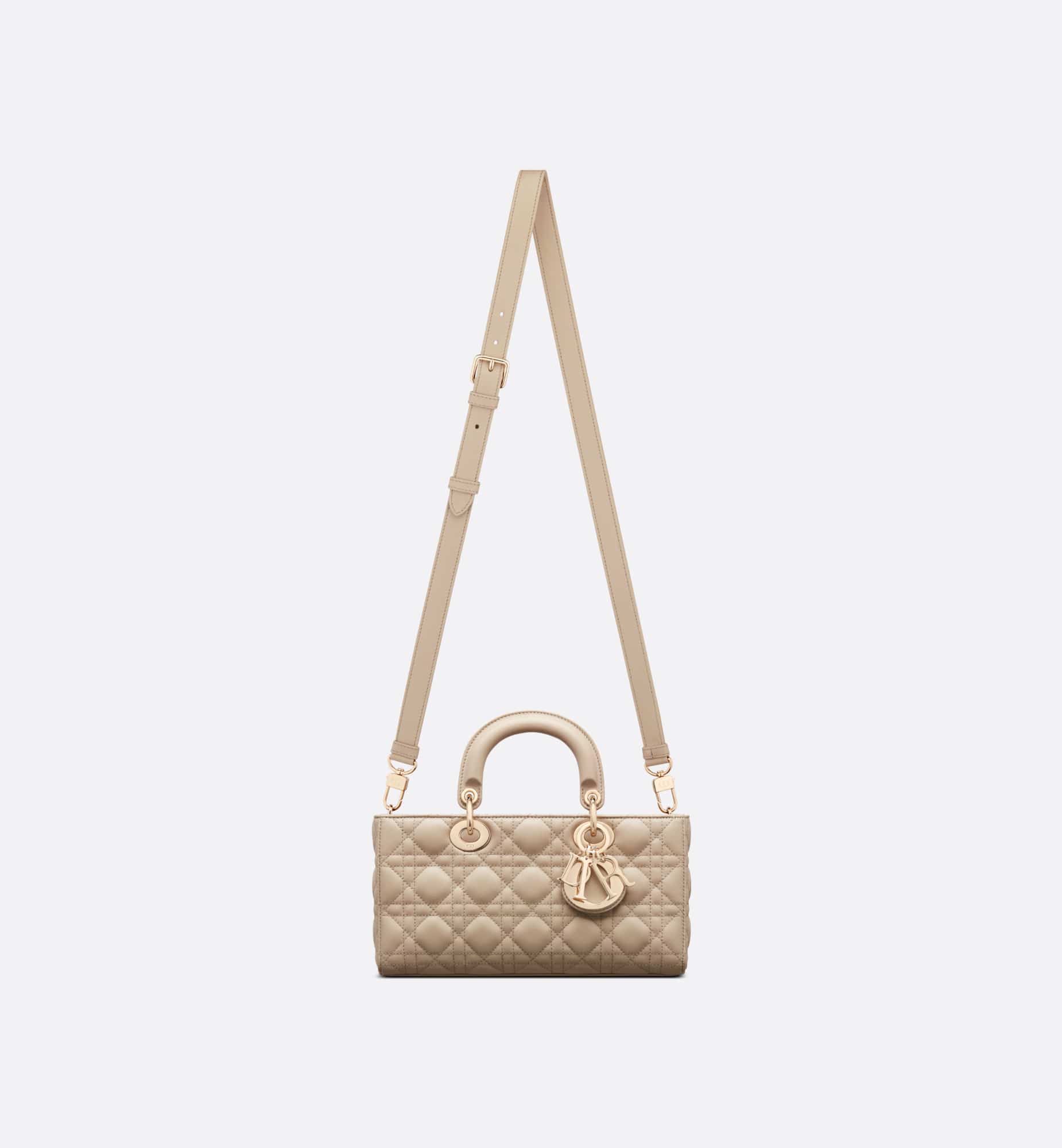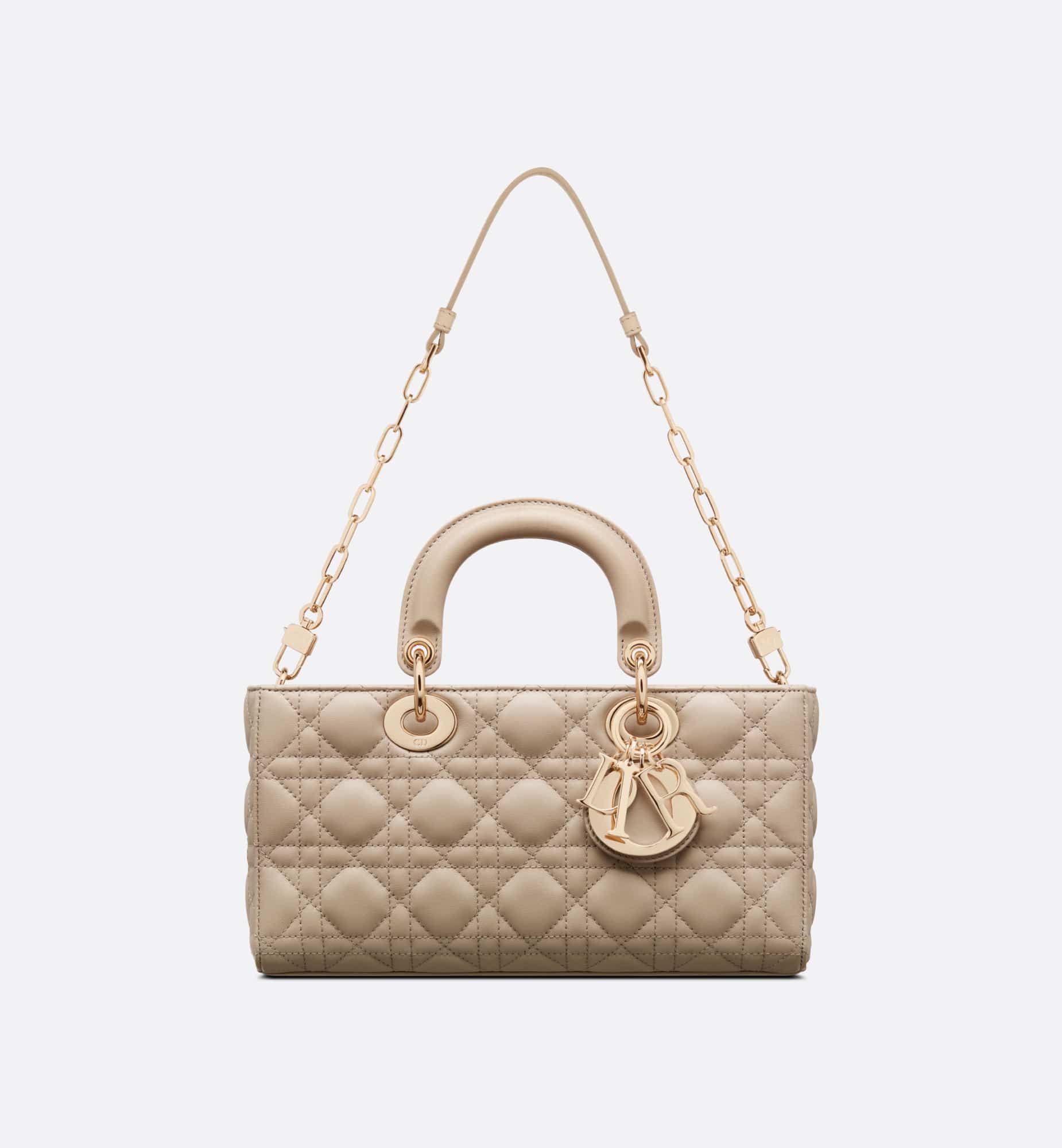 The Lady D-Joy bag captures the House’s vision of elegance and beauty. Refined and sleek, this timeless style showcases the iconic streamlined aesthetic of the Lady Dior line. Crafted in sand-colored lambskin with Cannage stitching, it is enhanced by pale gold-finish metal D.I.O.R. charms embellishing its silhouette. Featuring one removable chain shoulder strap and another adjustable and removable leather shoulder strap, the medium Lady D-Joy bag can be carried by hand or worn crossbody as a daily companion.