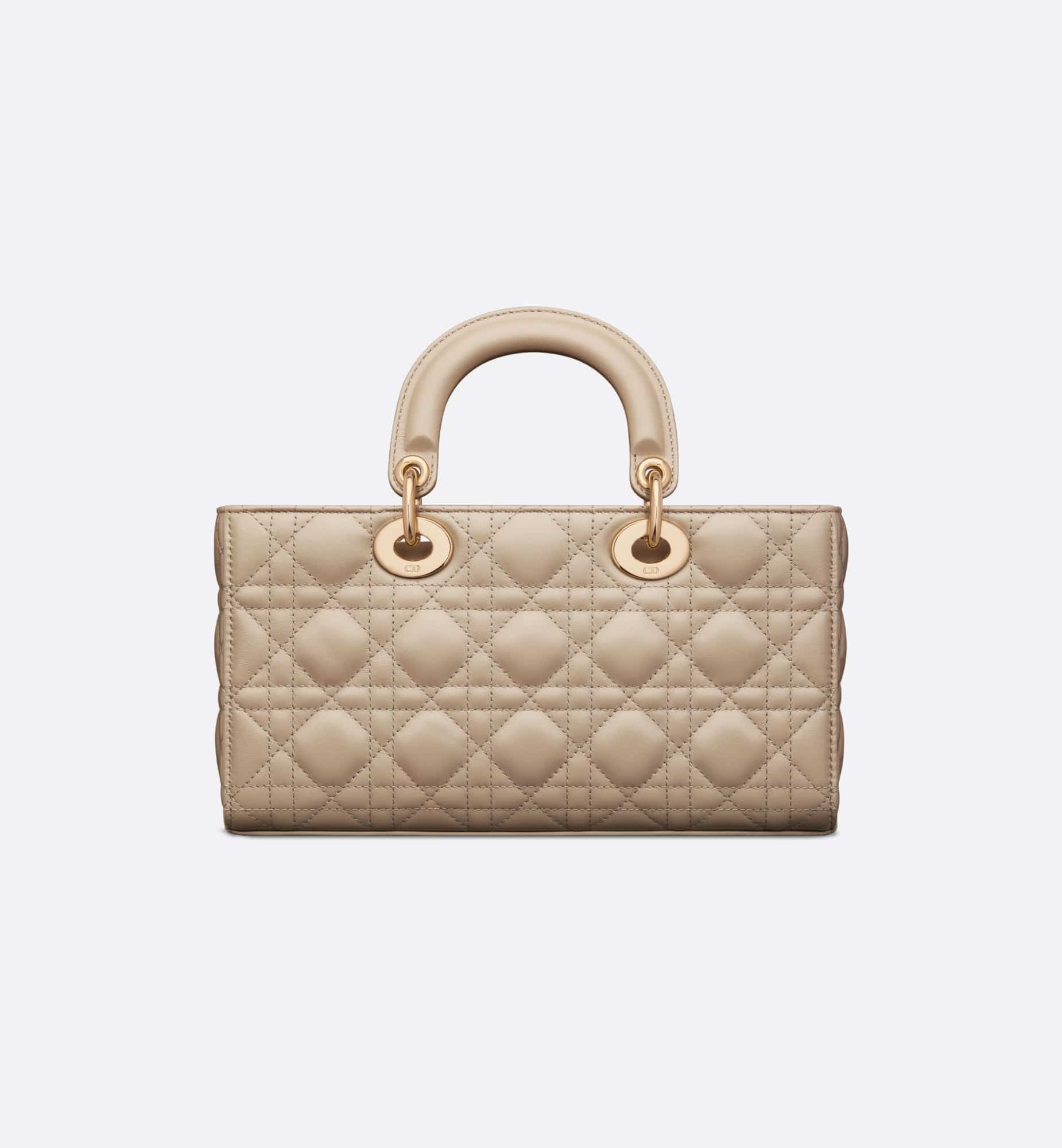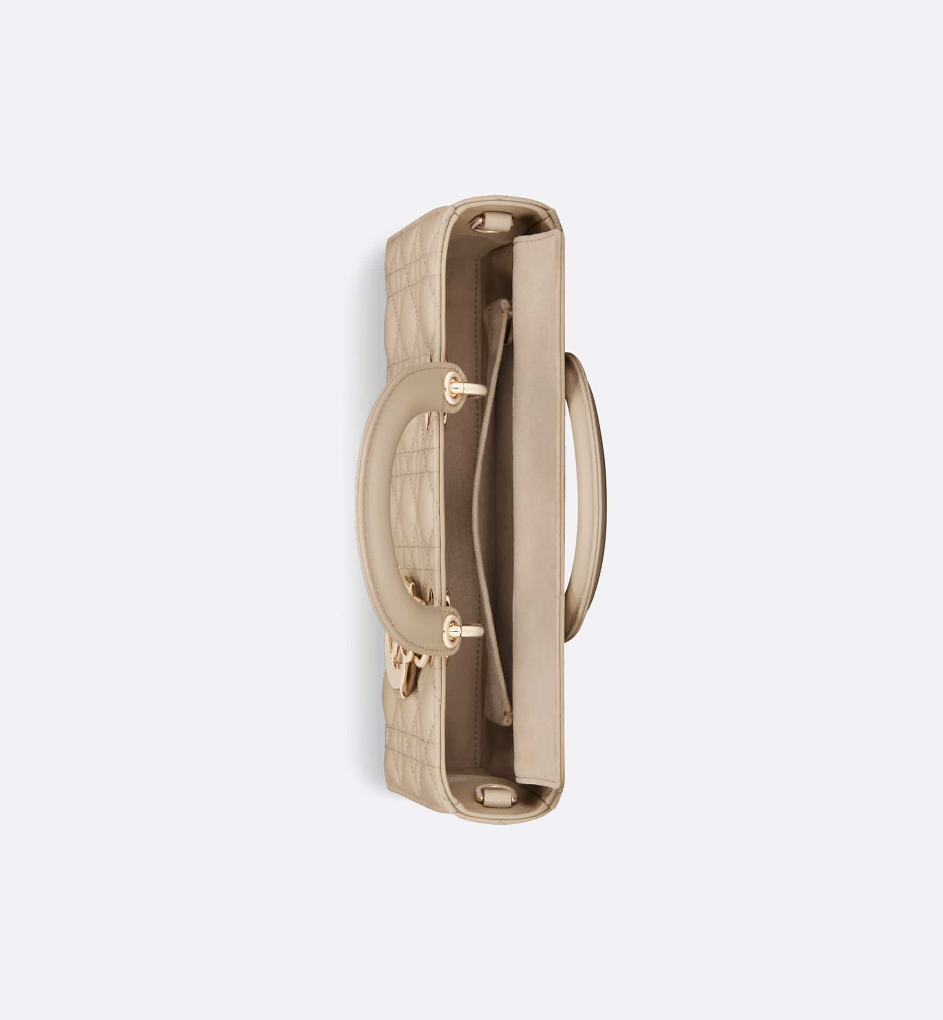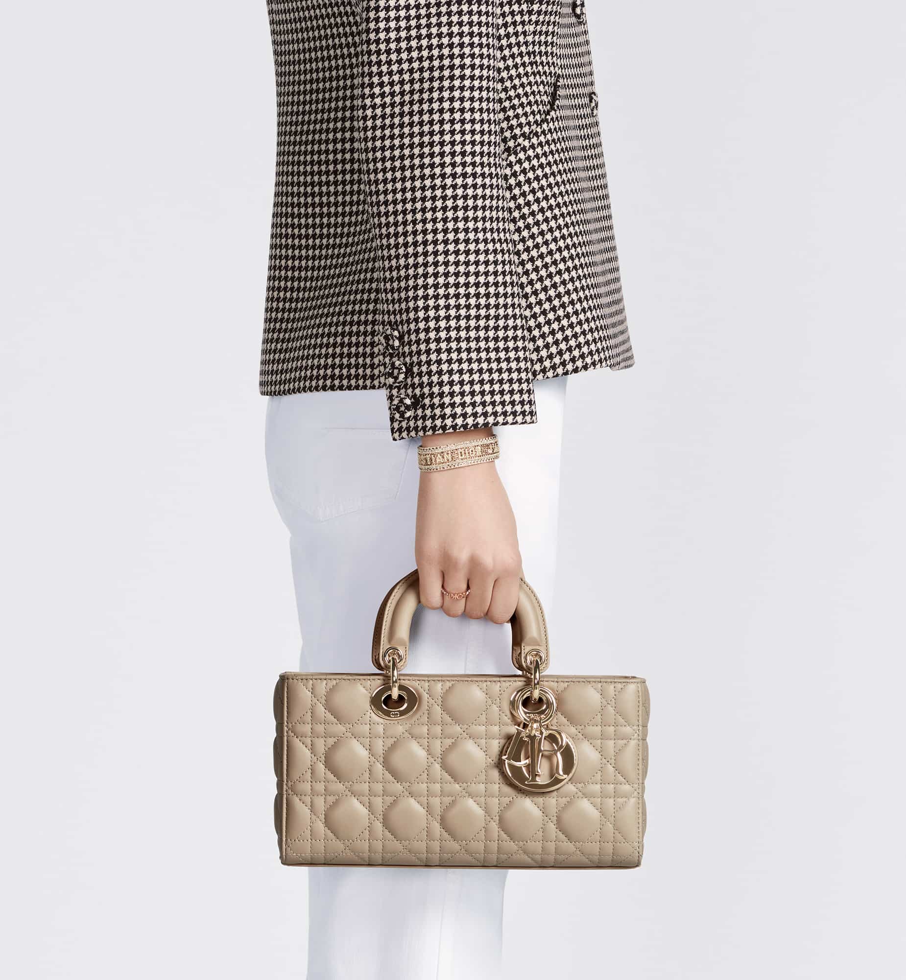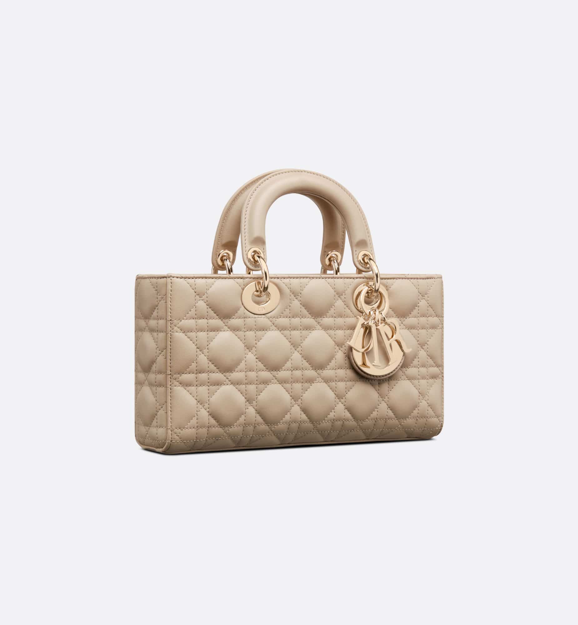 The Lady D-Joy bag captures the House’s vision of elegance and beauty. Refined and sleek, this timeless style showcases the iconic streamlined aesthetic of the Lady Dior line. Crafted in sand-colored lambskin with Cannage stitching, it is enhanced by pale gold-finish metal D.I.O.R. charms embellishing its silhouette. Featuring one removable chain shoulder strap and another adjustable and removable leather shoulder strap, the medium Lady D-Joy bag can be carried by hand or worn crossbody as a daily companion.