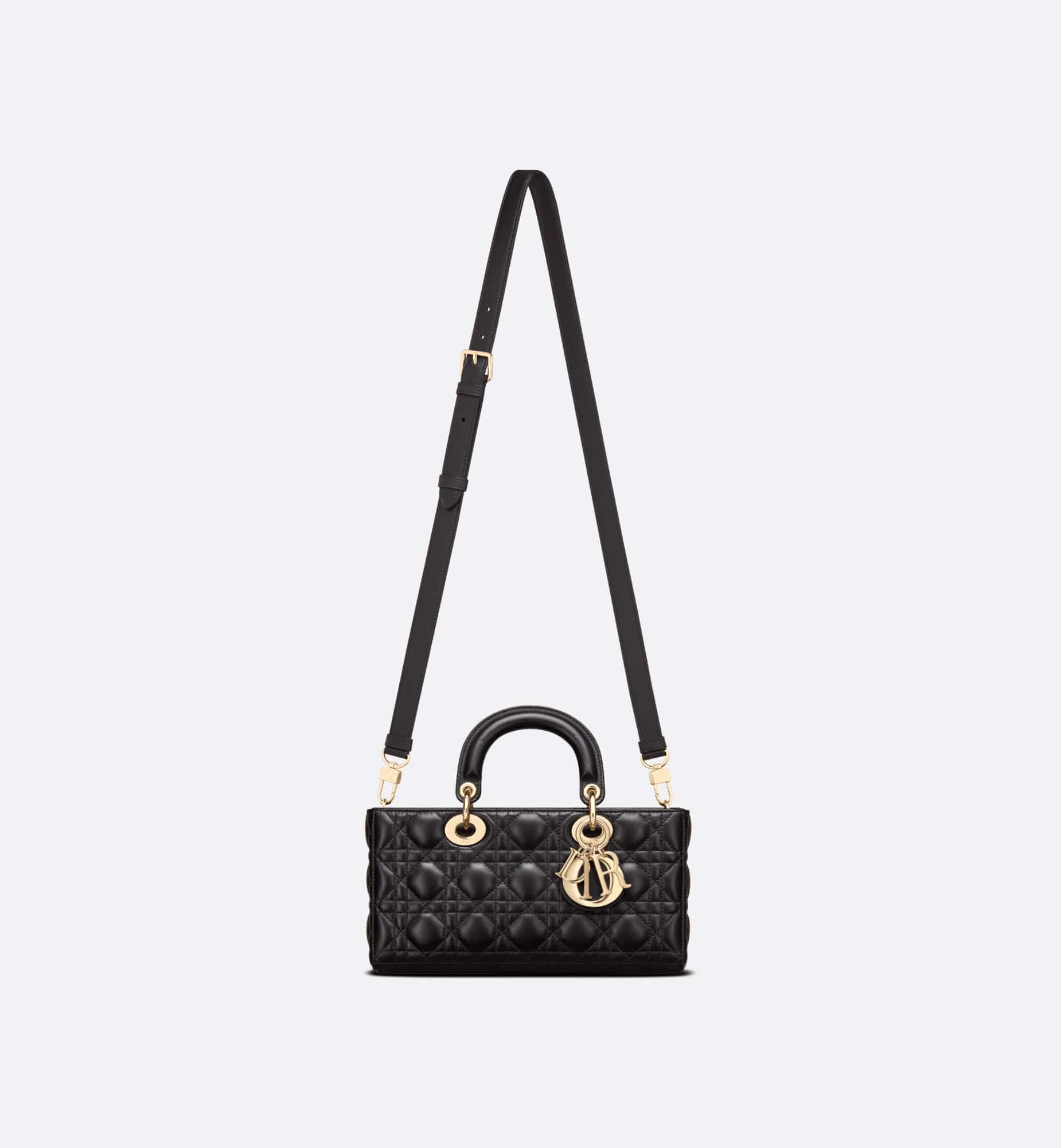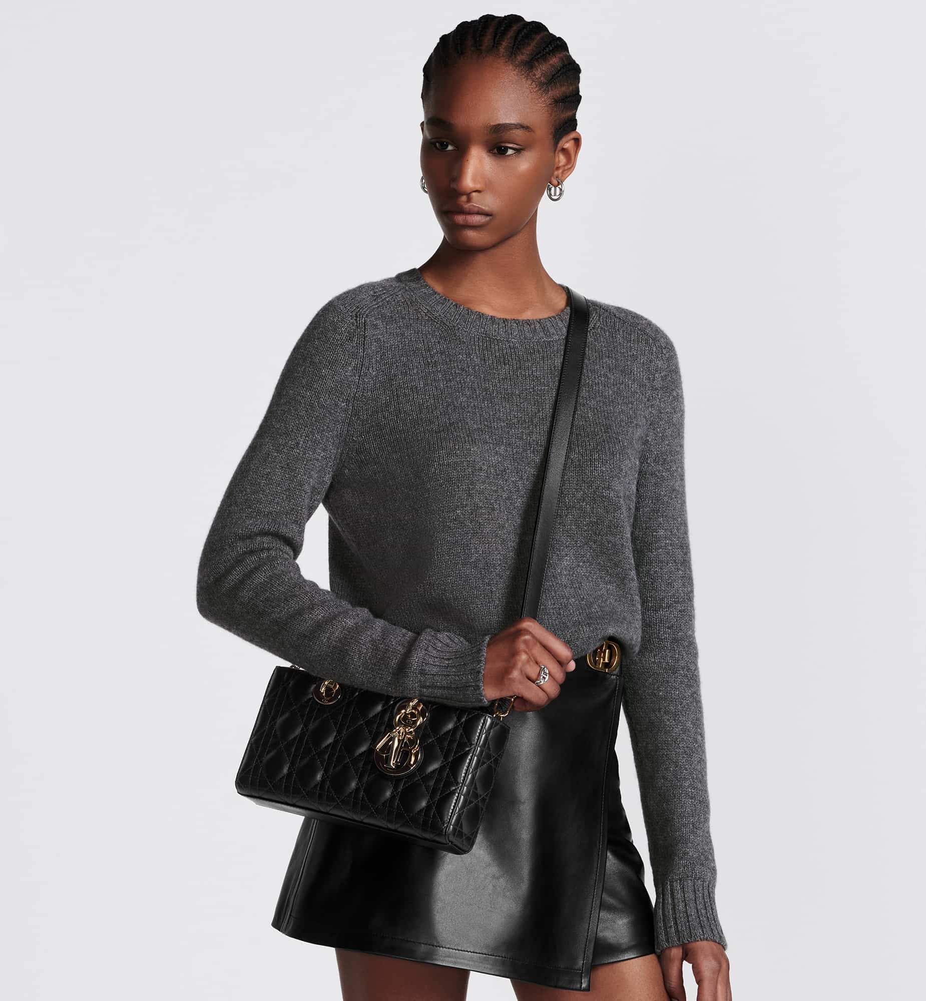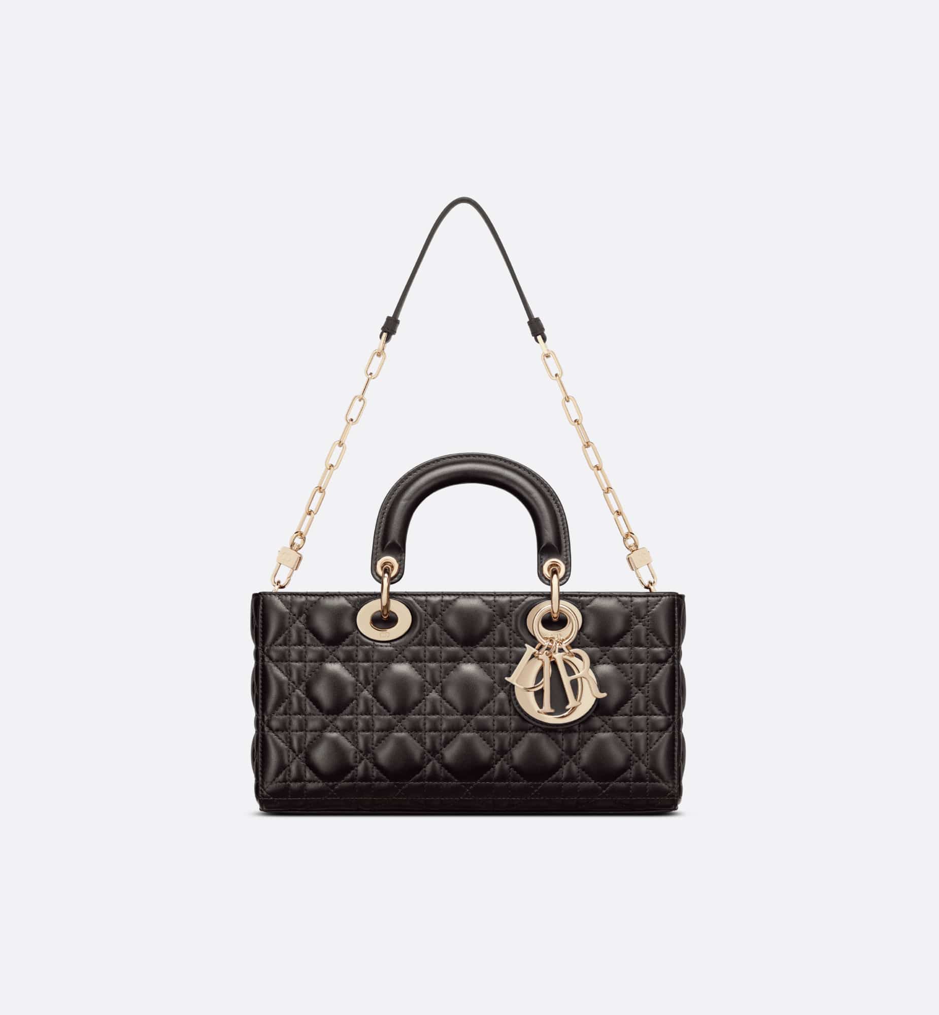 The Lady D-Joy bag captures the House’s vision of elegance and beauty. Refined and sleek, this timeless style showcases the iconic streamlined aesthetic of the Lady Dior line. Crafted in black lambskin with Cannage stitching, it is enhanced by pale gold-finish metal D.I.O.R. charms embellishing its silhouette. Featuring one removable chain shoulder strap and another adjustable and removable leather shoulder strap, the medium Lady D-Joy bag can be carried by hand or worn crossbody as a daily companion.