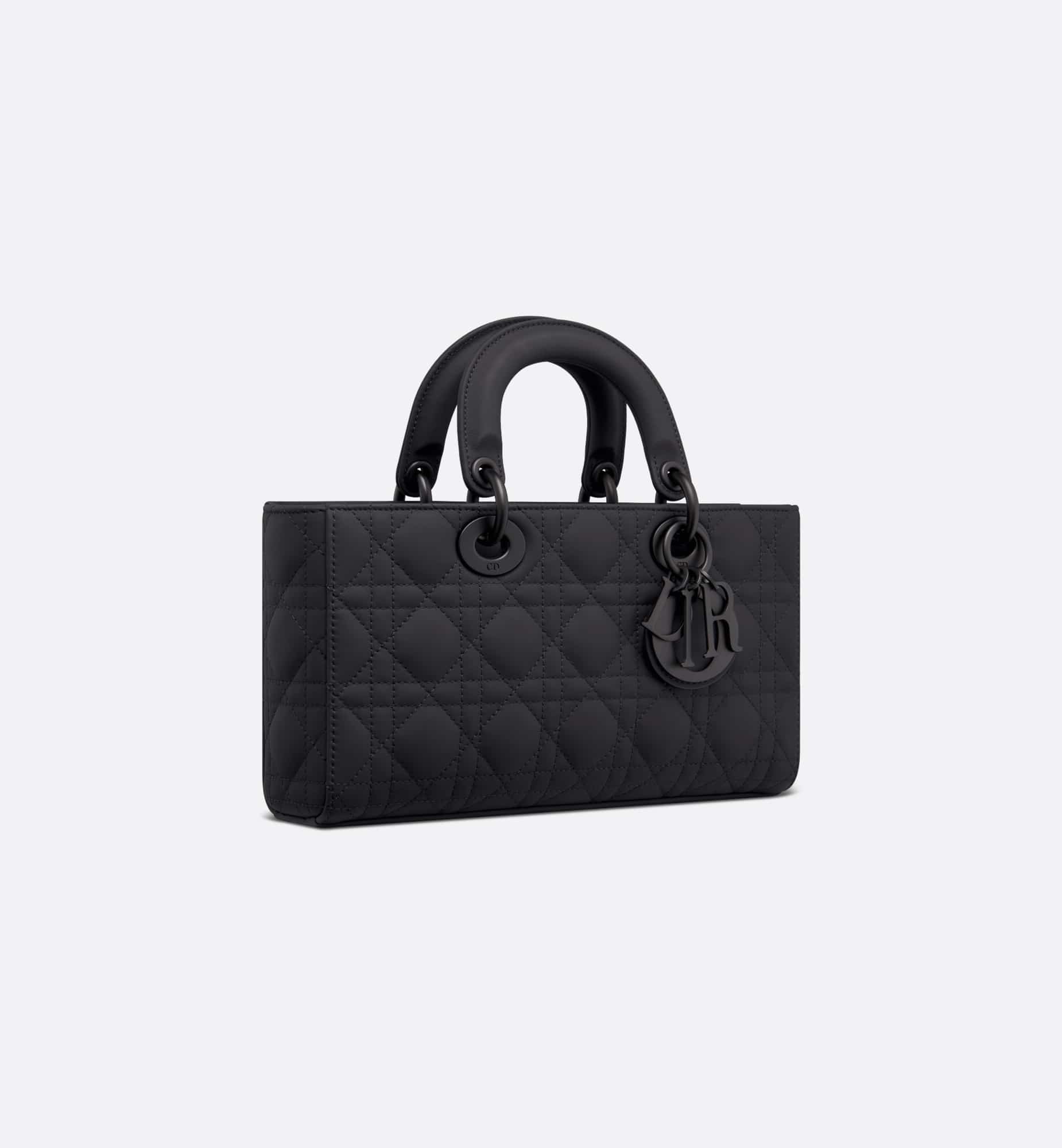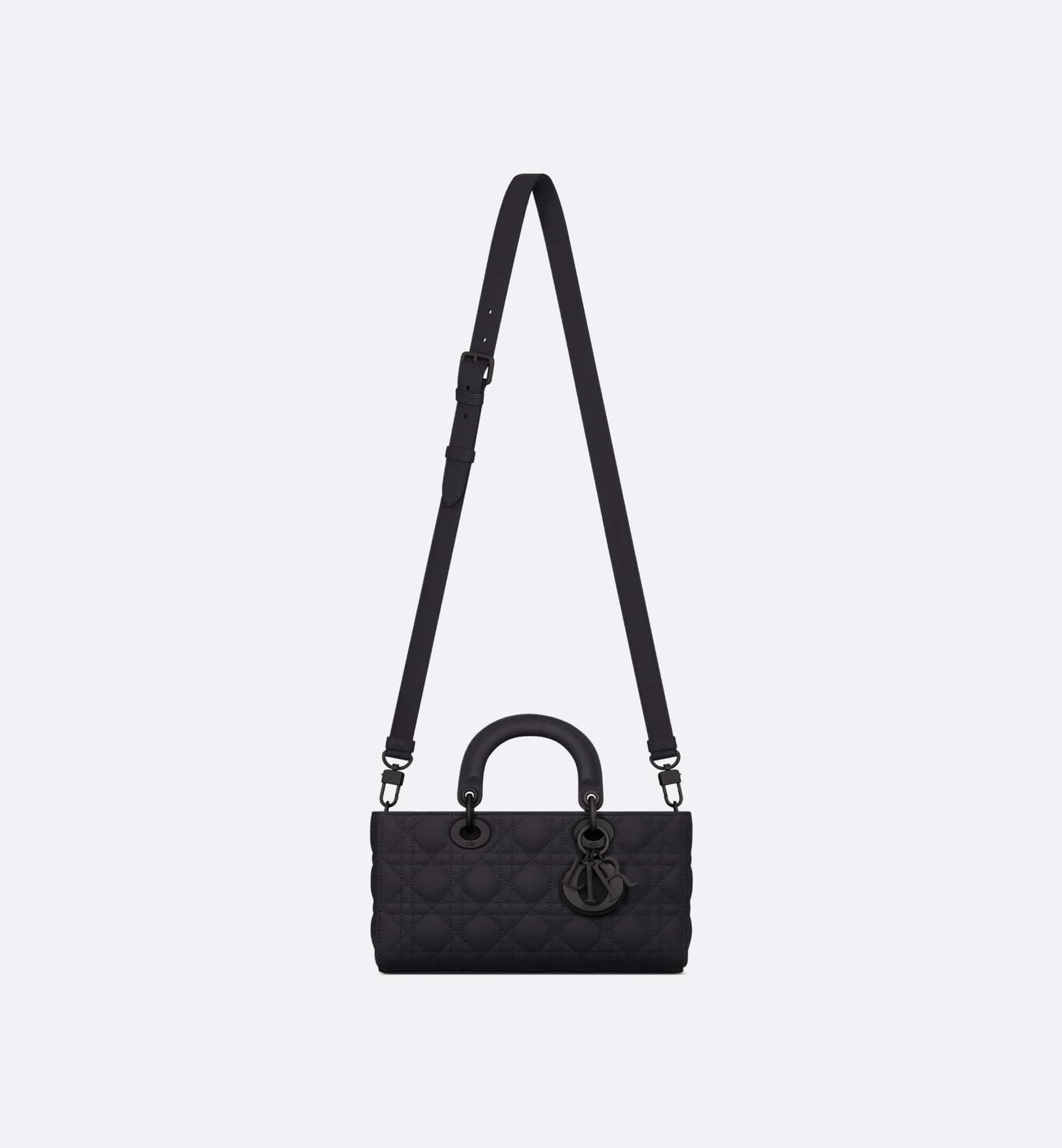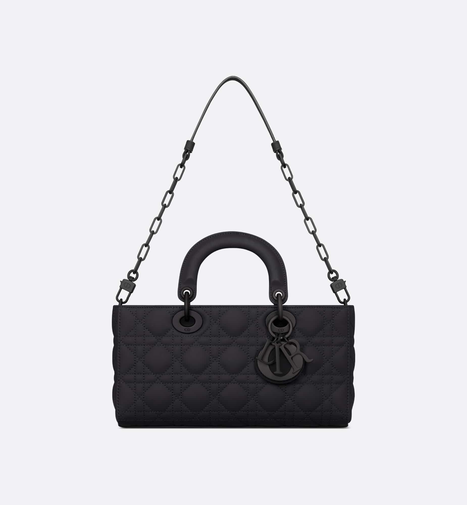 The Lady D-Joy bag captures the House’s vision of elegance and beauty by showcasing the iconic streamlined aesthetic of the Lady Dior line. Crafted in ultramatte black calfskin with Cannage stitching, the legendary quilted texture is immediately recognizable. The style is enhanced by tonal metal D.I.O.R. charms that add an elegant touch. Featuring one removable chain strap and another adjustable and removable leather strap, the medium Lady D-Joy bag can be carried by hand, worn over the shoulder or crossbody as a daily companion.