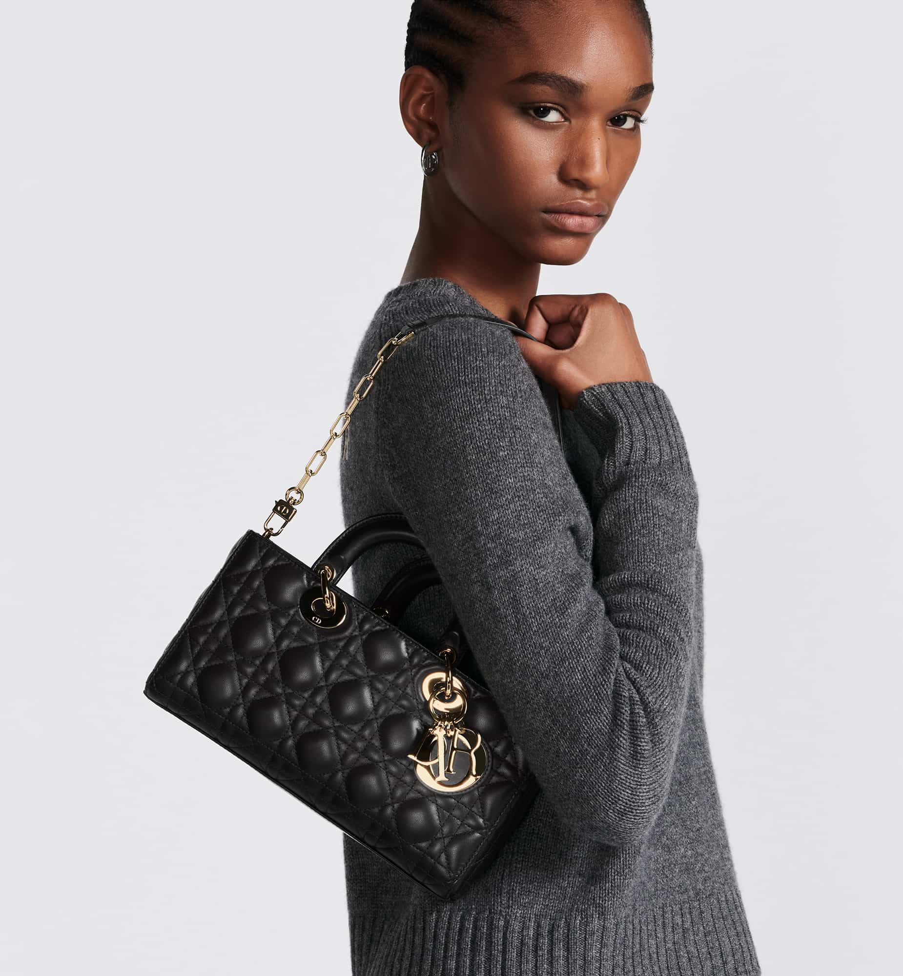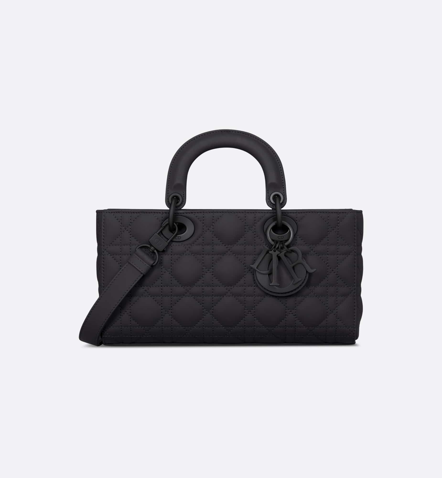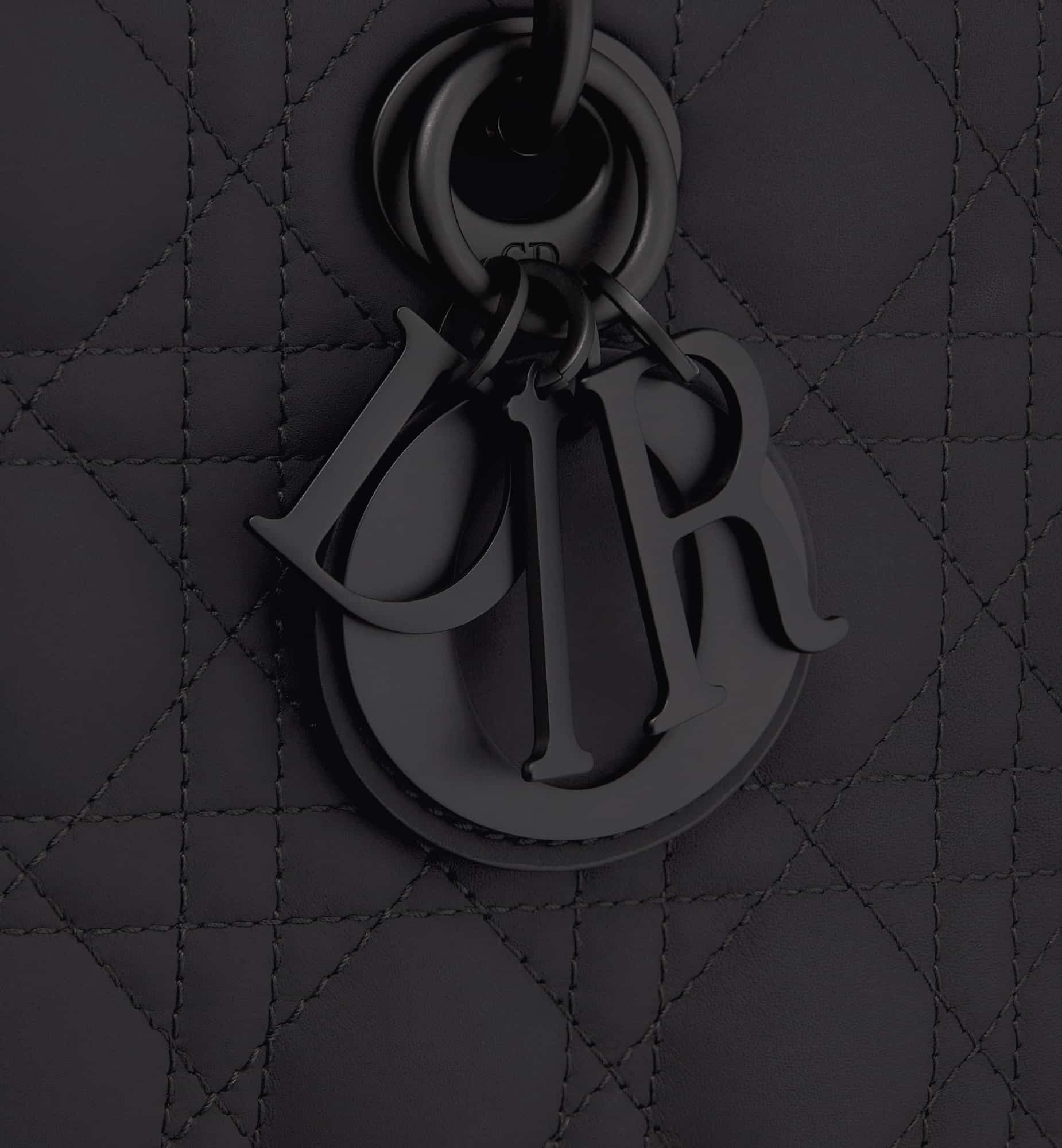 The Lady D-Joy bag captures the House’s vision of elegance and beauty by showcasing the iconic streamlined aesthetic of the Lady Dior line. Crafted in ultramatte black calfskin with Cannage stitching, the legendary quilted texture is immediately recognizable. The style is enhanced by tonal metal D.I.O.R. charms that add an elegant touch. Featuring one removable chain strap and another adjustable and removable leather strap, the medium Lady D-Joy bag can be carried by hand, worn over the shoulder or crossbody as a daily companion.