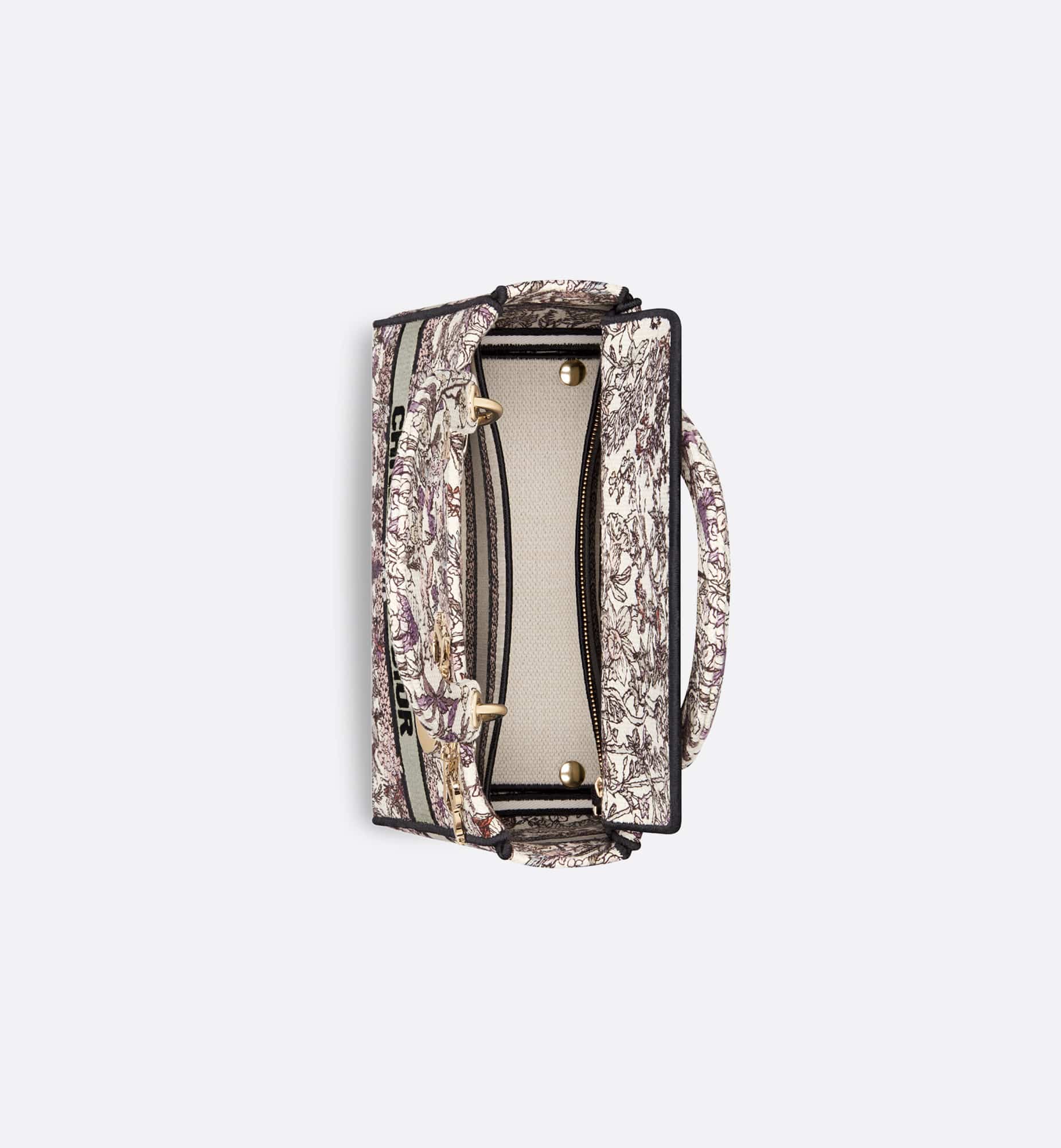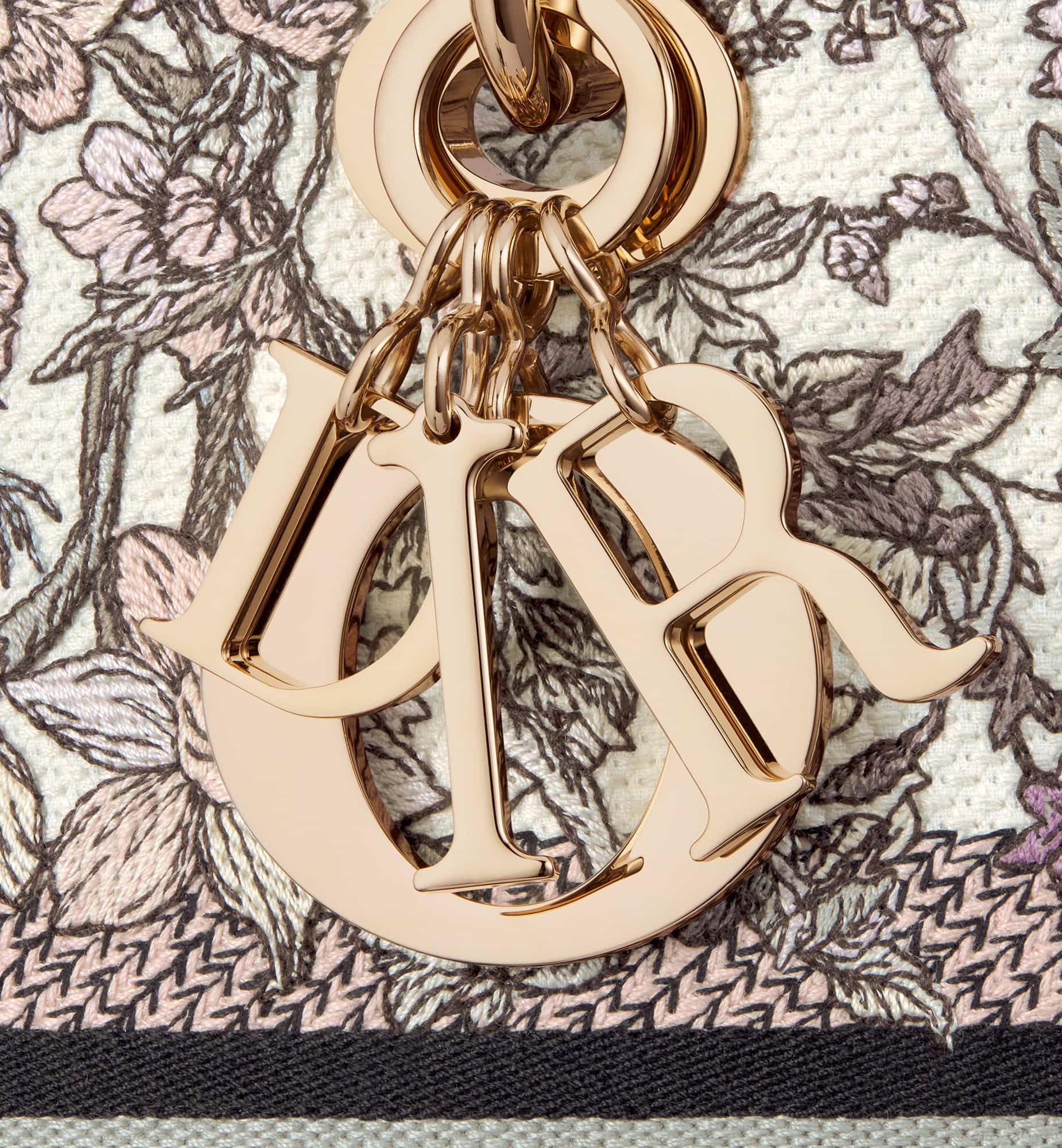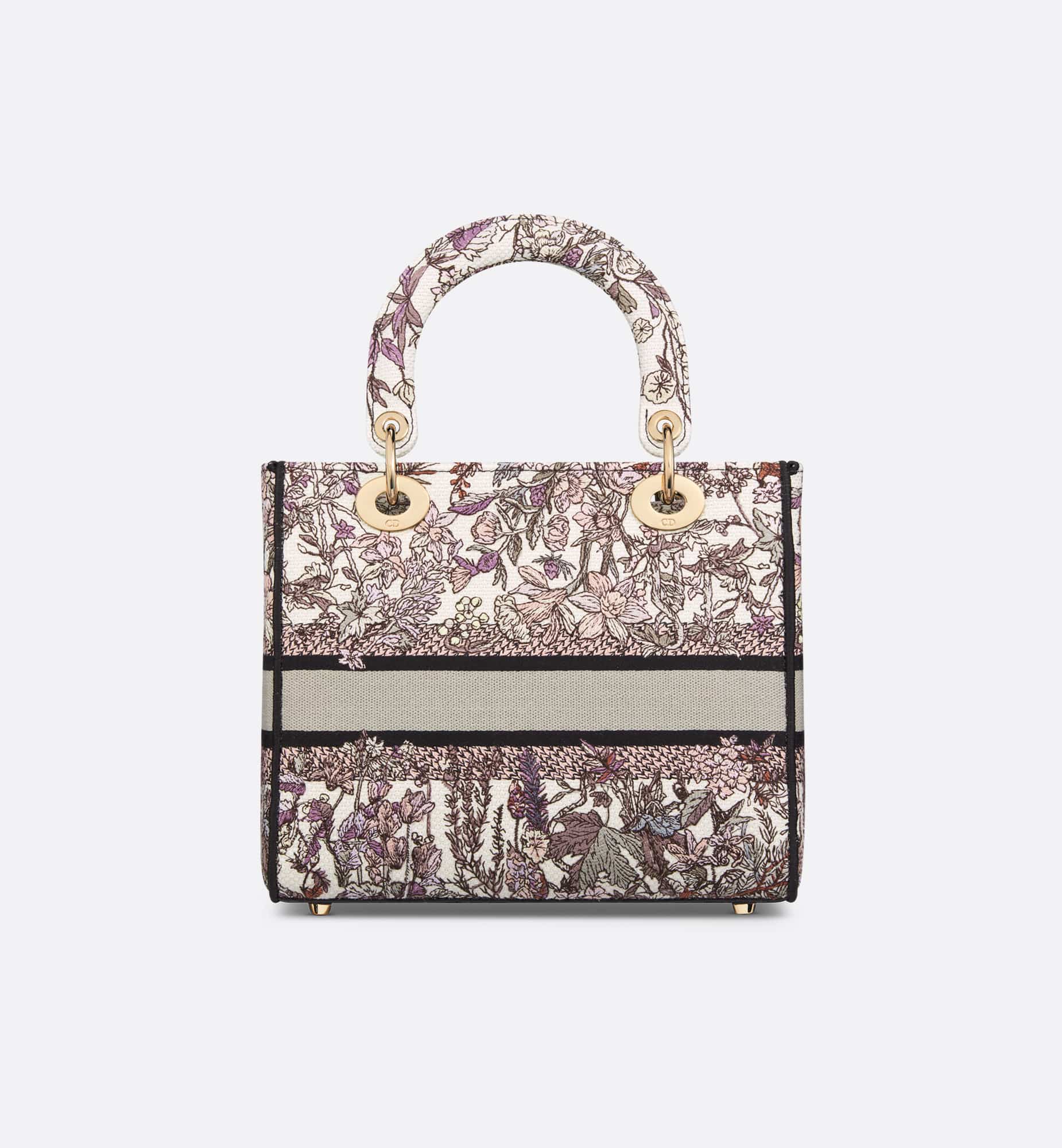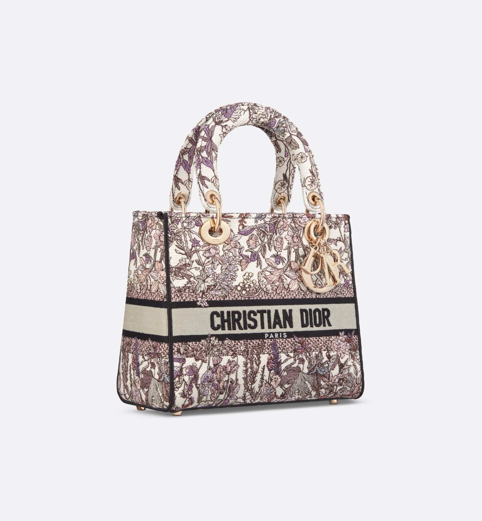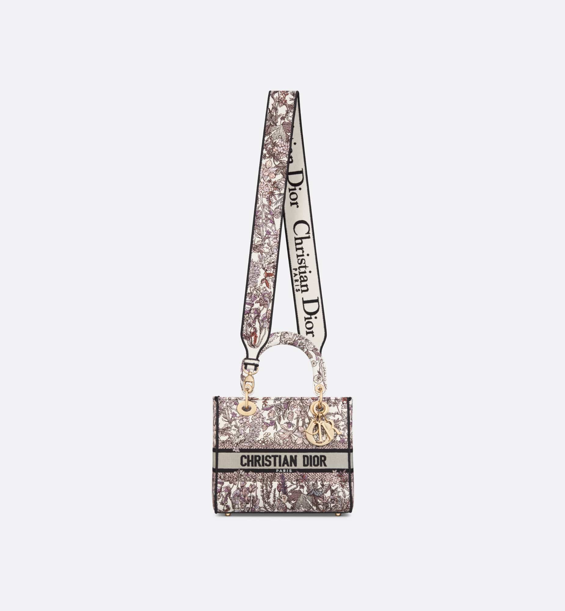 The Lady D-Lite bag combines classic elegance with House modernity. Fully embroidered, it features the white multicolor Dior 4 Saisons Hiver motif by Pietro Ruffo, showcasing wintry flowers and plants in a bucolic design. Pale gold-finish metal D.I.O.R. charms embellish and illuminate the silhouette. Equipped with a wide, removable embroidered shoulder strap, the medium Lady D-Lite bag can be carried by hand or worn crossbody.