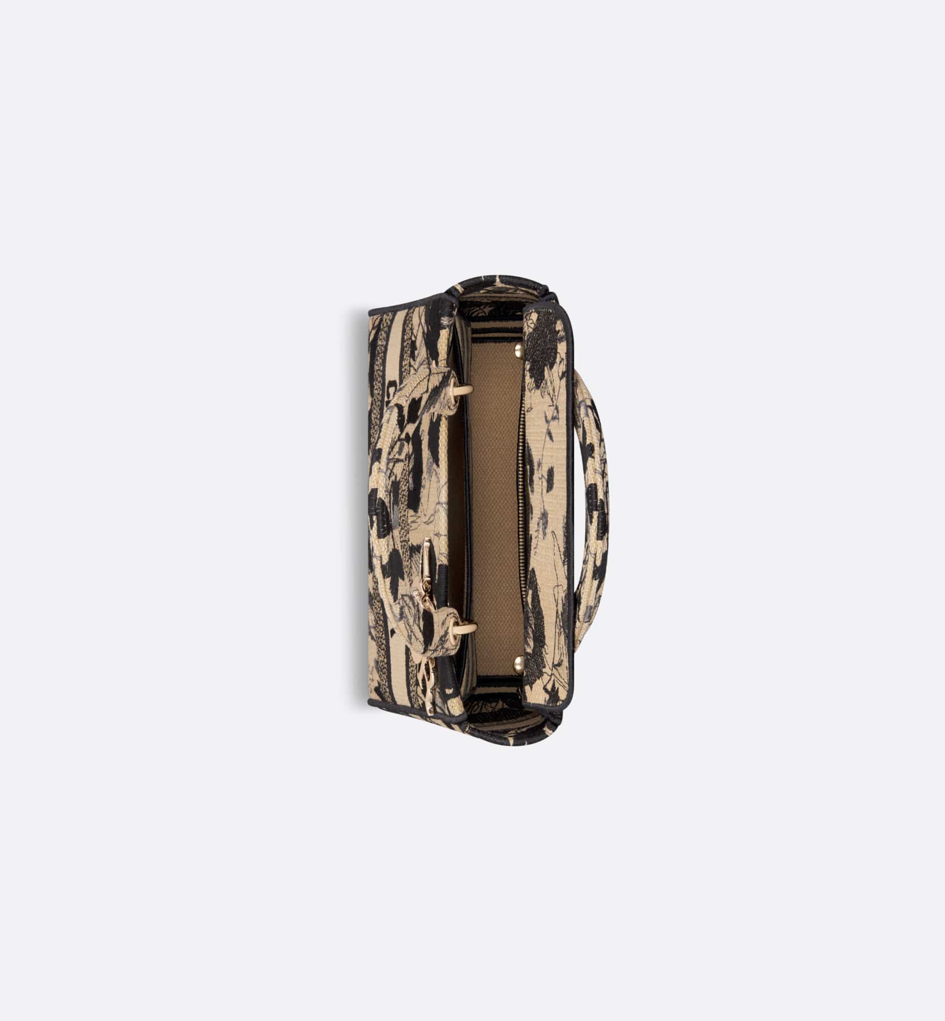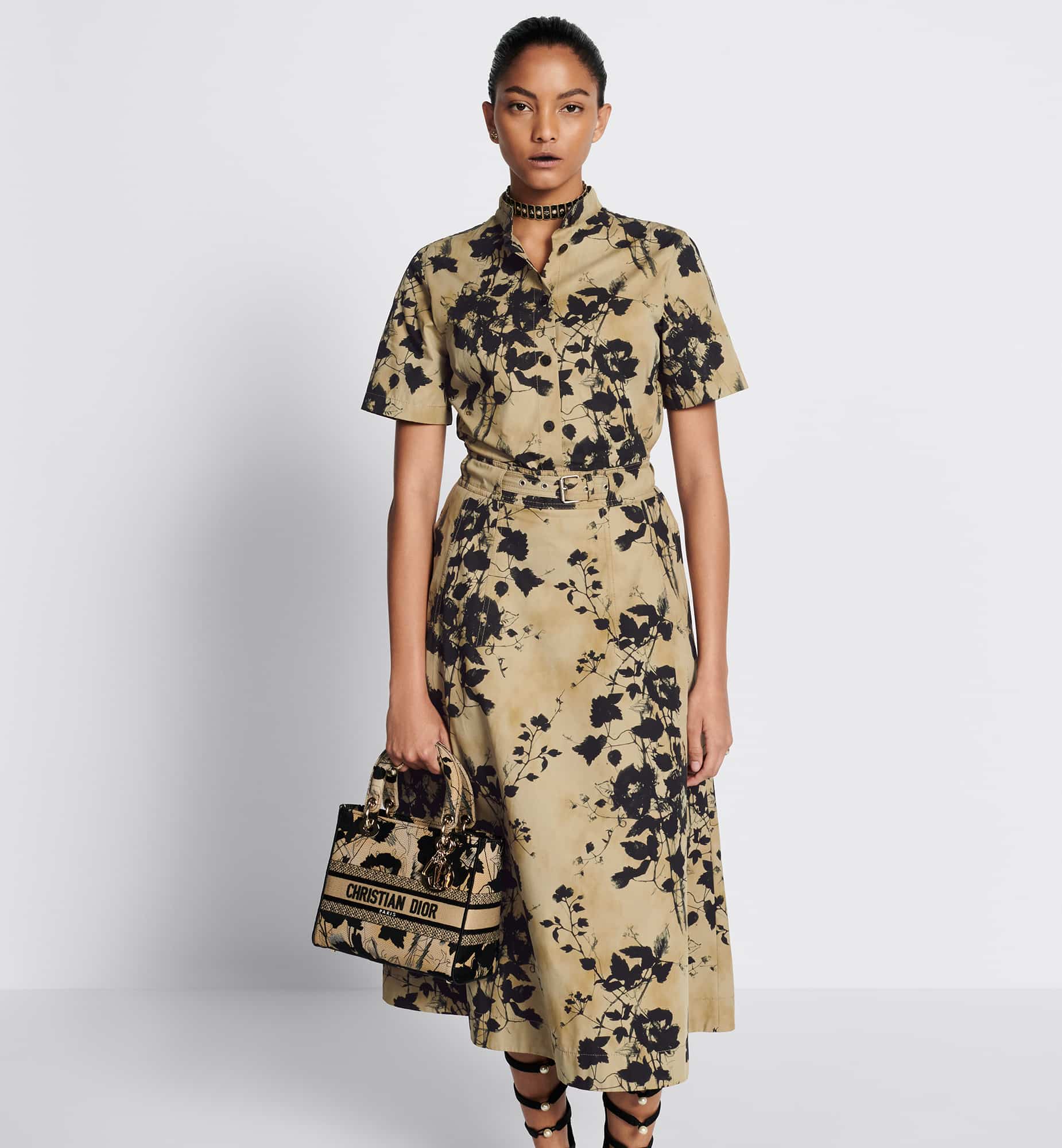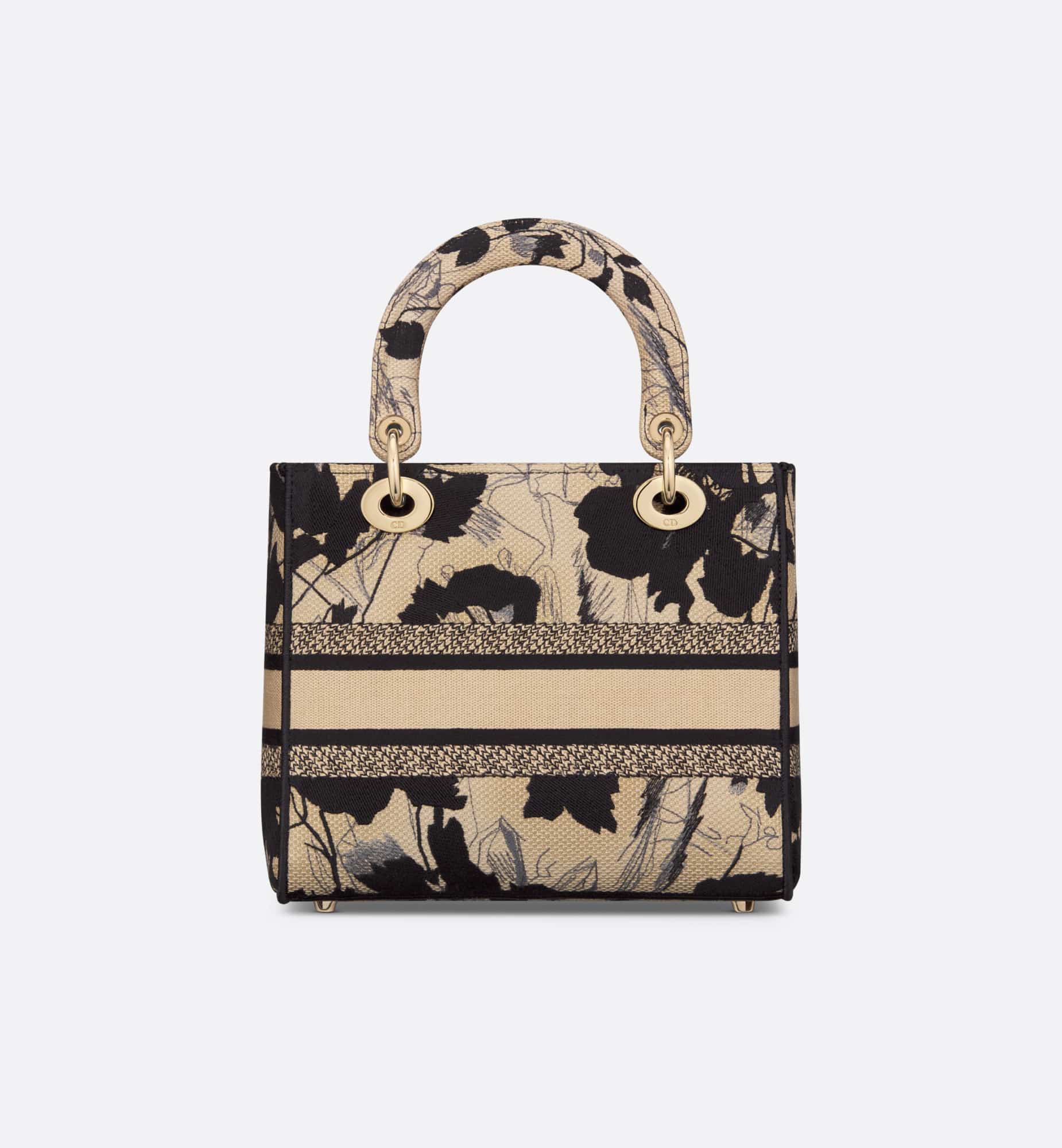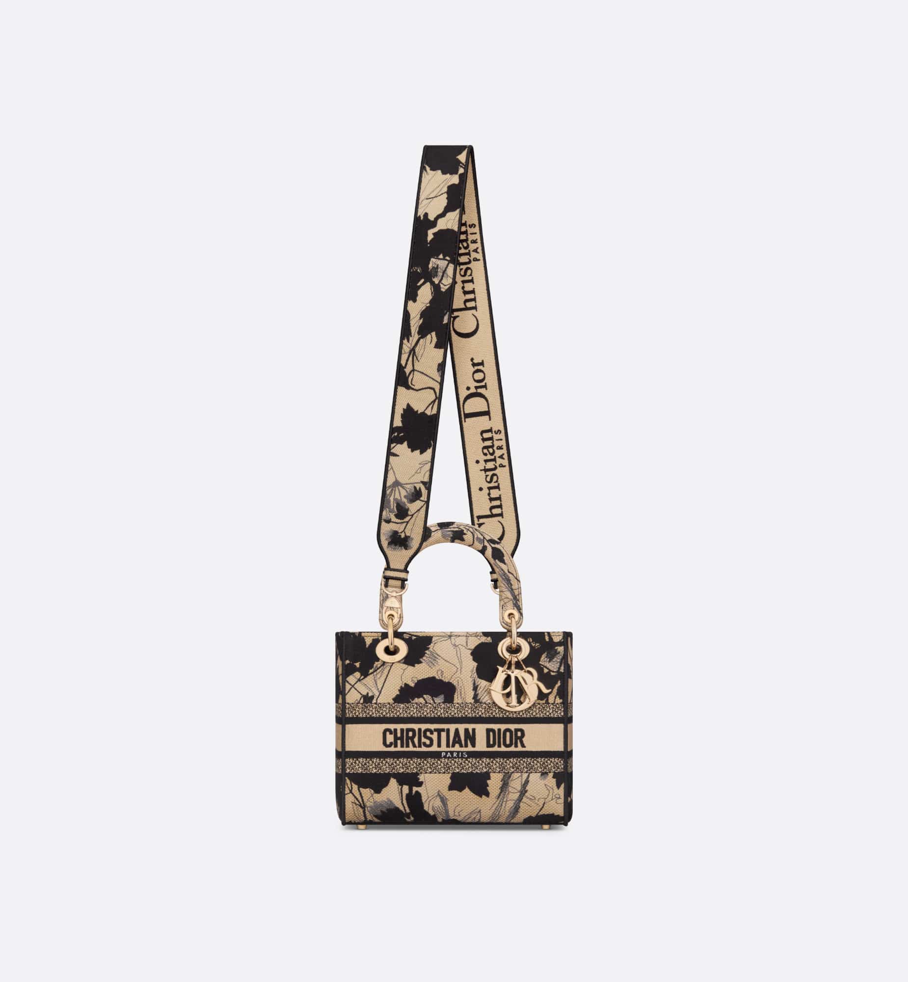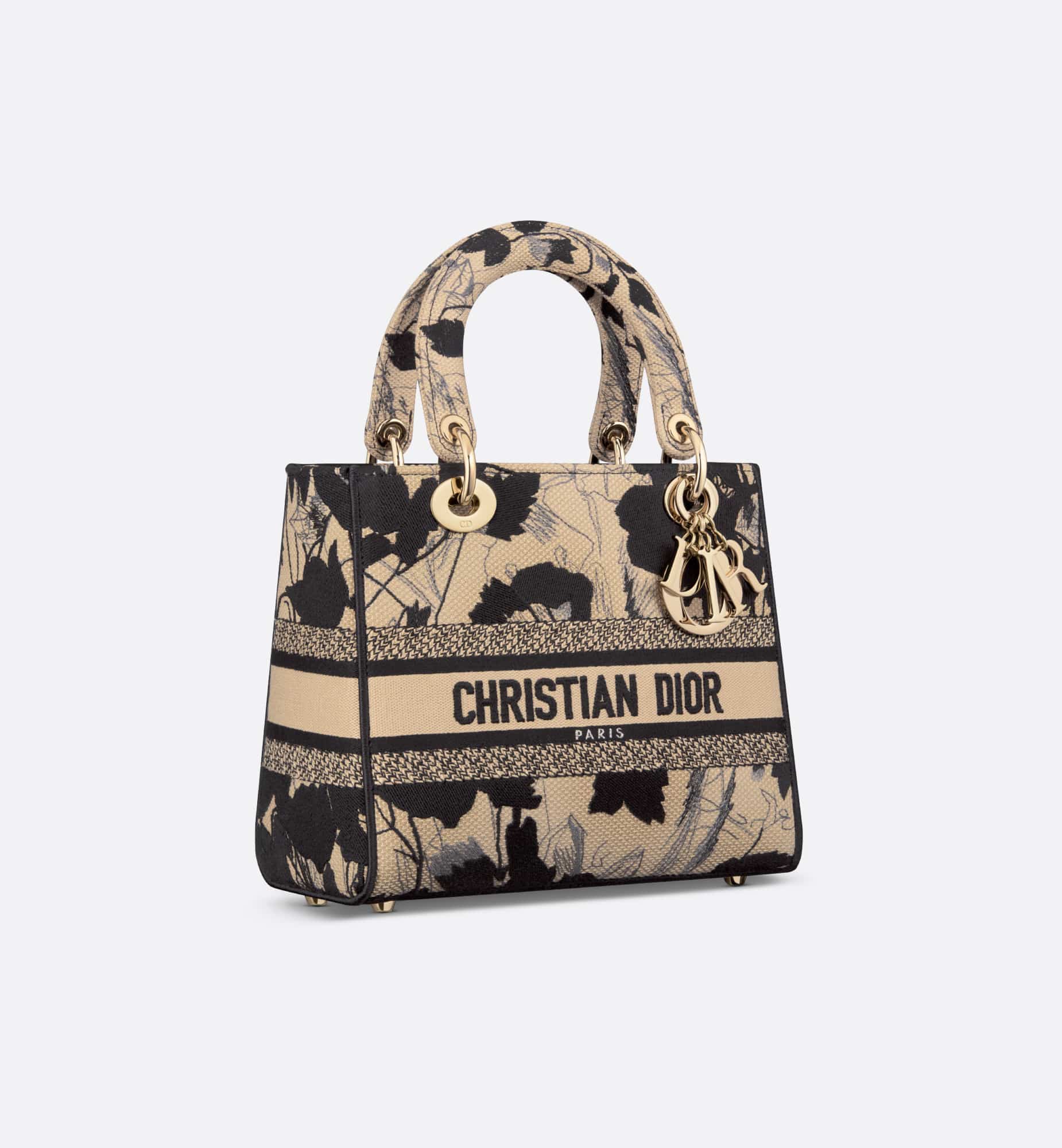 The Lady D-Lite bag embodies the House’s classic elegance and modernity. The style is fully embroidered with the Fleurs Mystiques motif in beige and black, a hypnotic and poetic floral motif, while pale gold-finish metal D.I.O.R. charms embellish and illuminate the silhouette. Featuring a wide, removable embroidered shoulder strap, the medium Lady D-Lite bag can be carried by hand or worn crossbody.