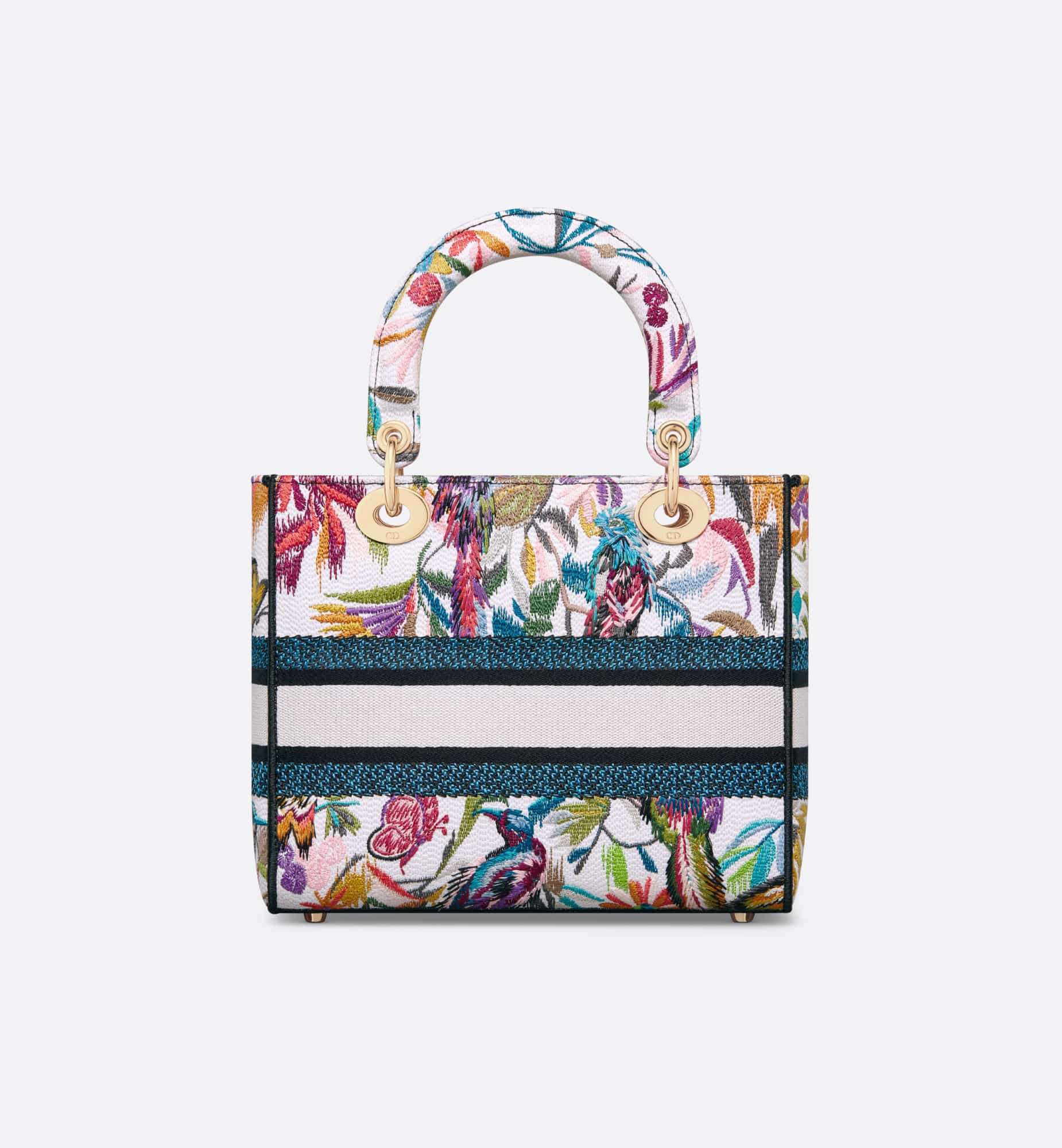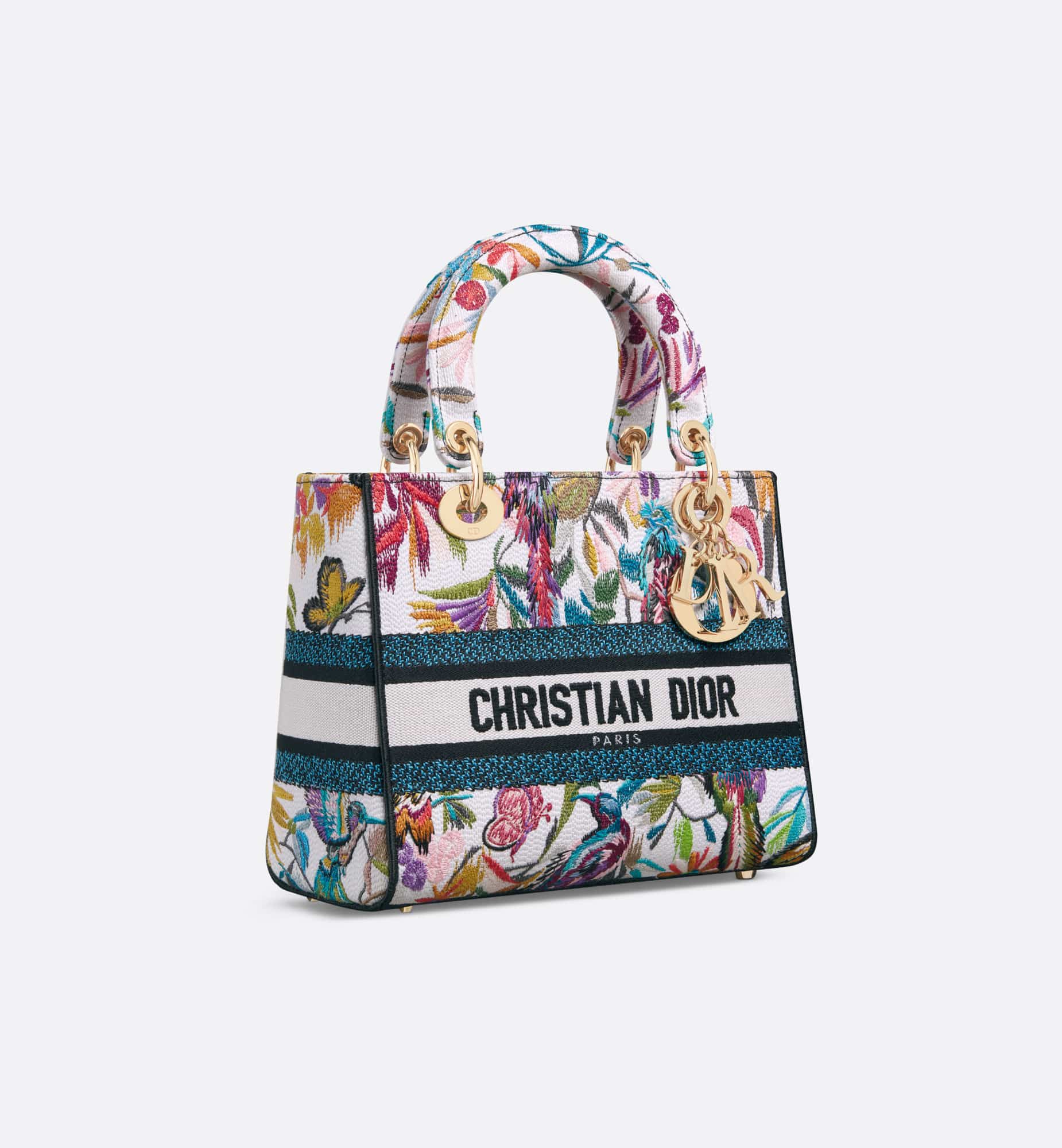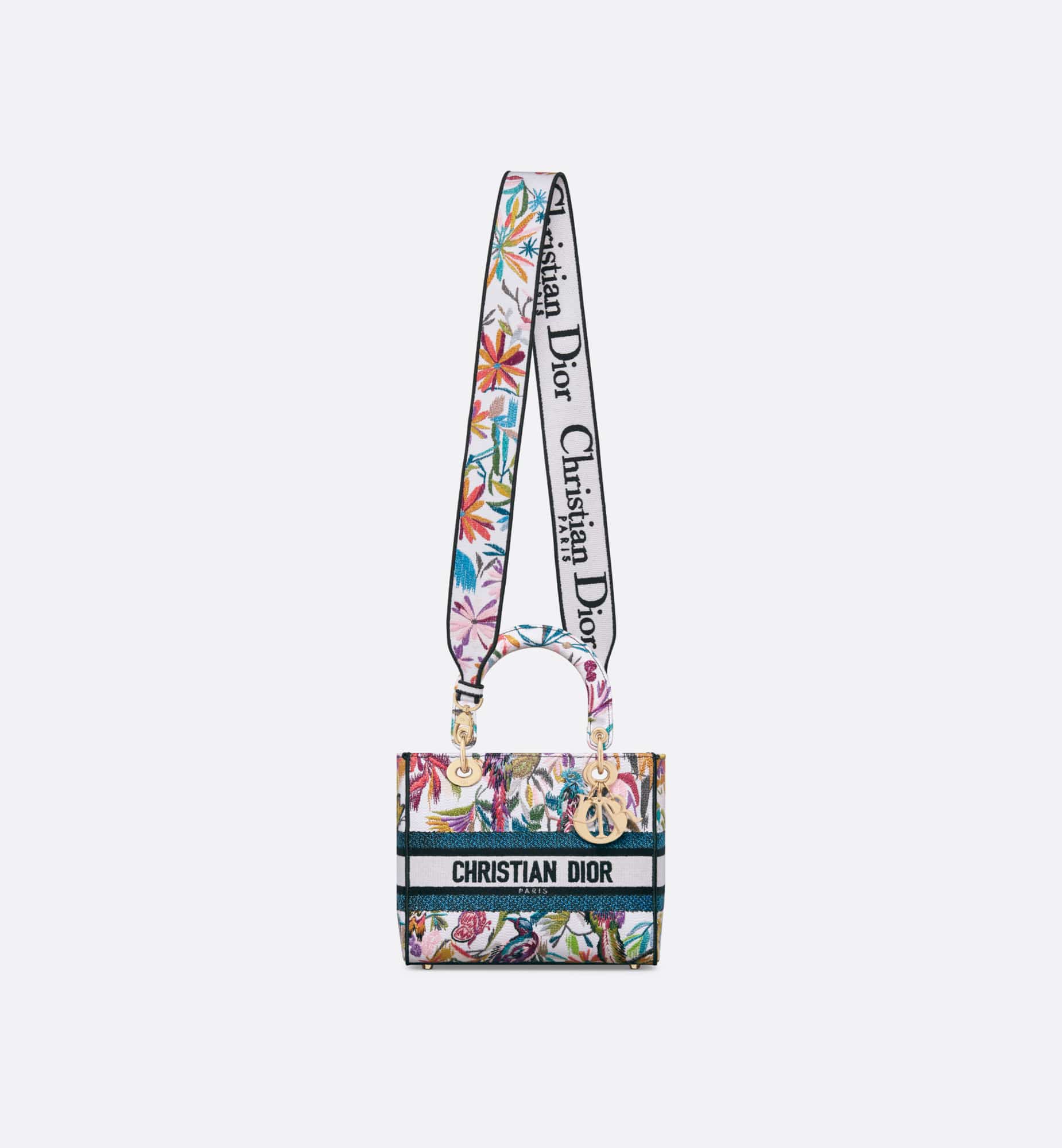 The Lady D-Lite bag combines classic elegance with House modernity. The style is fully embroidered with a white multicolor Toile de Jouy Fantastica motif, a modern interpretation of the iconic pattern that showcases a colorful jungle full of parrots, monkeys and butterflies in pop colors. A Christian Dior Paris signature adorns the front, while D.I.O.R. charms in pale gold-finish metal further enhance and highlight the silhouette. Featuring a wide, removable embroidered shoulder strap, the medium Lady D-Lite bag can be carried by hand or worn crossbody.