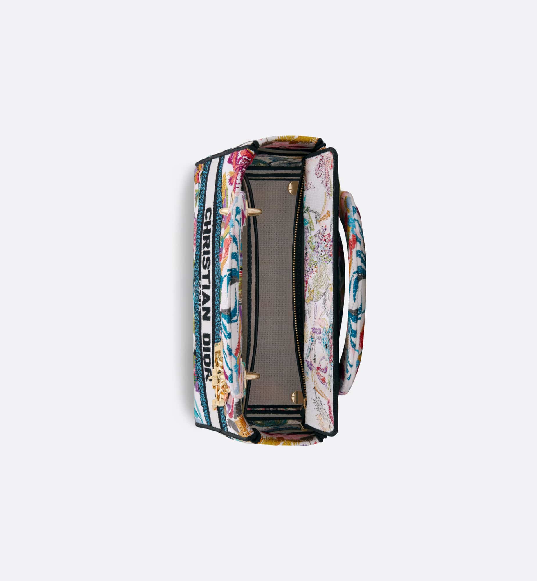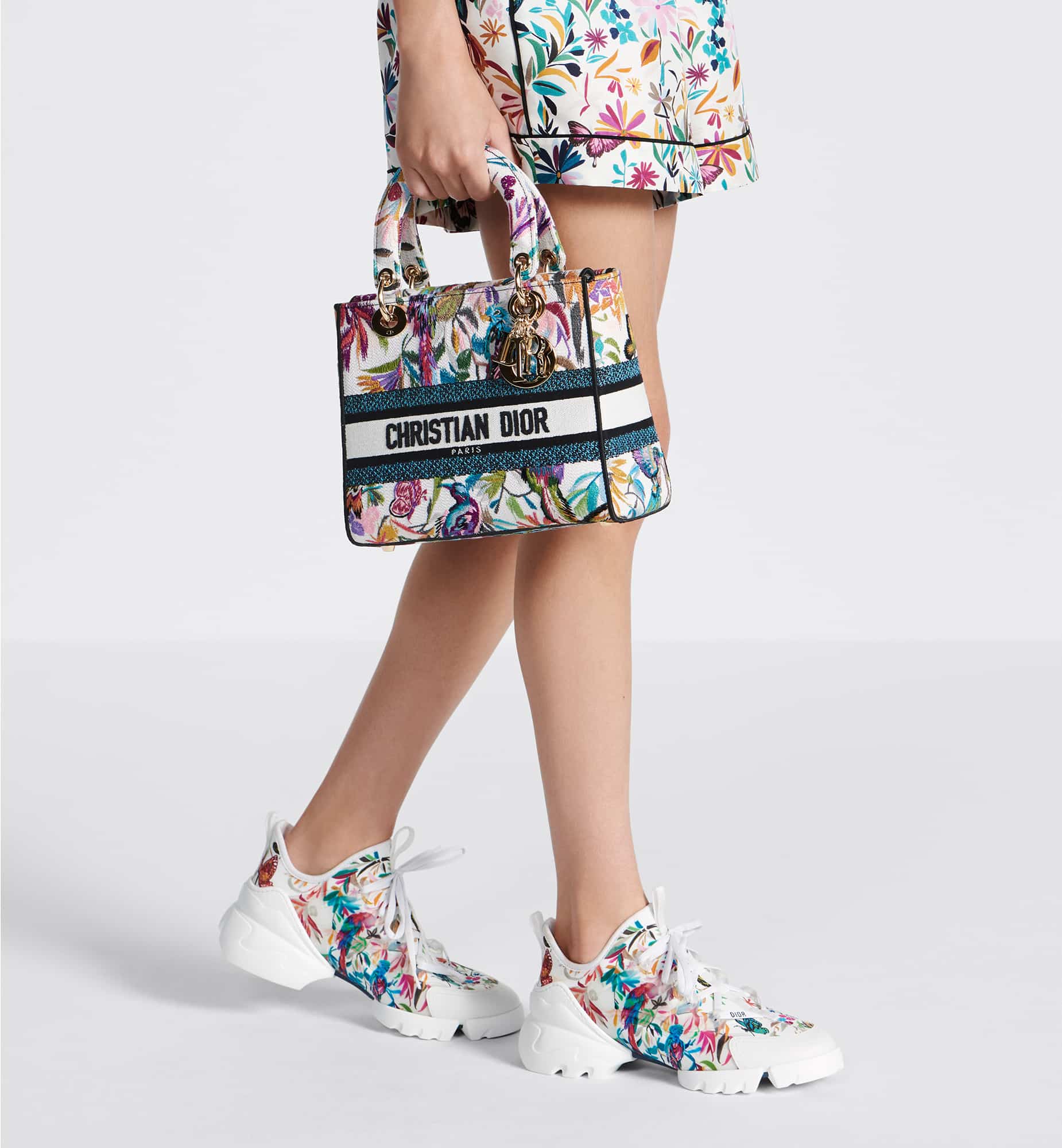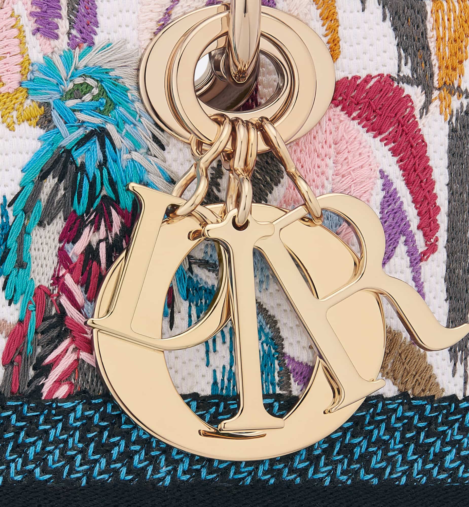 The Lady D-Lite bag combines classic elegance with House modernity. The style is fully embroidered with a white multicolor Toile de Jouy Fantastica motif, a modern interpretation of the iconic pattern that showcases a colorful jungle full of parrots, monkeys and butterflies in pop colors. A Christian Dior Paris signature adorns the front, while D.I.O.R. charms in pale gold-finish metal further enhance and highlight the silhouette. Featuring a wide, removable embroidered shoulder strap, the medium Lady D-Lite bag can be carried by hand or worn crossbody.