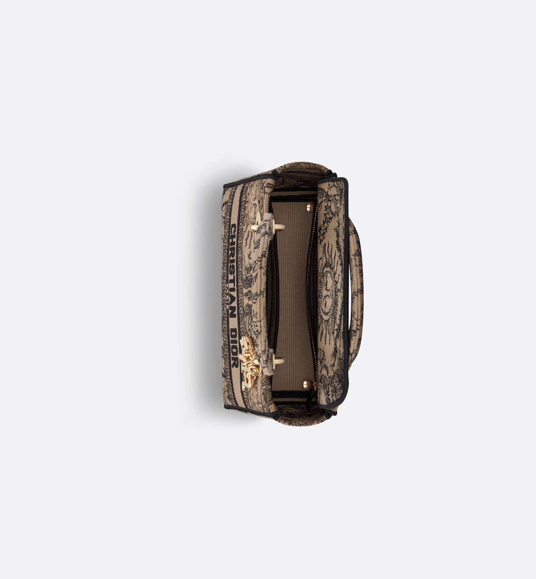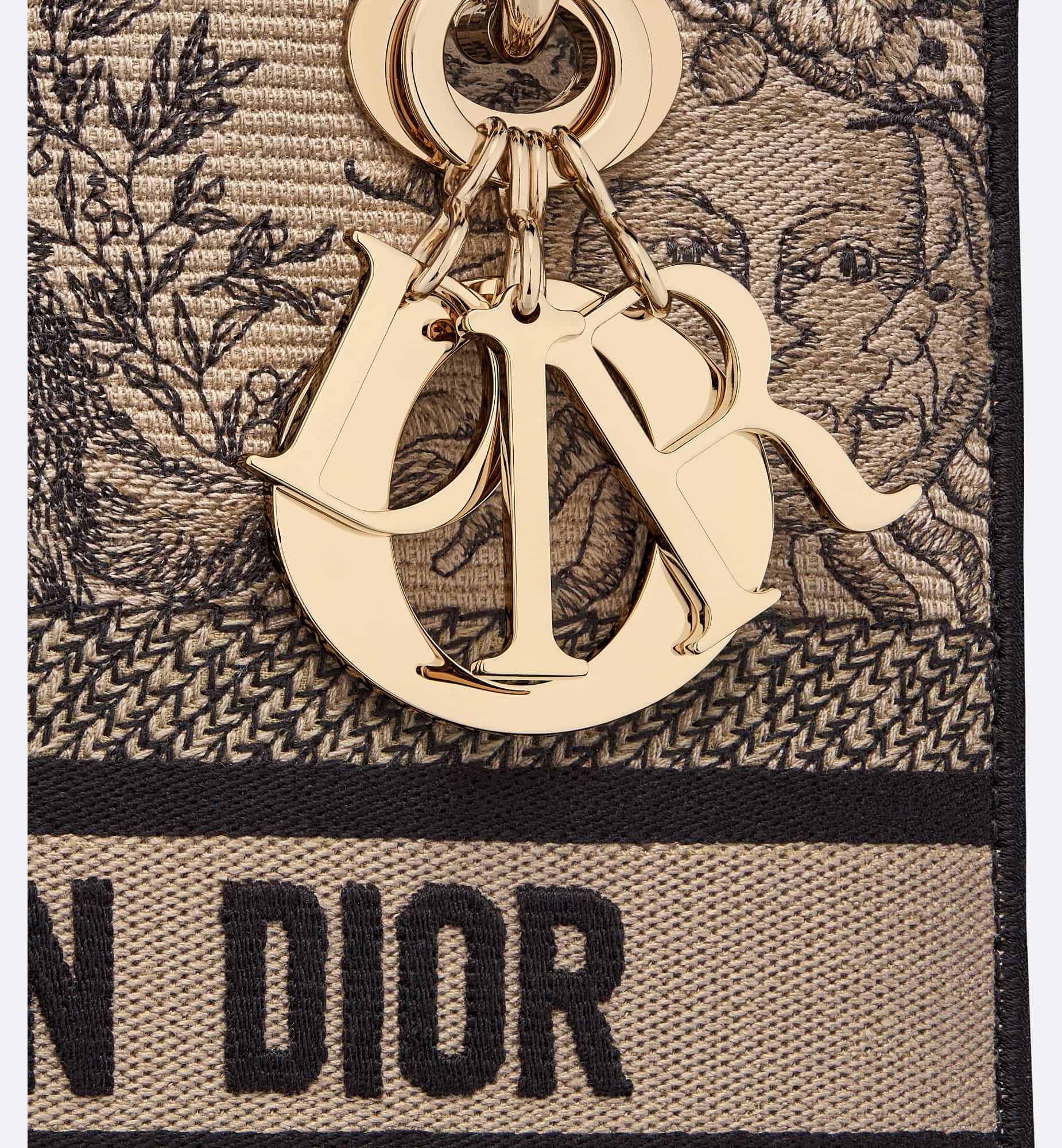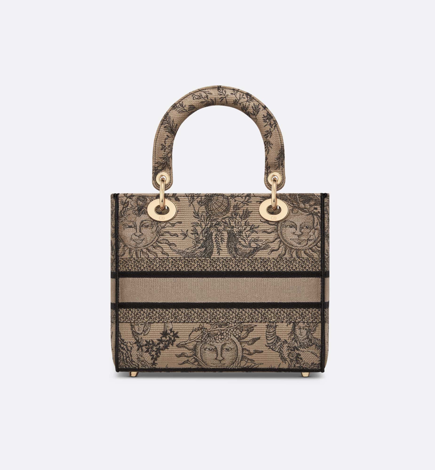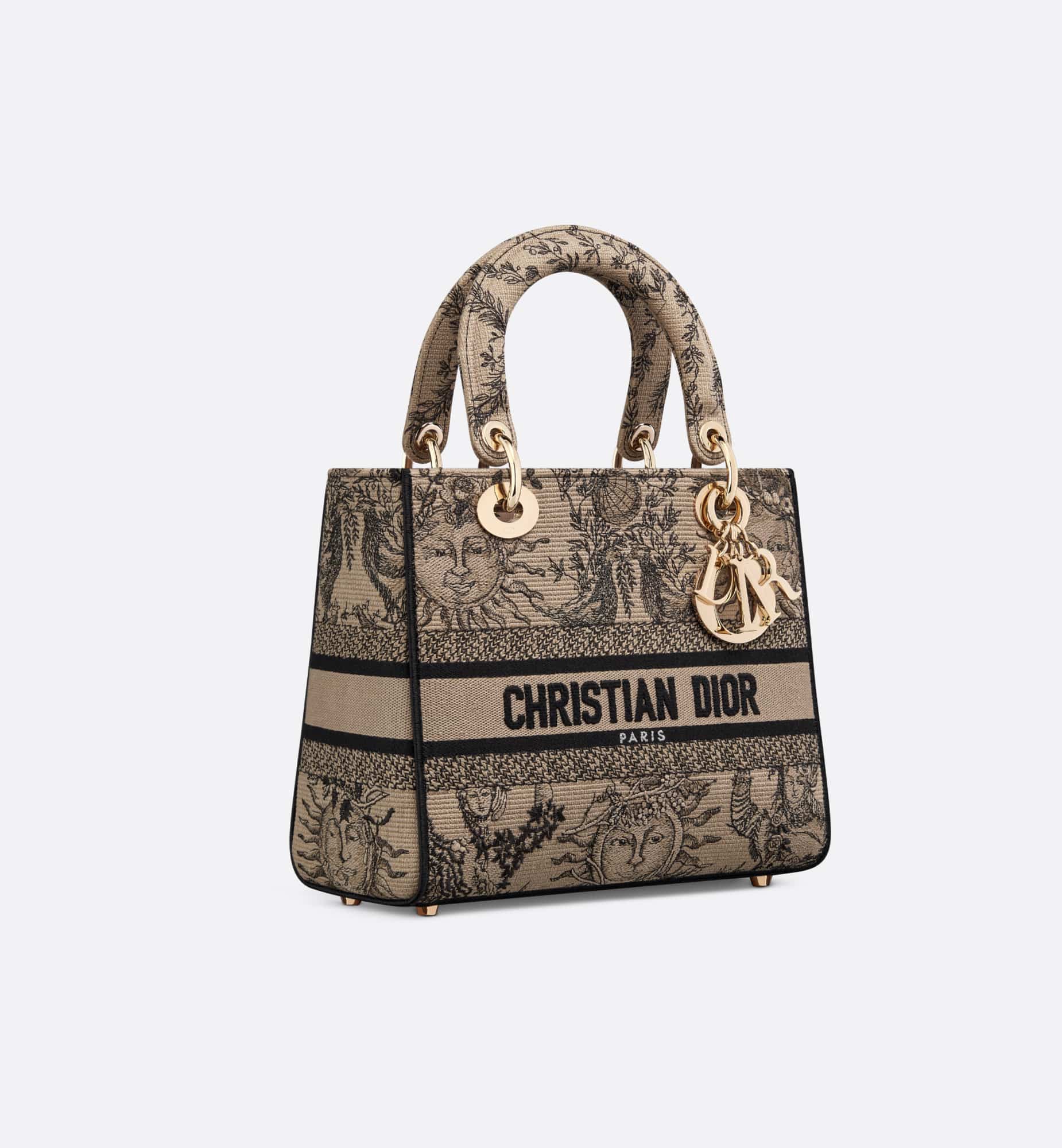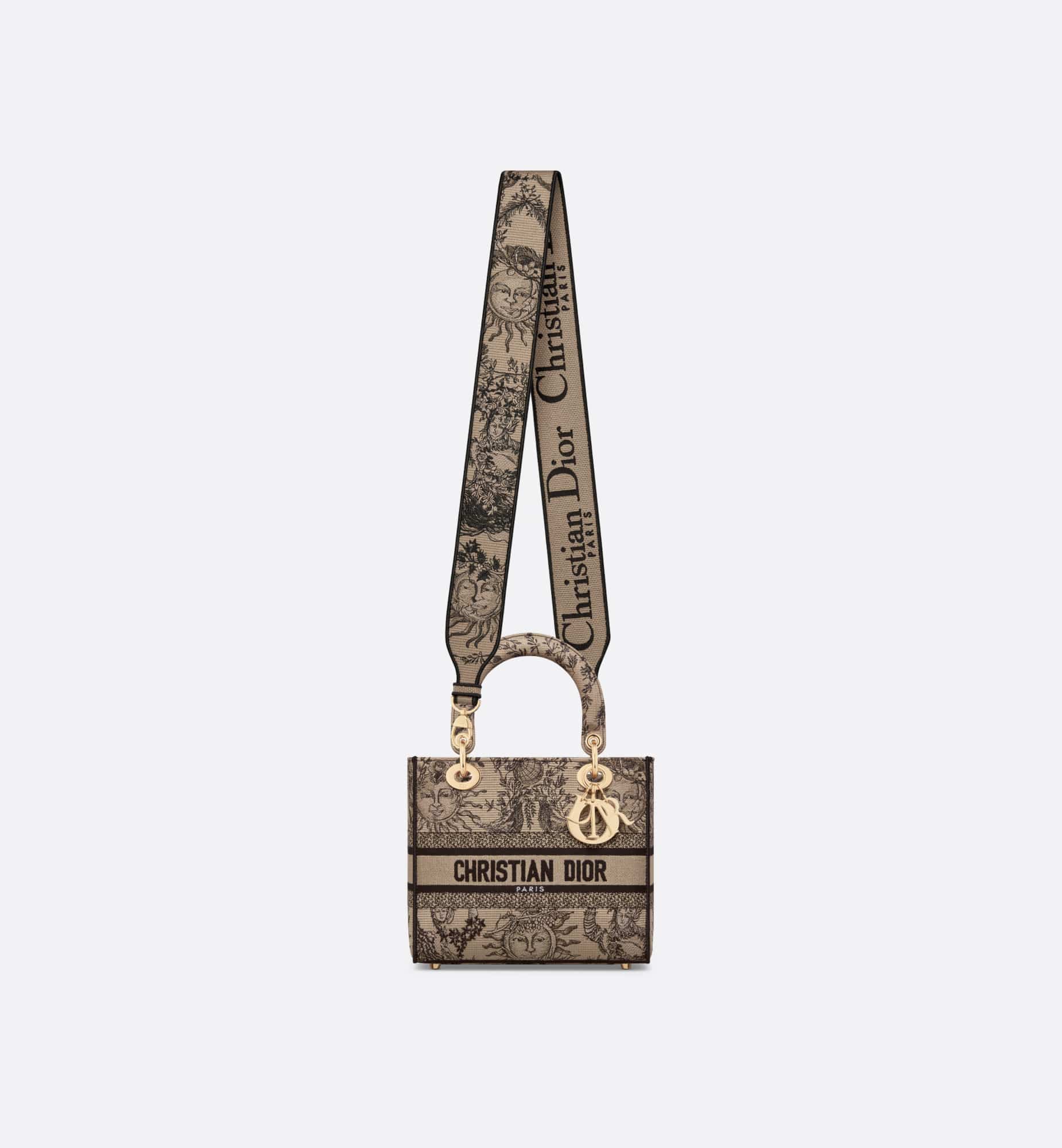 The Lady D-Joy bag captures the House’s vision of classic elegance and modernity. It is fully embroidered with the season’s signature Toile de Jouy Soleil motif in beige and black, offering a new take on the iconic House pattern with suns and crescent moons layered into a floral design representing the four seasons. The pale gold-finish metal D.I.O.R. charms embellish and illuminate the silhouette. Featuring a wide, removable embroidered shoulder strap, the medium Lady D-Lite bag can be carried by hand or worn crossbody.