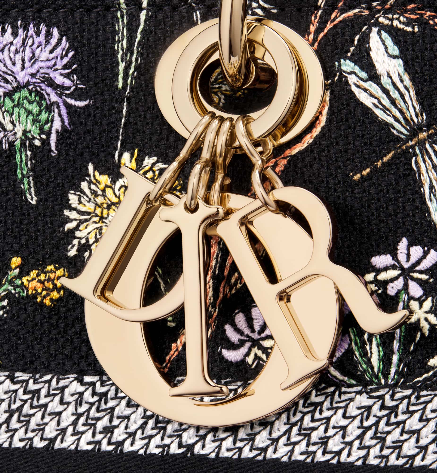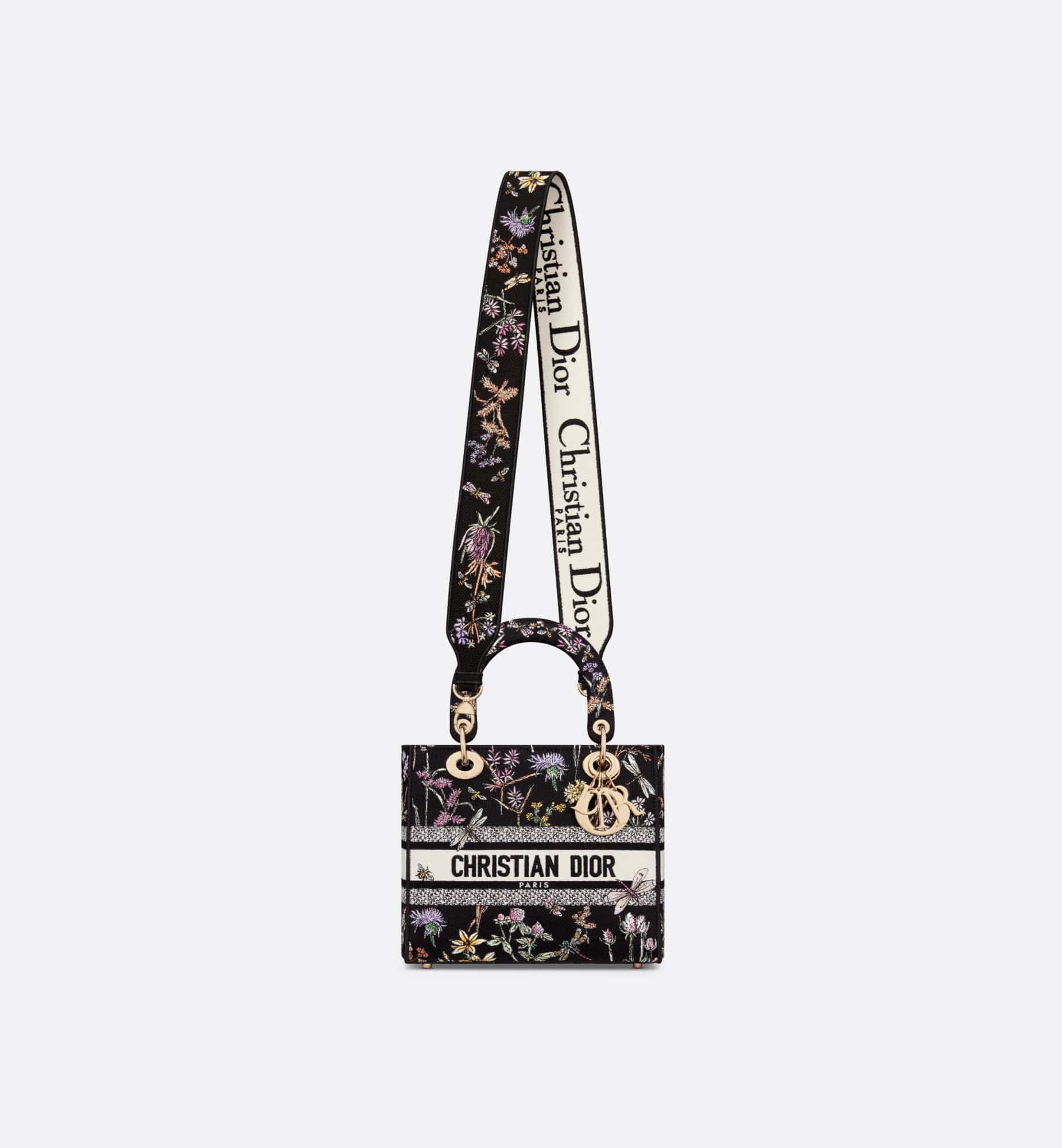 The Lady D-Lite bag combines classic elegance with House modernity. A vibrant homage to Mr. Dior’s passion for botanicals, the style is fully embroidered with the black multicolor Dior Herbarium motif. Inspired by House archives, it showcases a collection of wild plants and flowers accented by dragonflies and bees. The front features the Christian Dior Paris signature while the D.I.O.R. charms in pale gold-finish metal embellish and illuminate the silhouette. Equipped with a wide, removable embroidered shoulder strap, the medium Lady D-Lite bag can be carried by hand or worn crossbody.