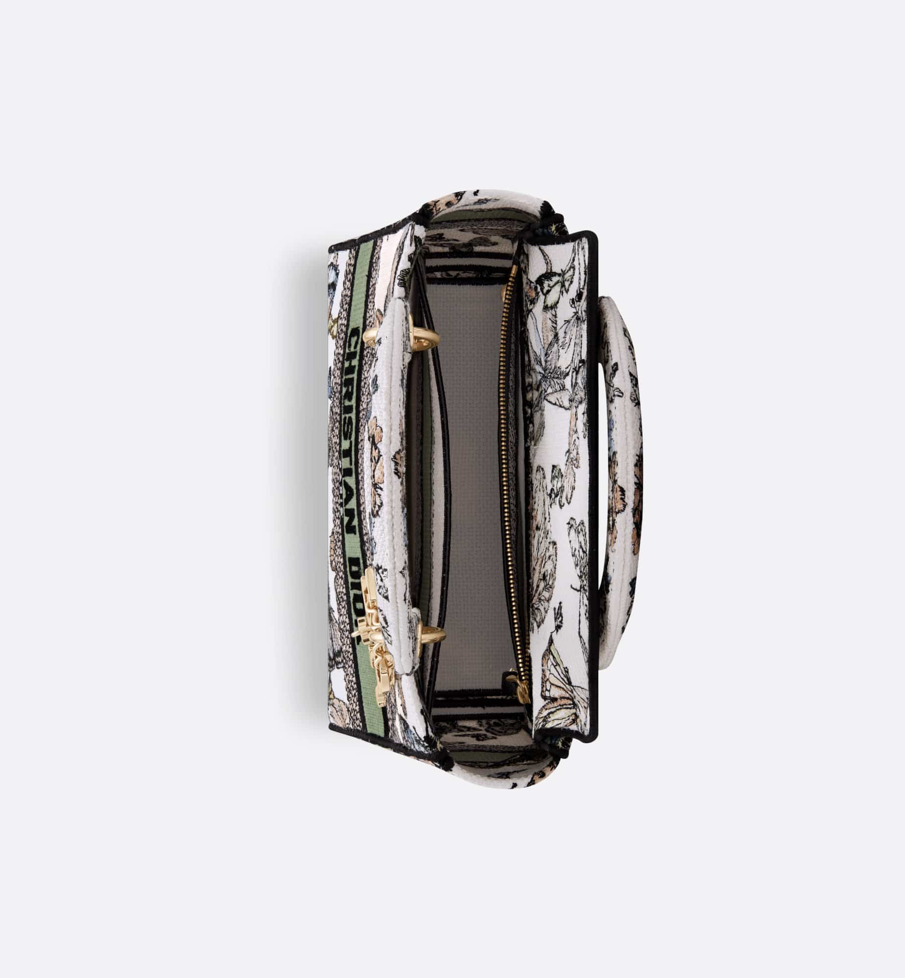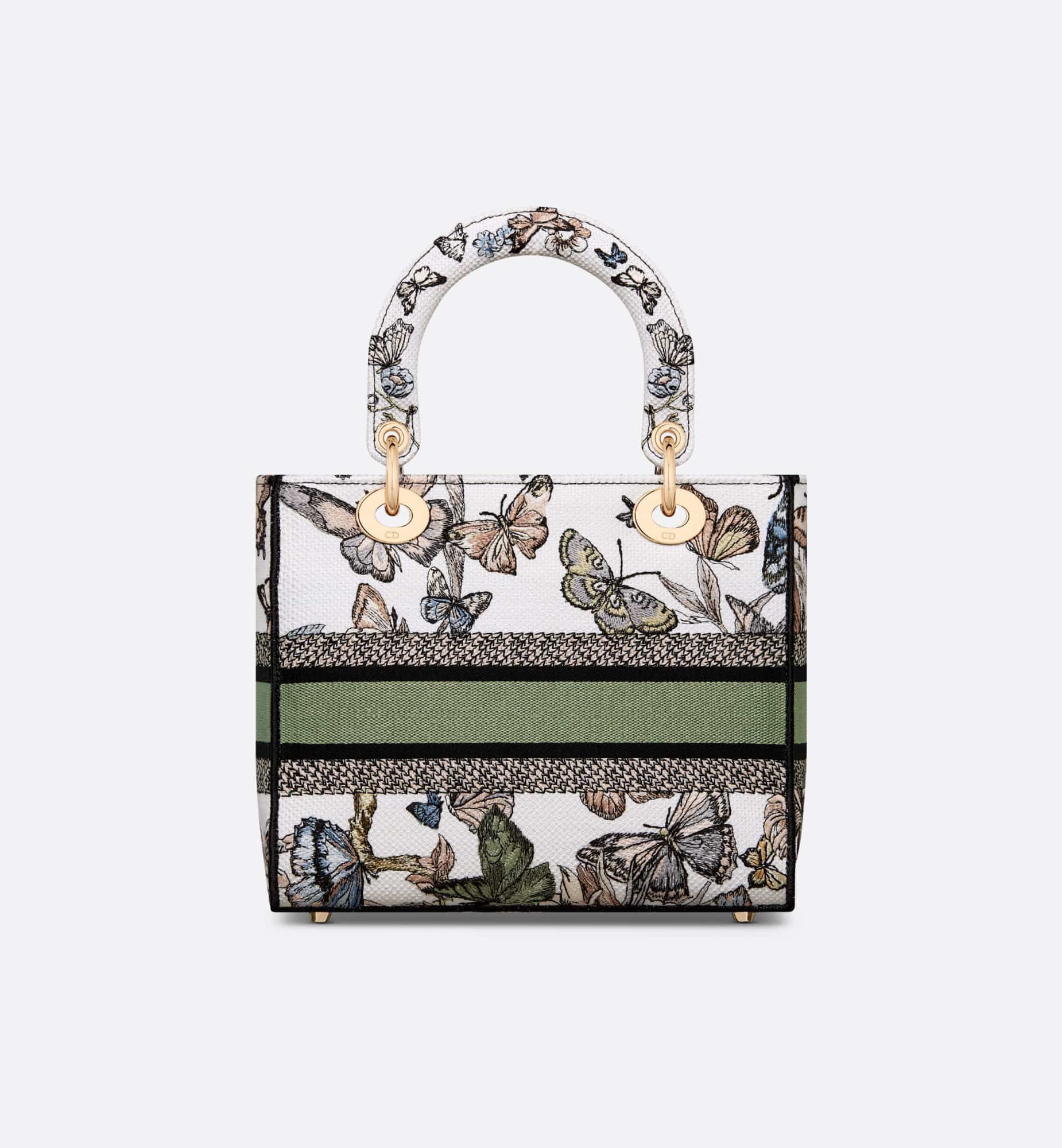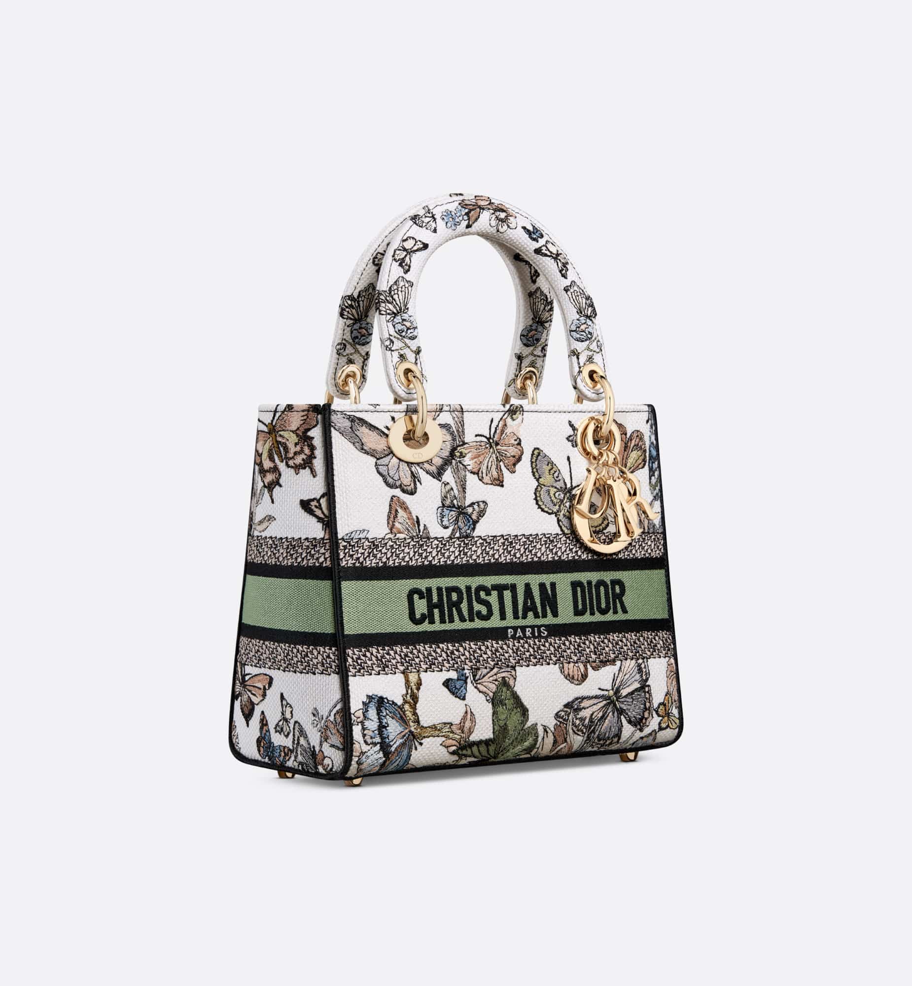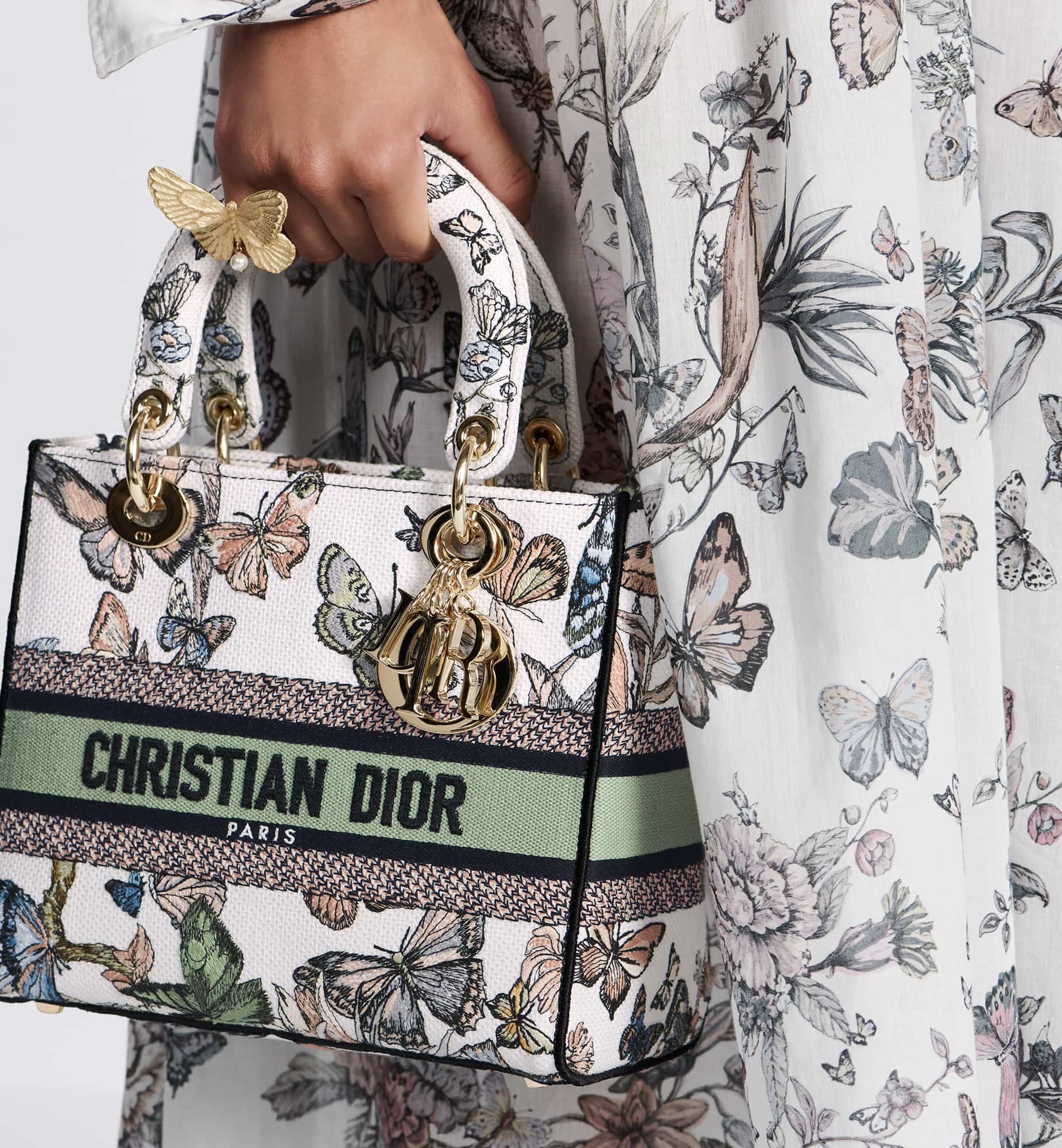 The Lady D-Lite bag combines classic elegance with House modernity. The style is fully embroidered with a white multicolor Toile de Jouy Mexico motif by Pietro Ruffo, showcasing butterflies and traditional Mexican flowers in a concert of colors. A Christian Dior Paris signature adorns the front, while D.I.O.R. charms in pale gold-finish metal enhance and highlight the silhouette. Featuring a wide, removable embroidered shoulder strap, the medium Lady D-Lite bag can be carried by hand or worn crossbody.