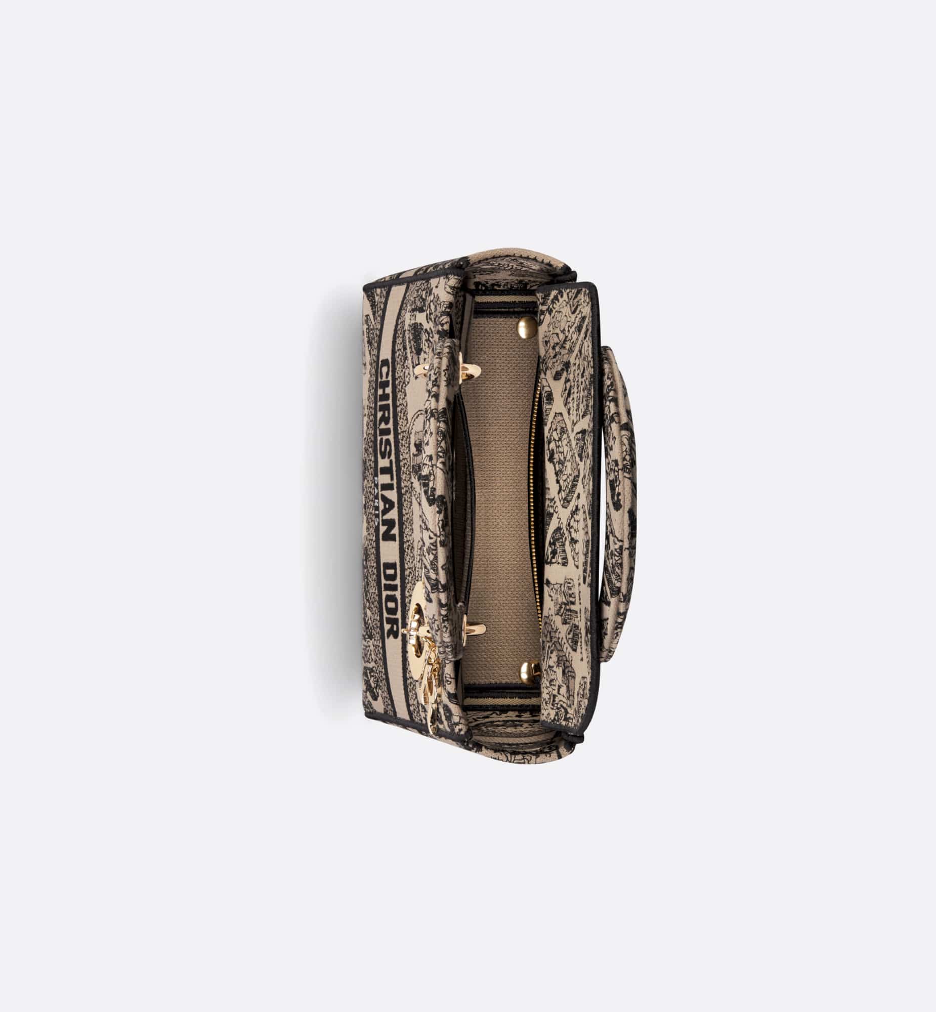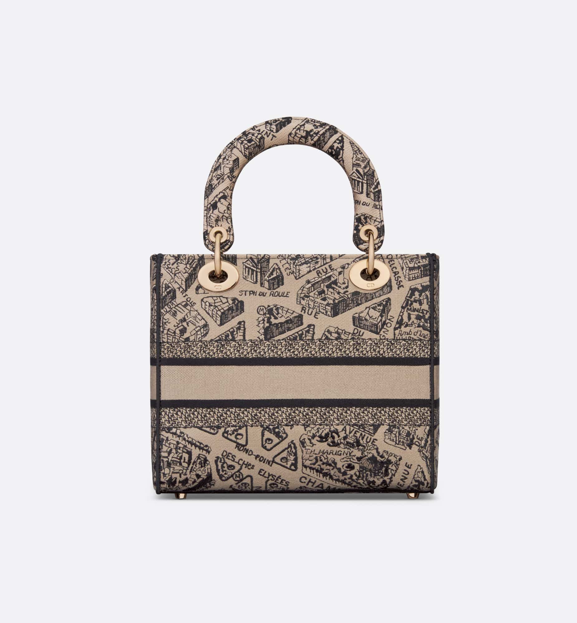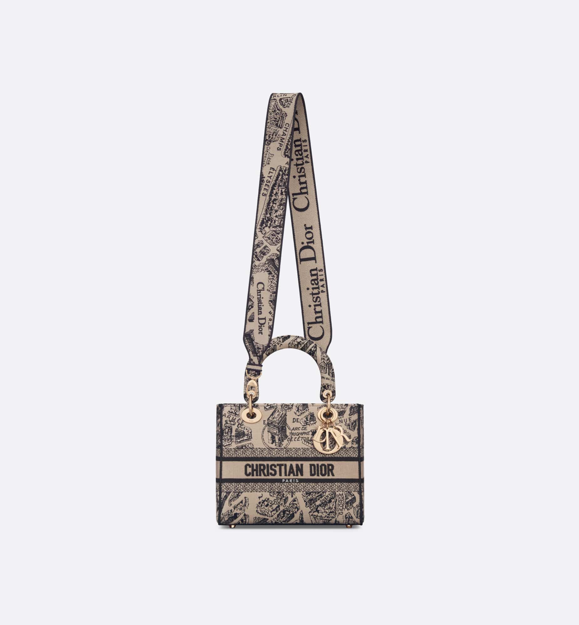 The Lady D-Lite bag combines classic elegance with House modernity. The style is fully embroidered with the beige and black Plan de Paris motif, inspired by House archives and centered around Dior’s historic address on Avenue Montaigne. The front features a Christian Dior Paris signature while the D.I.O.R. charms in pale gold-finish metal embellish and illuminate the silhouette. Equipped with a wide, reversible and removable embroidered shoulder strap, the medium Lady D-Lite bag can be carried by hand or worn crossbody, and can be styled with other Plan de Paris creations.