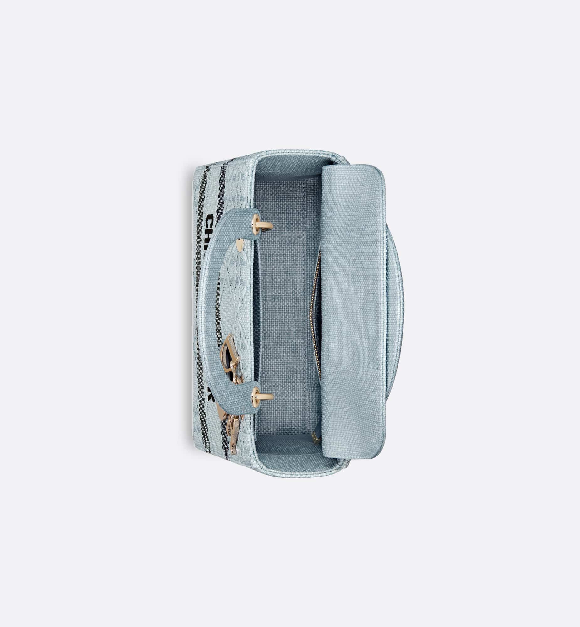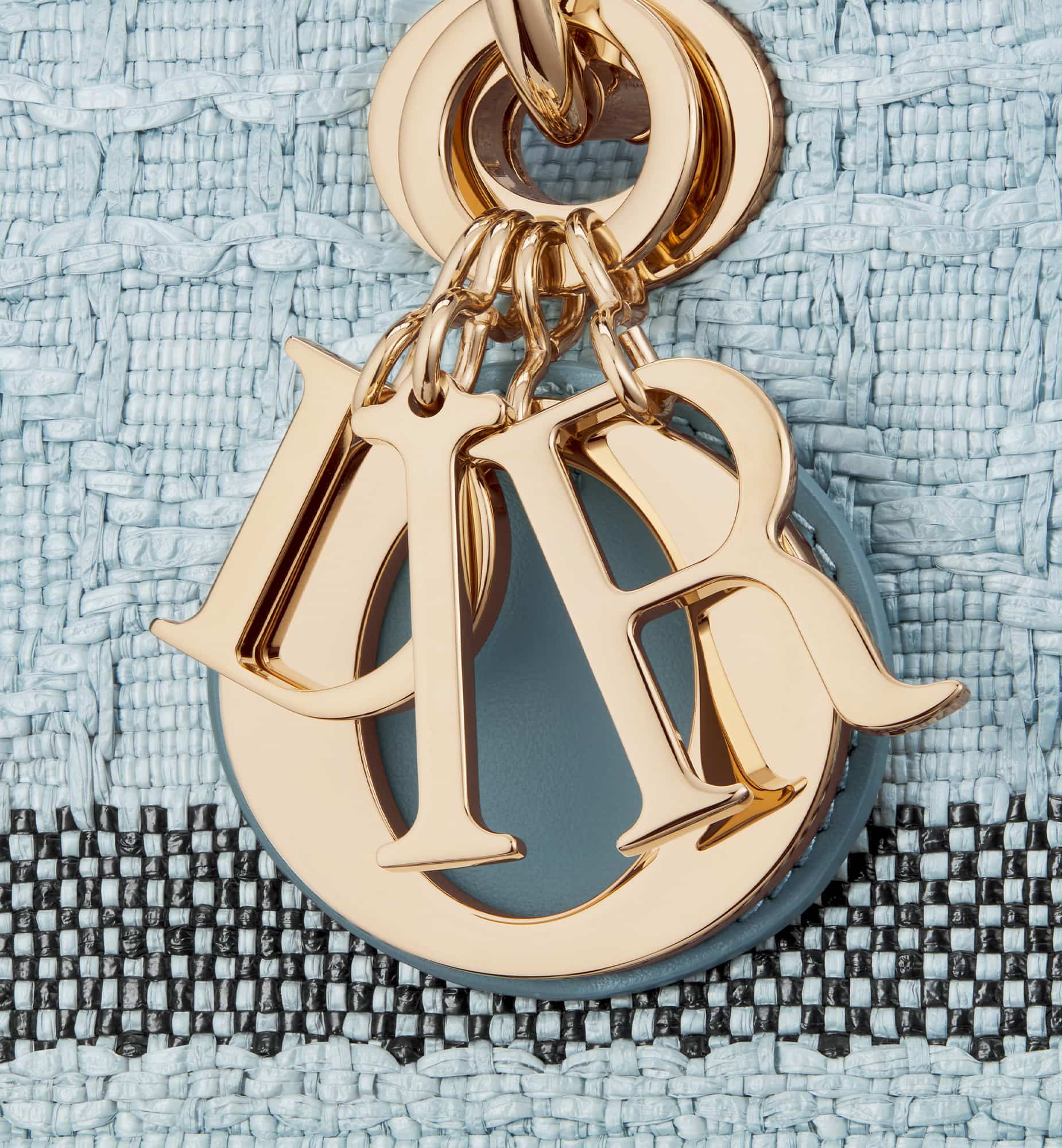 The Lady D-Lite bag combines classic elegance with House modernity. Crafted in sky blue raffia, it showcases hallmark Cannage stitching. A Christian Dior Paris signature adorns the front, while D.I.O.R. charms in pale gold-finish metal embellish and illuminate the silhouette. Featuring a wide, removable and reversible embroidered shoulder strap, the medium Lady D-Lite bag can be carried by hand or worn crossbody.
